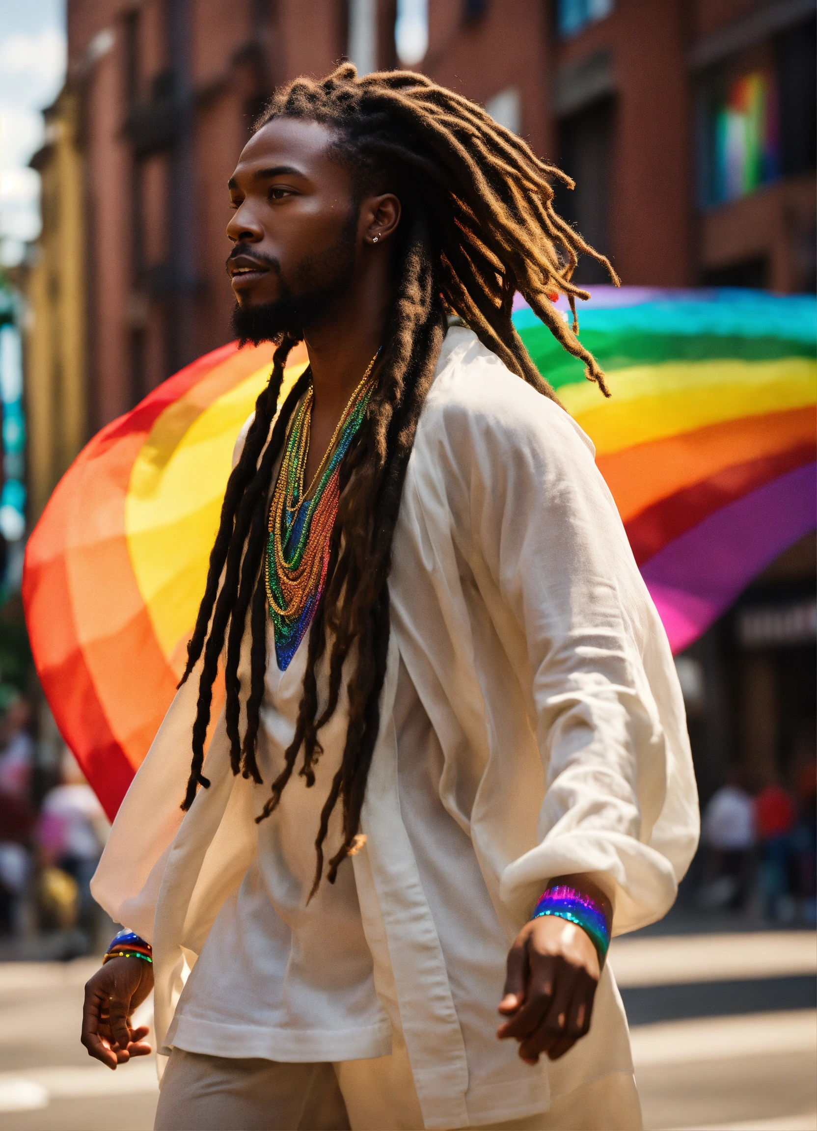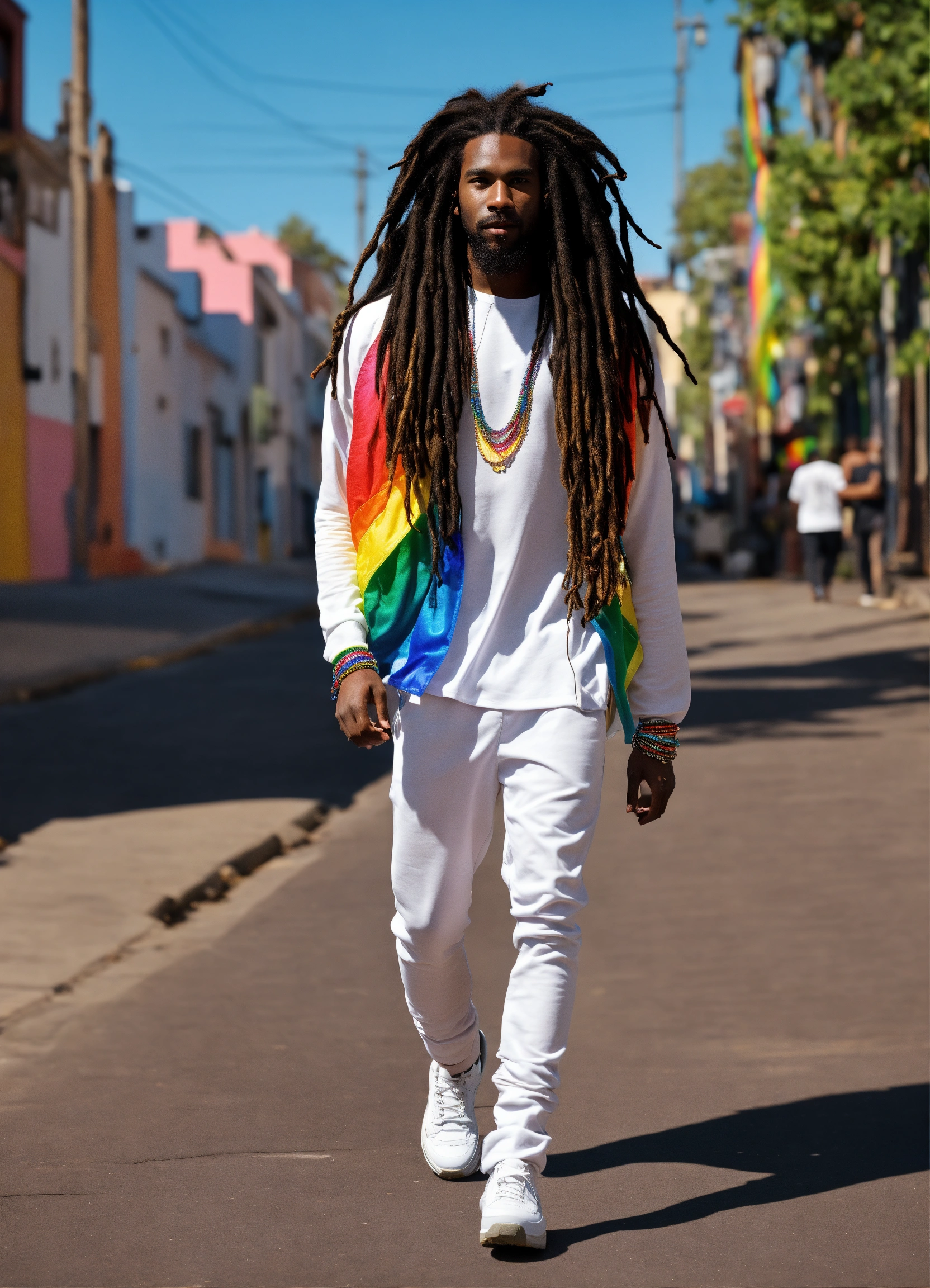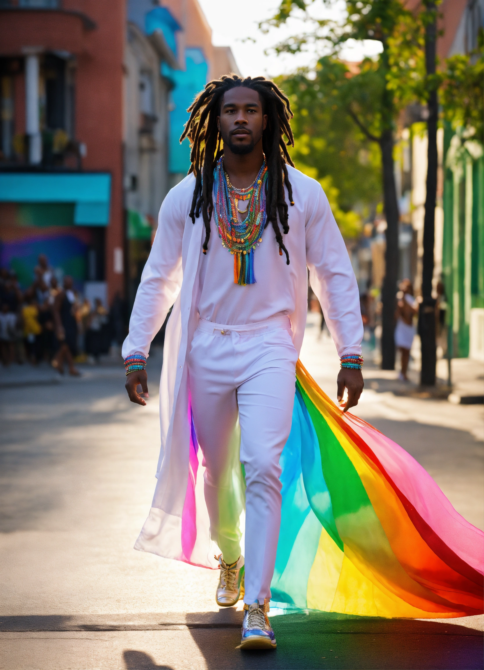 Black man with long flowing dreadlocks, well-built, 6' 5" tall, he has iridescent black skin that reflects all the colors of the rainbow, full body shot, striding up the street confidently, arms outstretched to the sides ready to hug someone, looking directly into camera, wearing all white iridescent clothing, african style white iridescent clothing that reflects all the colors of the rainbow, 3d render