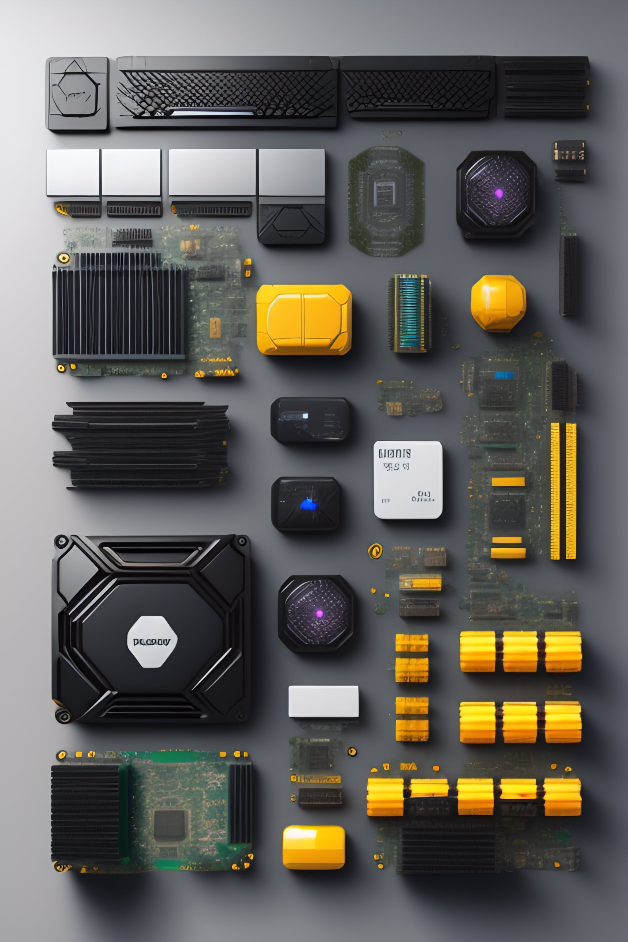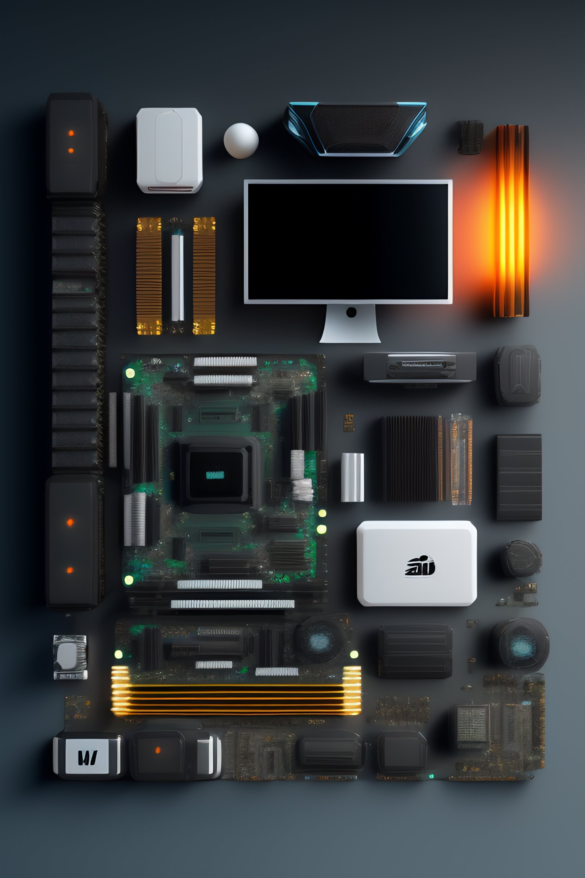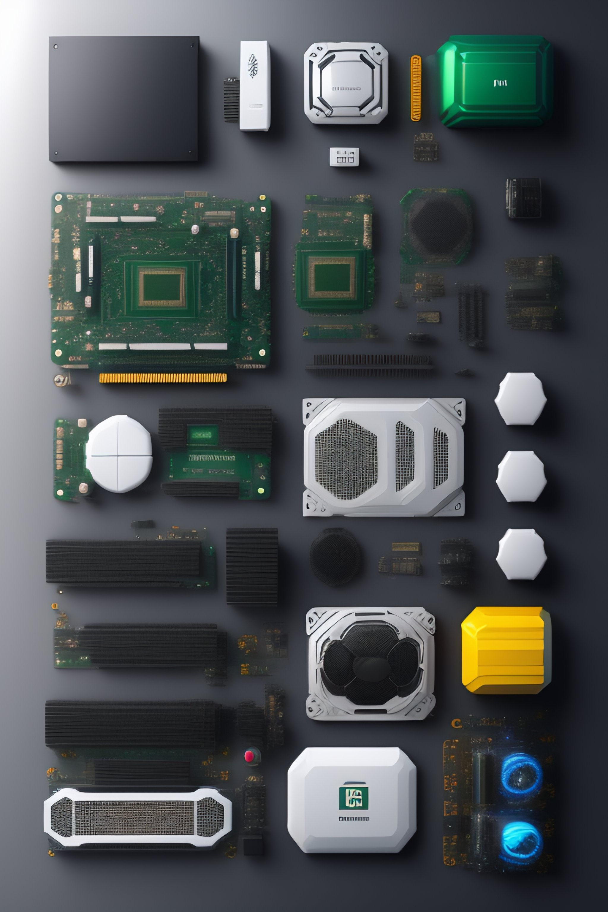 Disassembled gaming computer, knolling, knolling layout, deconstruction, highly detailed, depth, many parts, lumen render, 8k