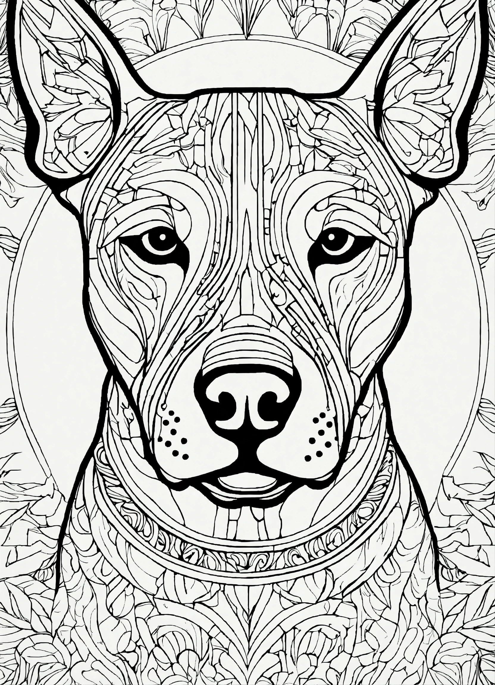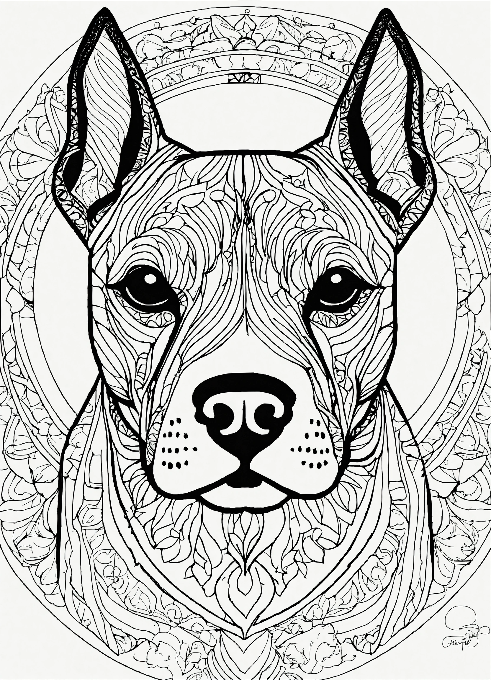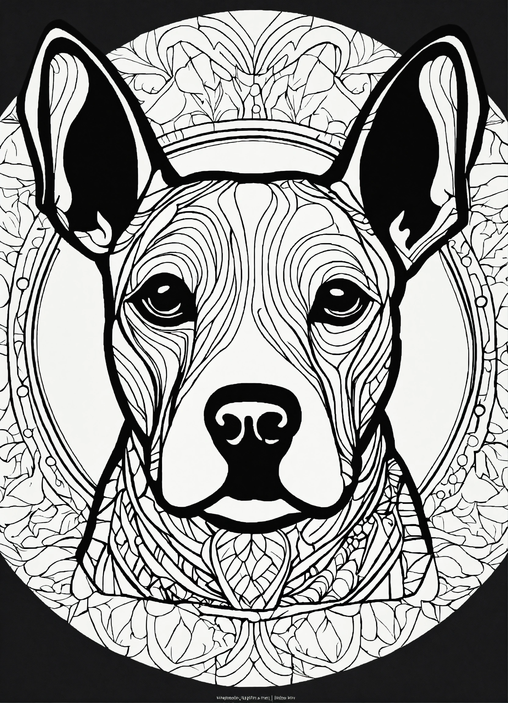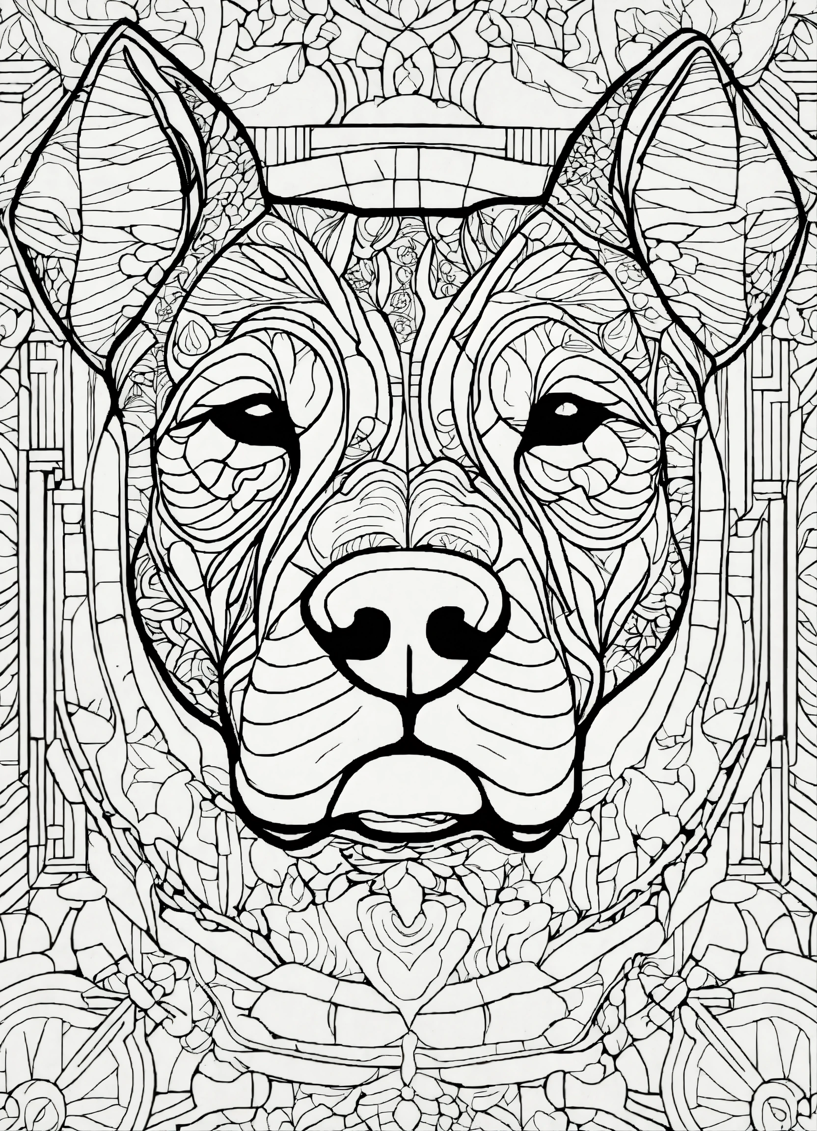 Coloring page for adults, bold lines, dark lines, mandala puppy, mandala dog pitbull face, mandala face, symmetrical, white background, clean line art, fine line art