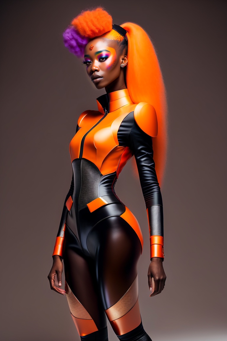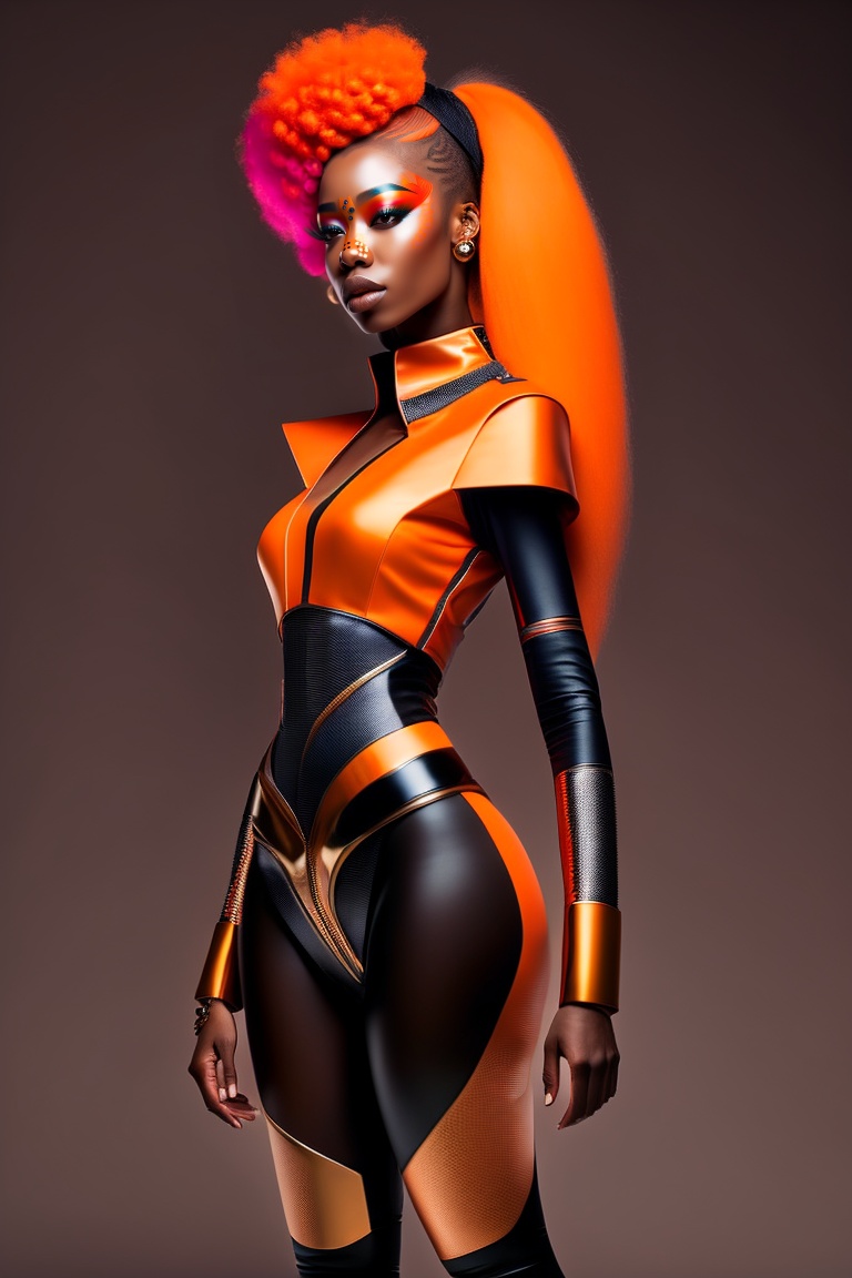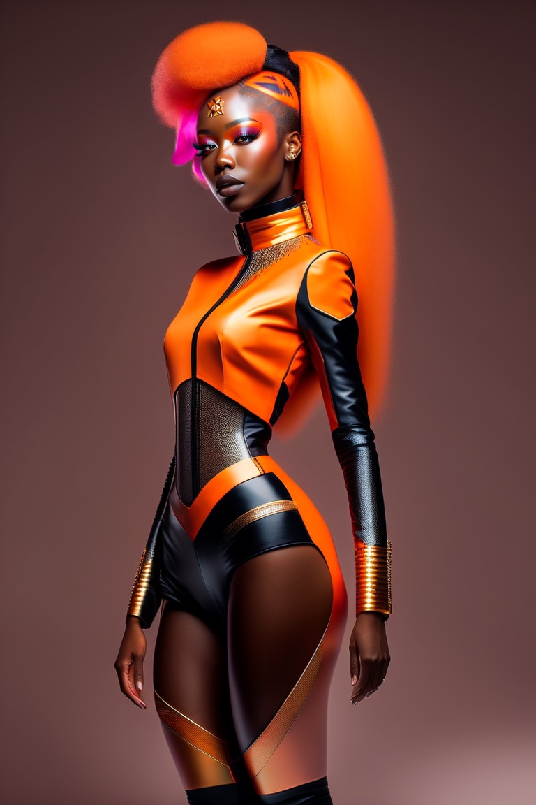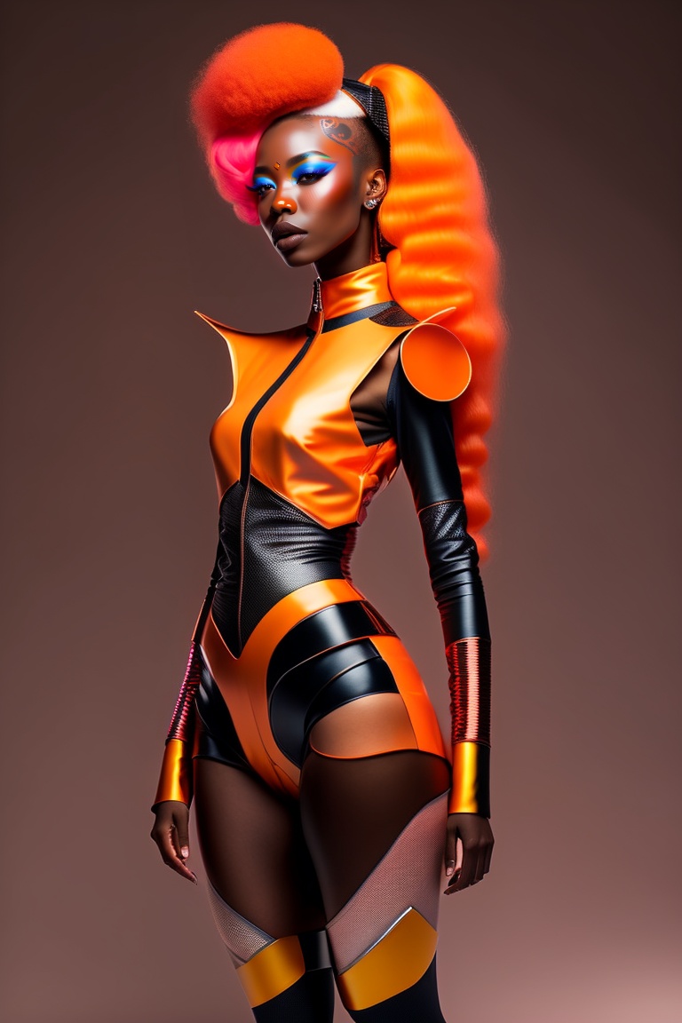 A dark skin black female kpop idol in a all orange futuristic outfit, with oversized orange hair, white background, fantastical animal themed outfit and elaborate makeup, captured in vivid colors, embodying the essence of fantasy