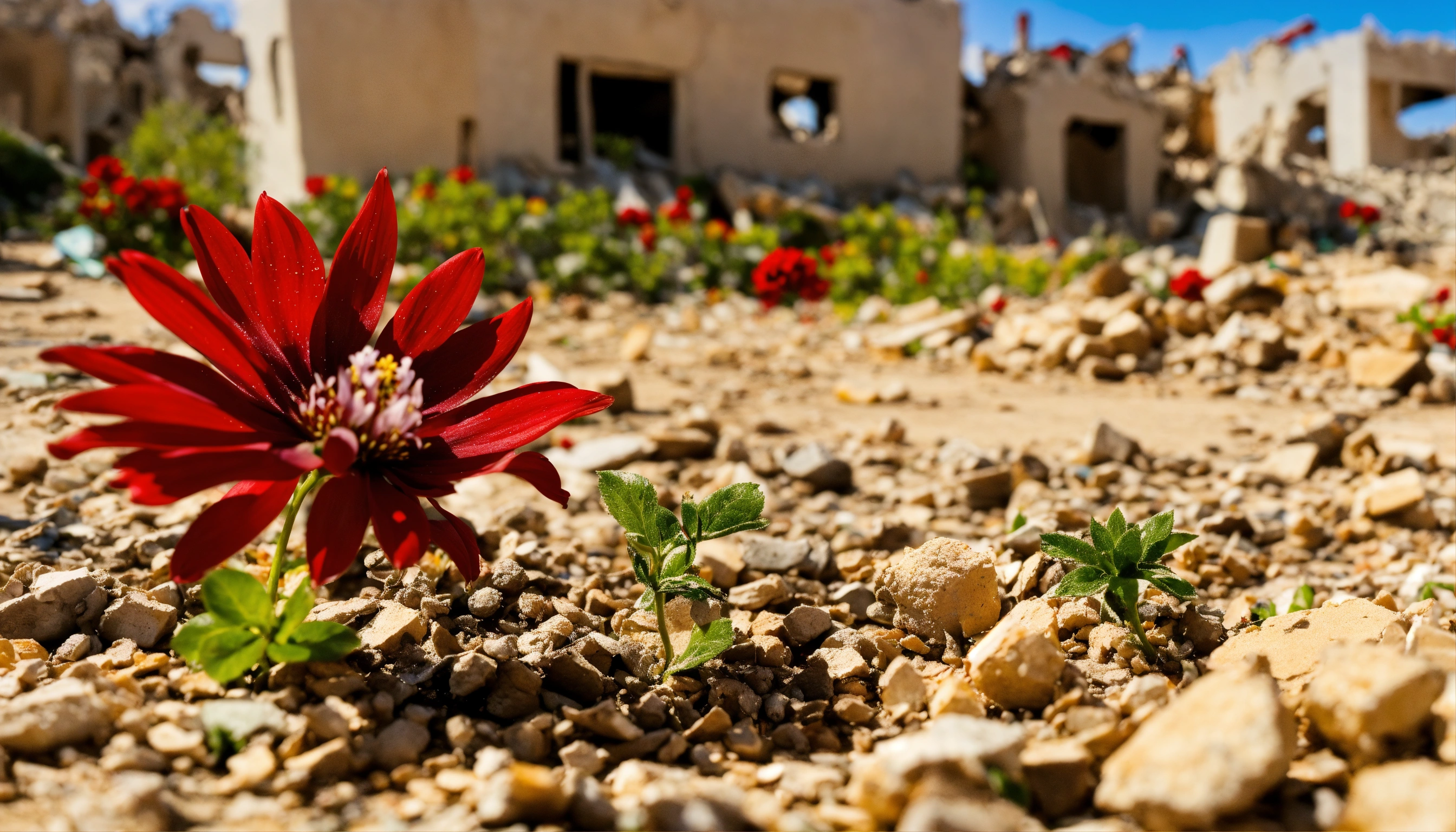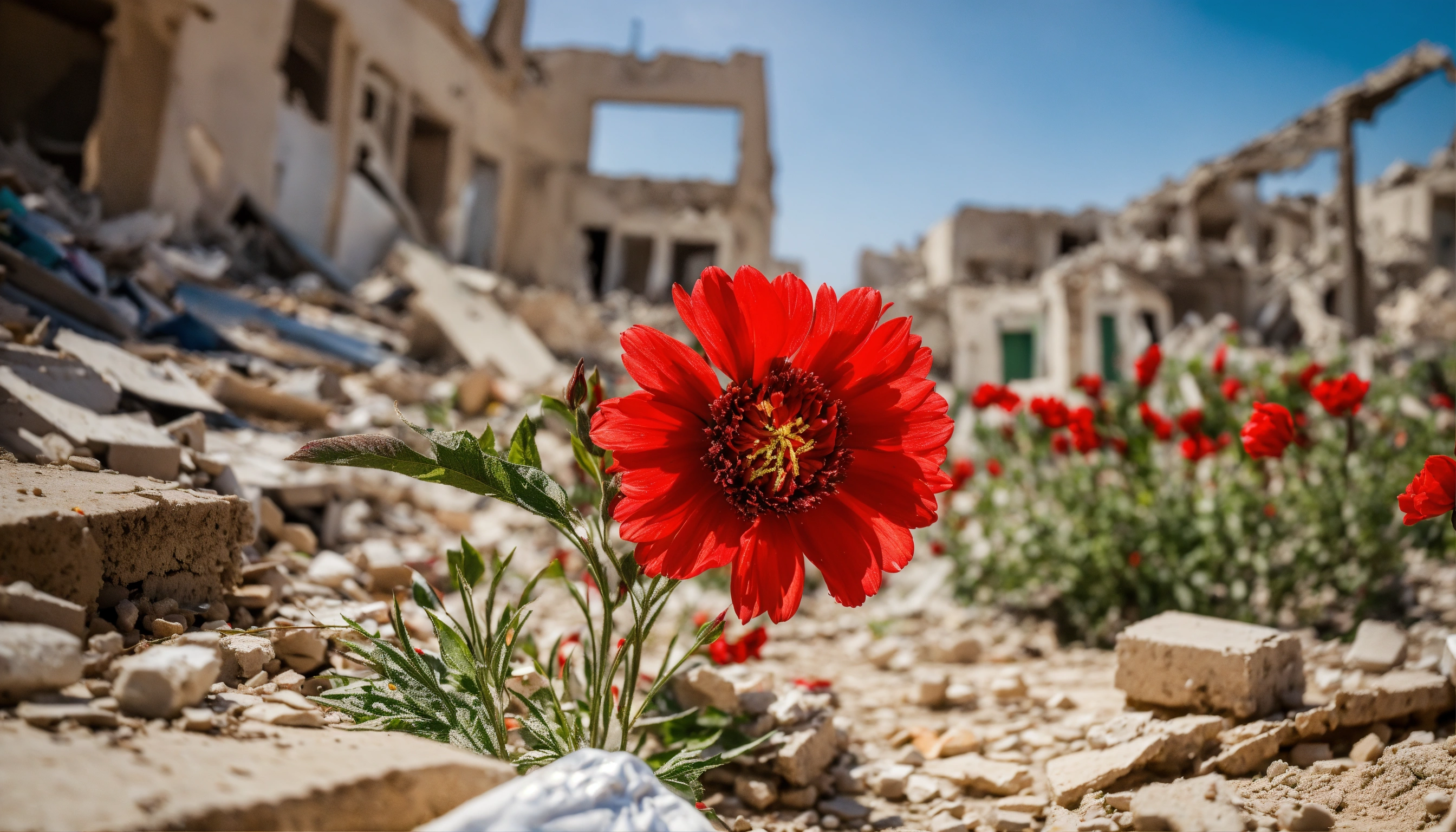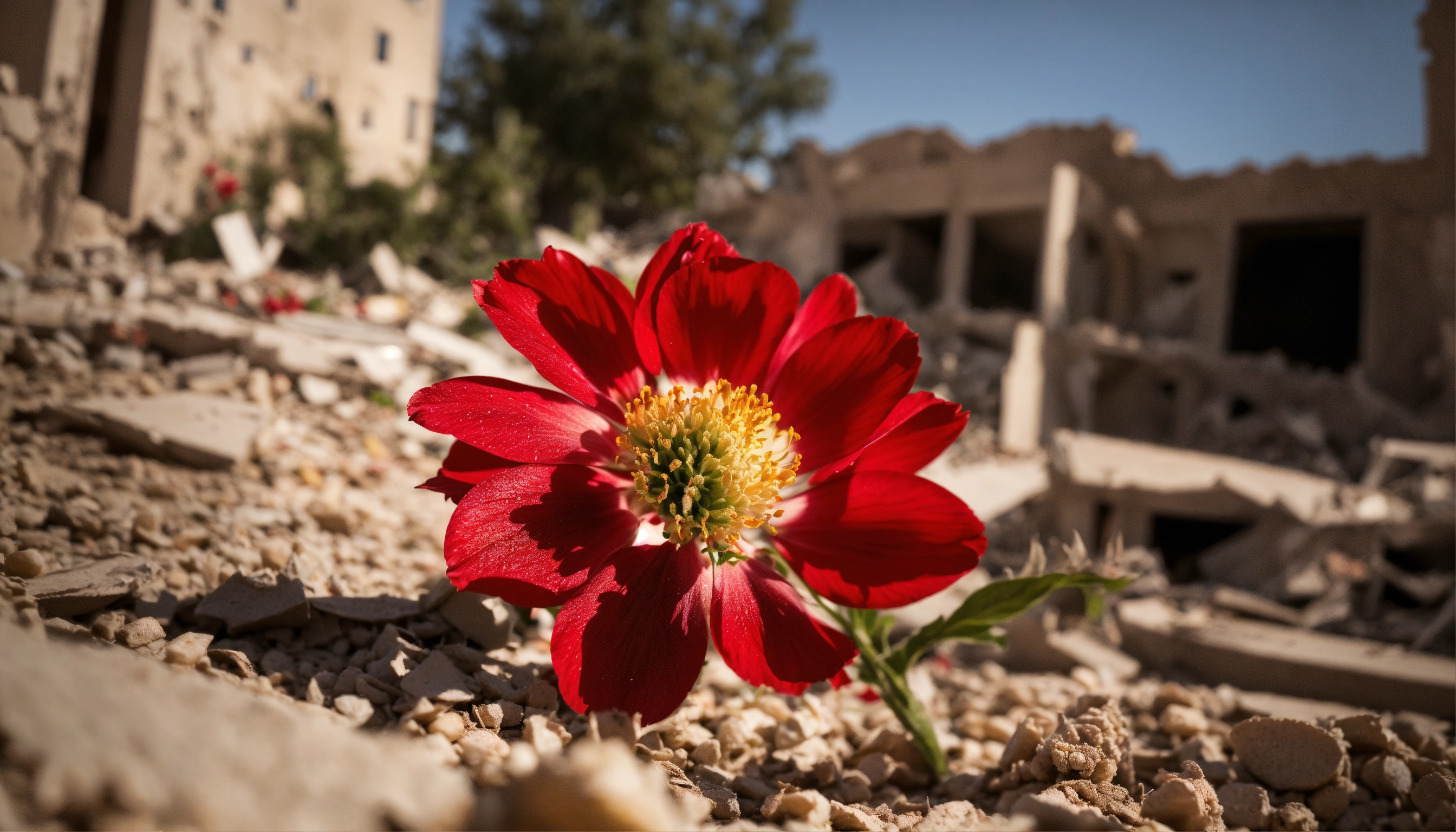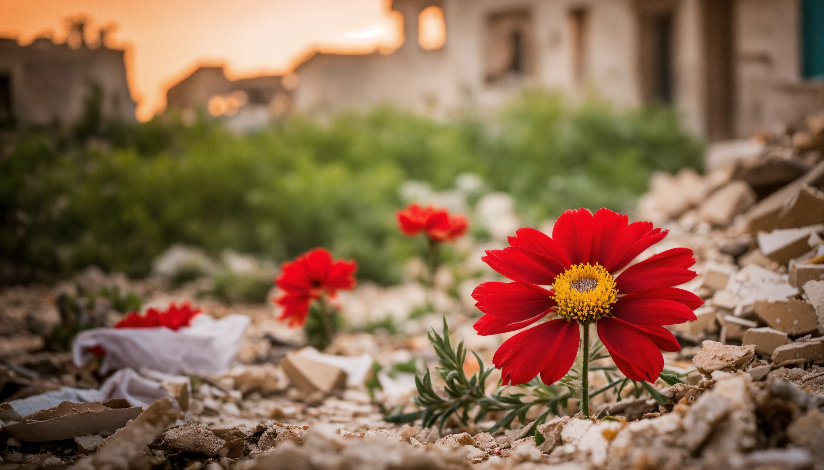 Closeup on a growinf red flower on the ground of a palestine destroyed house