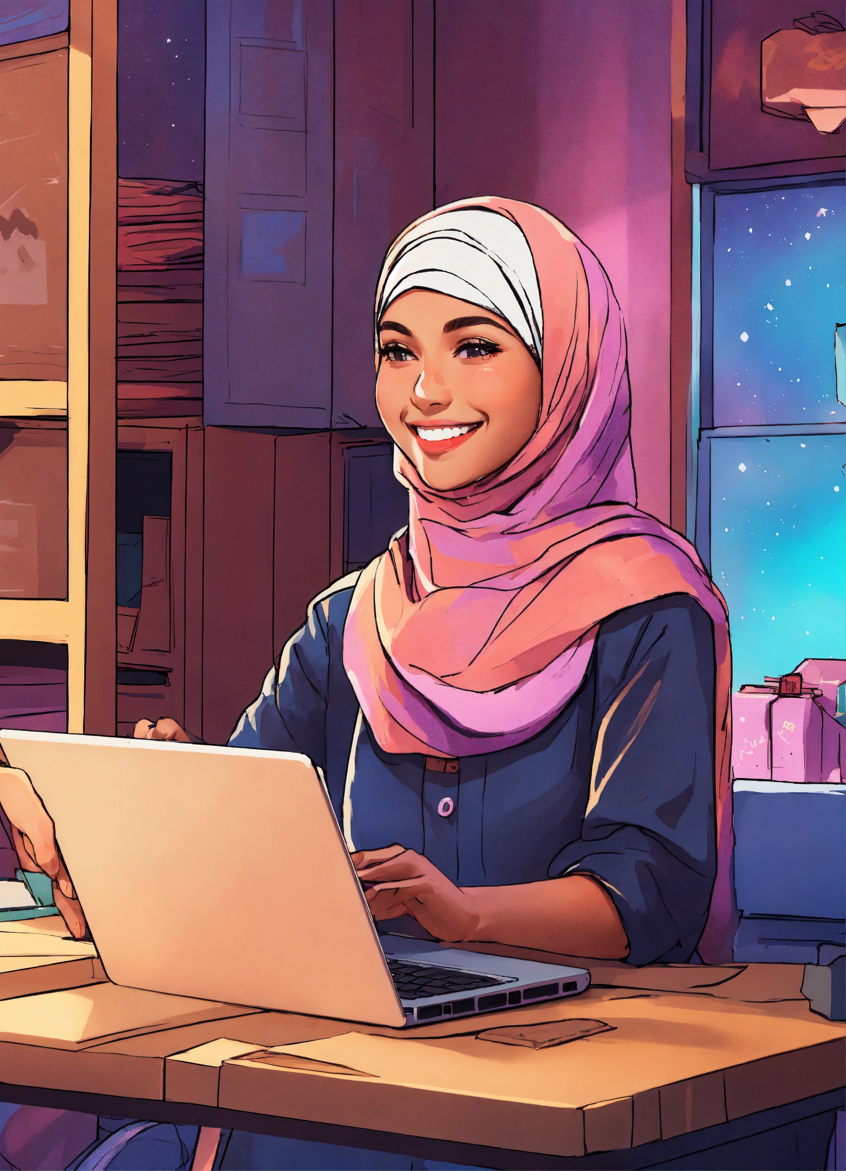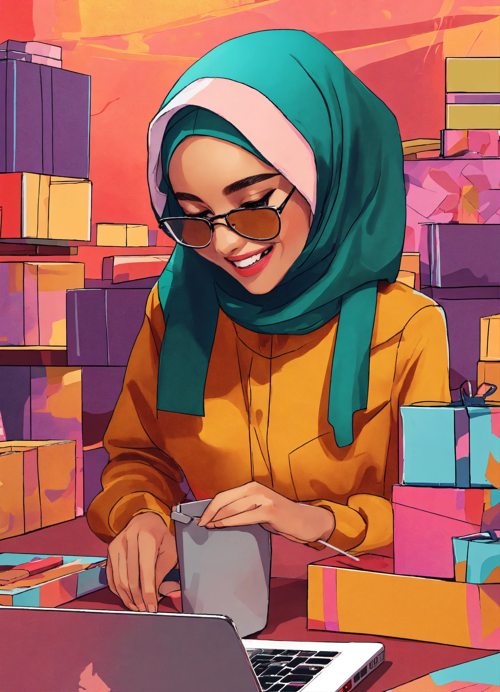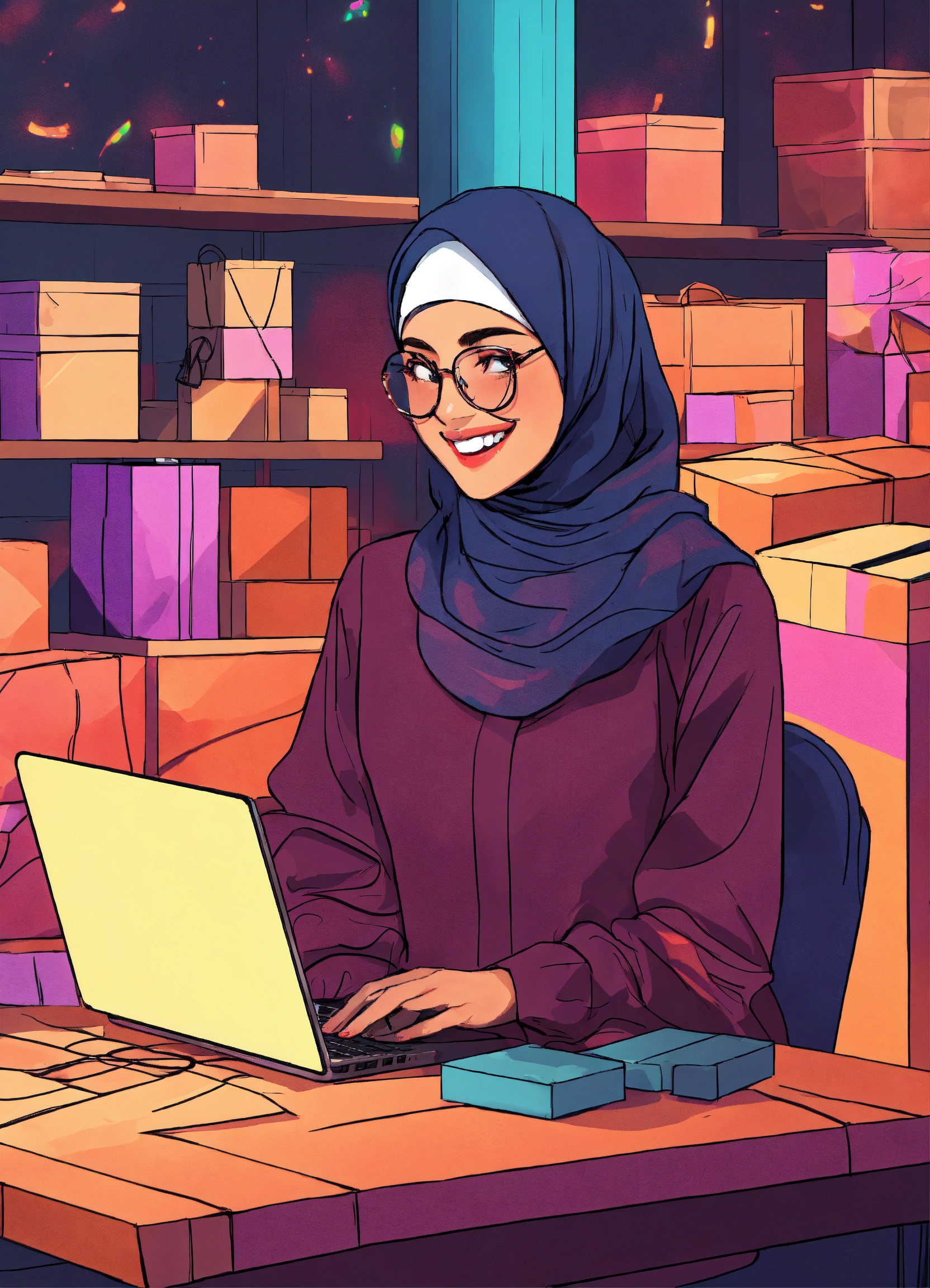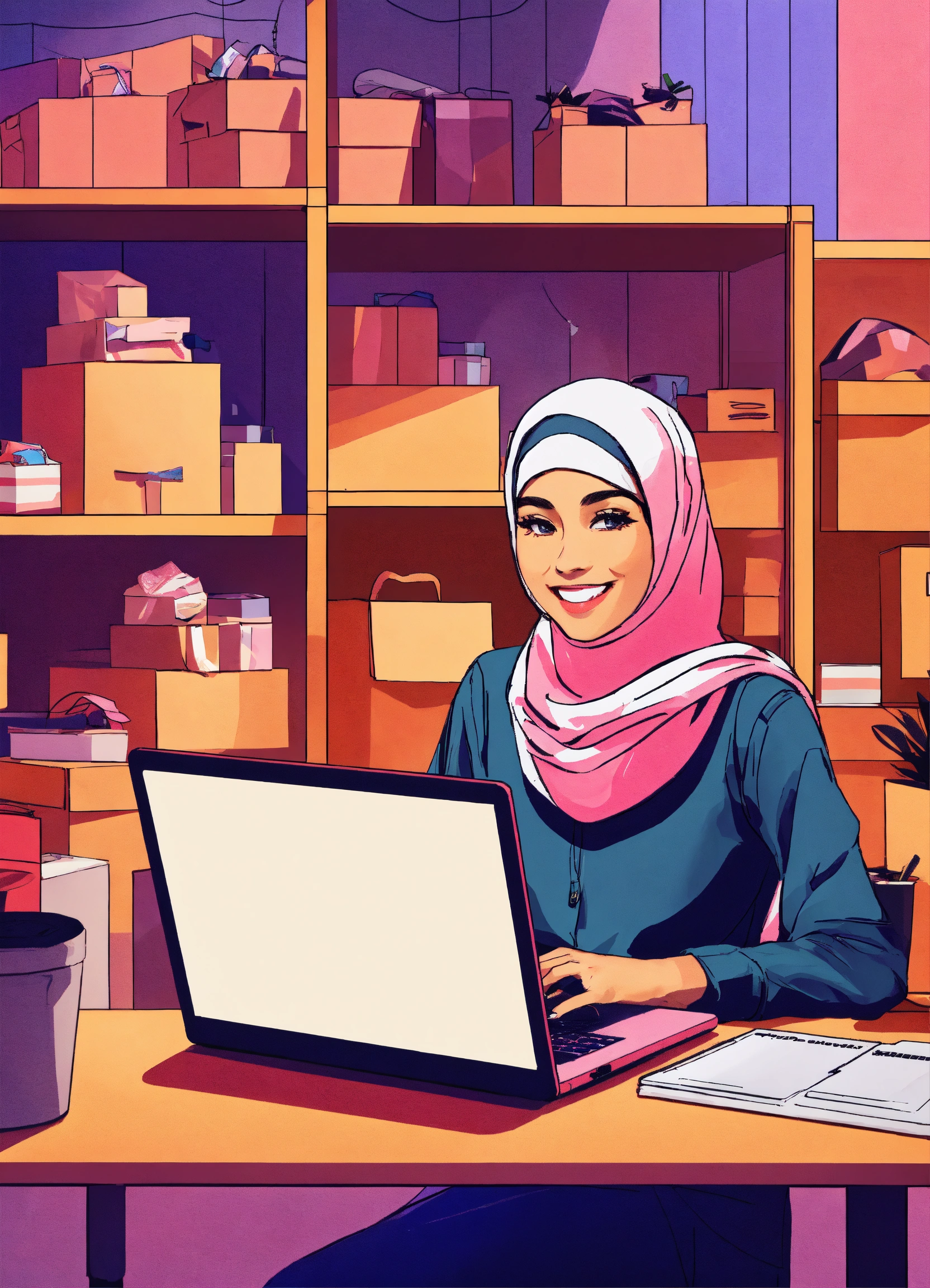 A smiling woman with hijab is working at a table with her laptop, behind her there are boxes for packaging her merchandise, digital illustration, studio lighting, creative trippy aesthetic background, modern look