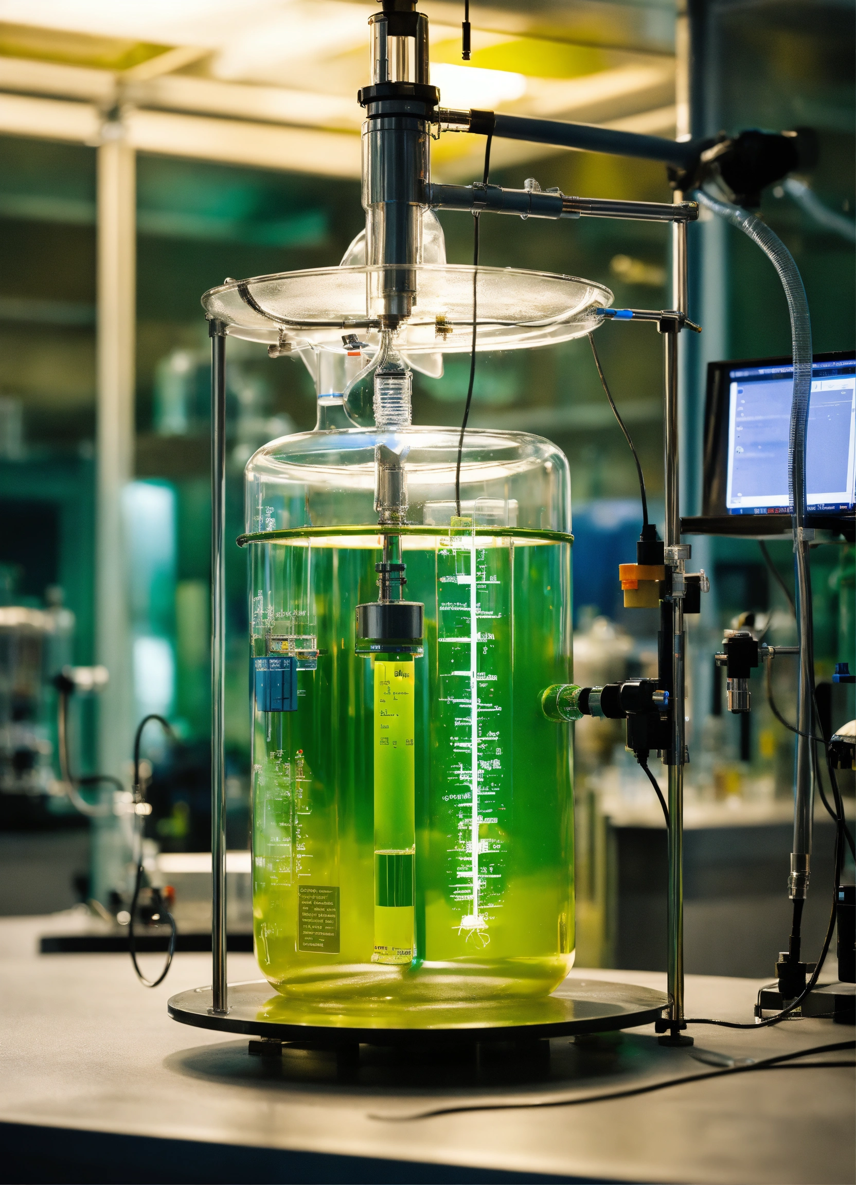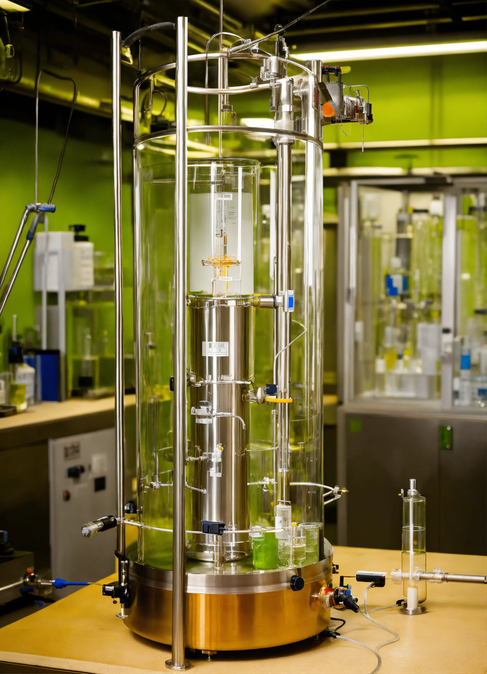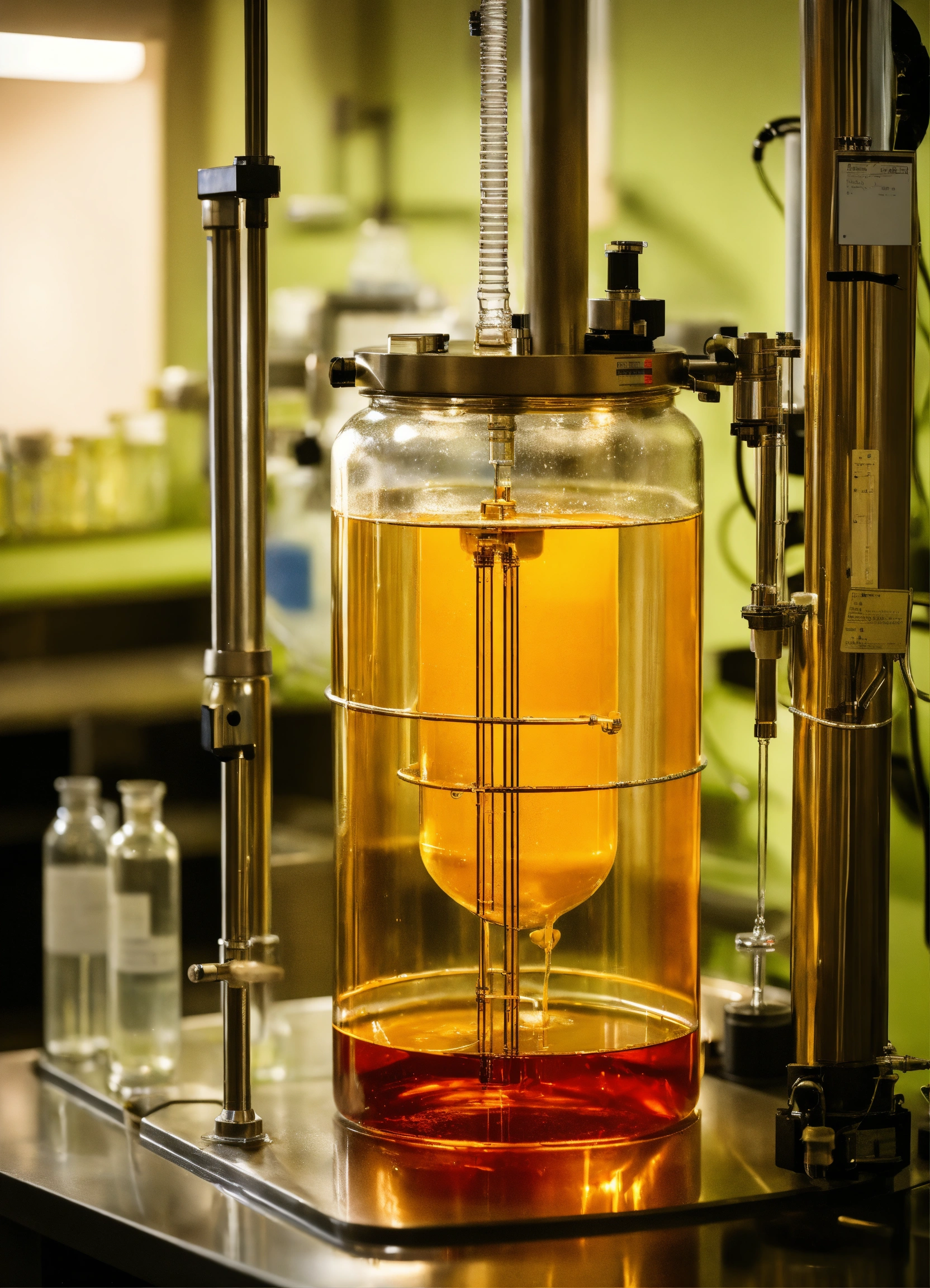 A stainless steel stirred tank bioreactor in a laboratory environment, tubing attached coming from glass bottle with liquid medium