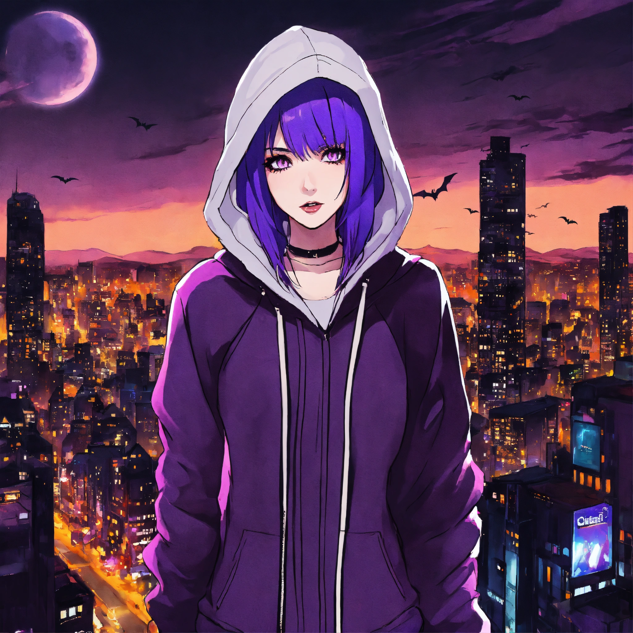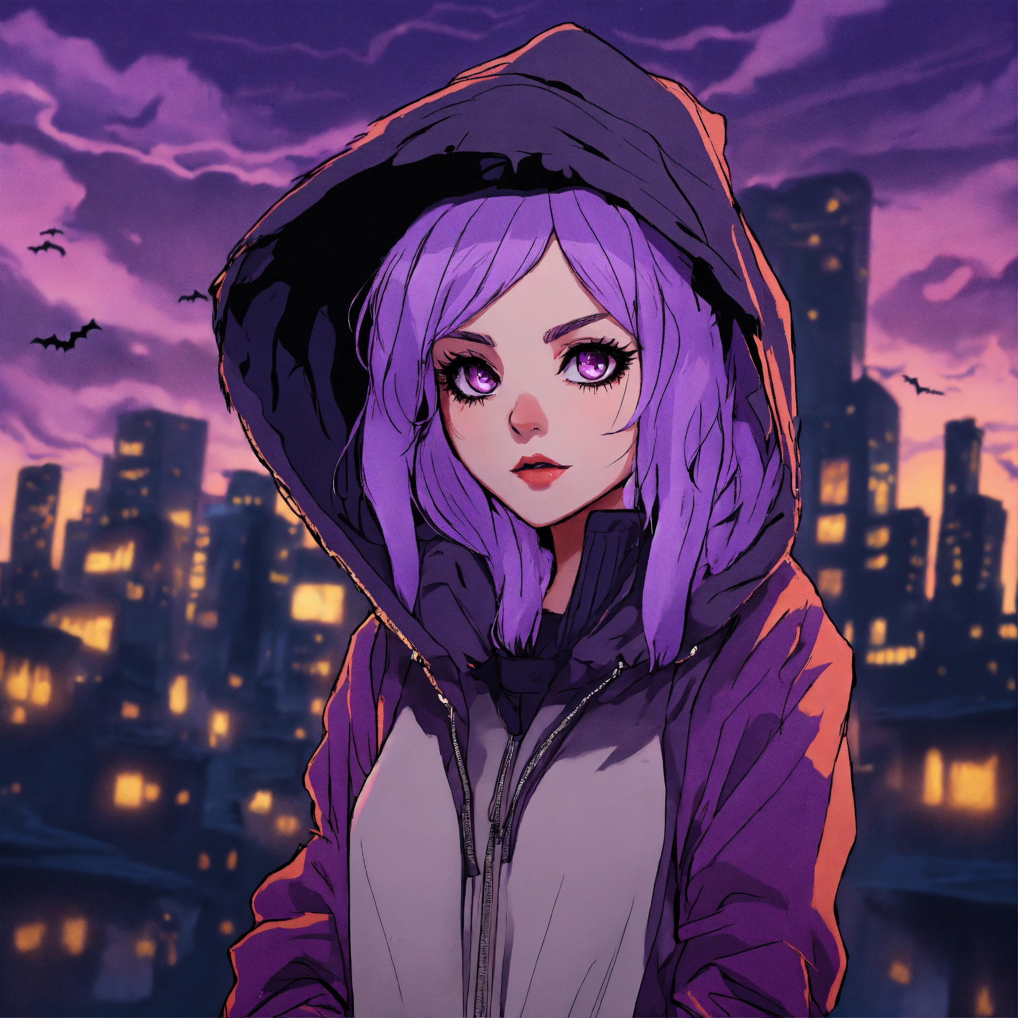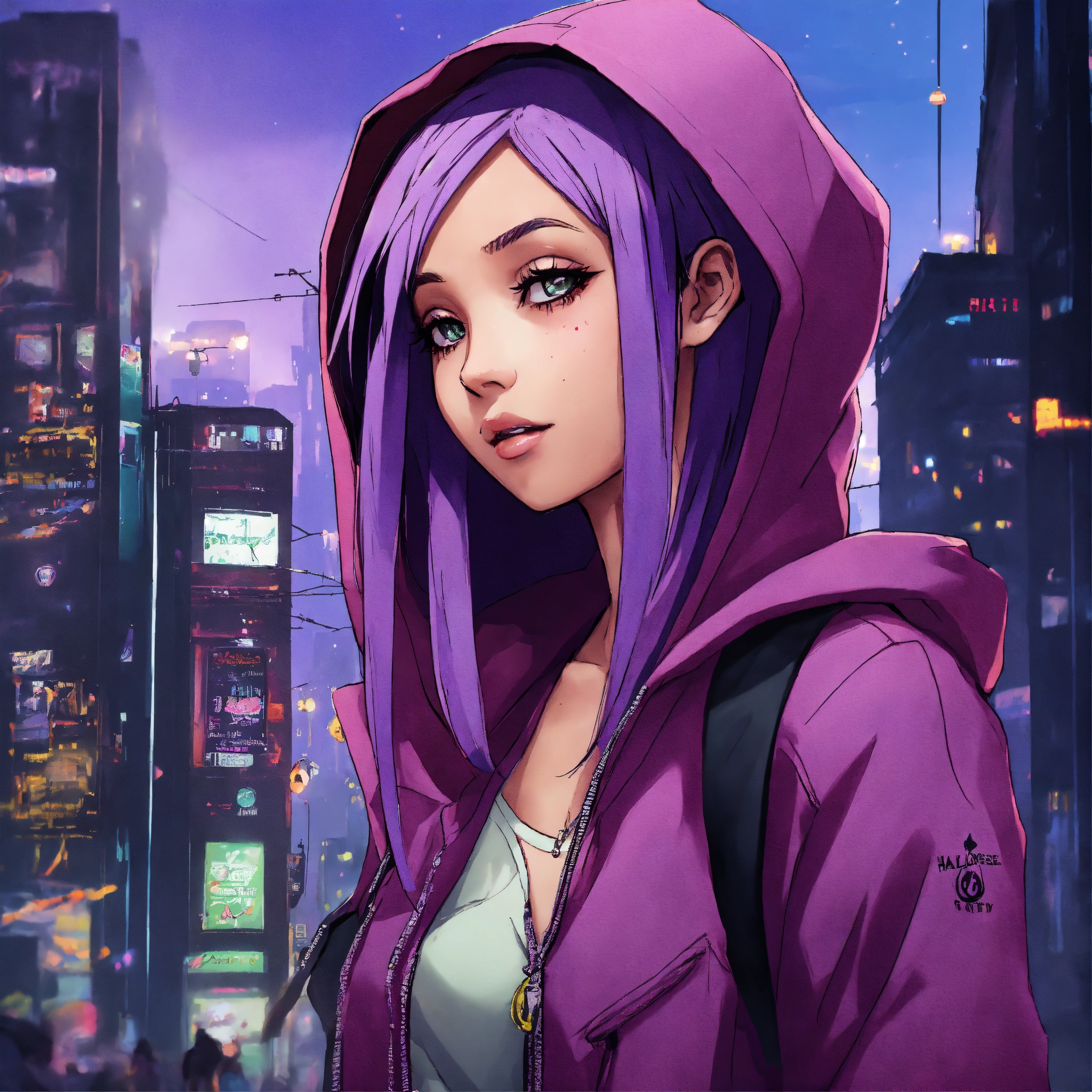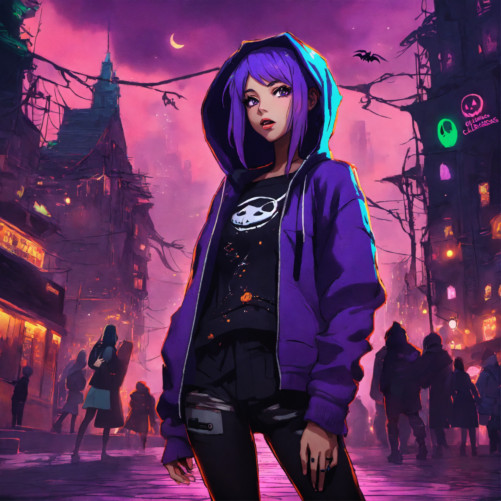 Nightmare before christmas anime style but in a futuristic city girl with purple hair in a hoodie halloween