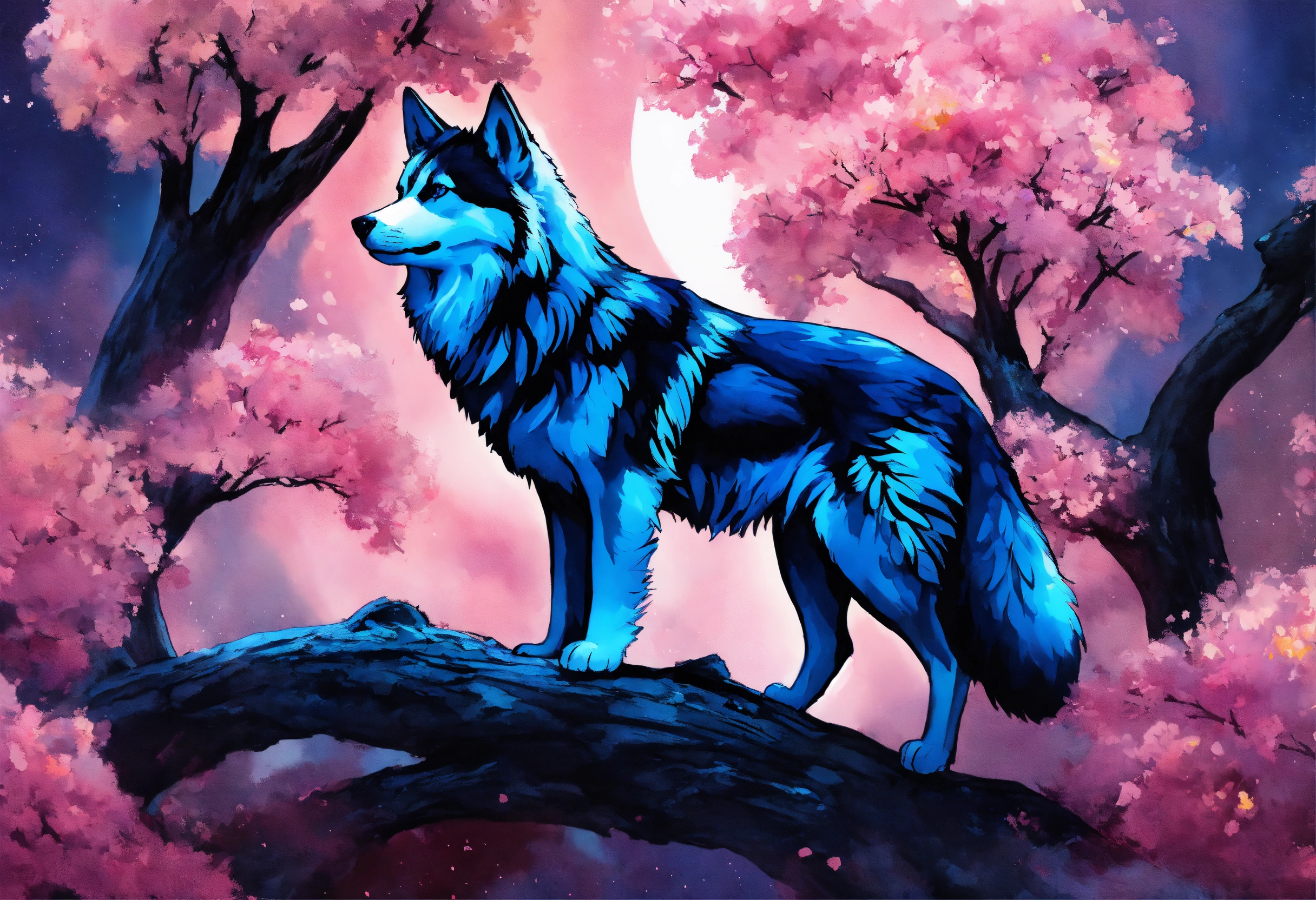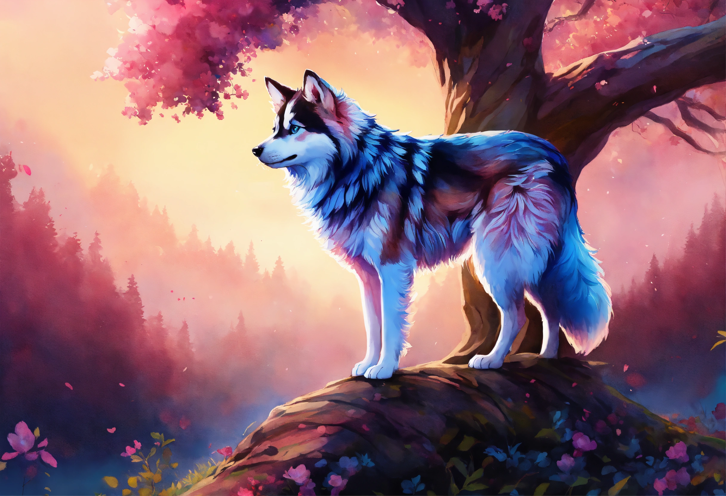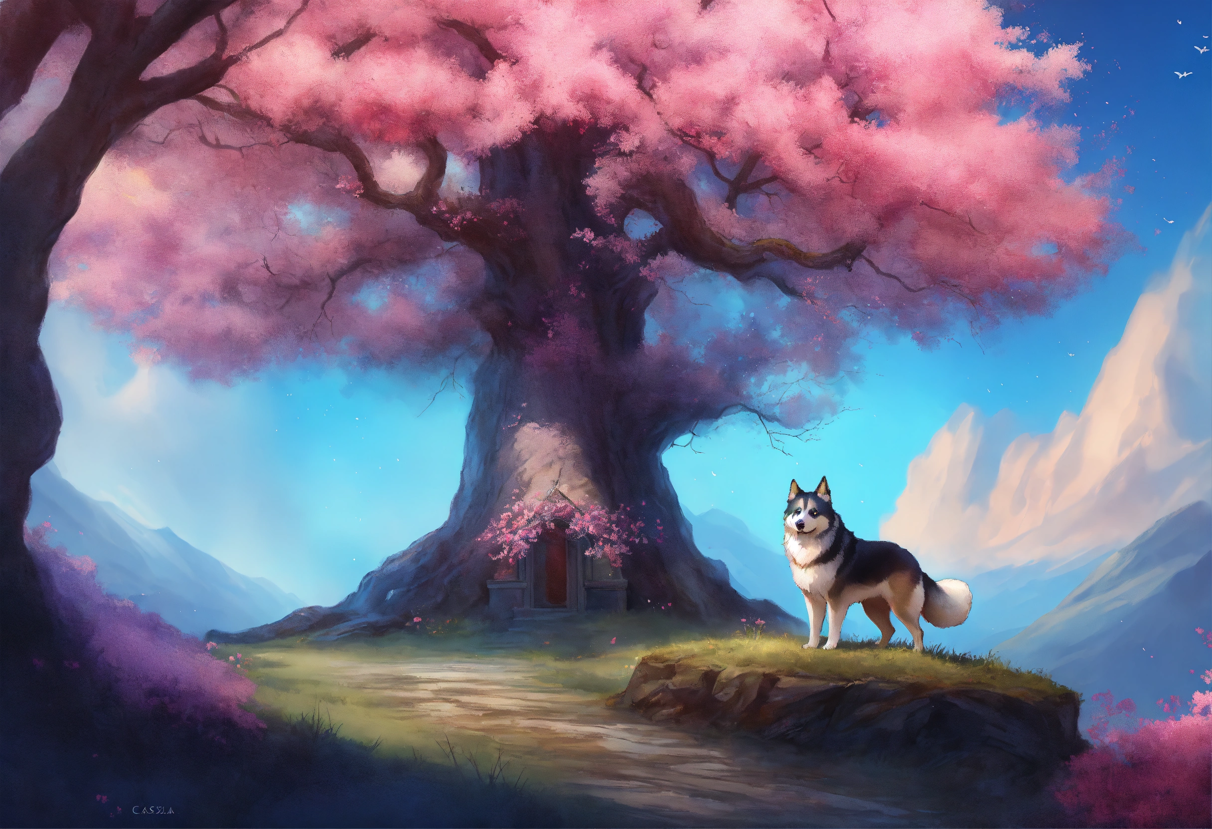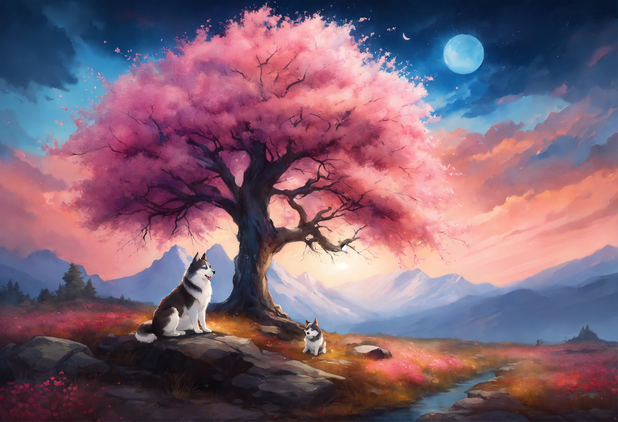 A digital illustration unfolds, featuring two pomskies black and white with opulent, cascading fur and captivating blue eyes, gracefully positioned on either side of the base of a resplendent ancient tree. the tree, resplendent in hues of rose, blue, stands prominently at the center of the artwork, its branches reaching toward the heavens. the pomskies, meticulously detailed, exude a sense of freedom and depth of soul. this digital masterpiece embodies perfection, showcasing remarkable attention to detail. created in a watercolor style, the illustration radiates vibrancy and artistic brilliance. with a sharp and smooth focus, the artwork boasts a rich and diverse color palette, accentuated by the soft interplay of pink, blue hues. the composition allows for the complete view of the majestic tree, adding to the overall sense of awe and wonder. this artwork harmoniously blends the natural world with creative expression, making it a captivating choice for art enthusiasts.