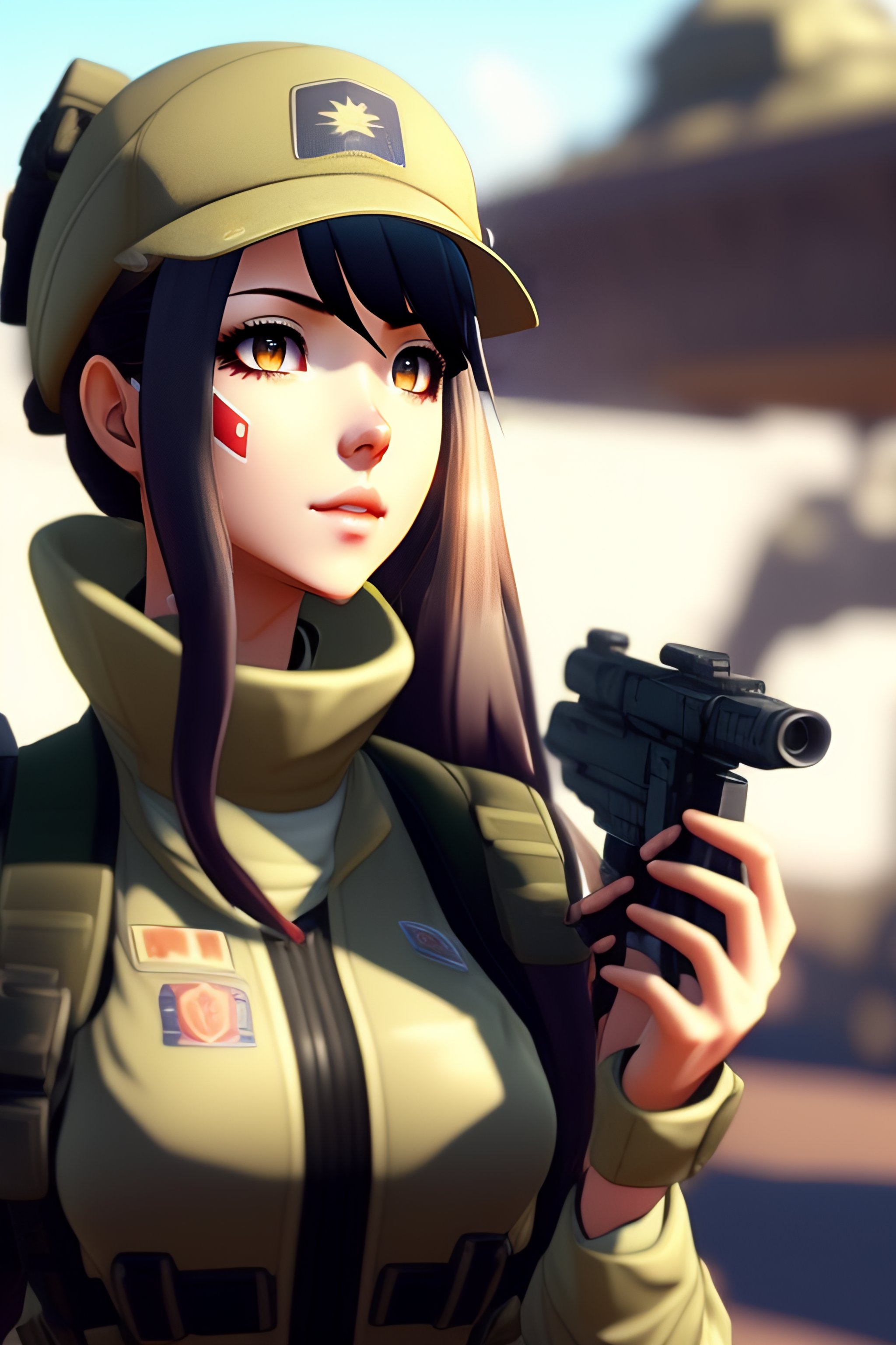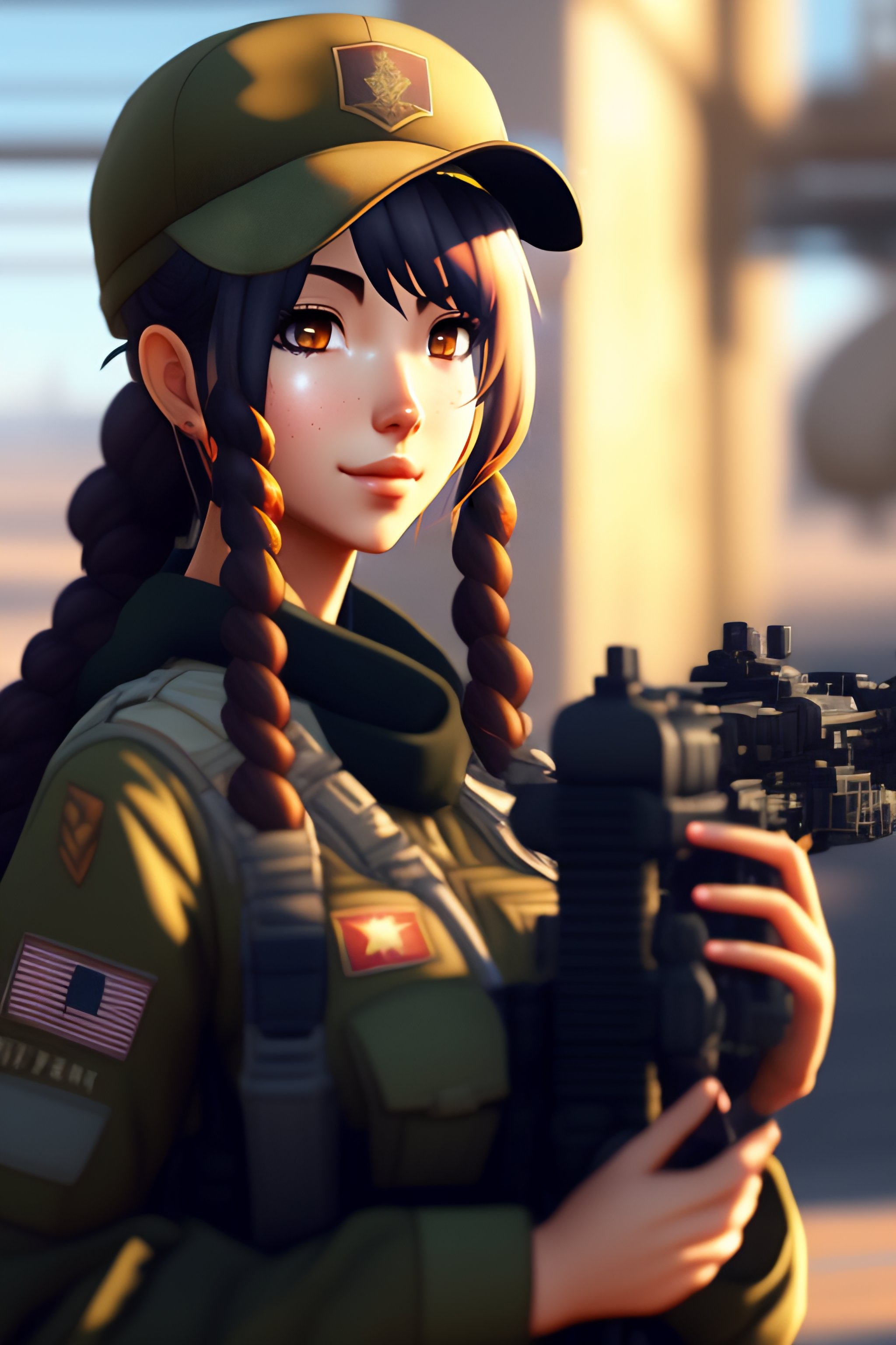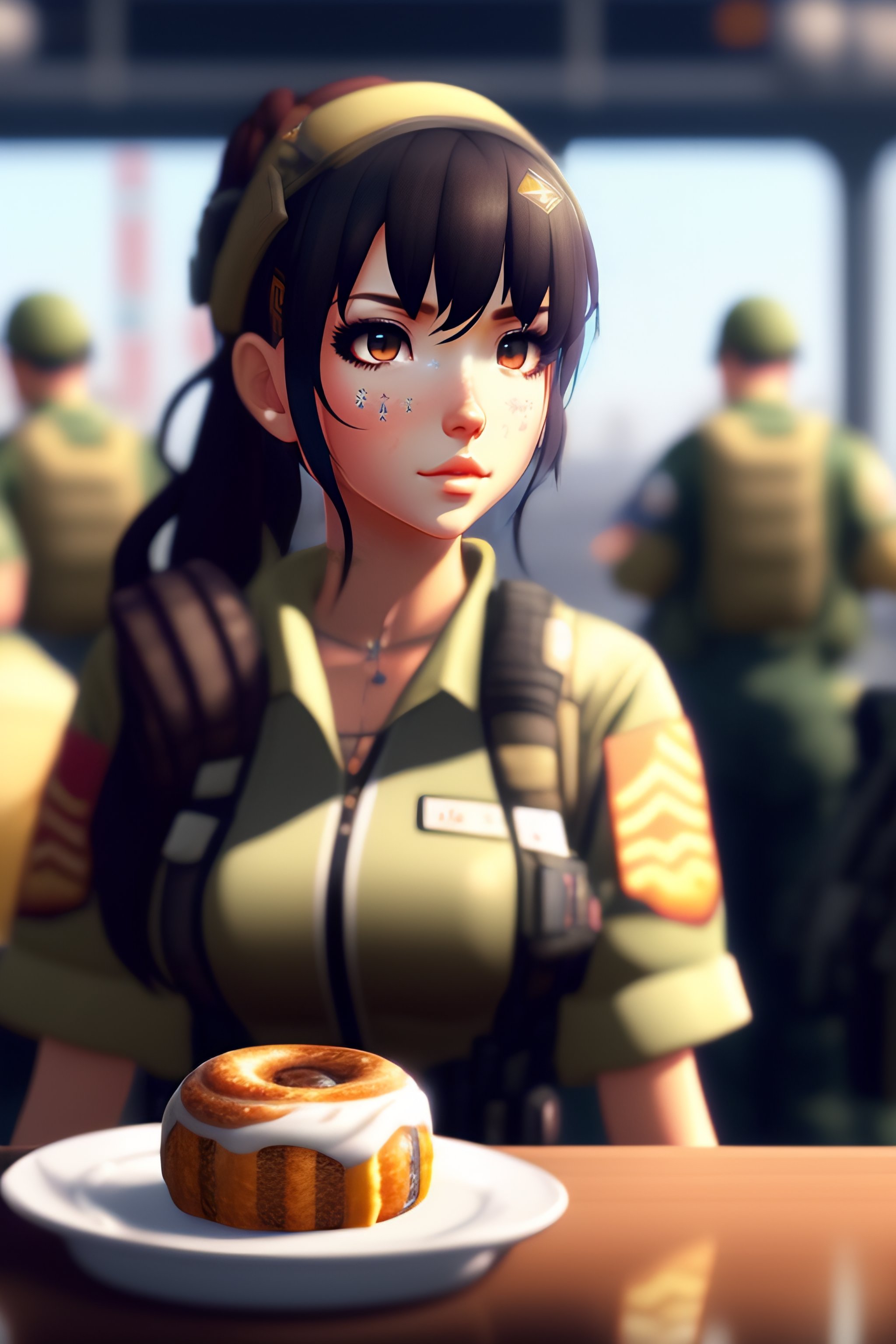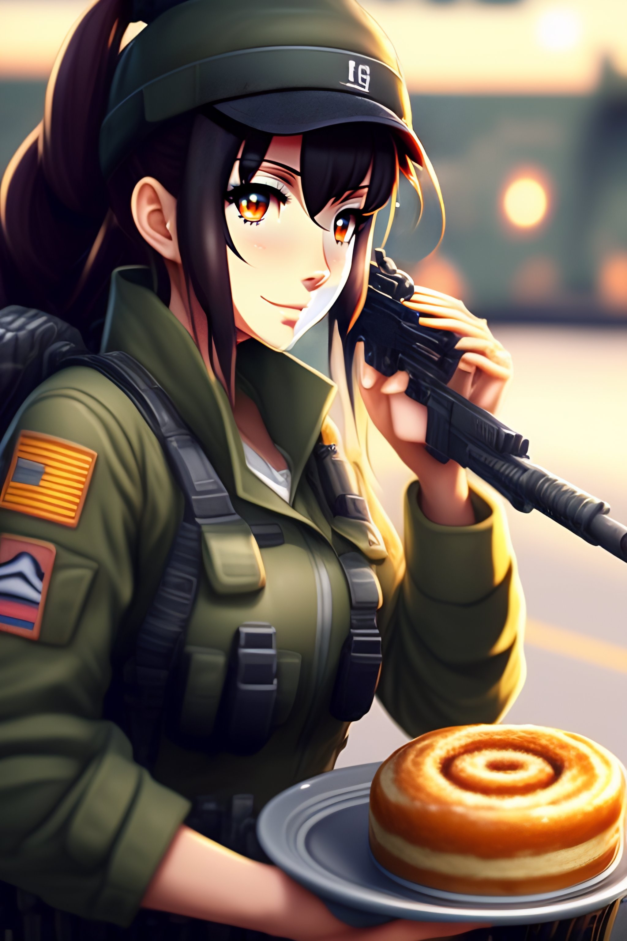 M4a1 from girl's frontline eating a cinnamon roll in a military base