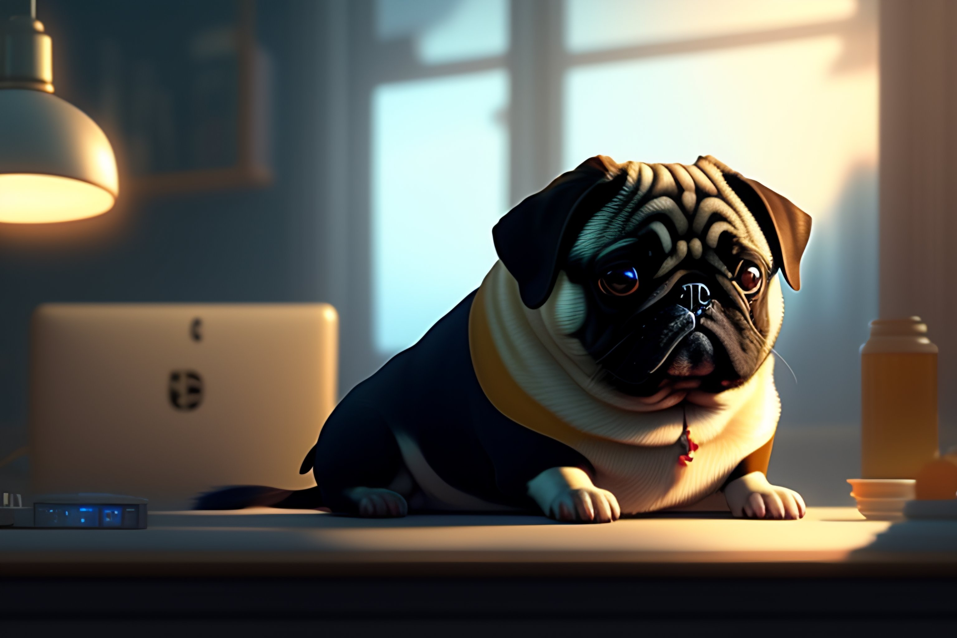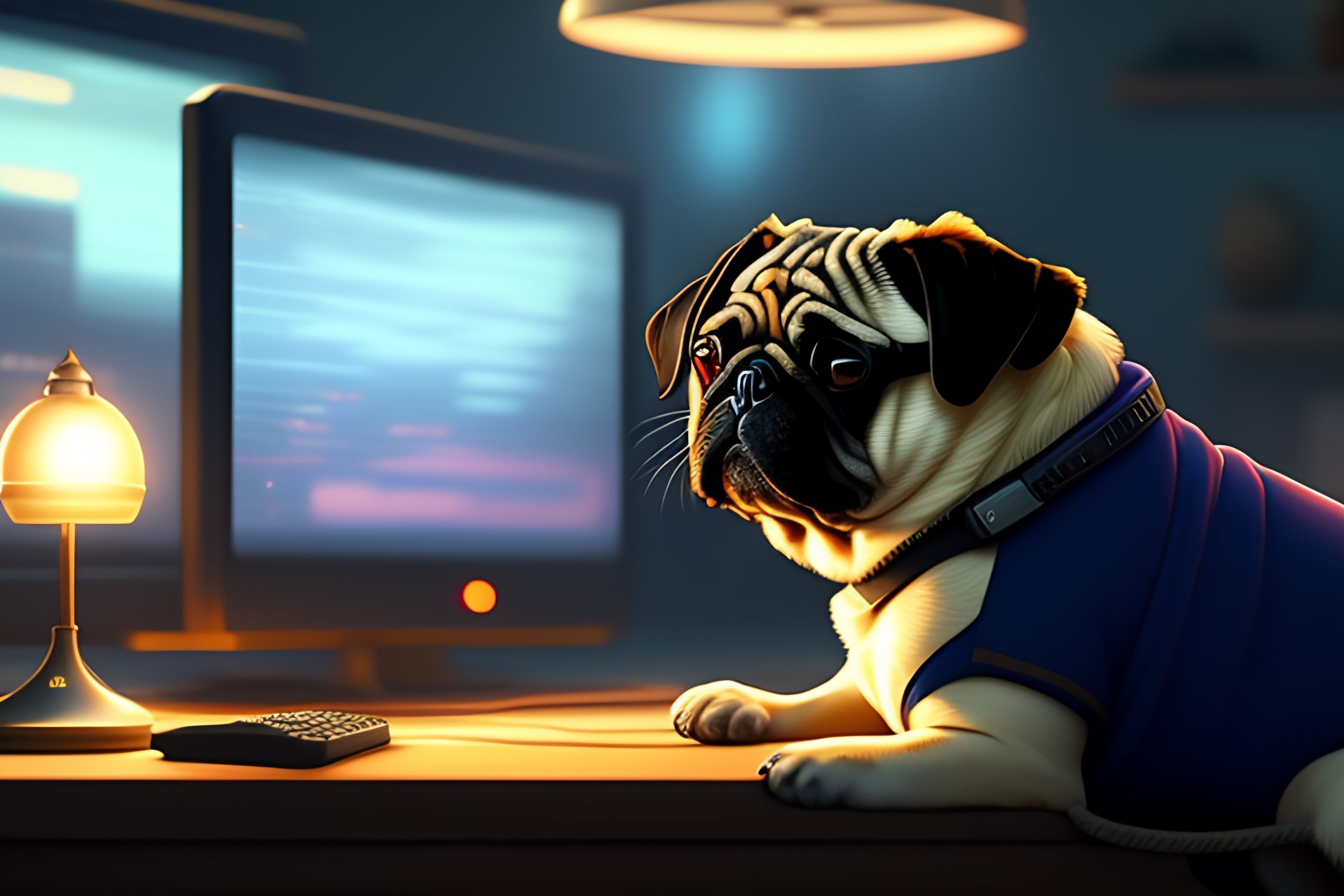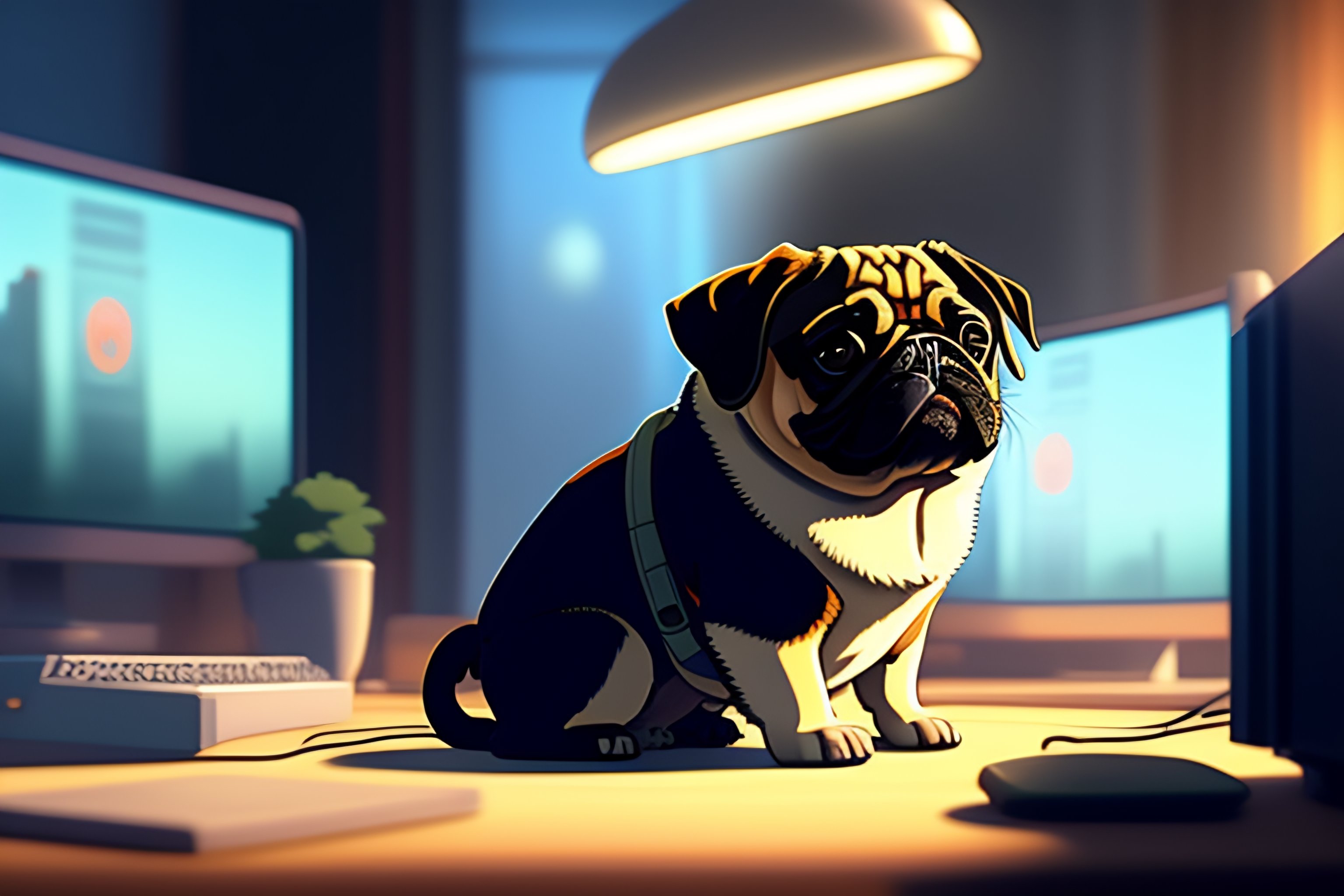 A nerdy pug is programming at a computer in a room full of gadgets, by makoto shinkai and ghibli studio, dramatic lighting, highly detailed, incredible quality