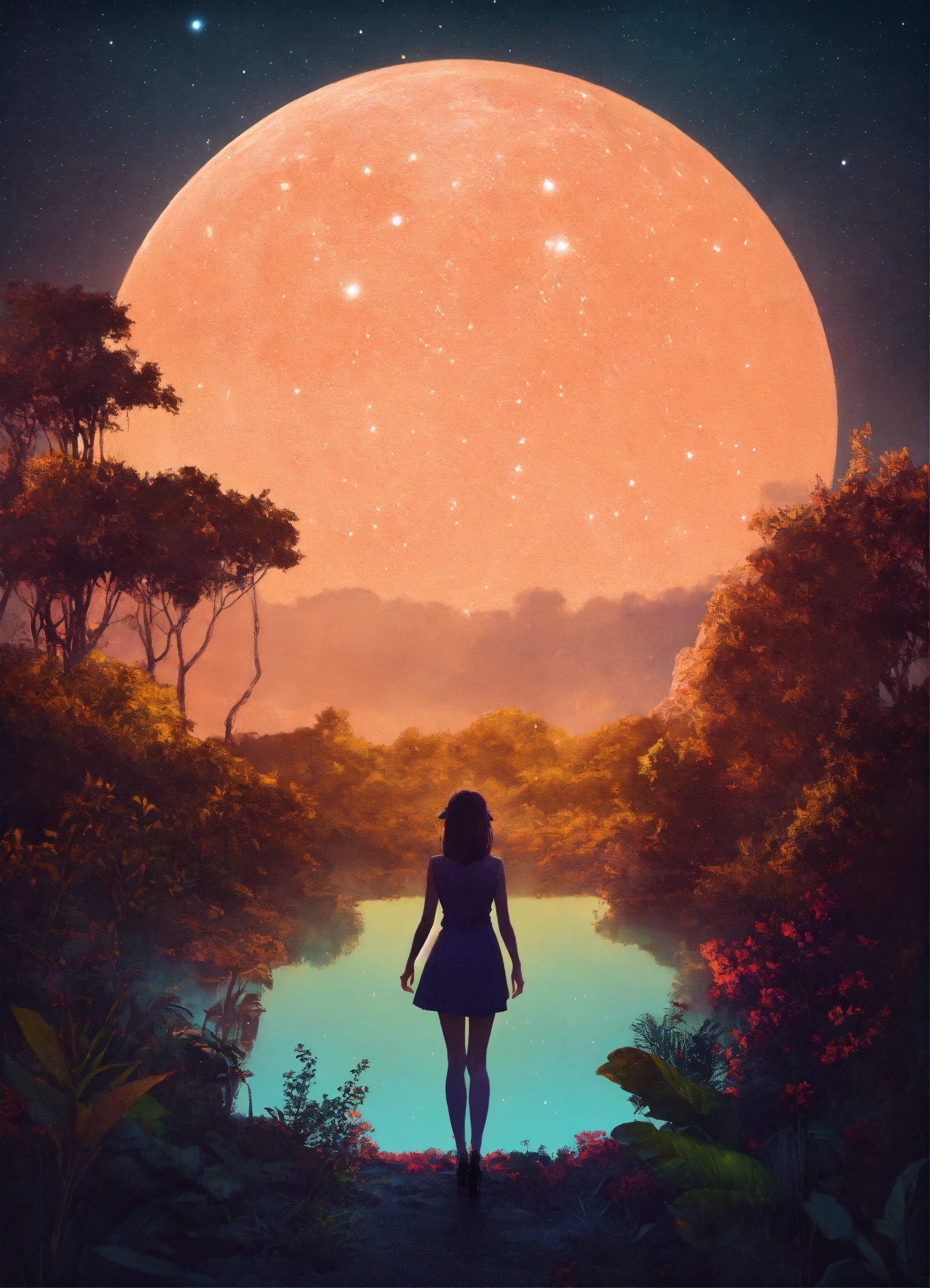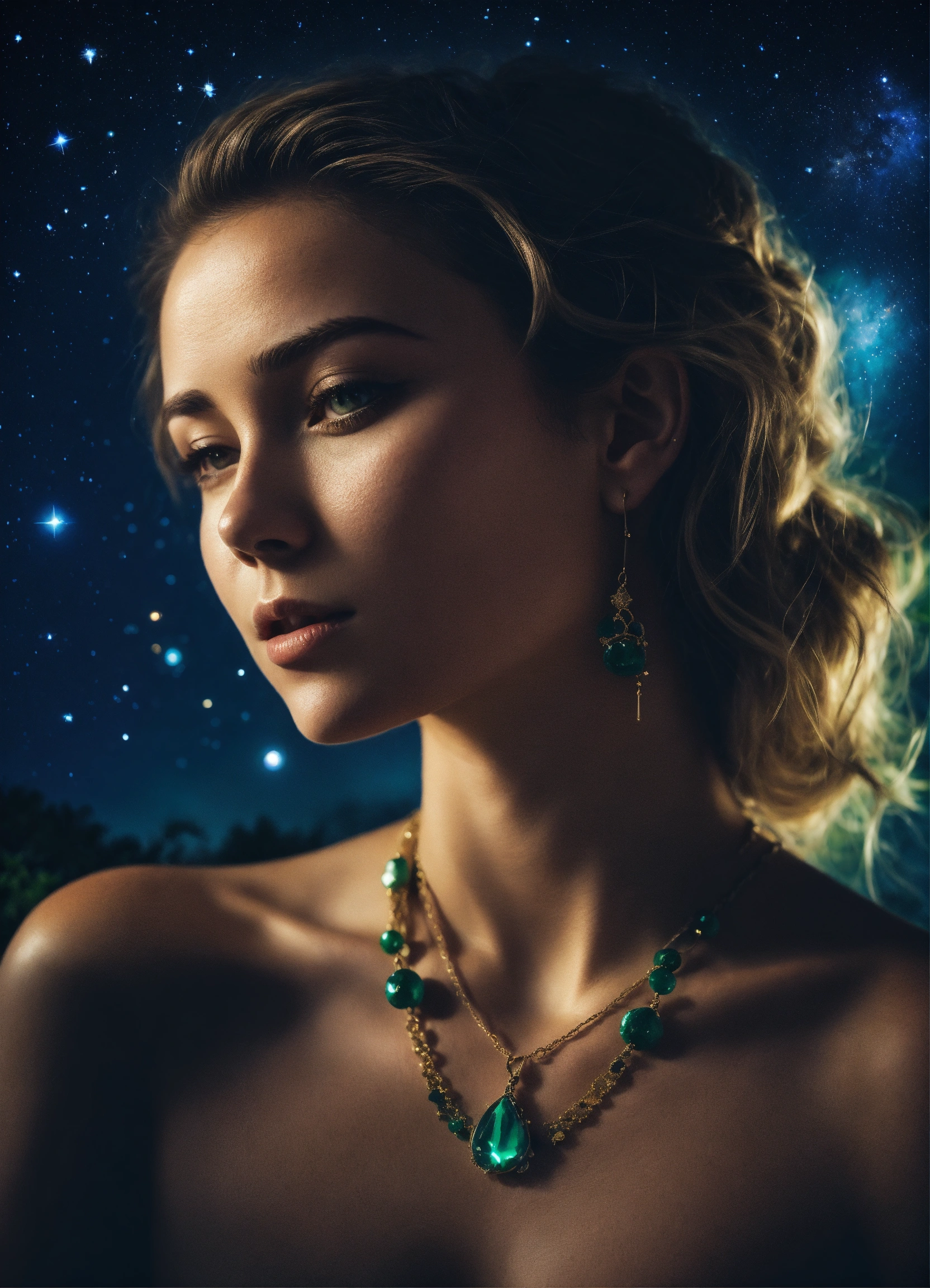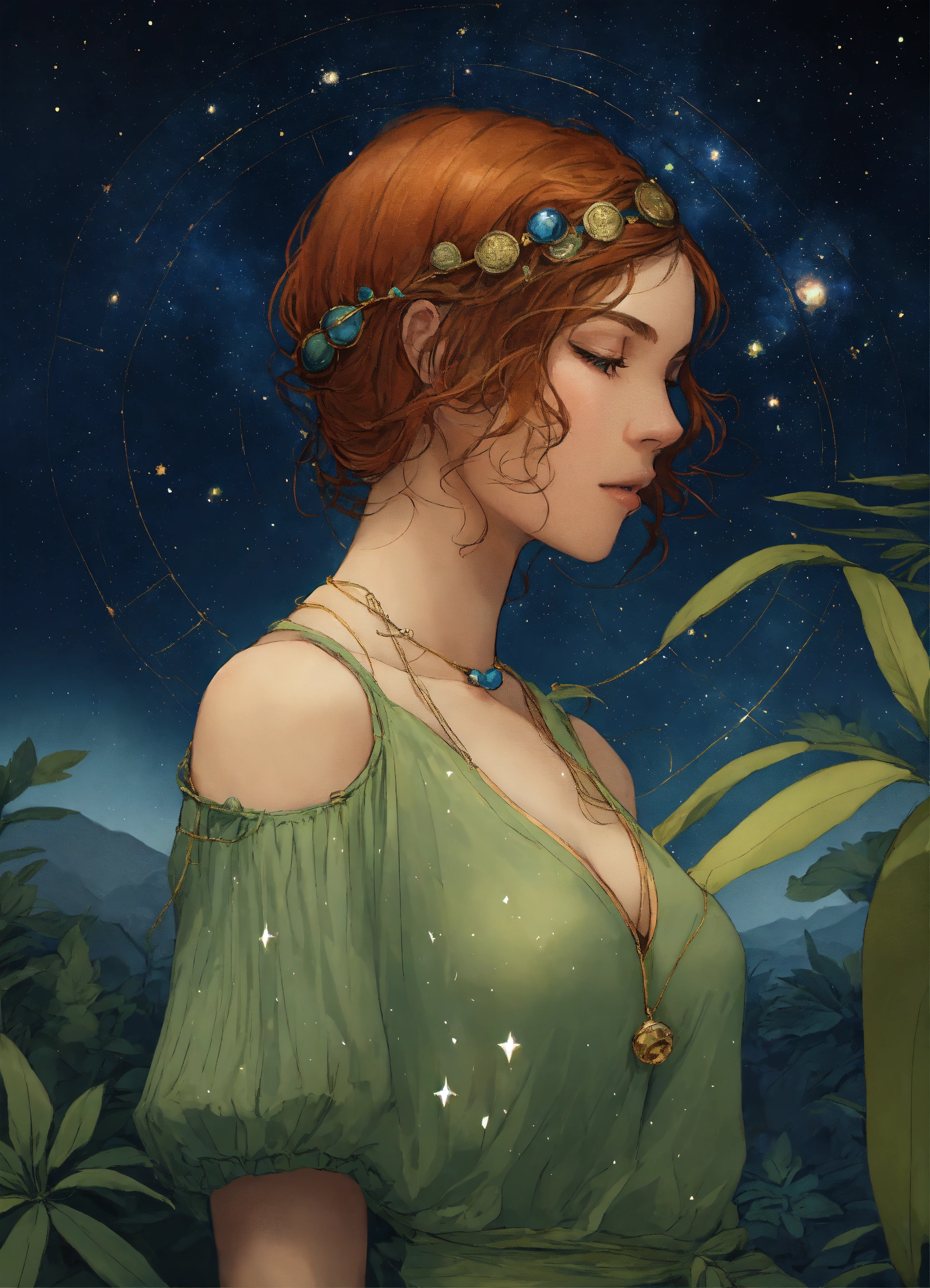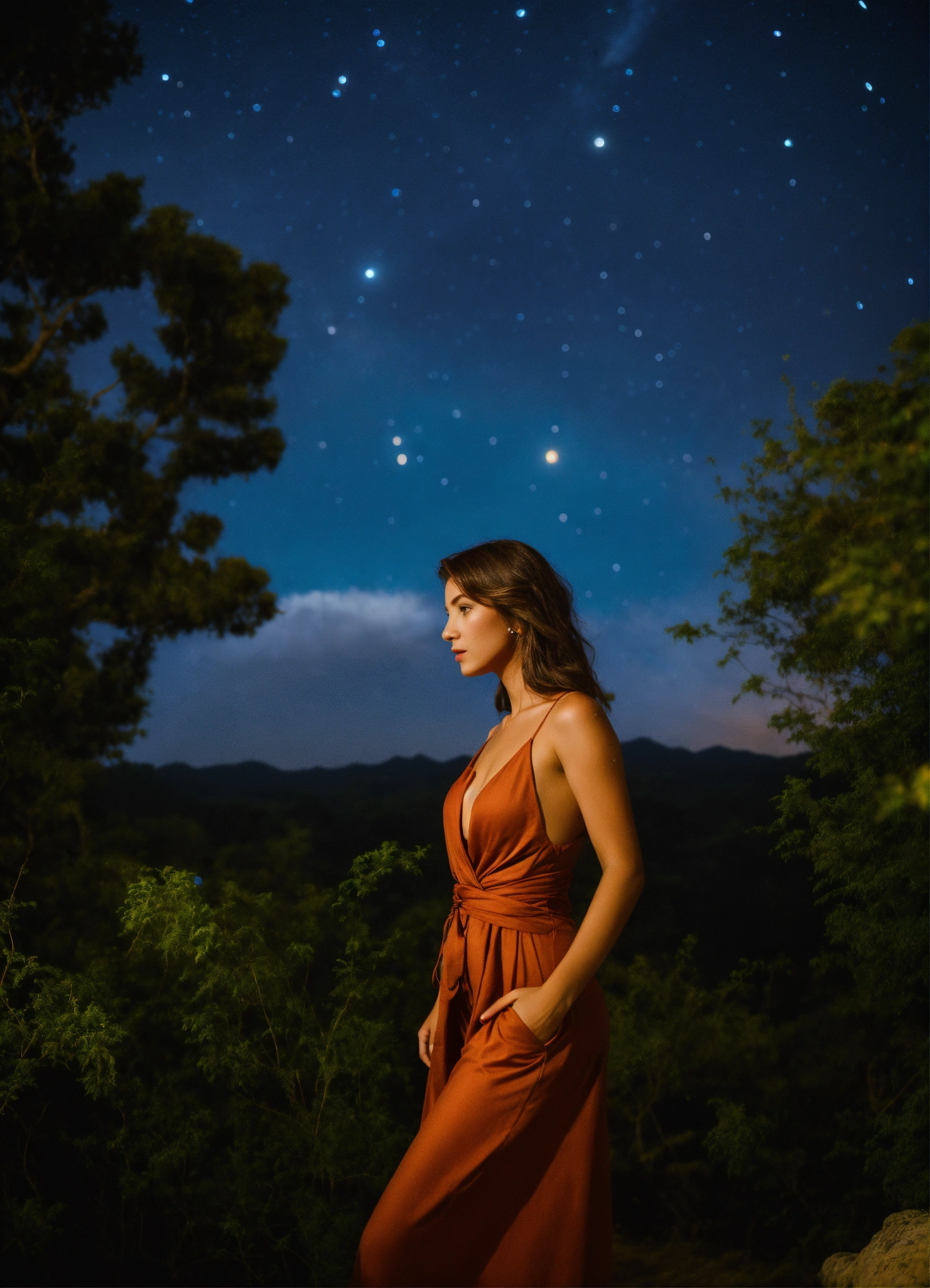 Photo portrait style film d'animation, prise de vue au plan moyen d'une exploratrice astrologue de 25 ans qui se tiens face à nous, il y as un télescope à coter d'elle, elle est séduisante, sensuelle et audacieuse, une silhouette fine en x, un tour de poitrine 85d en forme de volcan, elle habillée d'une combinaison vert kaki au décolleté plongeant fendue, elle porte un collier avec une pierre bleue, ses cheveux sont châtain foncée et un peu ondulée, elle est dans la jungle tropicale entourée de beaucoup de végétations au milieu de la nuit, le ciel est sombre est très étoilé avec des constellations.