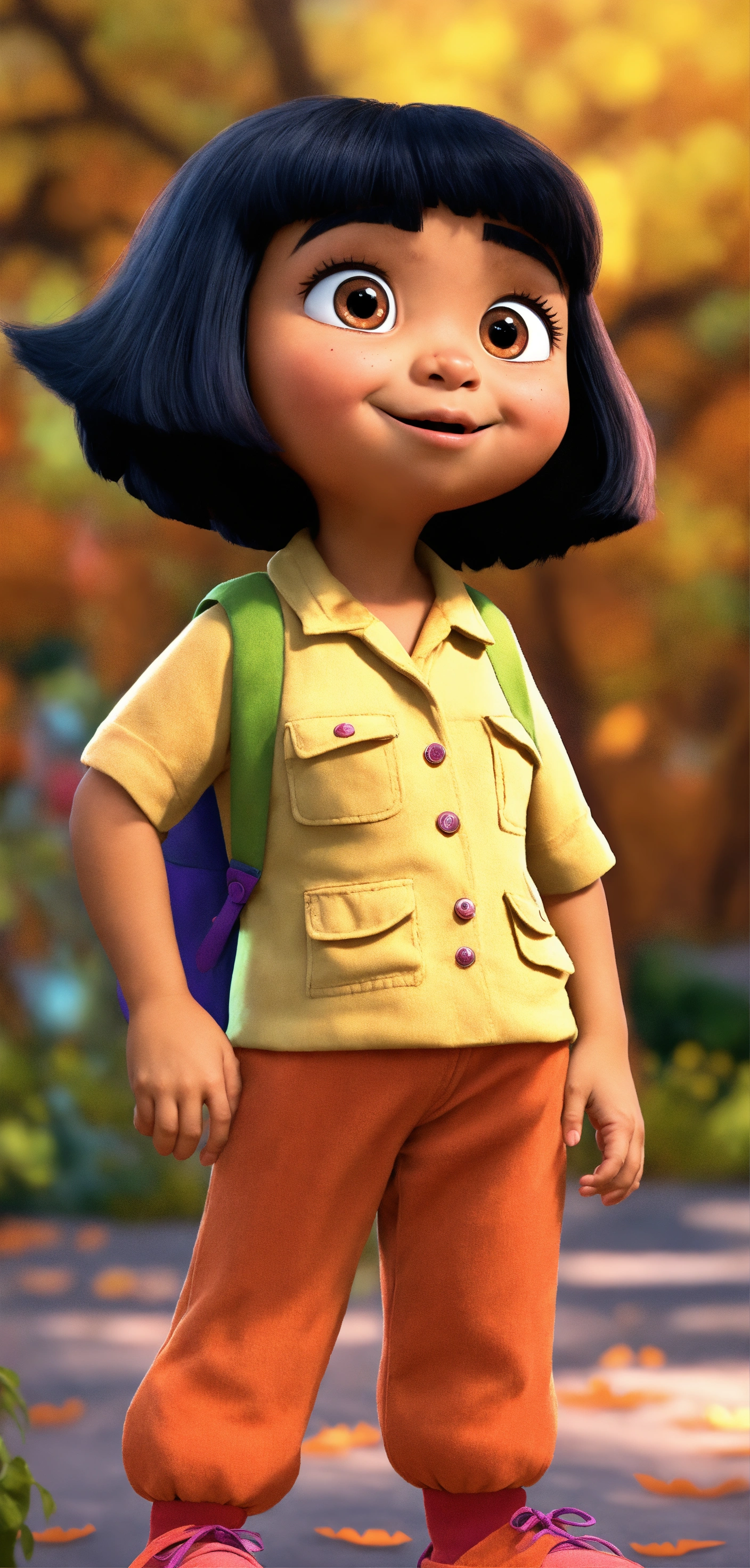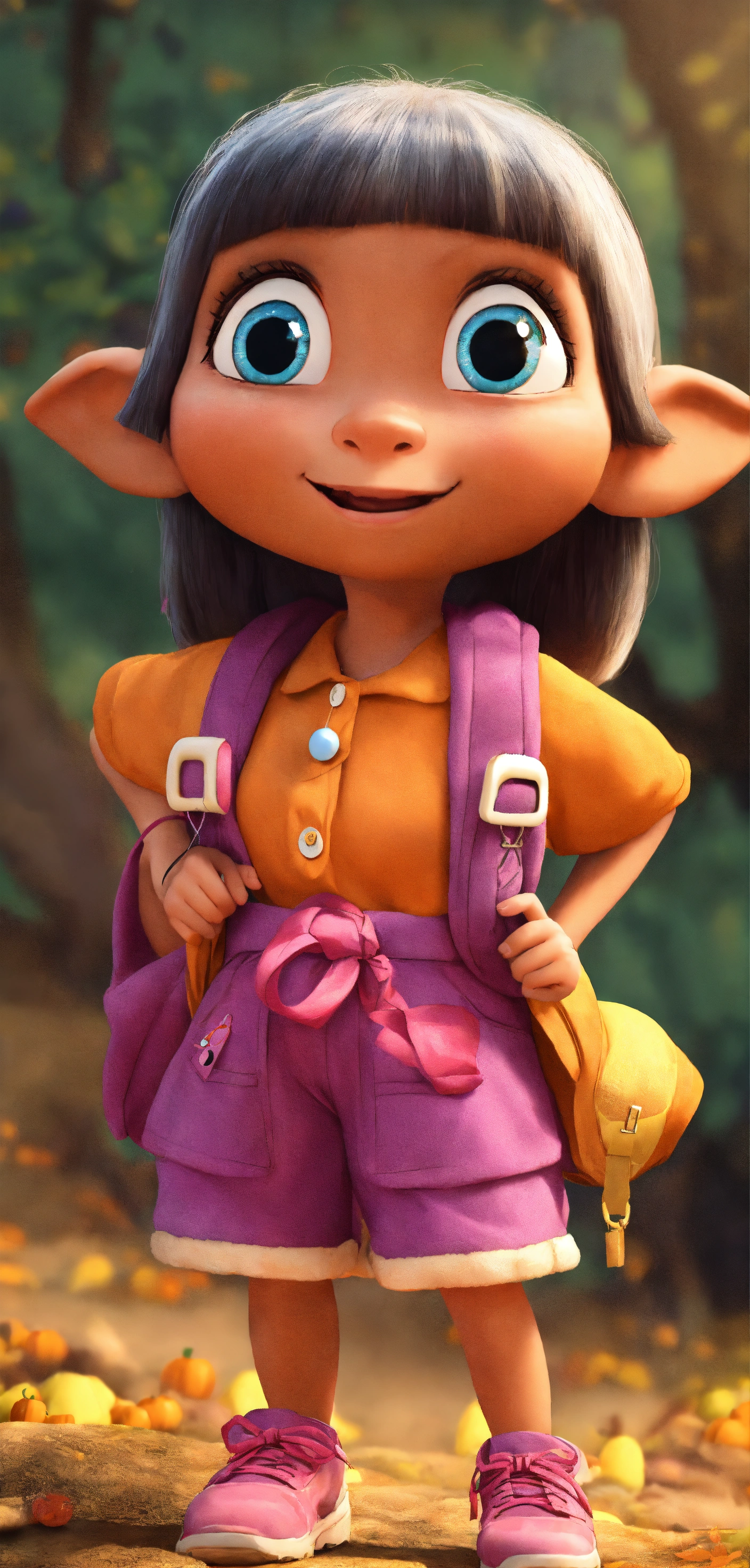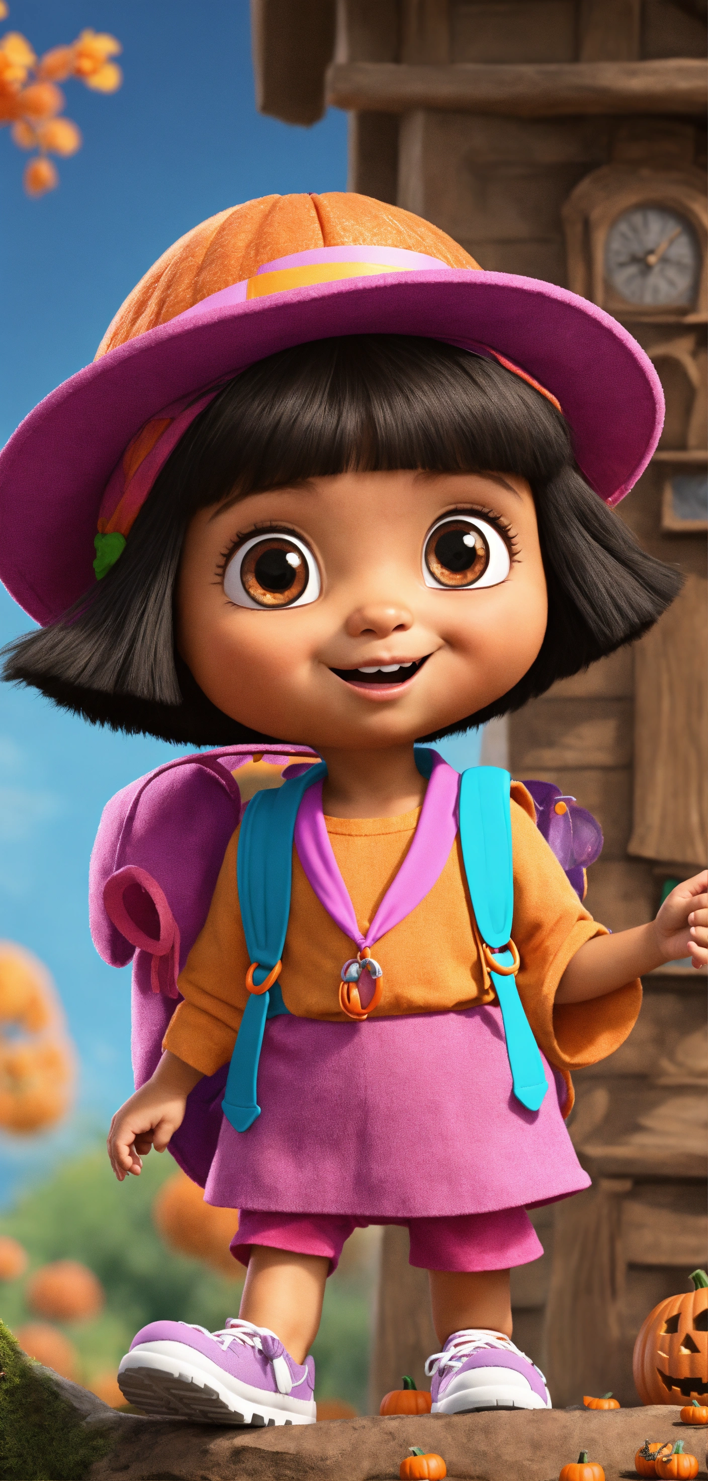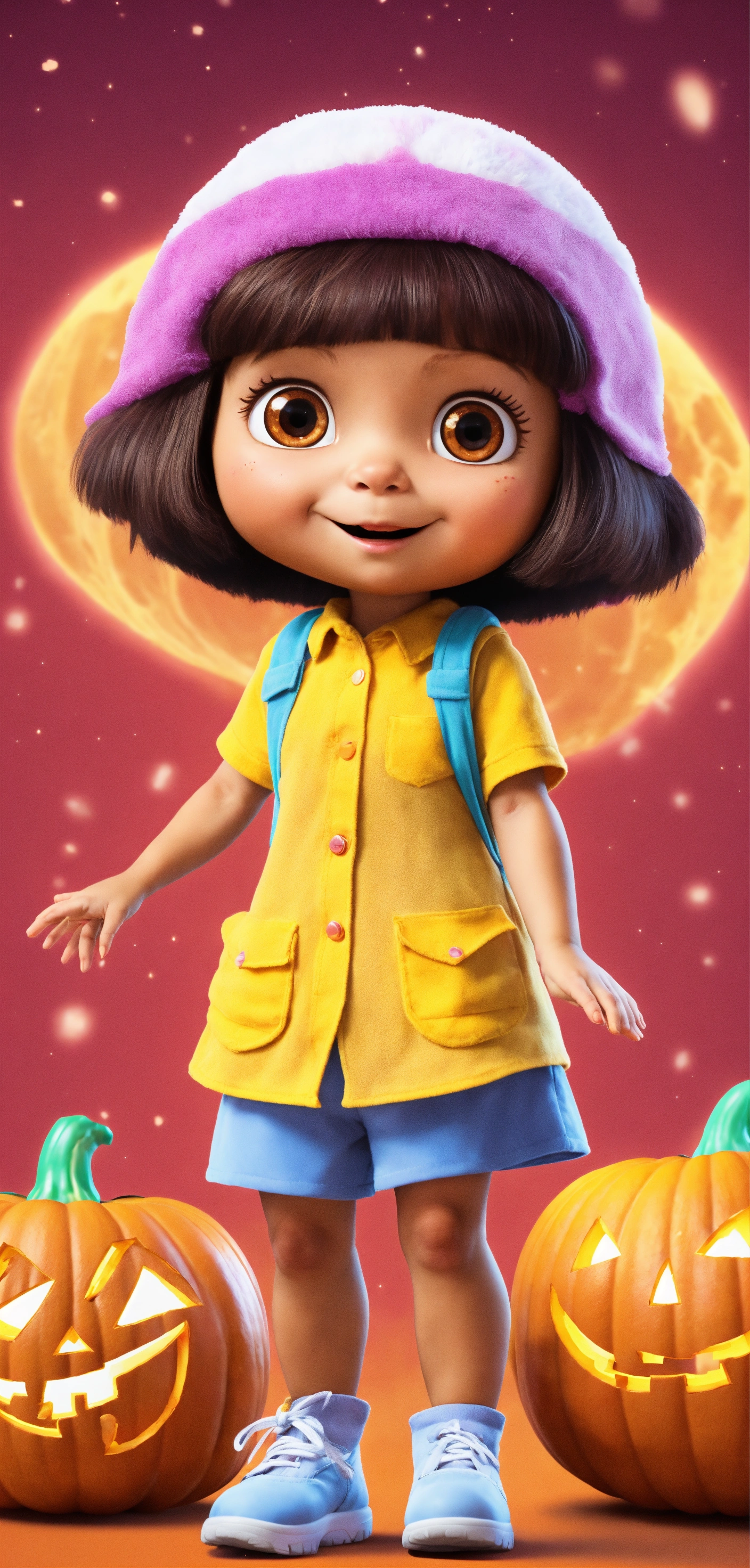 Dora the explorer as a cute centenarian, cartoon effect, halloween theme, very big eyes. more detailed ultra realist 8k.