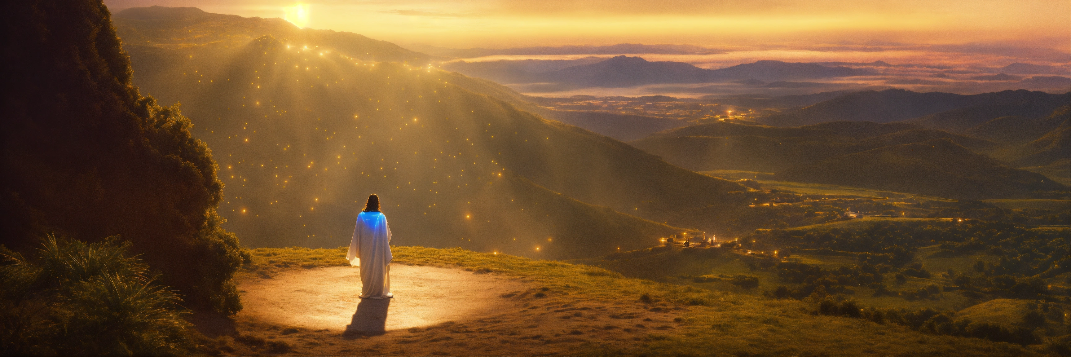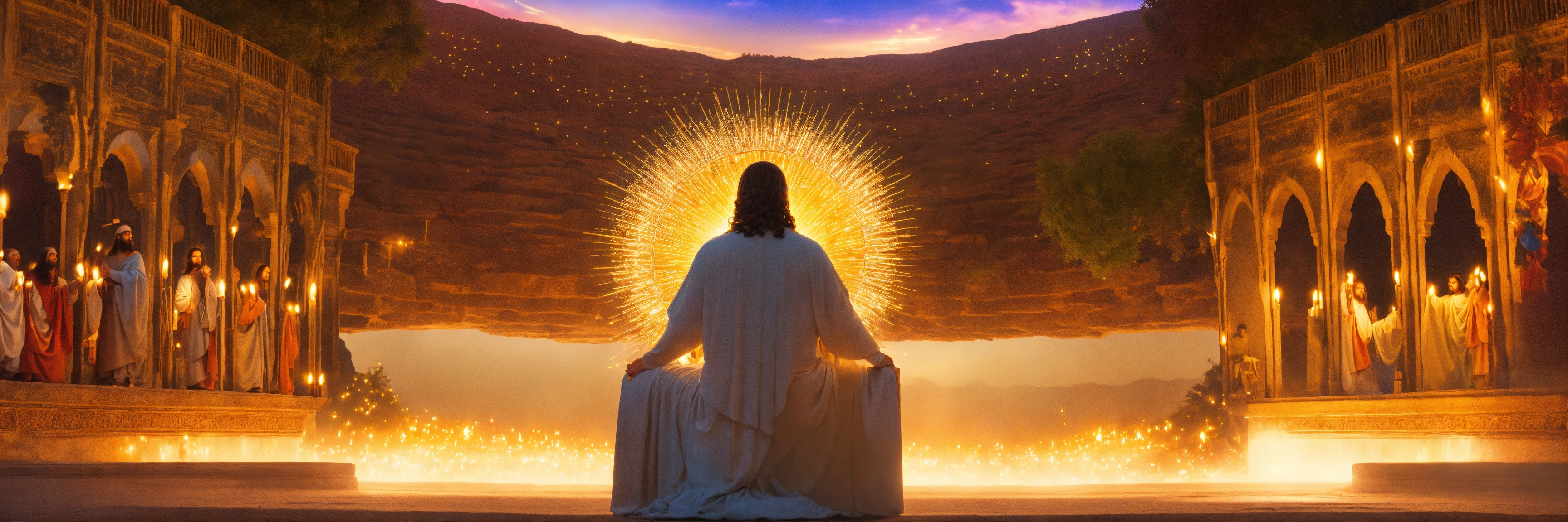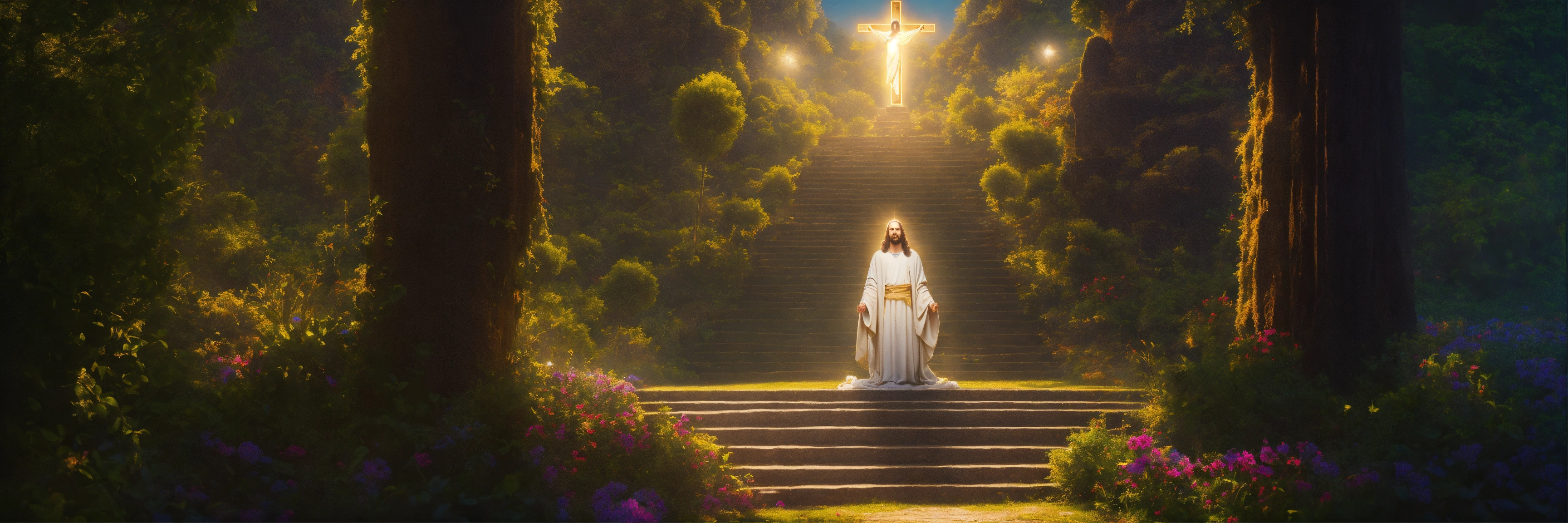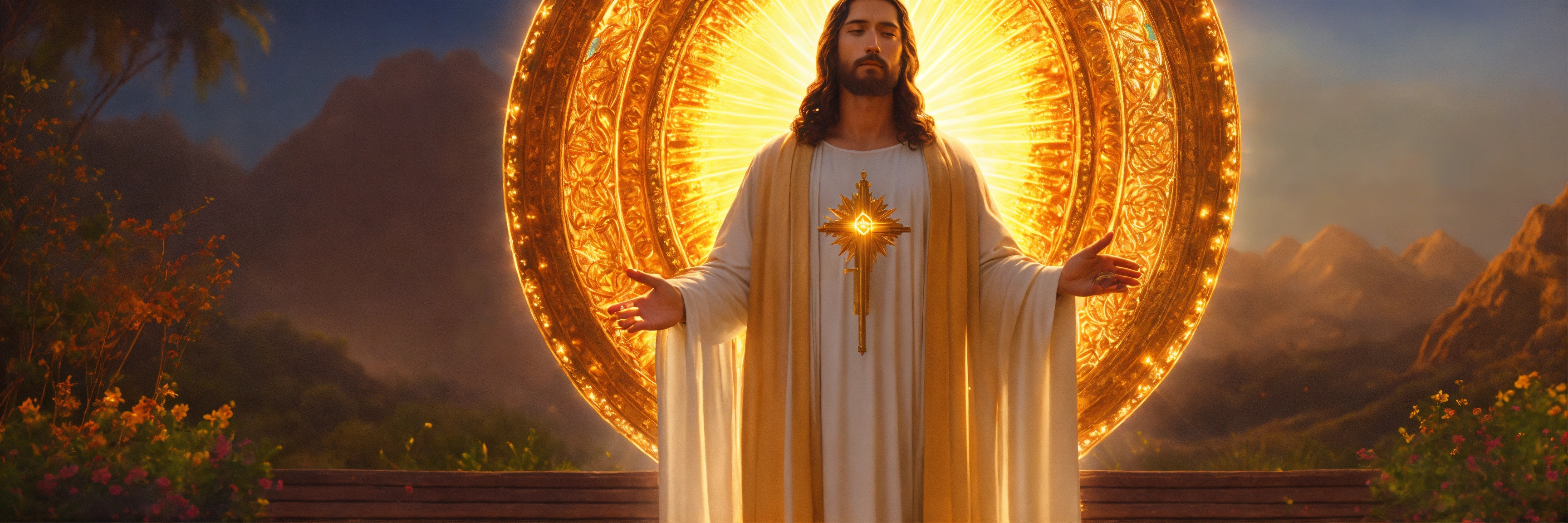Experience the divine presence as you kneel before a glowing image of jesus, surrounded by the serene seclusion of your own thoughts, detailed, 16k, focused, extreme details, super resolution, cinematic, masterpiece.