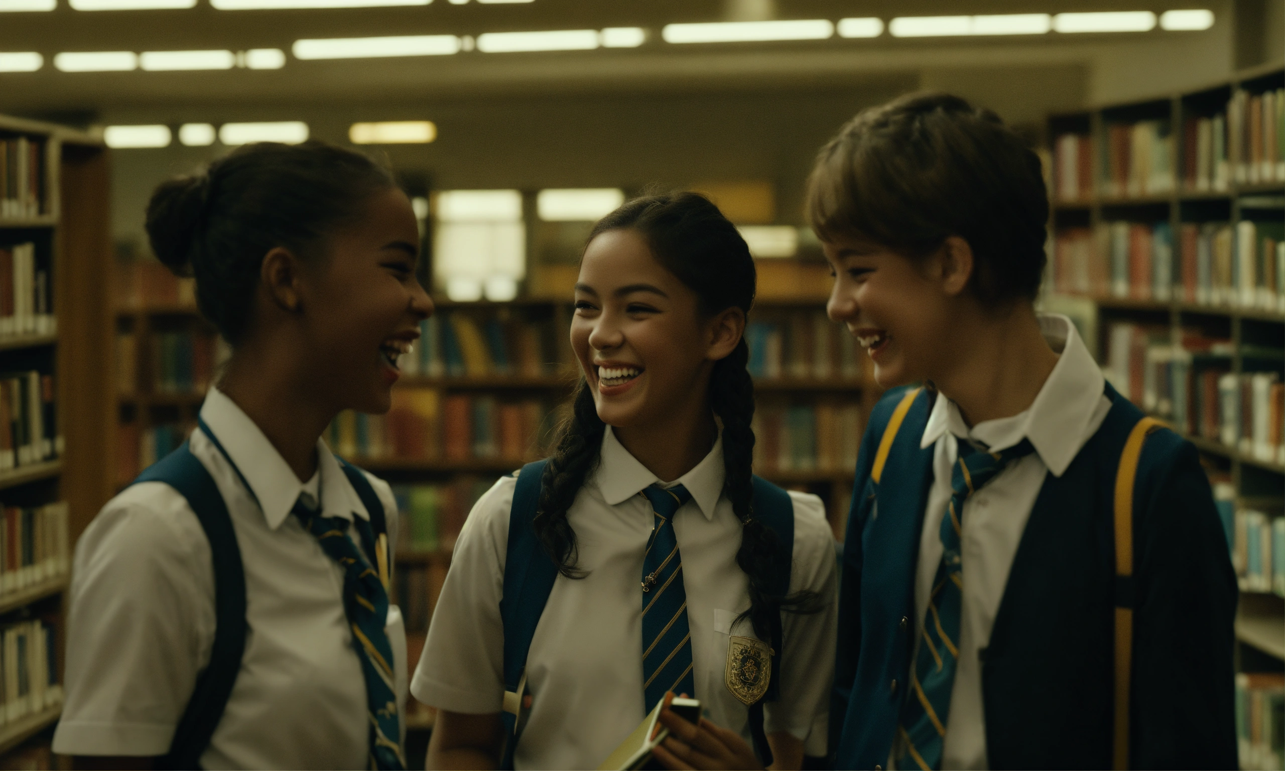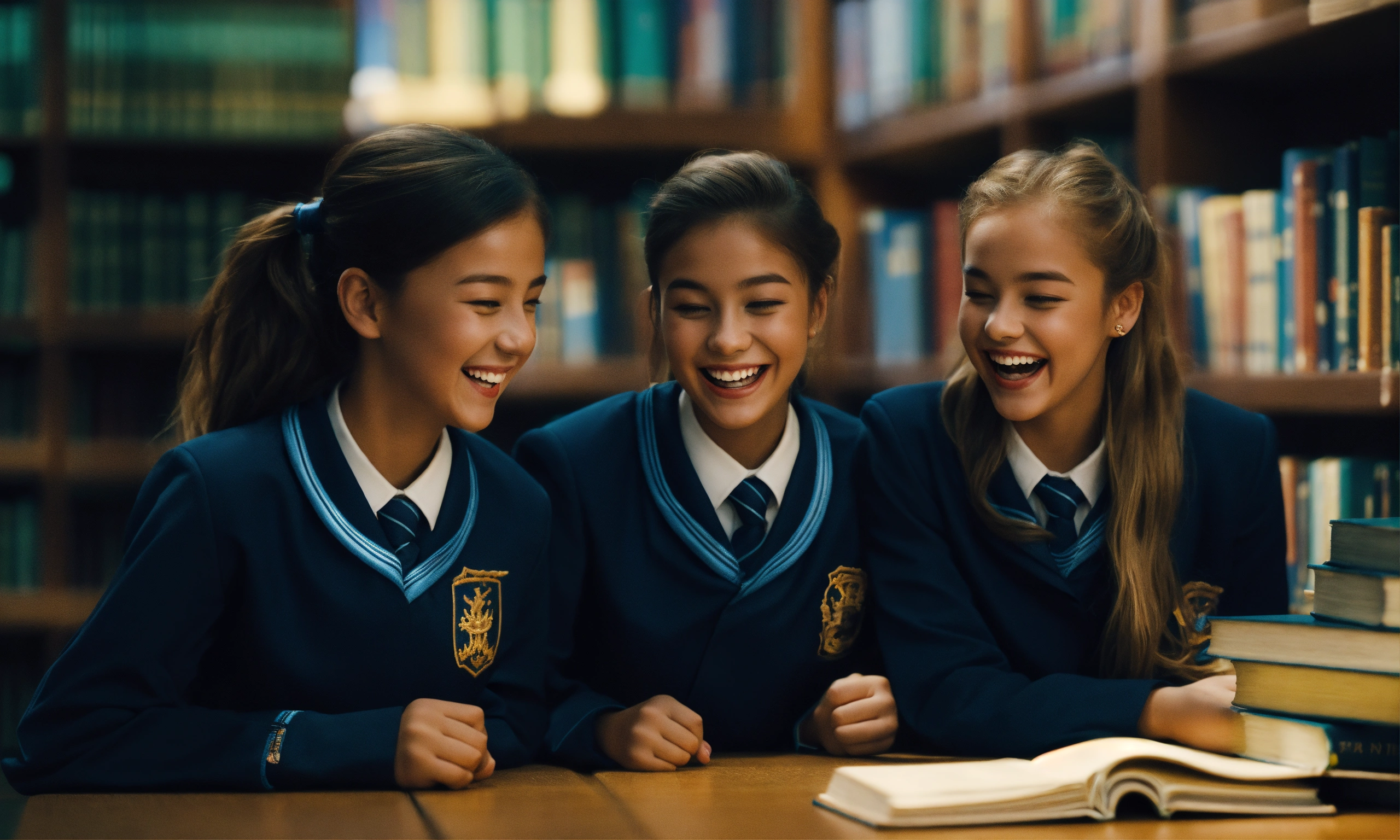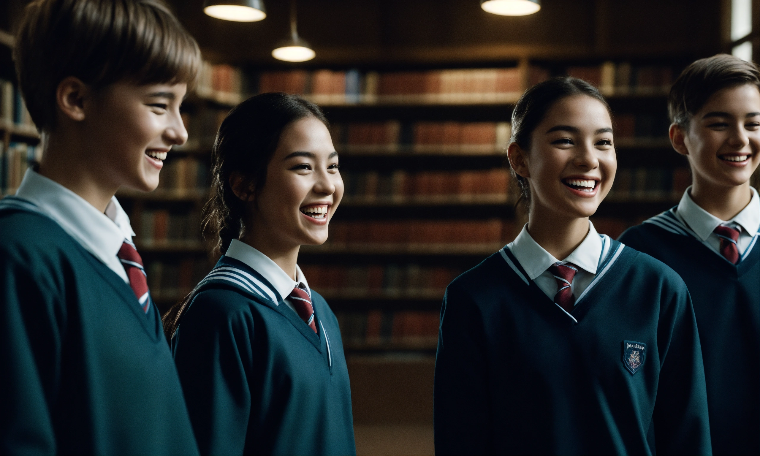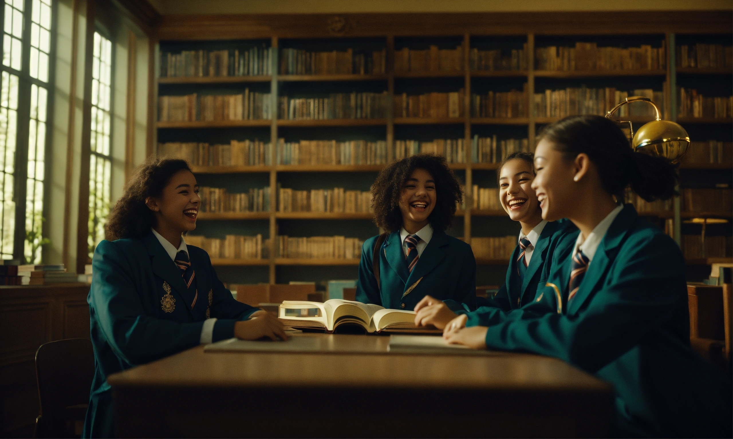 4 school students in school uniform laughing together in library, mood lighting, wide front shot, 8k, luxcorerender, earthly colour, cinematic photography, real humans, real images, matte finish, shot on arri anamorphic, extreme wide shot, smooth, sharp focus, ornate, highly dynamic, particulate, hyperreal, wide shot