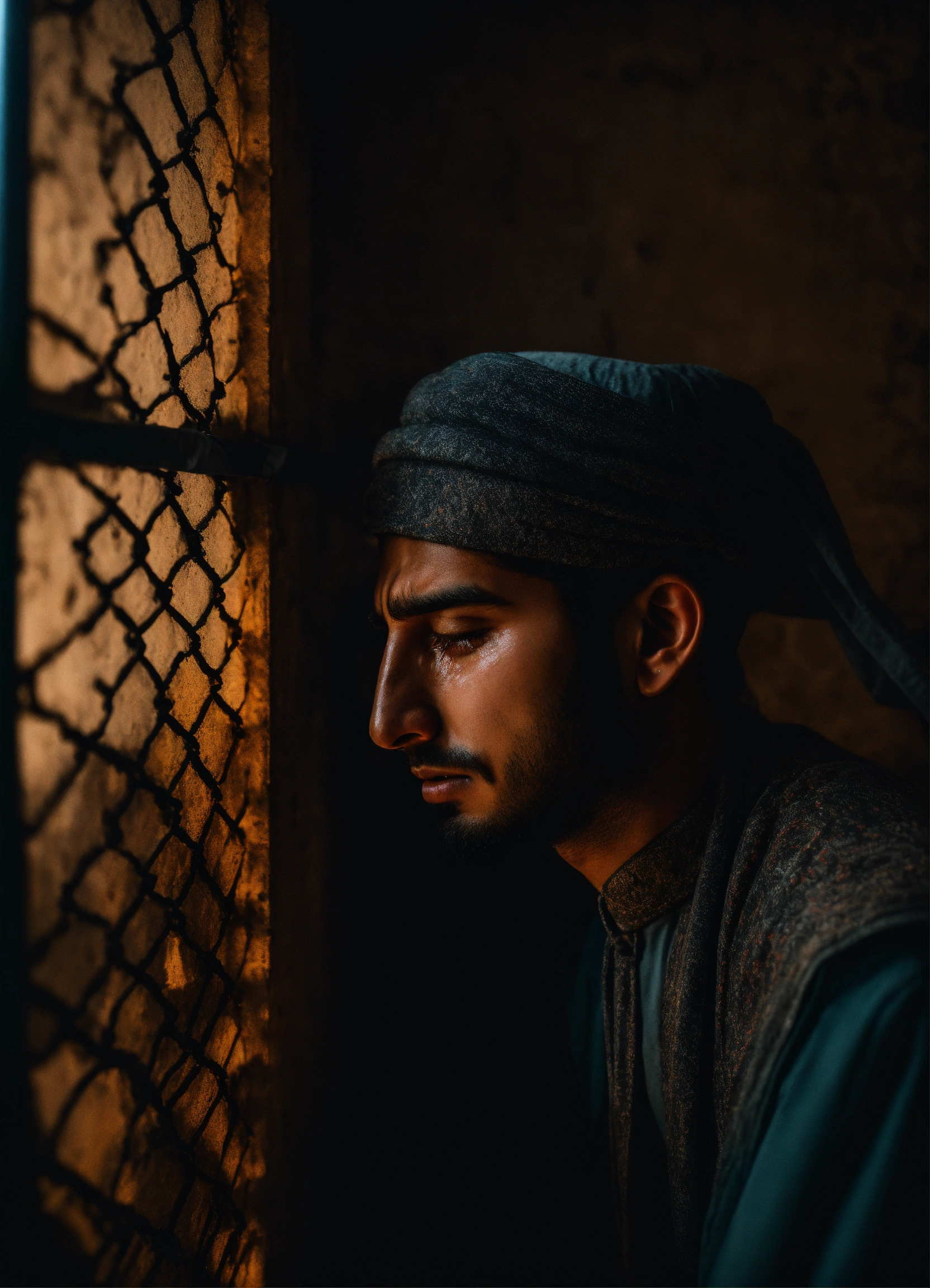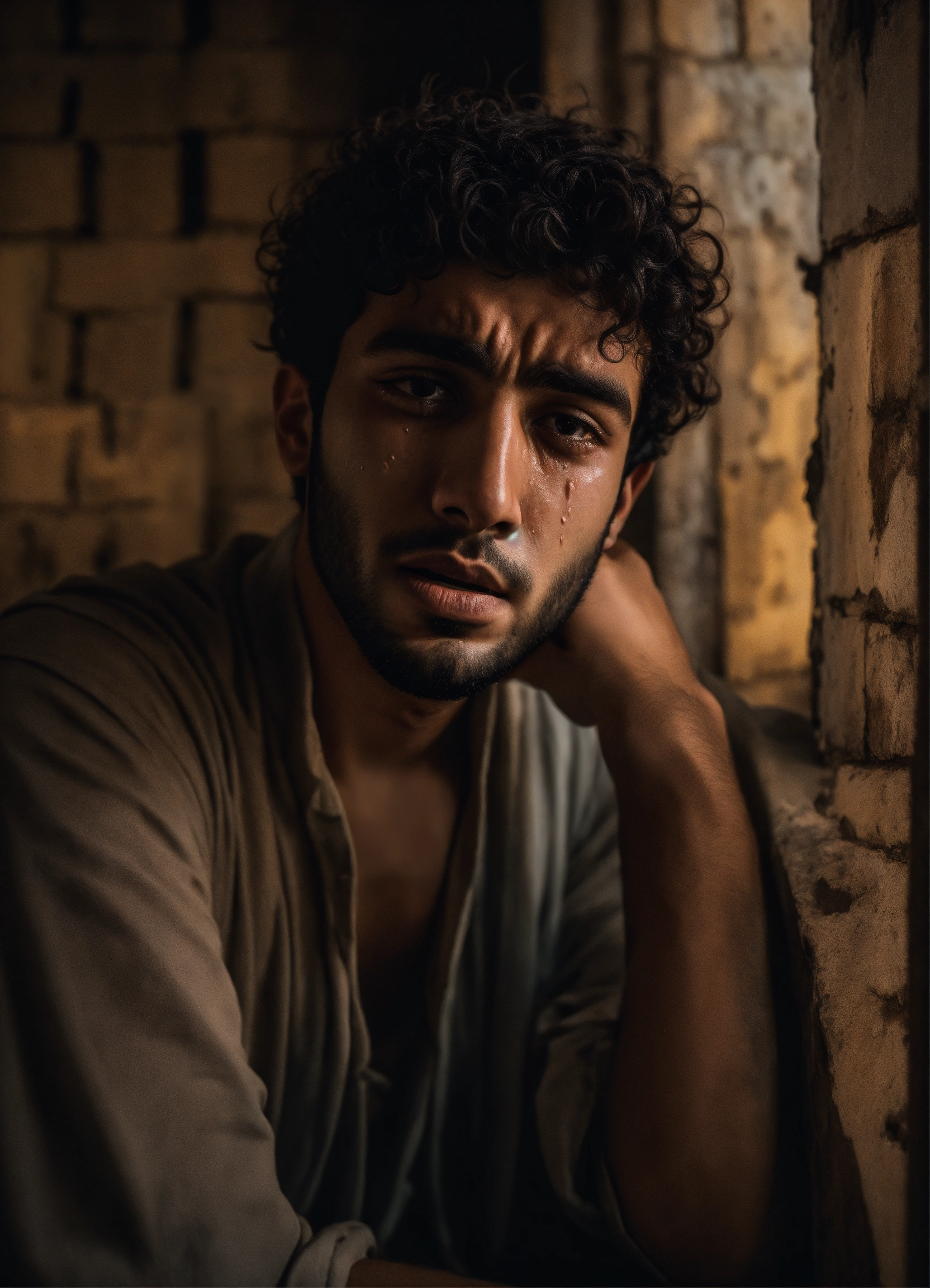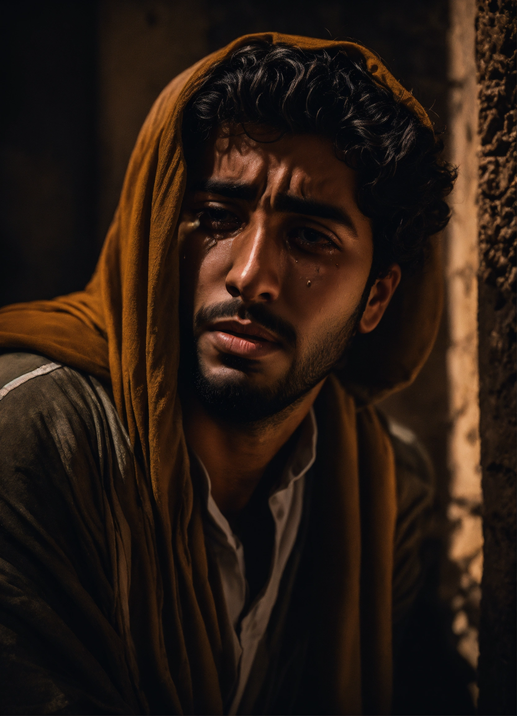 A miserable arab young man crying with a high wall before him, surreal photo, fujifilm xt3, dark lighting, raw photo, 8k uhd, unreal engine 5, ray trace