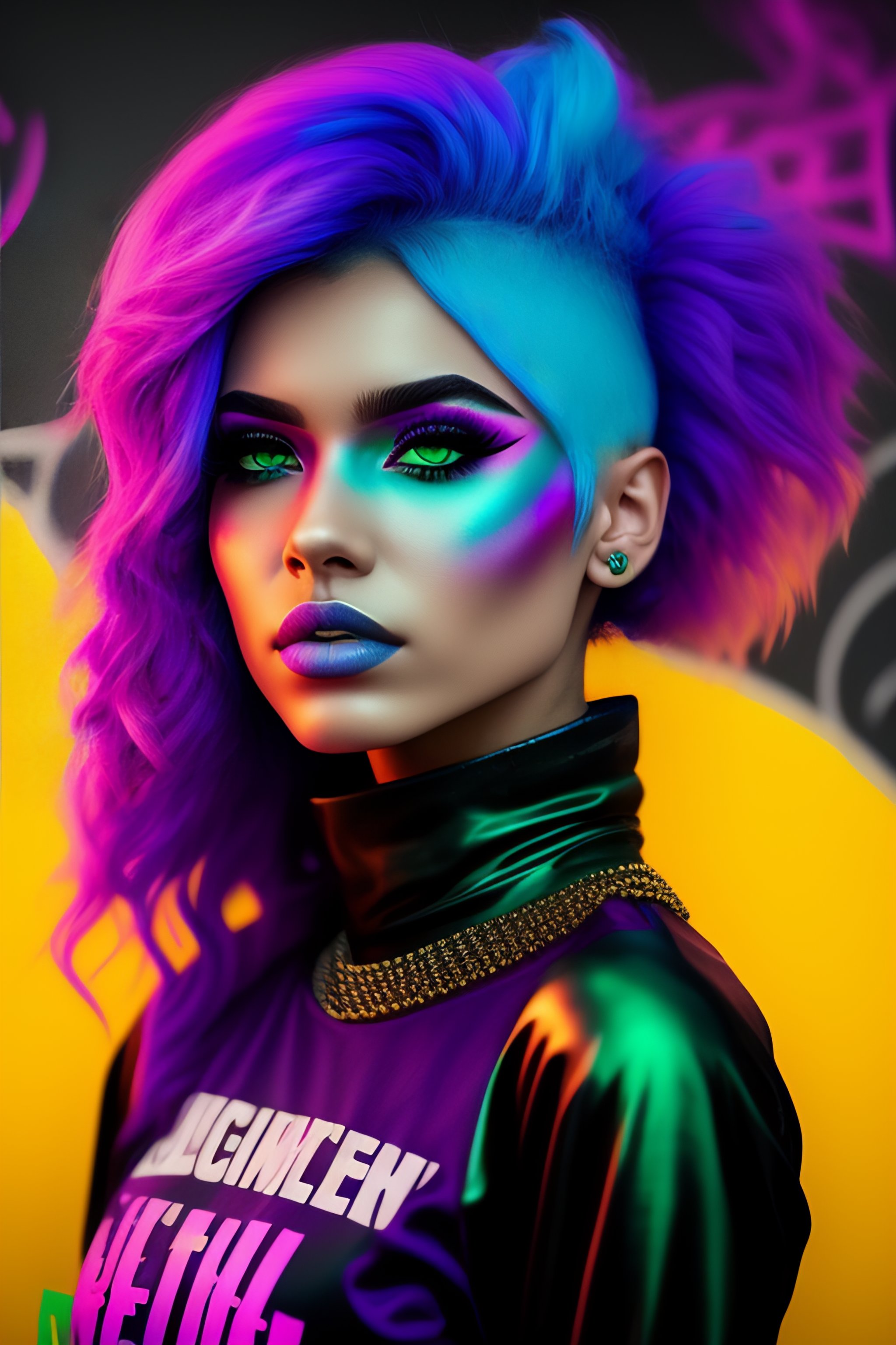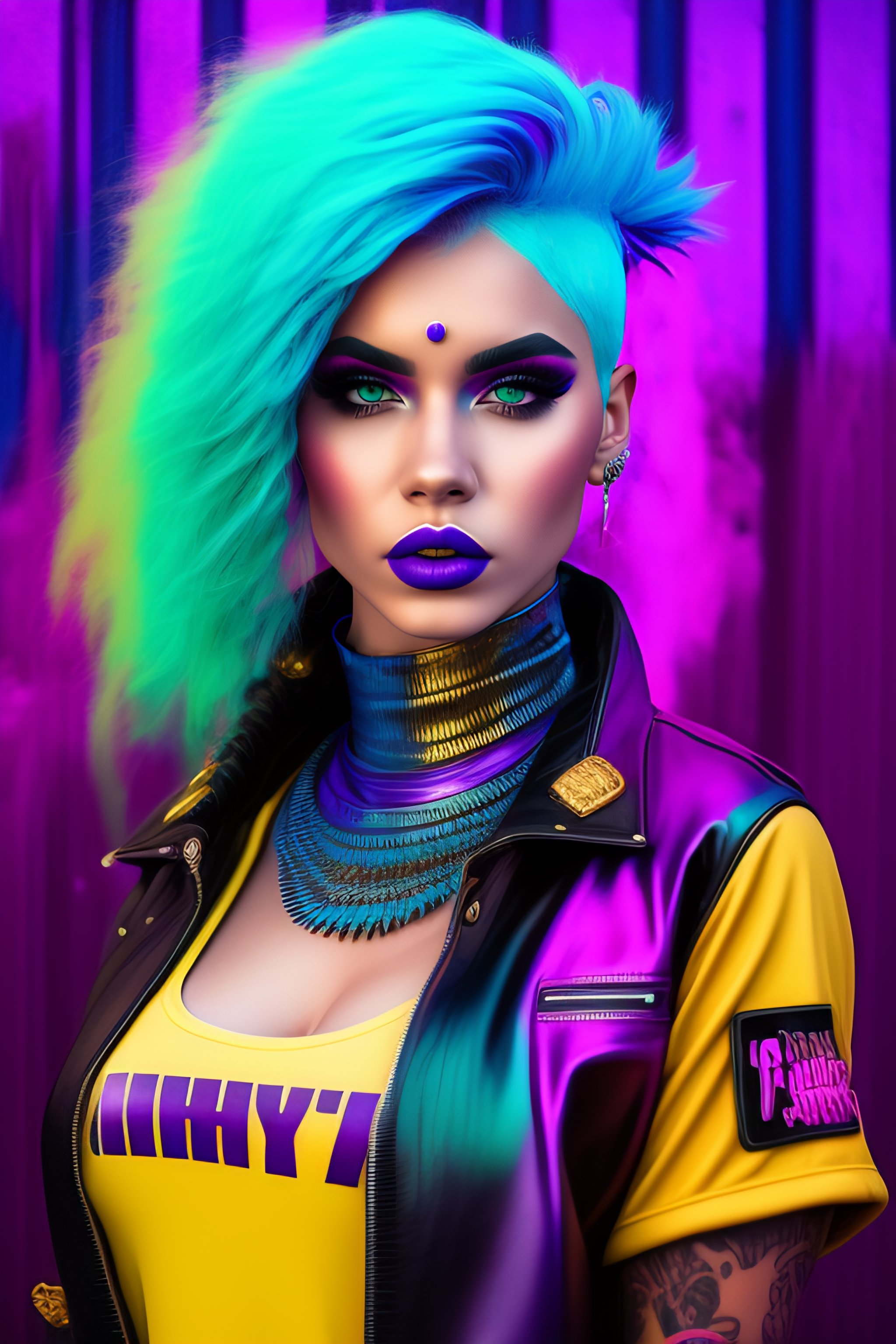 Highly detailed portrait of a sewer emo punk woman student, blue skin, cyan skin, green eyes, blue skin, colored skin, blue face, blue makeup, gold choker, purple hair by atey ghailan, by greg rutkowski, by greg tocchini, by james gilleard, by joe fenton, by kaethe butcher, gradient yellow, black, brown and magenta color scheme, grunge aesthetic!!! graffiti tag wall background