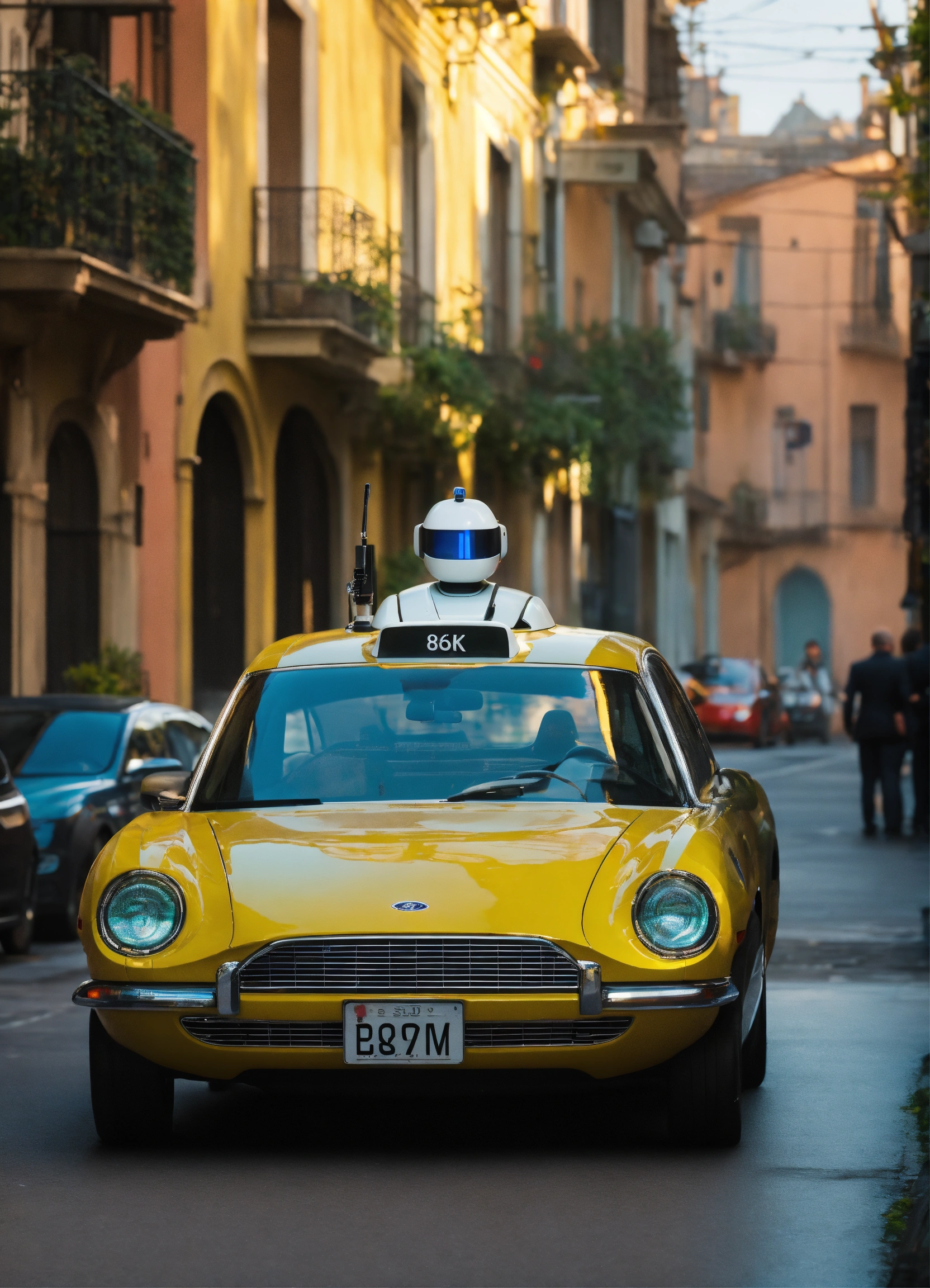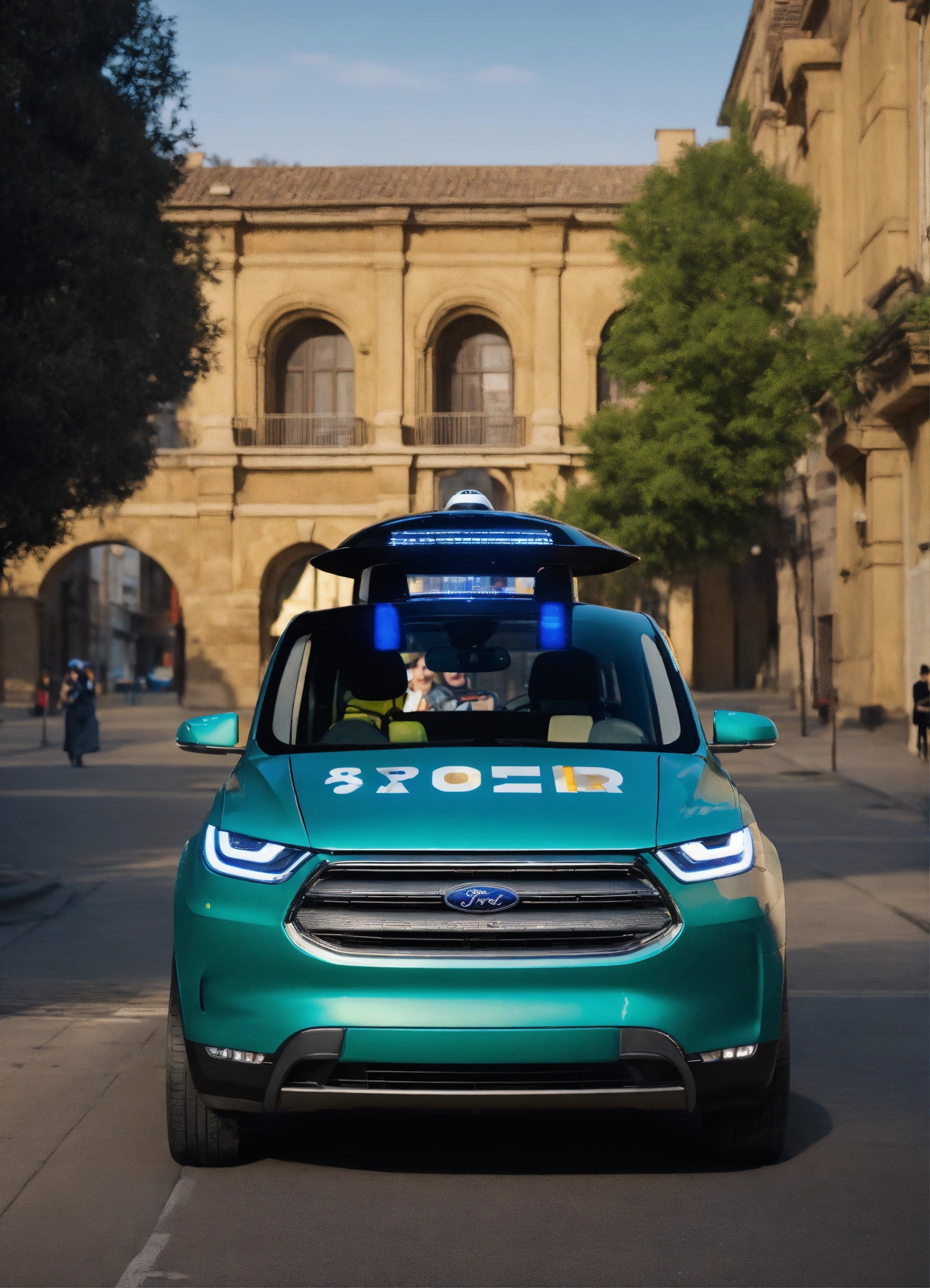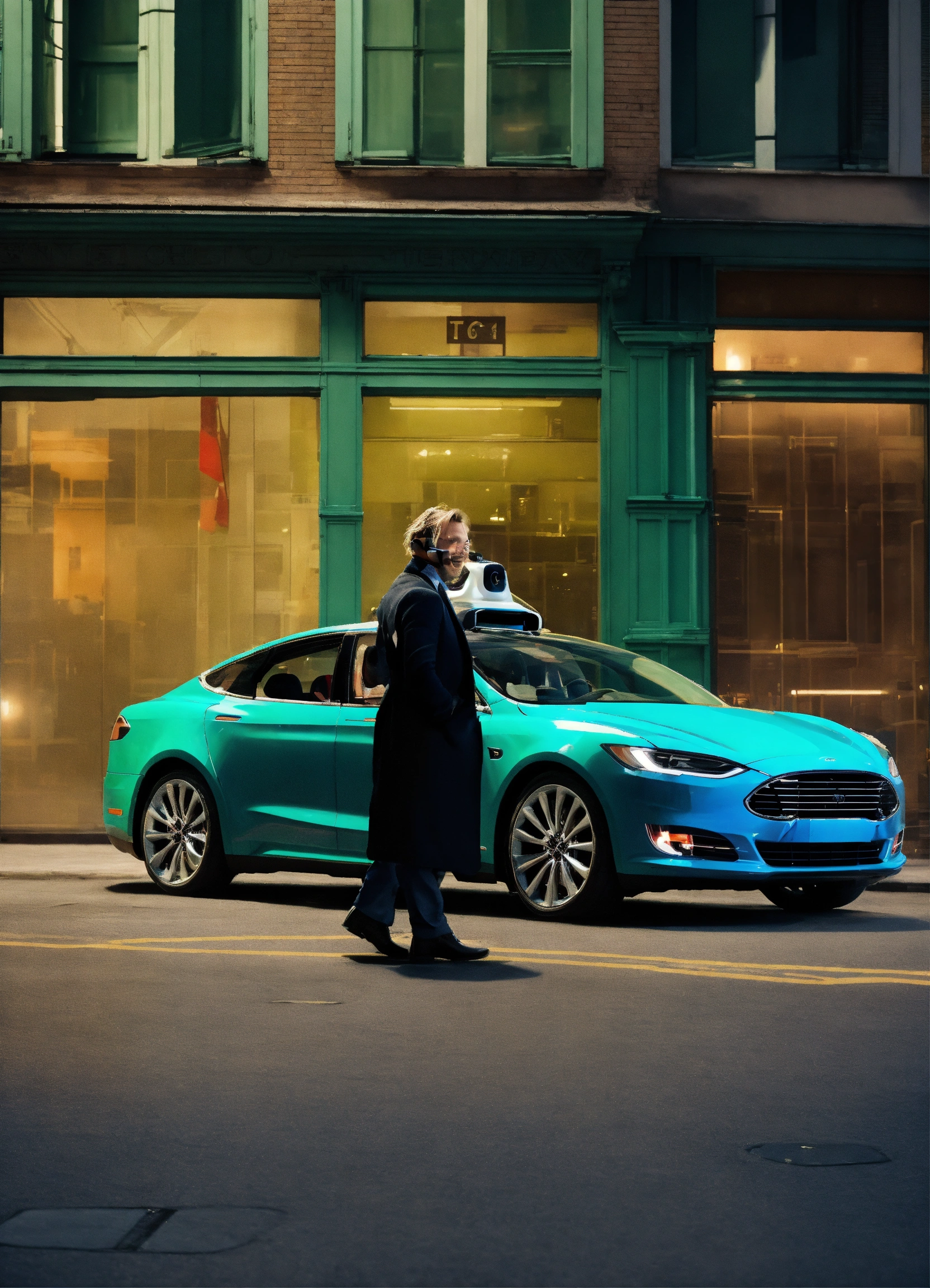 Ford self driving car, robotaxi by tesla, consulting chat gpt on phone, smiling, street in the car viewer, photo, colors, green, blue, cyan, photographed by (steve mccurry), film still from (christopher nolan), medium shot fashion, award winning photography, arty pose, fashion, high definition, high resolution, muted colors, volumetric lighting, 8k, 3d render