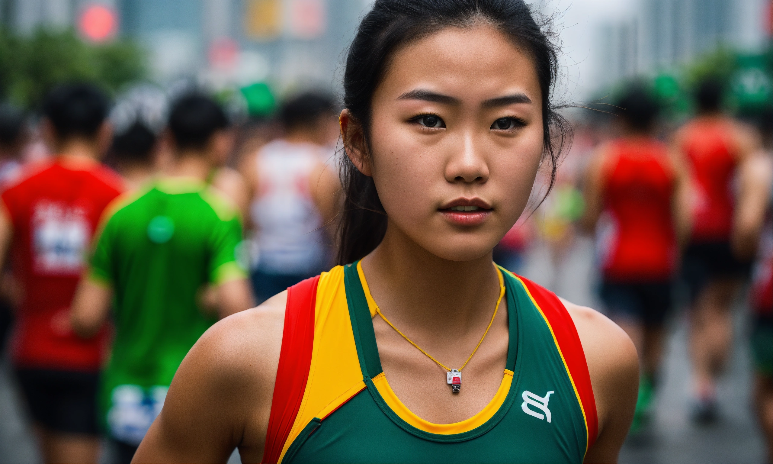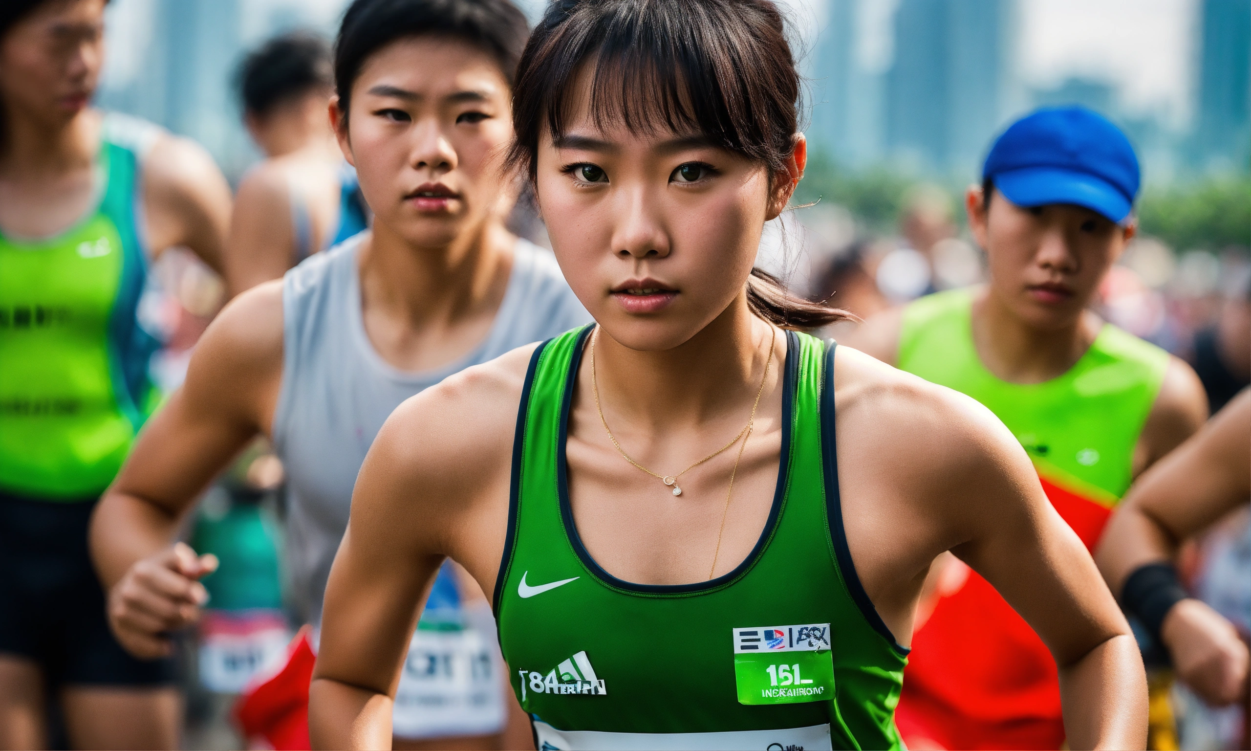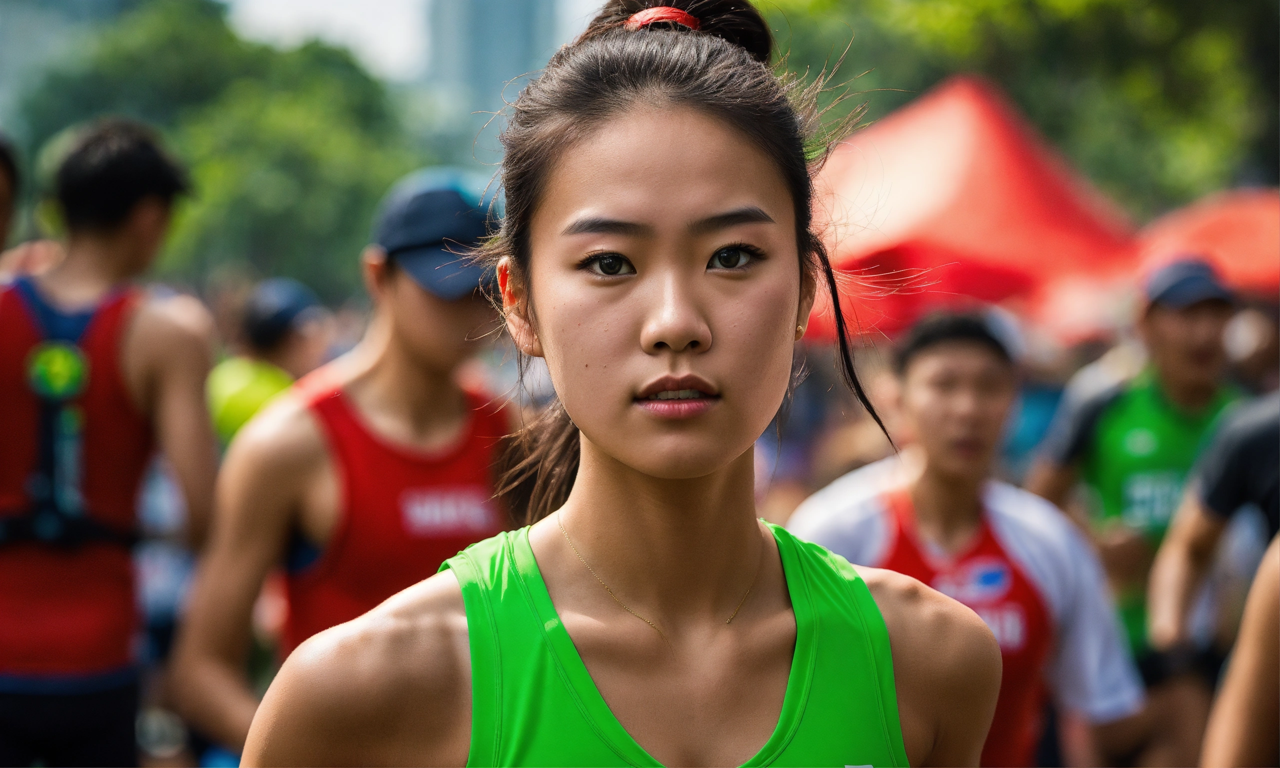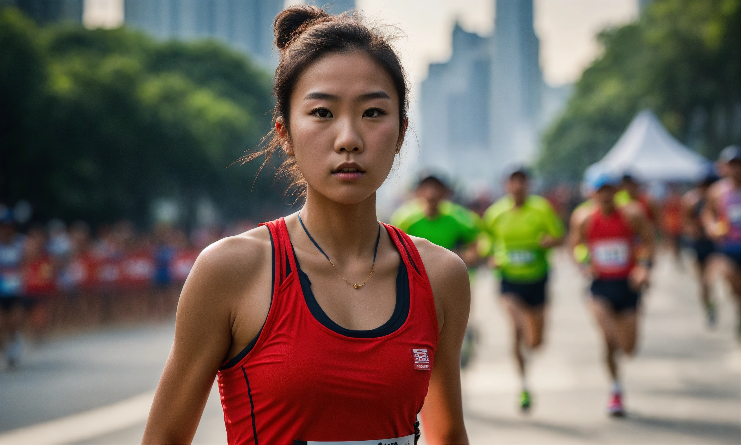 Mid-day at a world marathon event in singapore, ultra close-up frontal shot of an 18-year-old tanned and athletic chinese girl, plain red singlet, looks with unwavering determination, her eyes, locked onto the camera, radiate ambition, resilience, and a deep focus, with green and singapore cityscape in the backdrop, other runners at the back, captured with a nikon d850, 85mm f/1.4 lens, the photograph is given a touch of watercolor rendering for added depth, making her the undeniable centerpiece of the image.