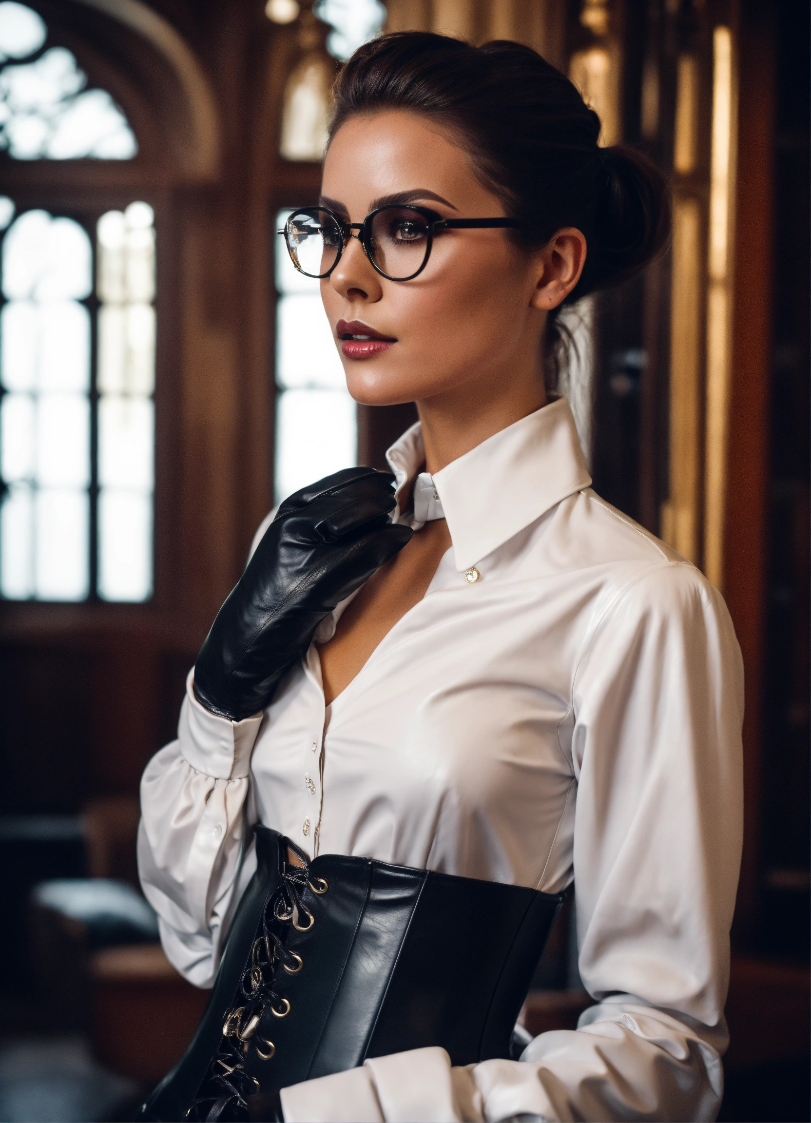 Stunning french seductress woman fashion model, brunette straight high ponytail, glases, black leather corset, long strict victorian governess wide black long leather shirt dress with long big puff sleeves and big buttons, mansion room, white office shirt collar, leather gloves, eyeliner makeup, black leather boots