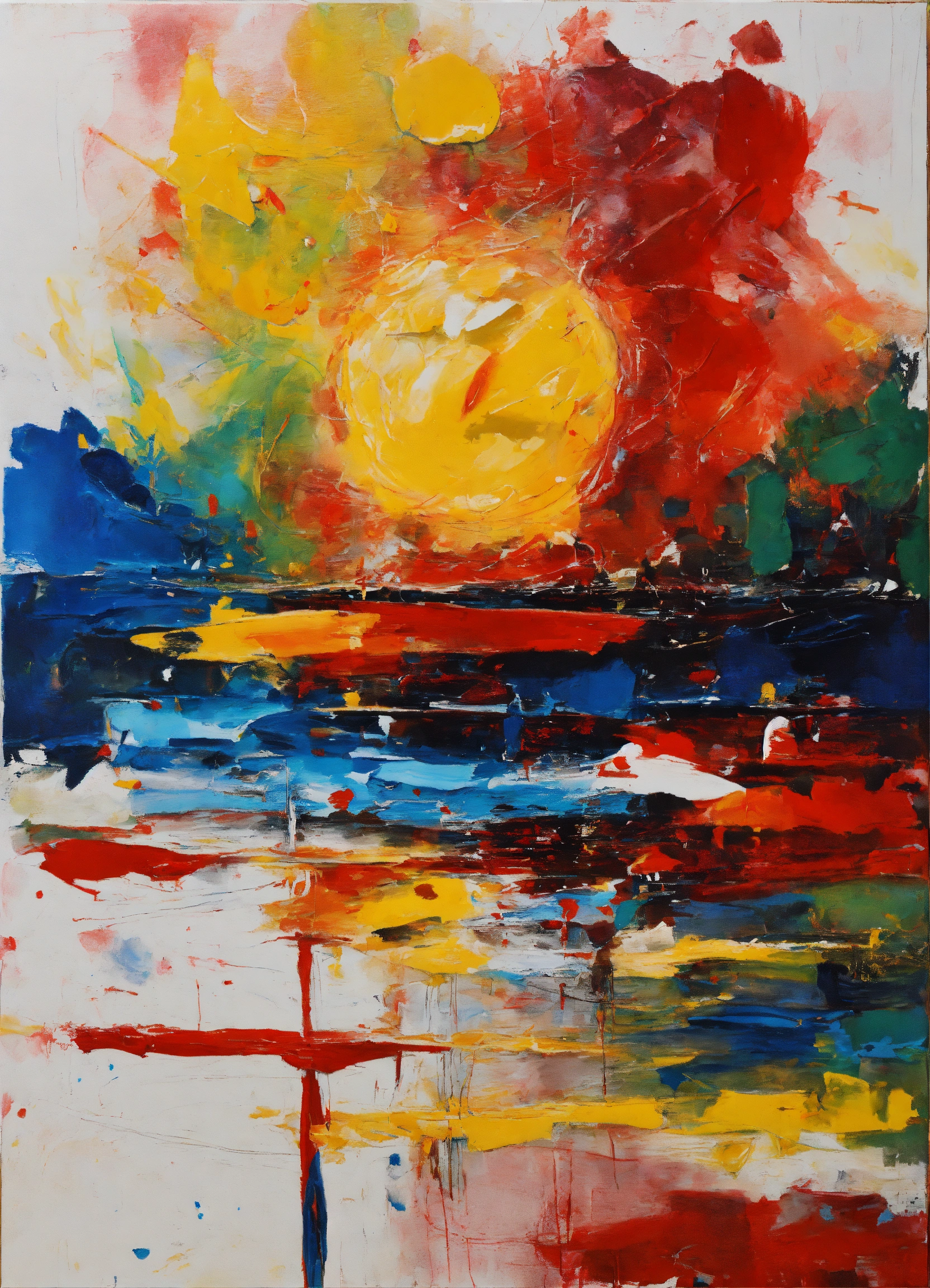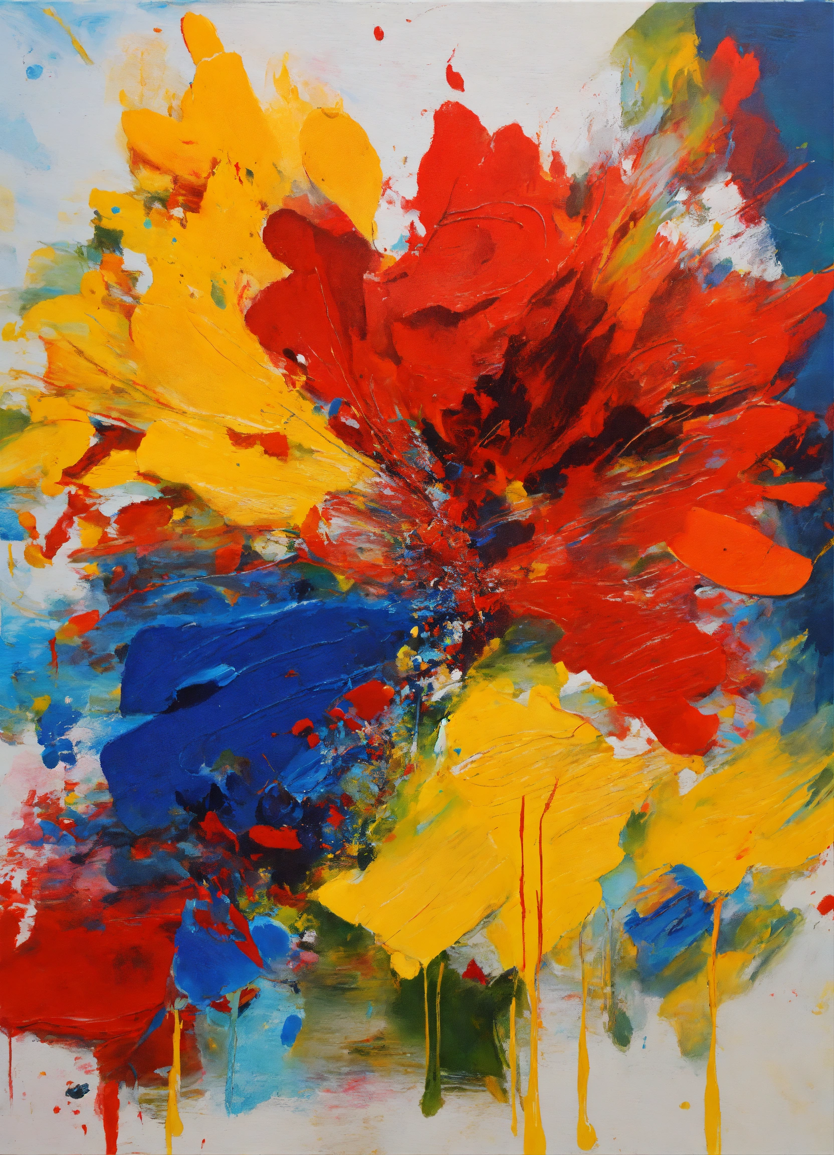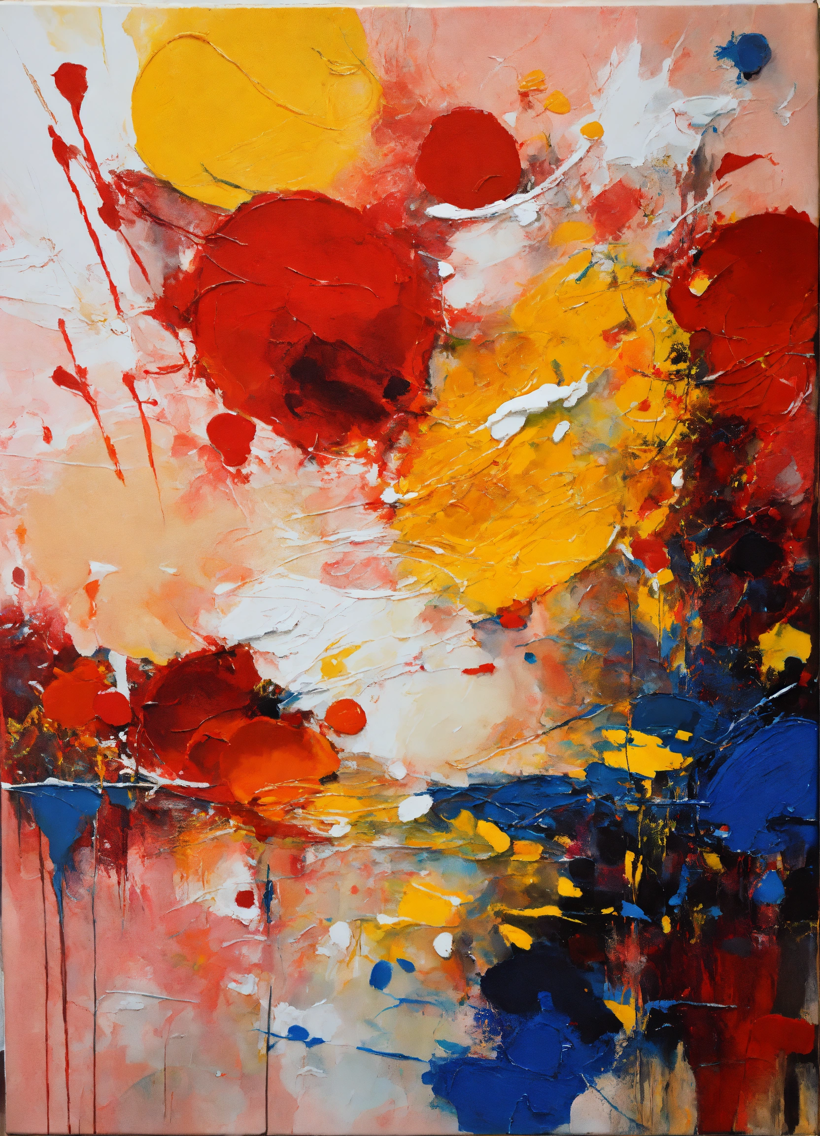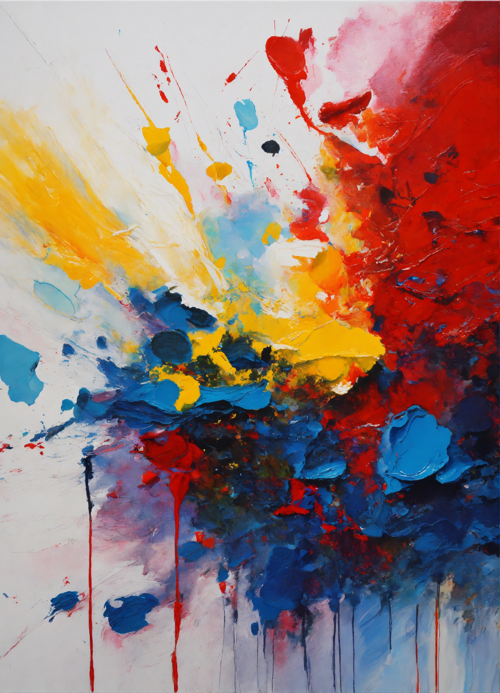 Draw an abstract painting, mixing acrylics, palette knife and brush with primary colors, white background