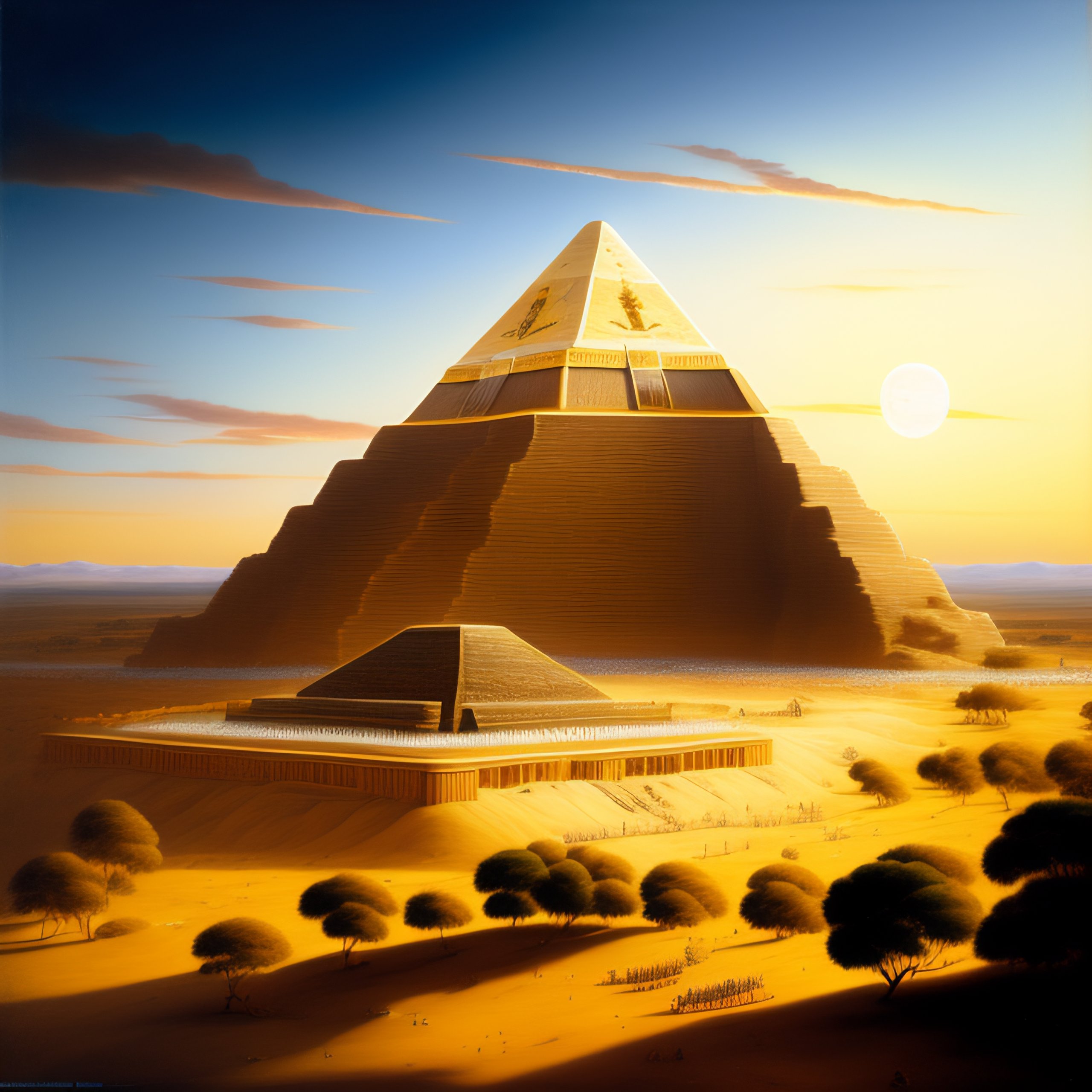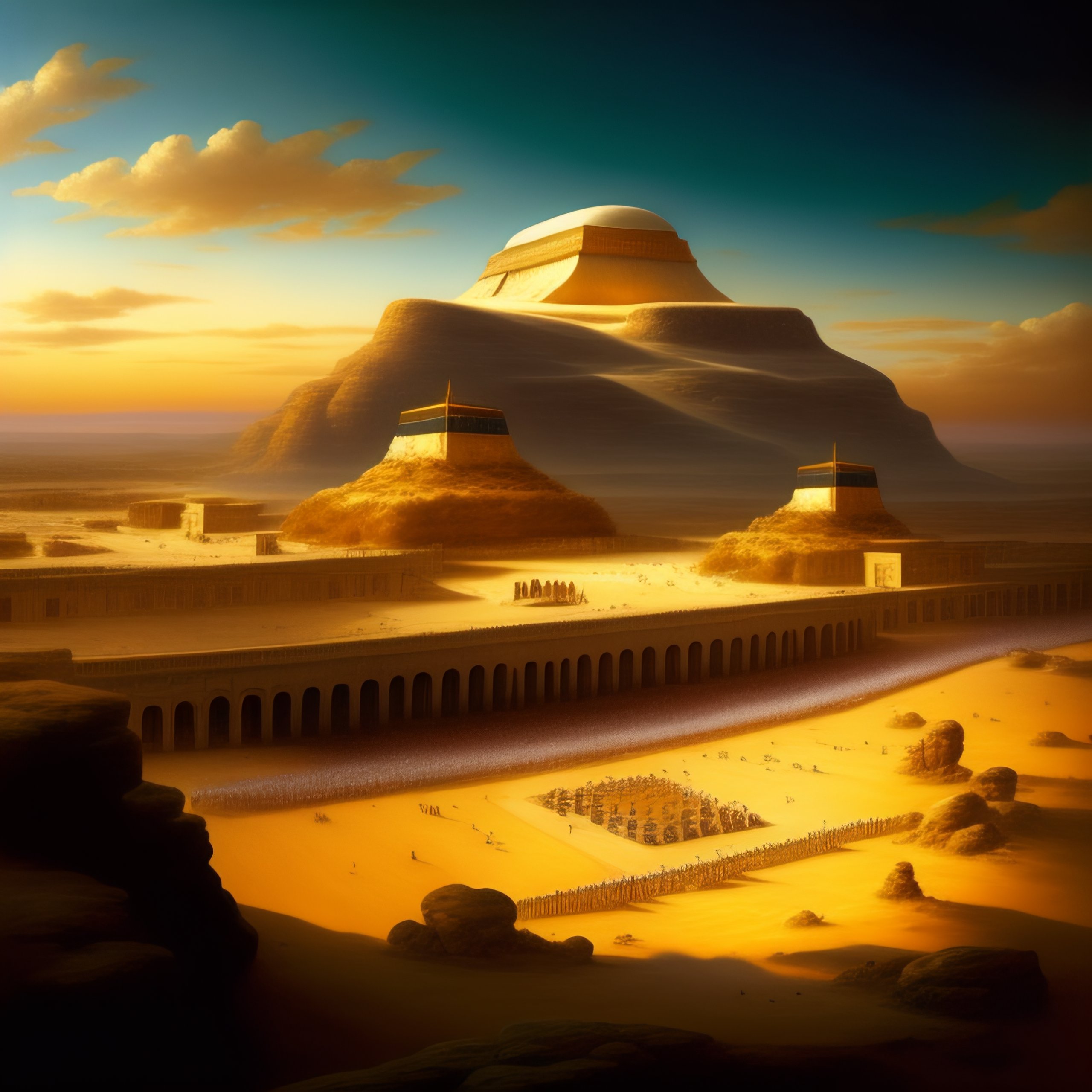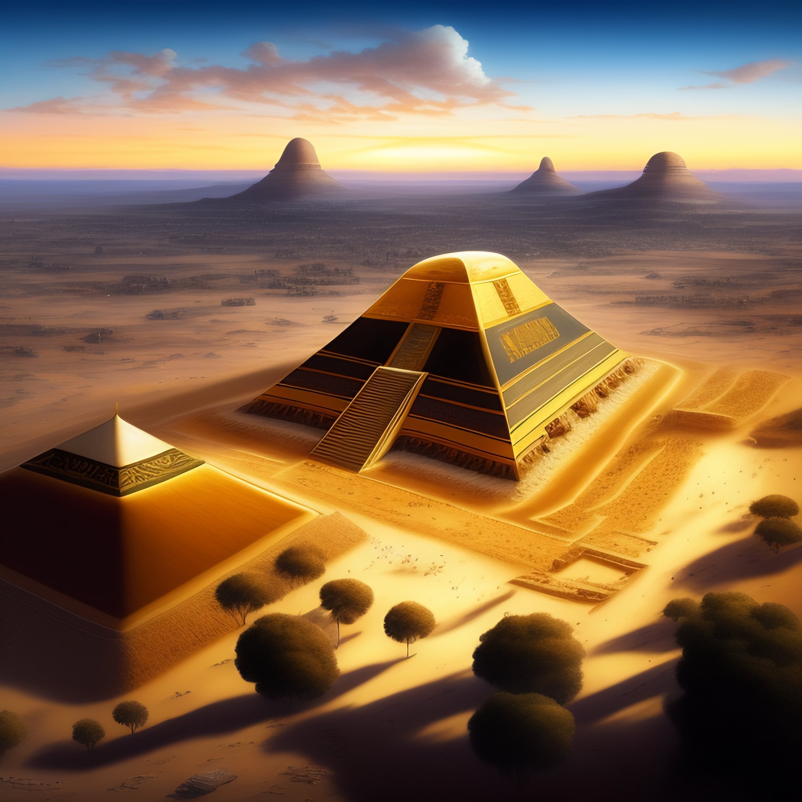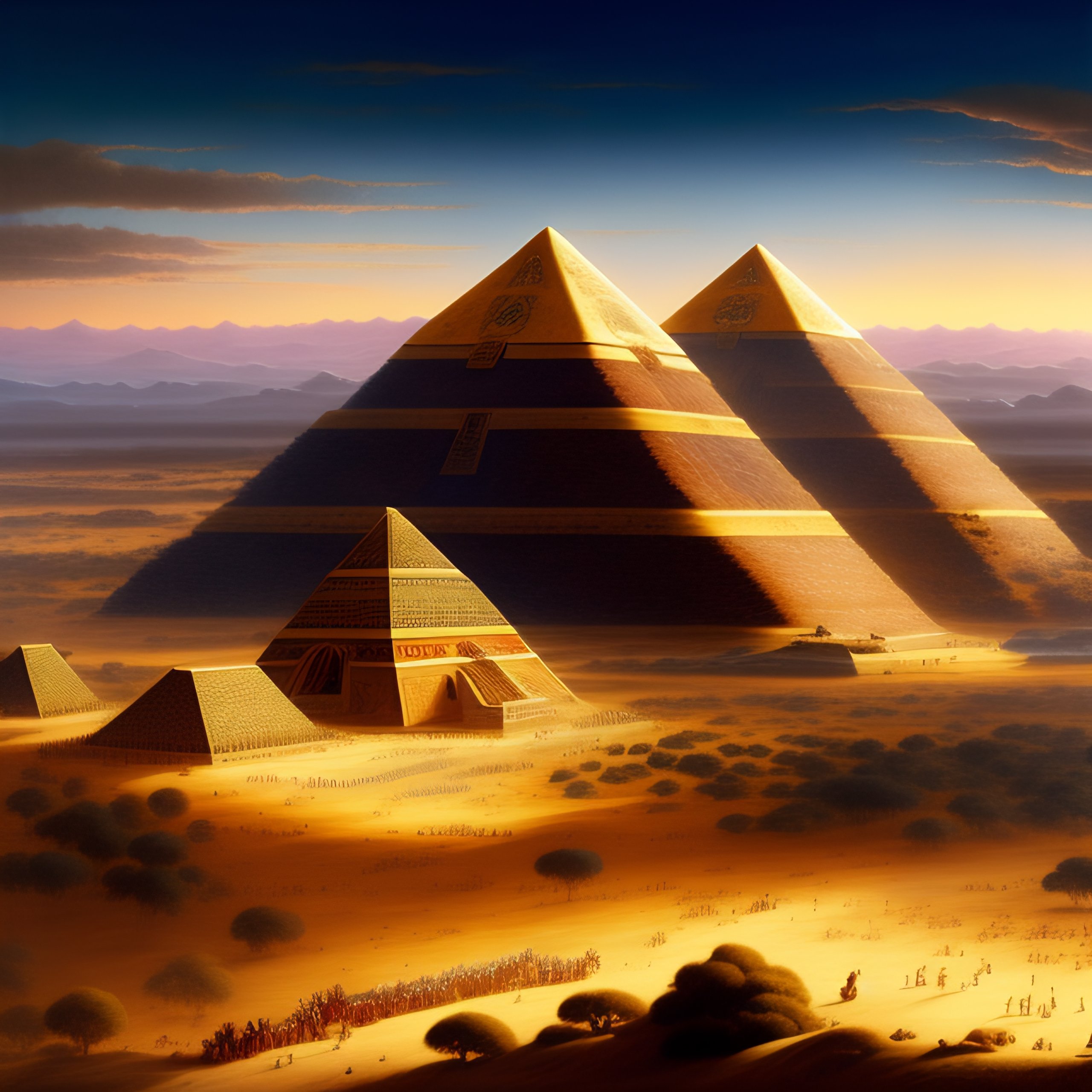 Tilt-shift photo of khufu, khafre, and menkaure pyramids of giza, in the sky, landscape by jacques-laurent agasse.