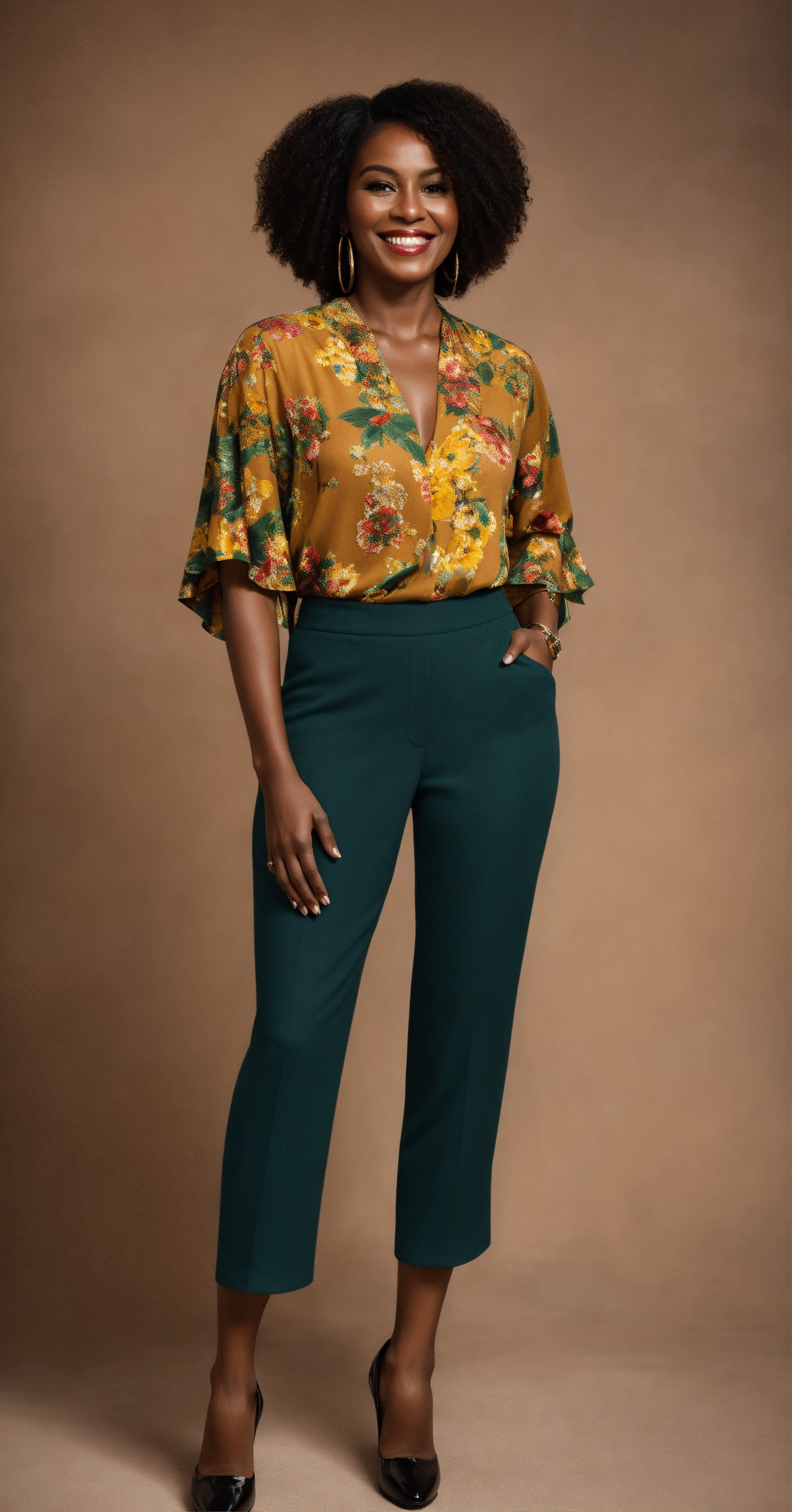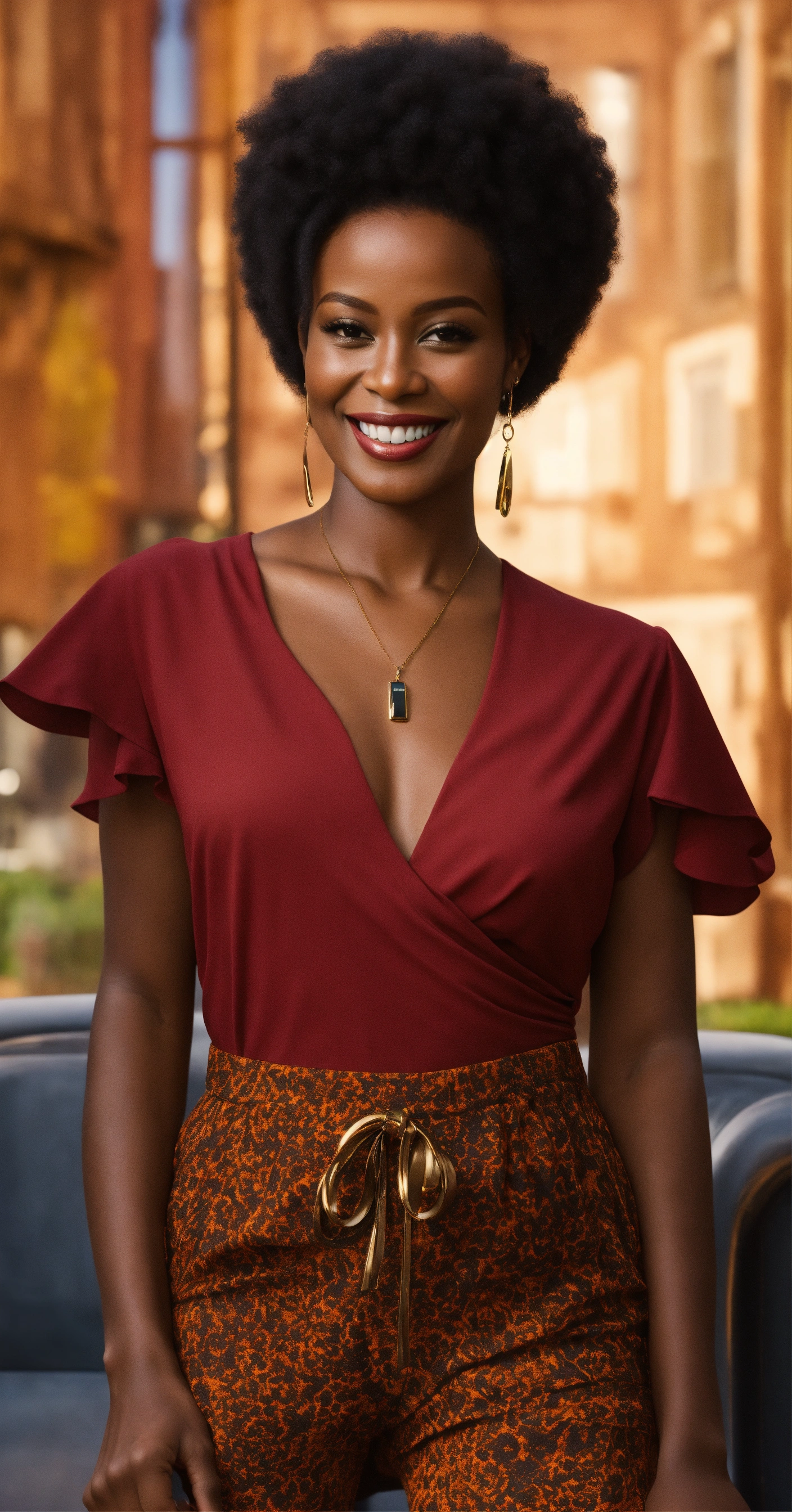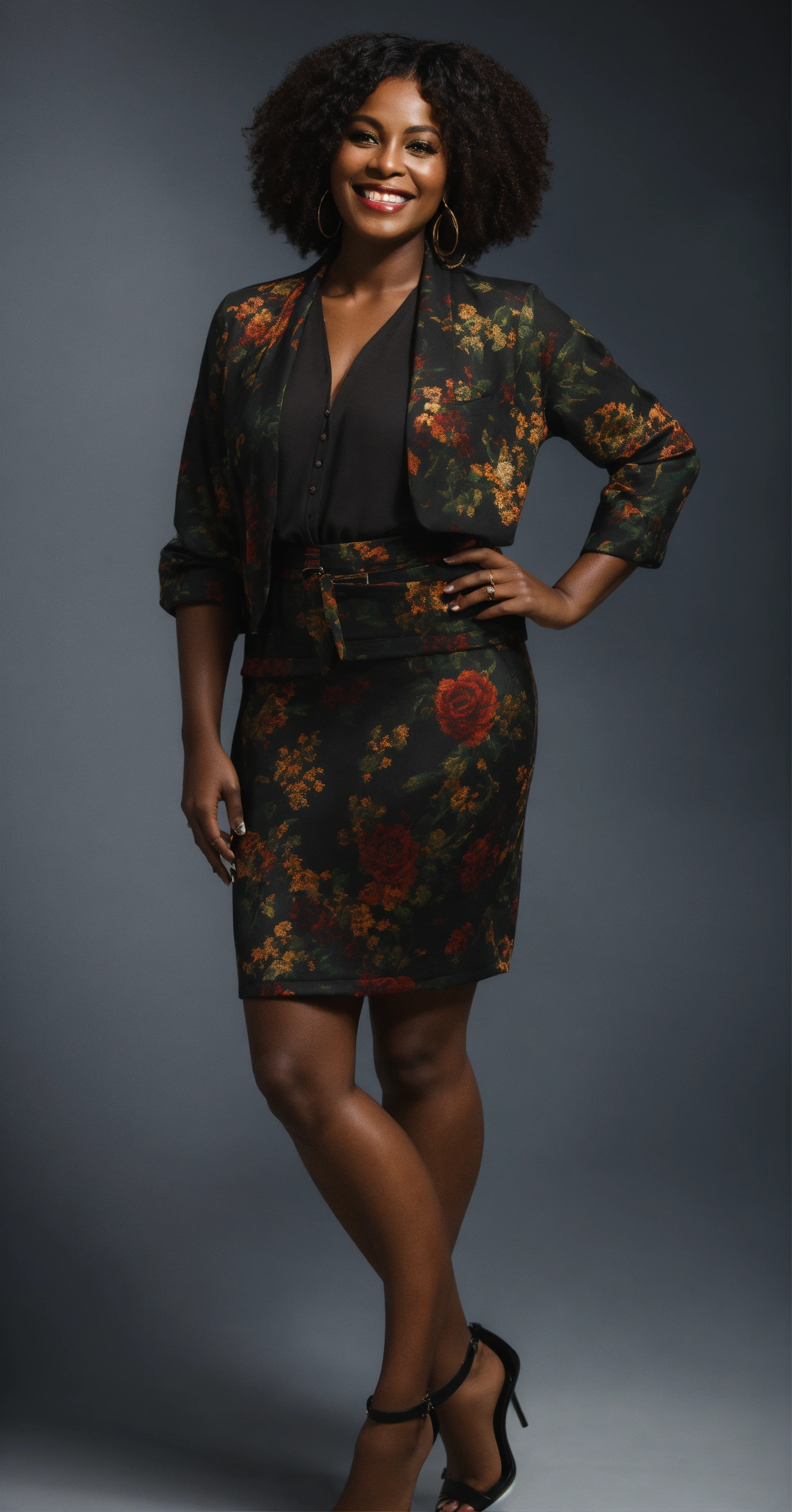 Photorealistic full-body image of one, smiling, age thirty-five, fashionable dark-skinned black woman, directly facing the camera