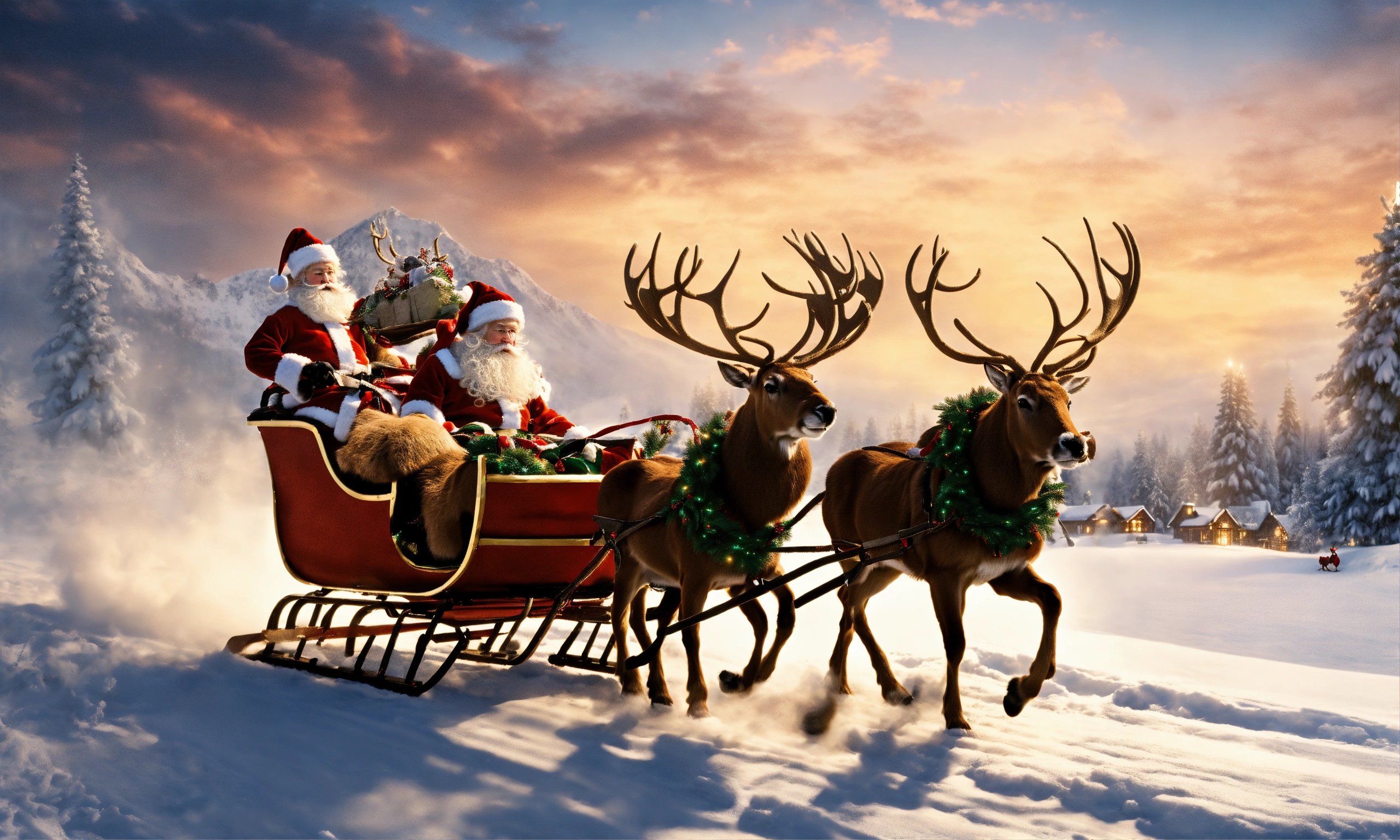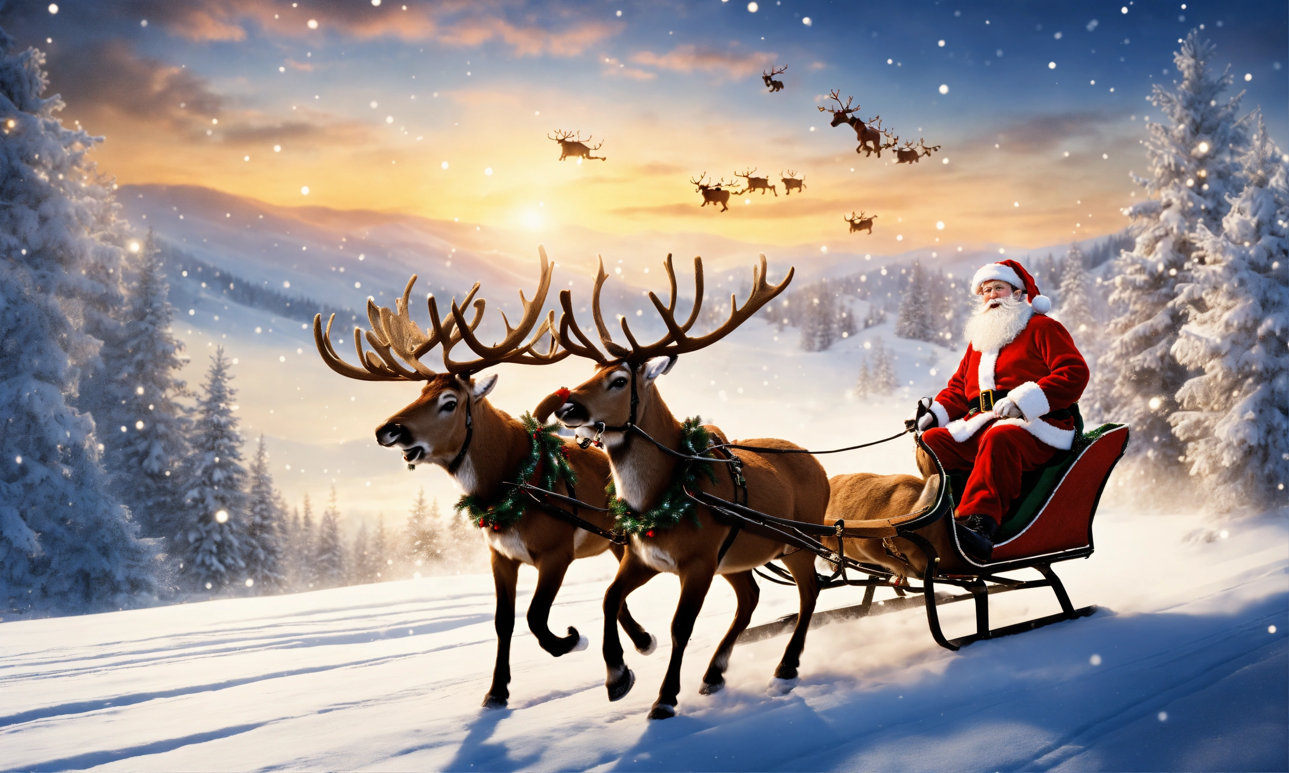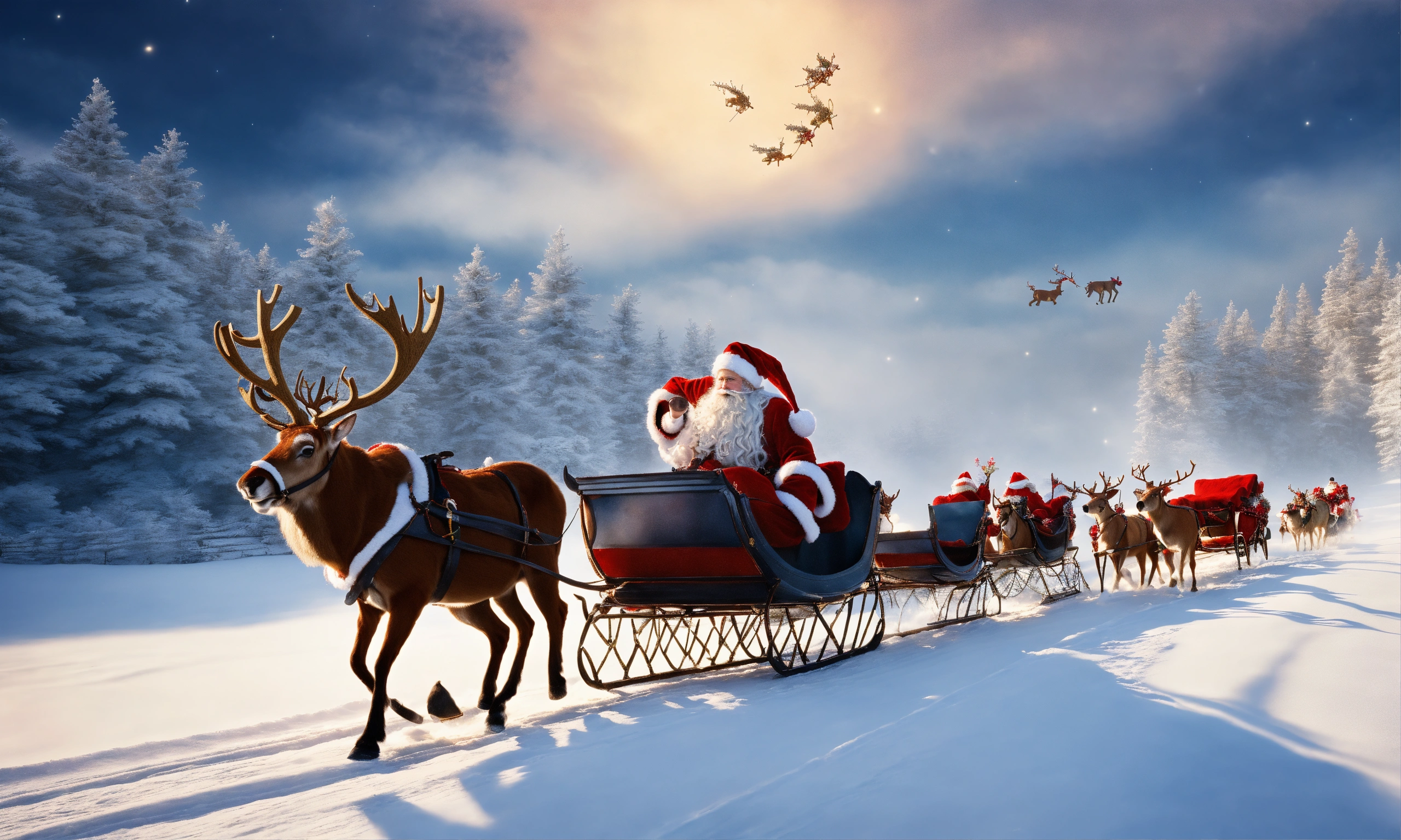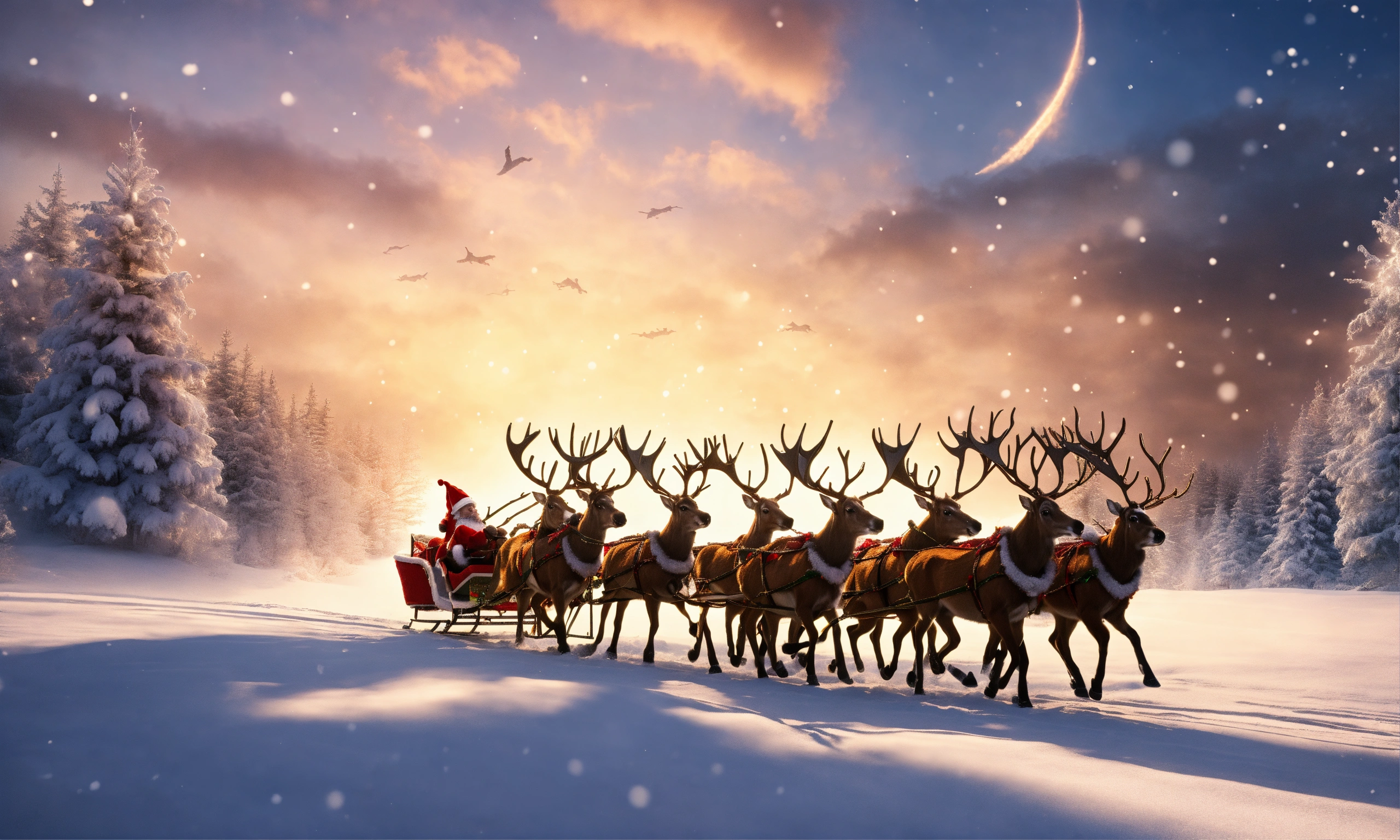 Picture an idyllic christmas scene with santa claus in his sleigh flying by with his 8 raindeers and ruodolph in the lead in the sky, photorealistic, magazine-quality