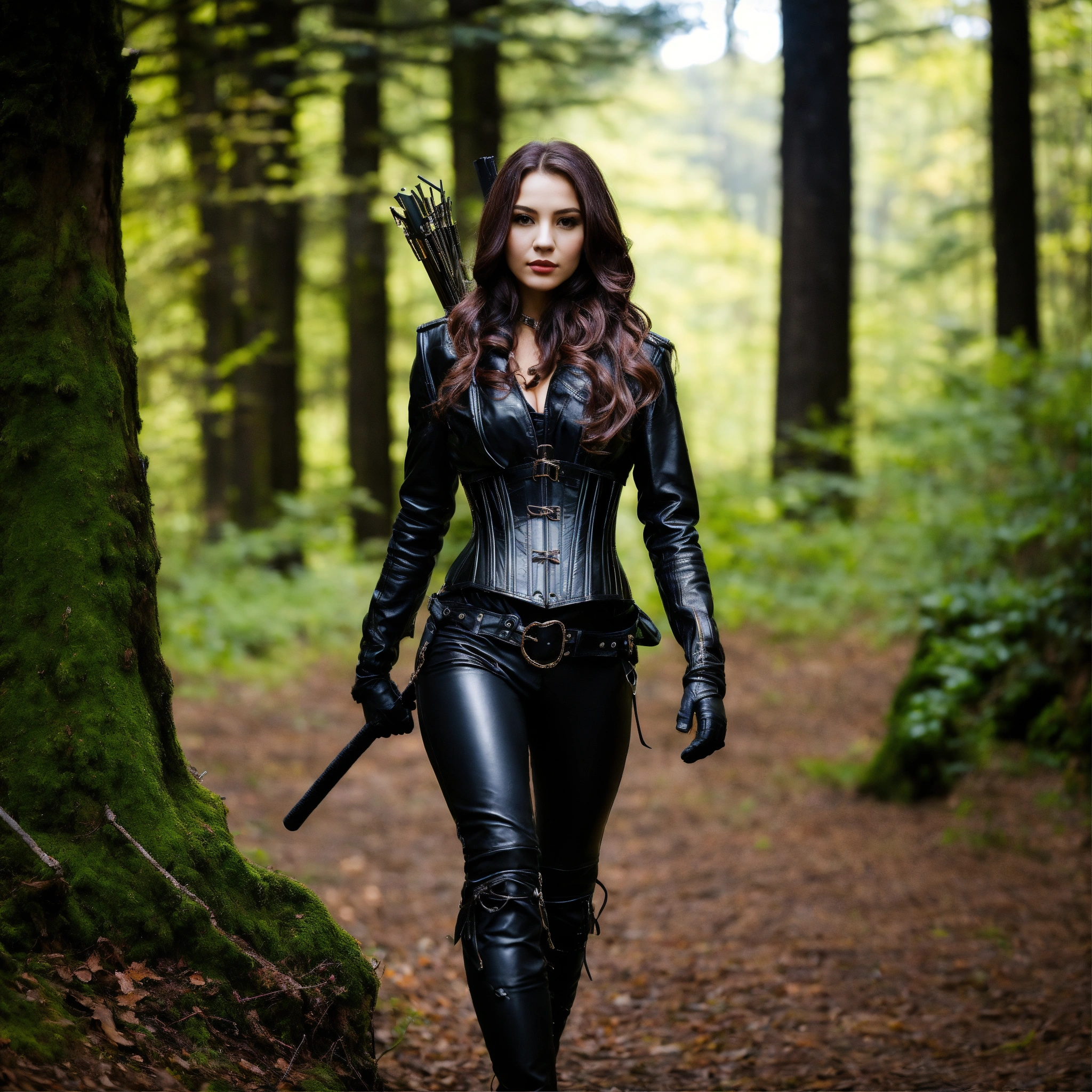 A beautifull huntress wearing black leather jacket, corset, pants and gloves walking throgh the forrest