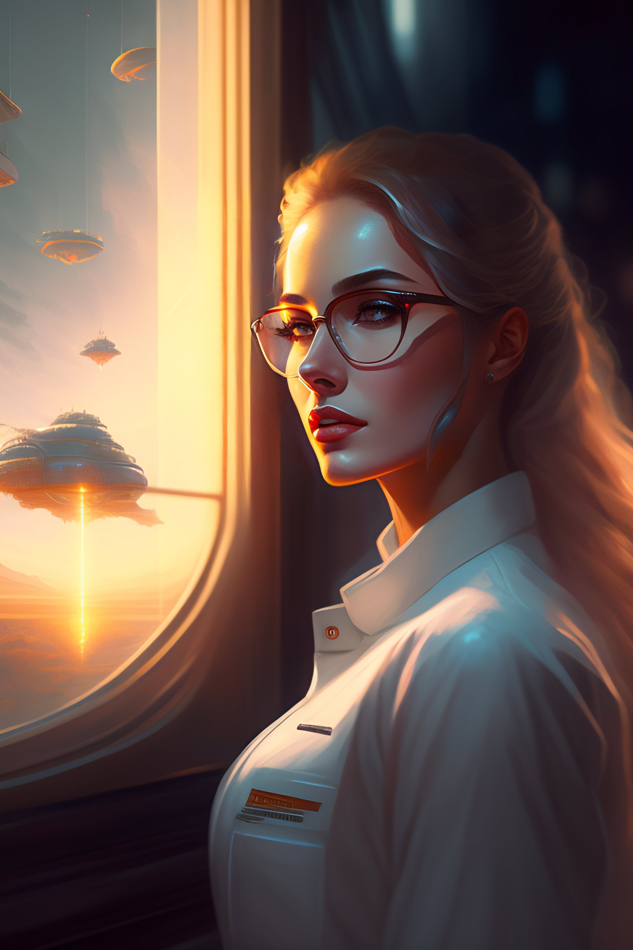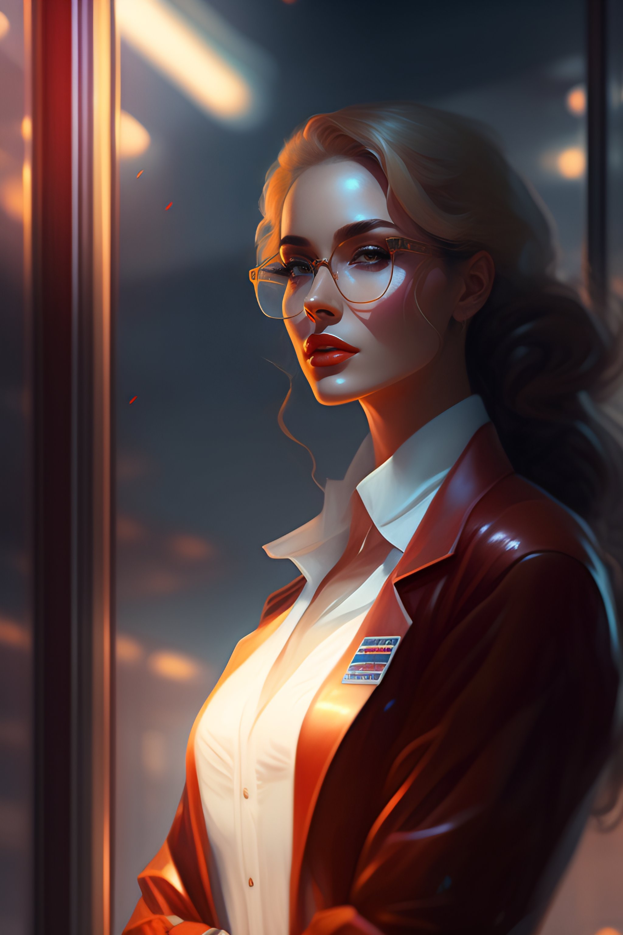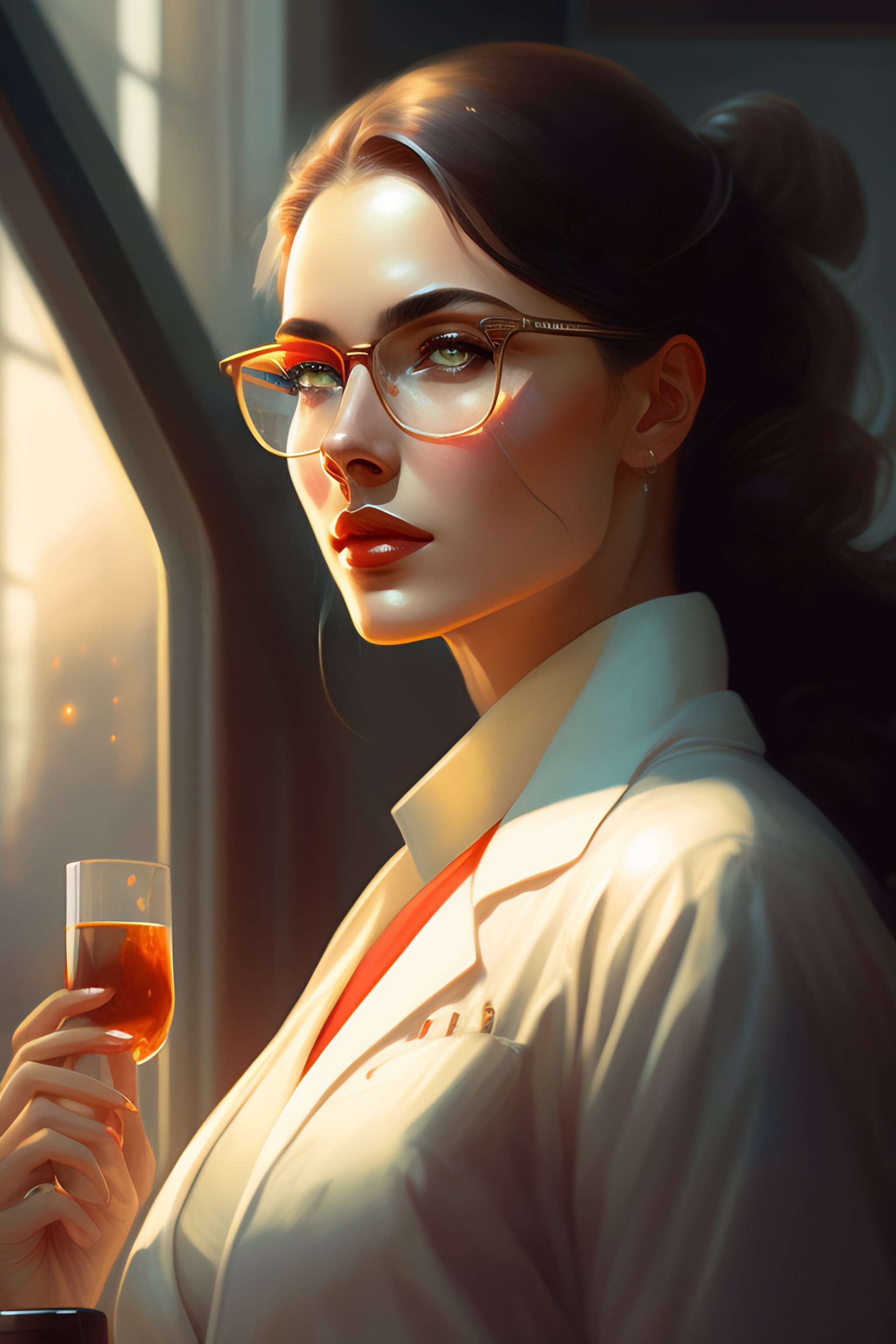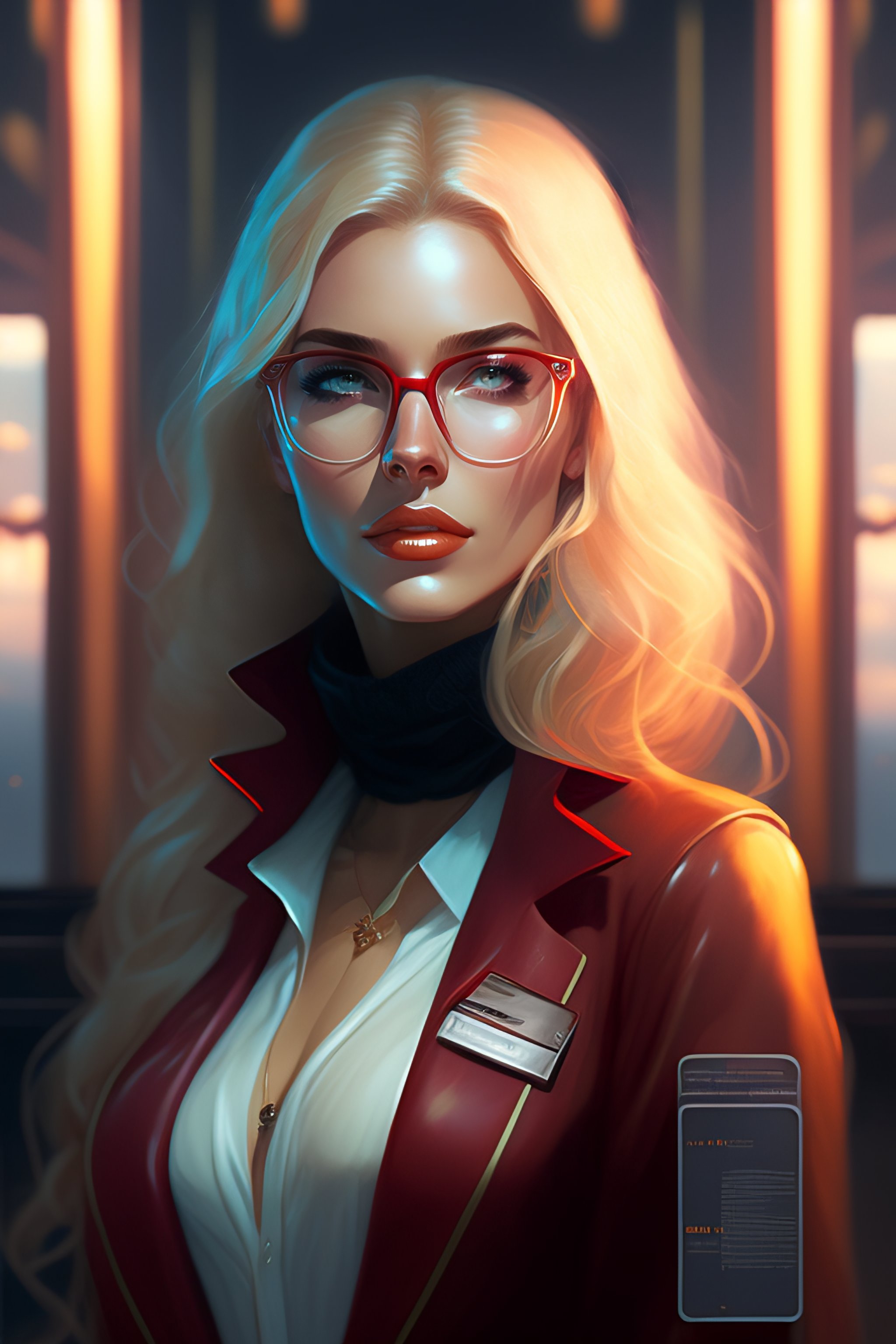 A beautiful woman, in a lab coat and glasses, holds a tablet, stands inside the research center, against the background of a girl and aliens behind glass, character portrait, 1960s, blonde straight blond hair, red lipstick, deep neckline on the chest, intricate, elegant, highly detailed, digital painting, artstation, concept art, sharp focus, illustration, art by lop, mars ravelo and greg rutkowski