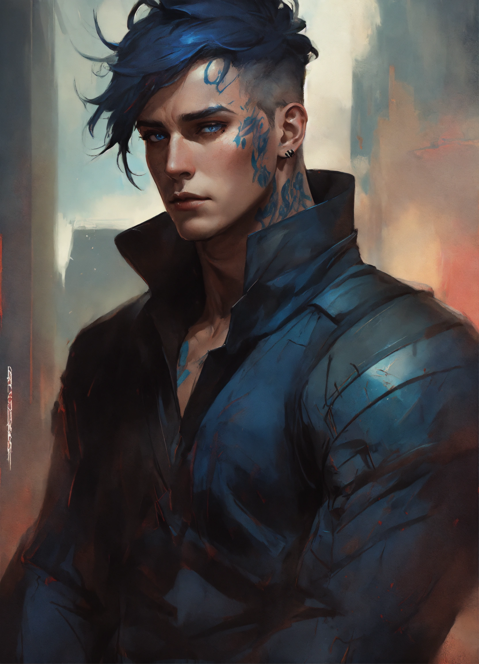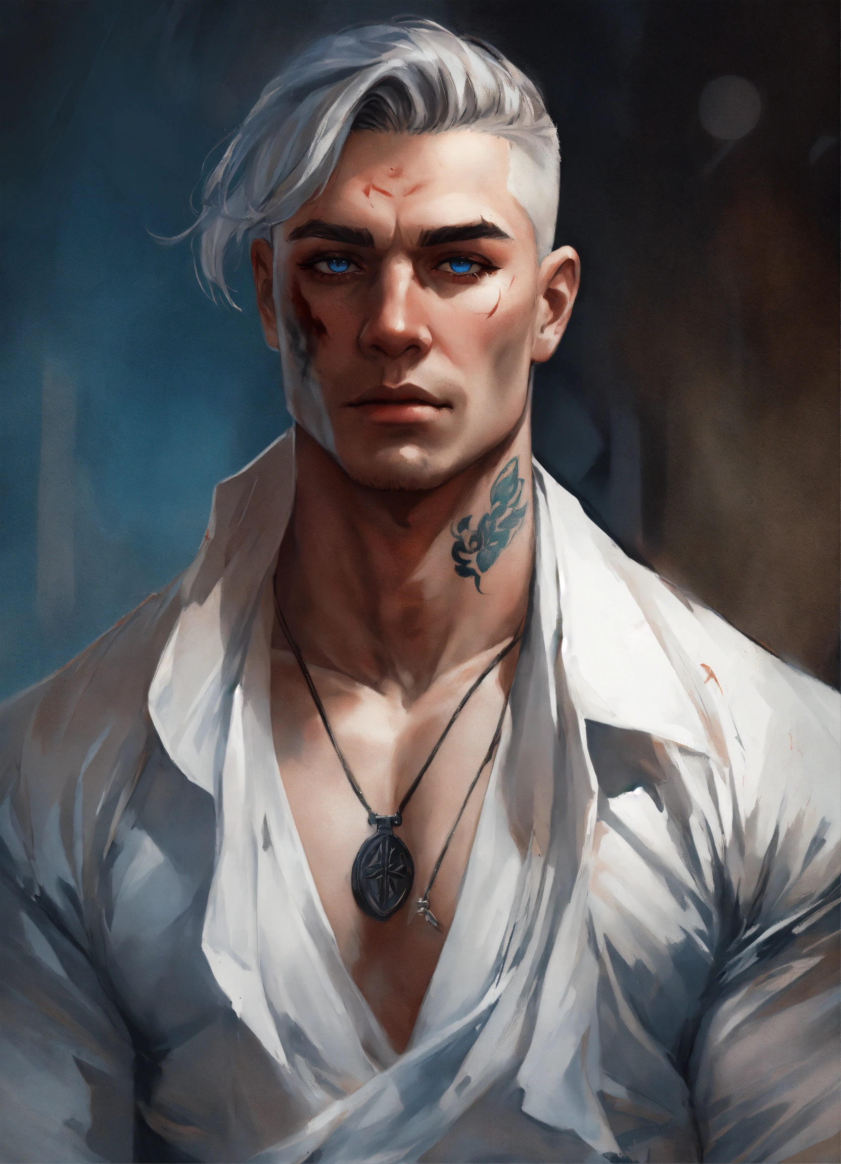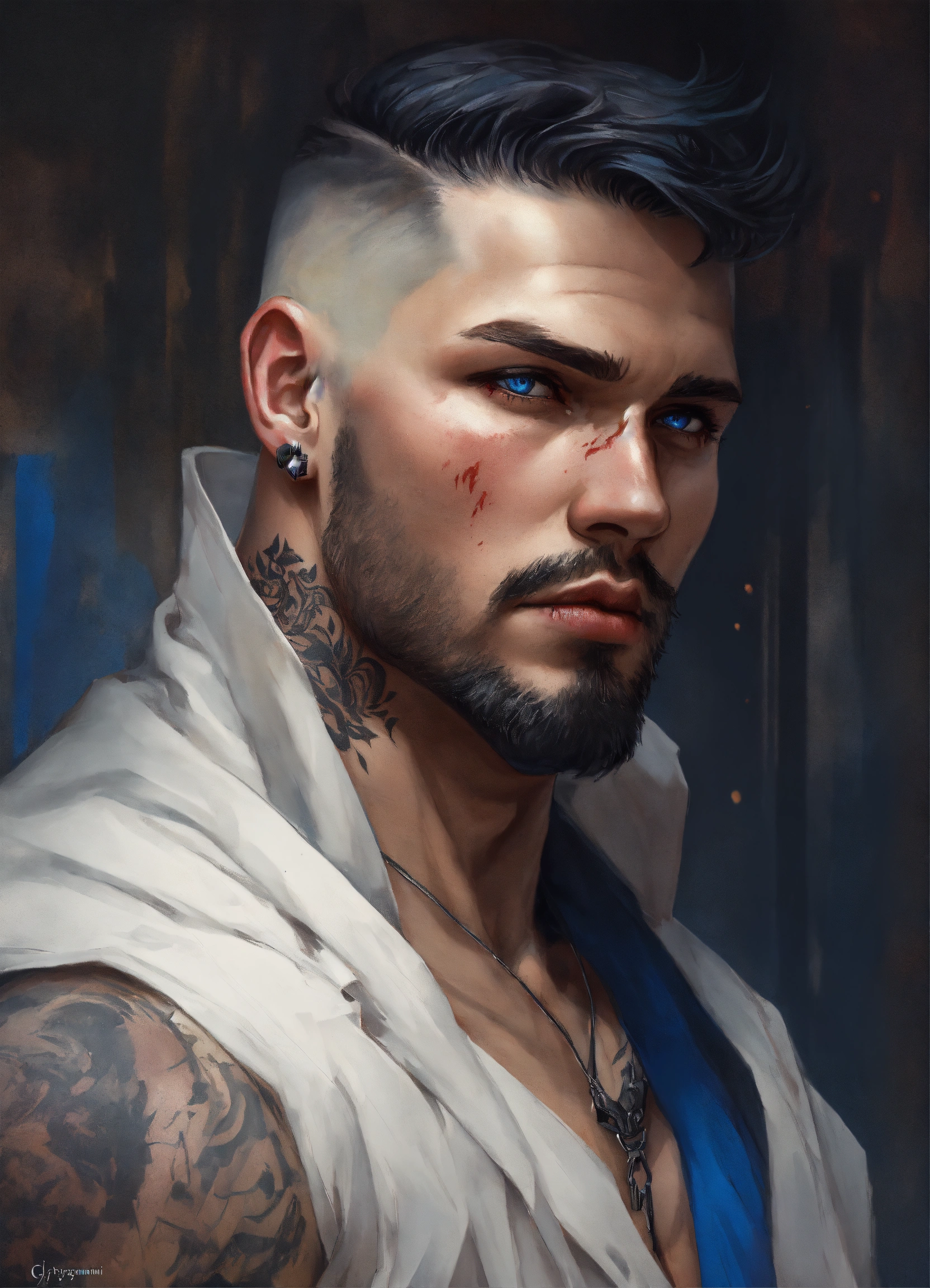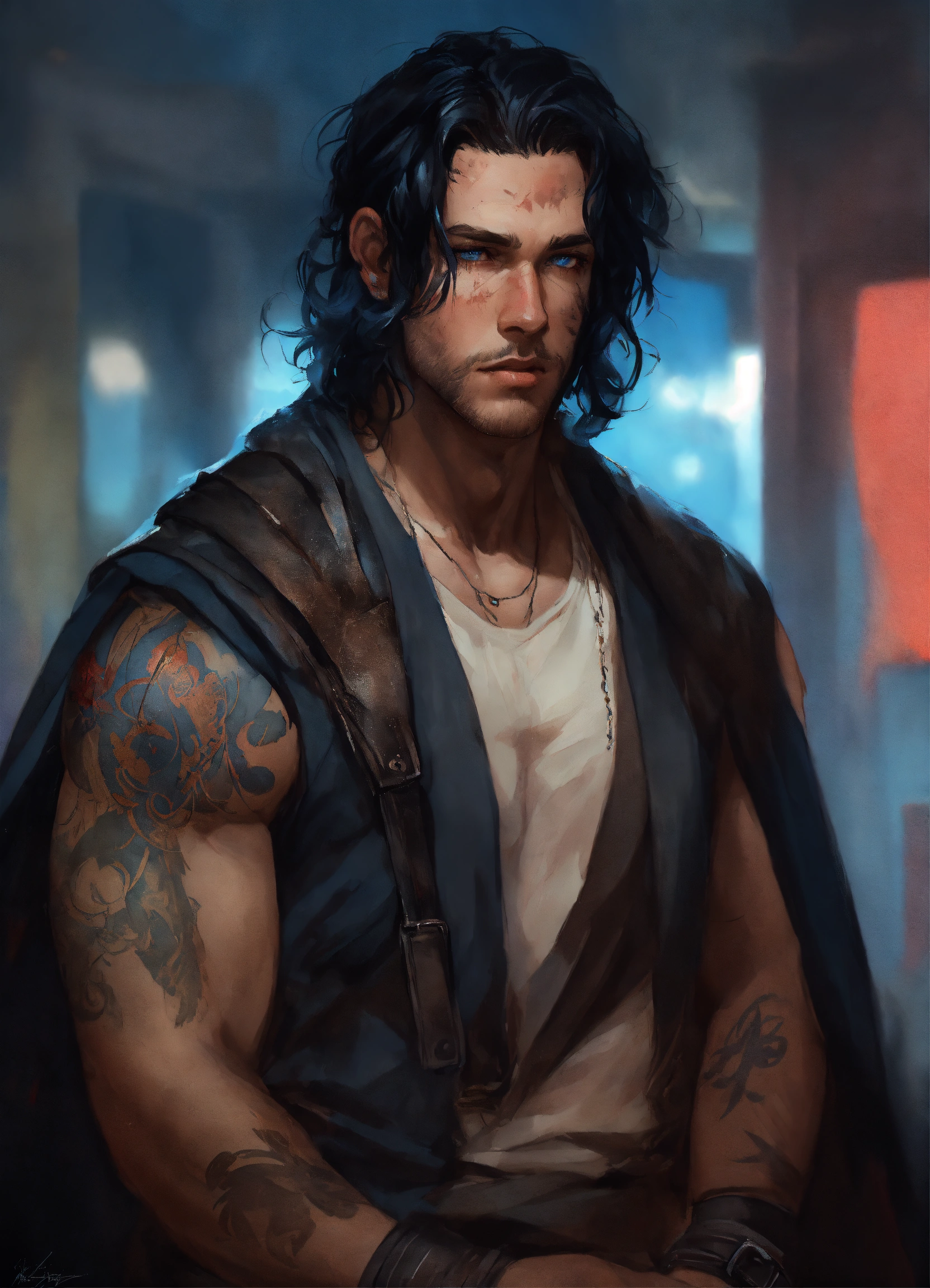 Highly detailed portrait of an older non binary, masculine, large, muscular, light skin, large nose, scarred, trans, mercenary, neck tattoo, white tunic, black trousers, black boots, blue eyes, smeared mascara, cape, midnight hair, messy haircut, bandaged knuckle, dirty, imperfect, full body shot, by artgerm, atey ghailan, greg rutkowski, kathe butcher, black color scheme, dark, evil, scary