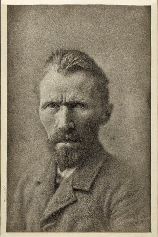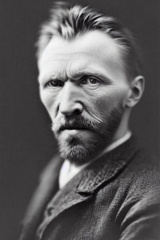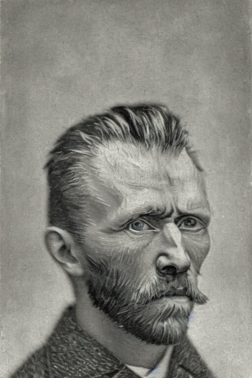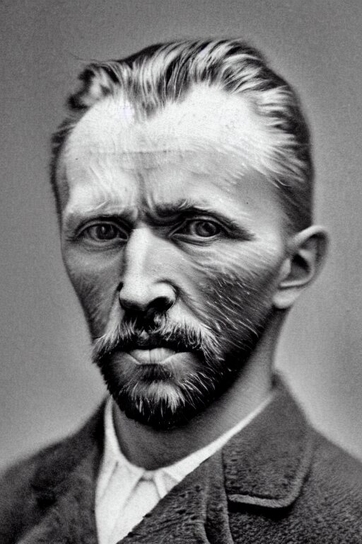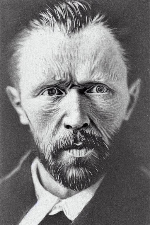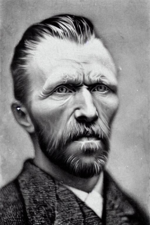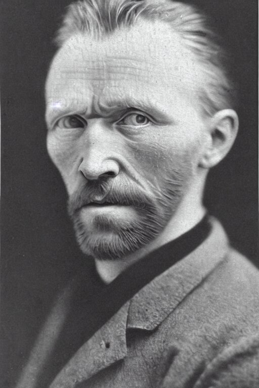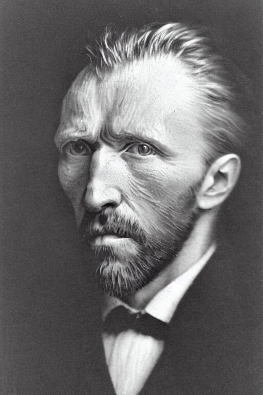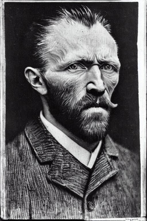 A dark, monochrome, glass negative, silver gelatine realistic, supersharp, supersharp, realistic, photographic daguerrotpye portrait of vincent van gogh, shallow depth of field