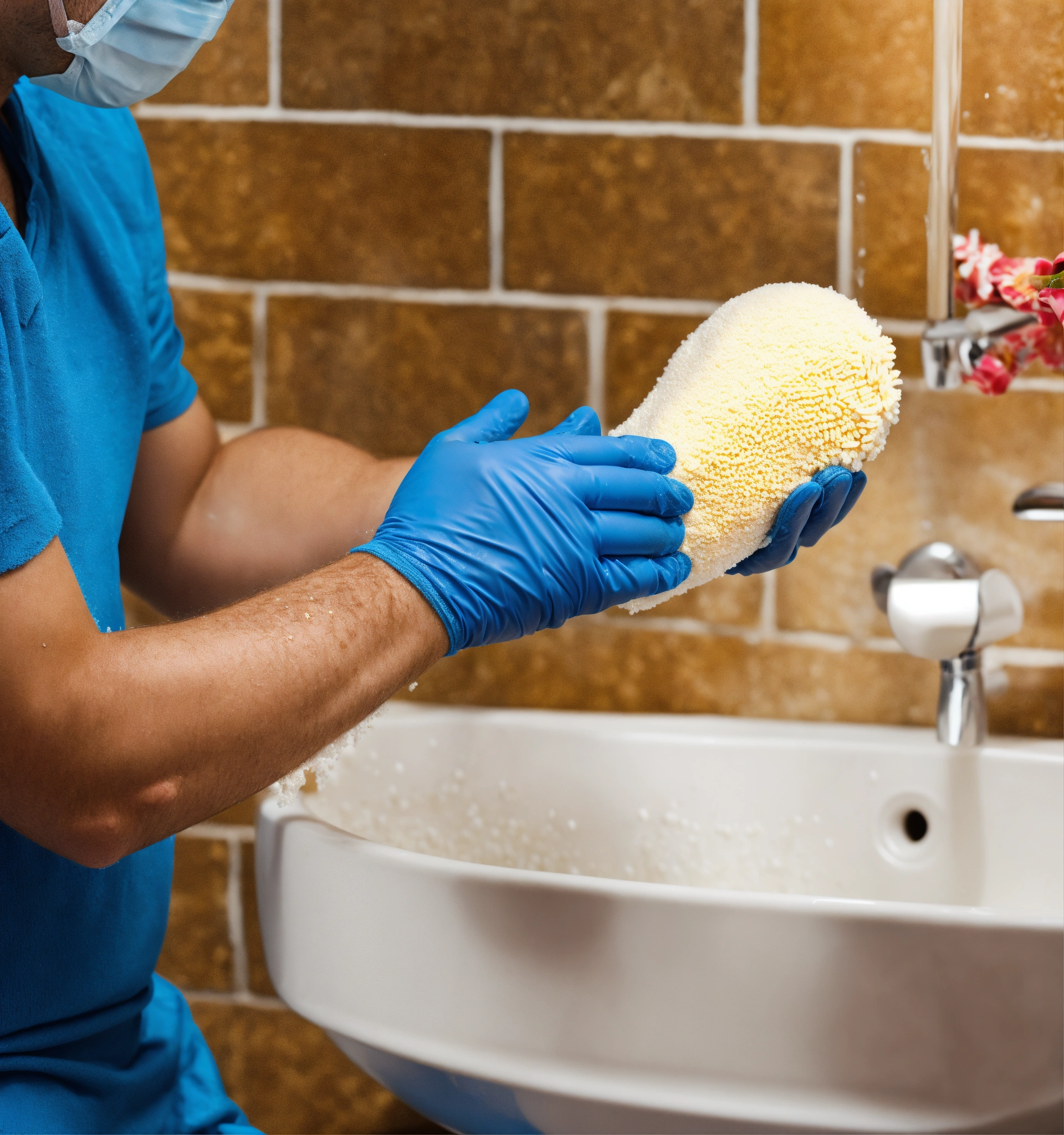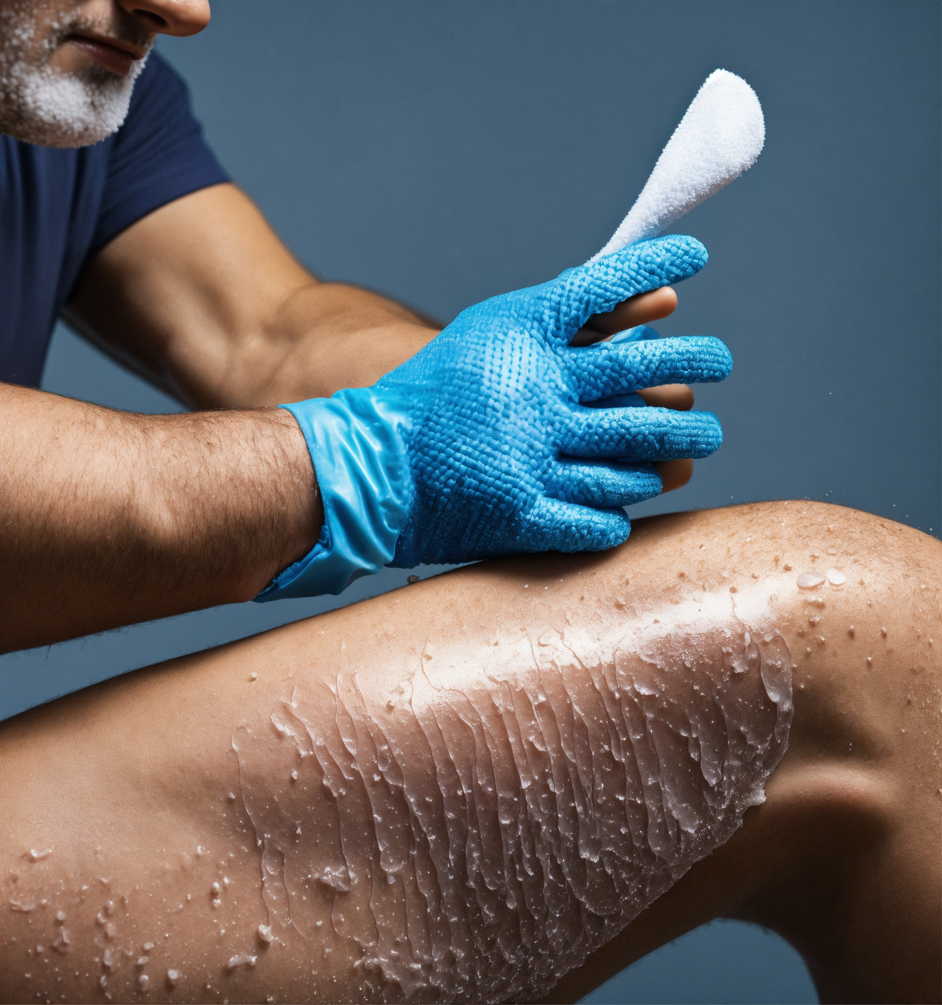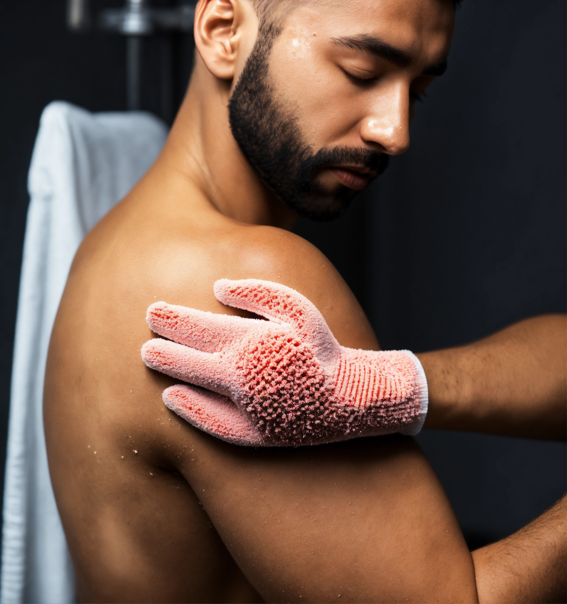 Man using an exfoliating glove to remove dead skin cells on his arm