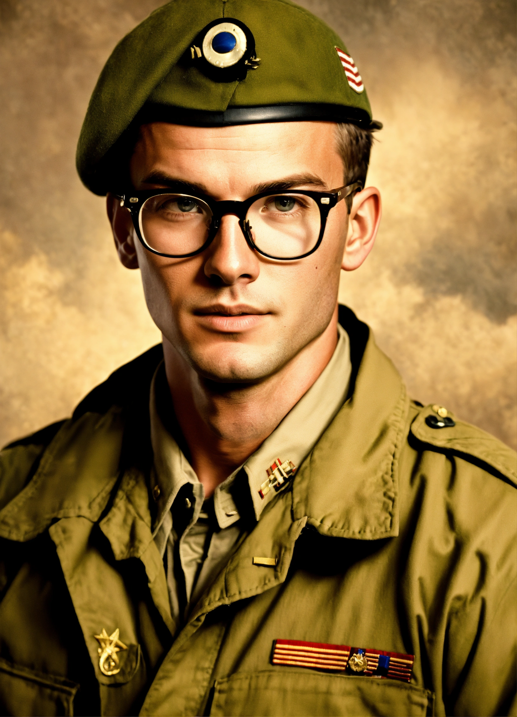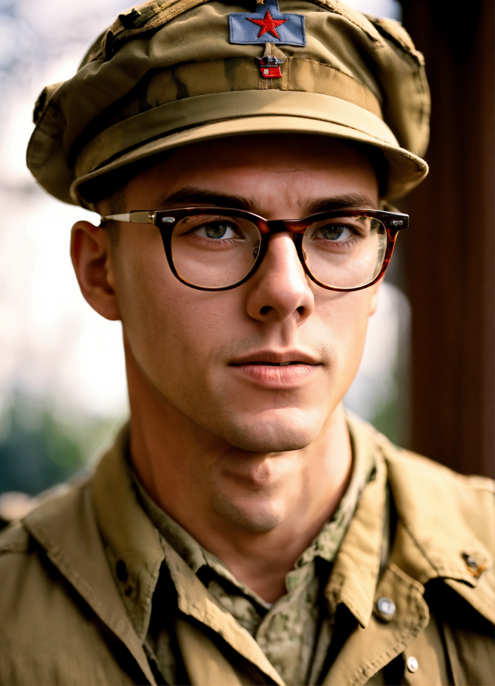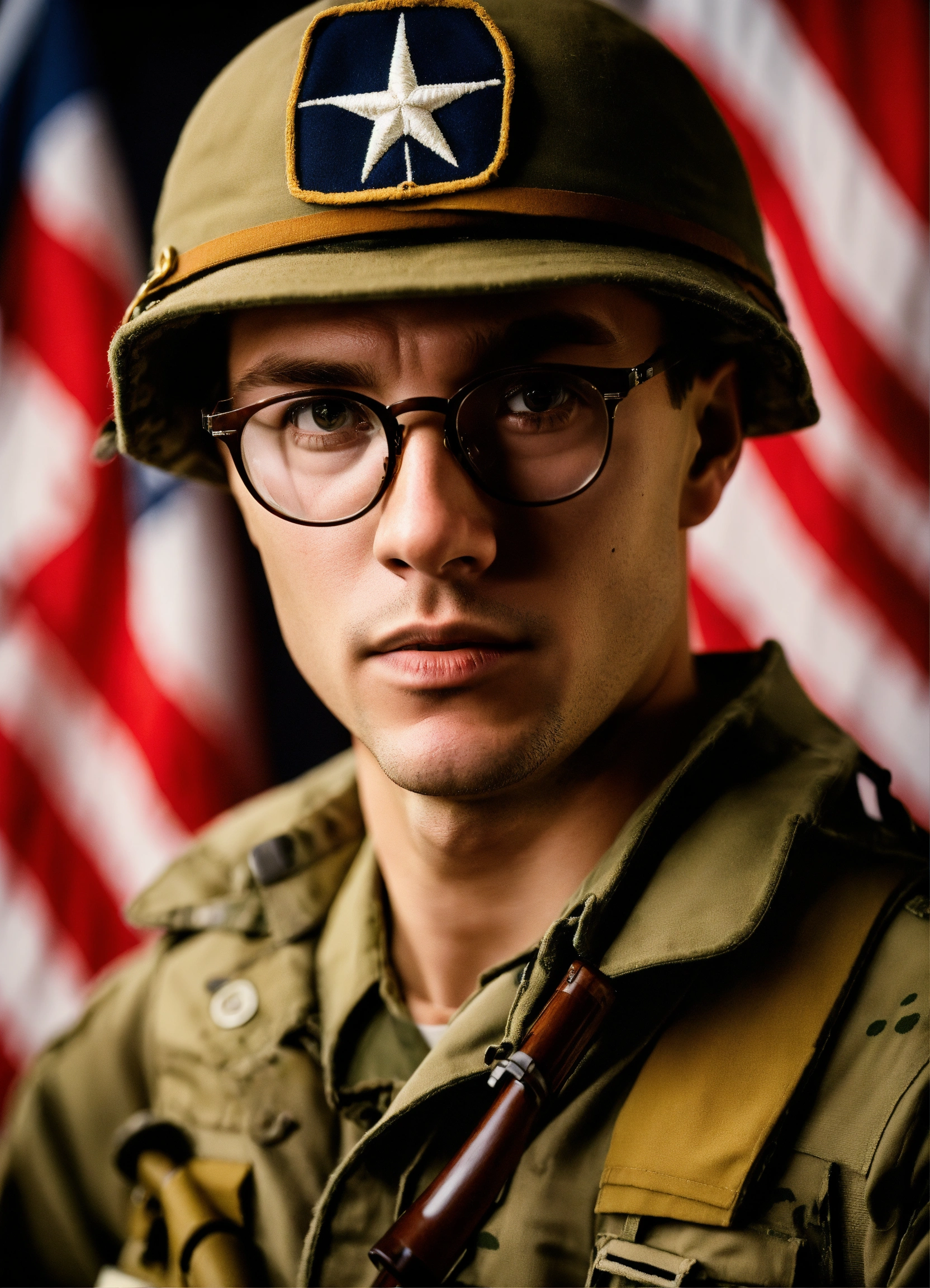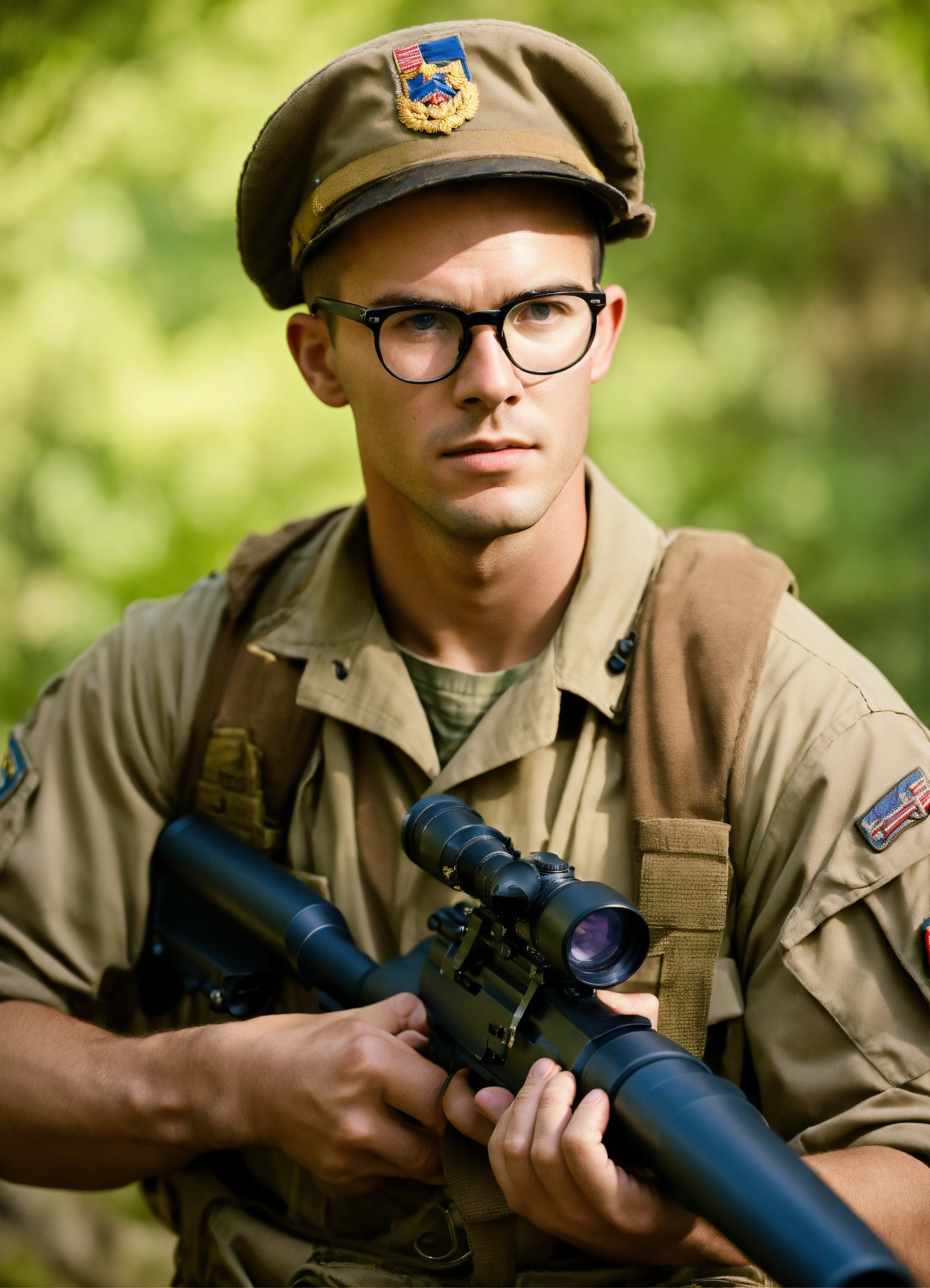 Handsome and nerdy world war ii american soldier, he is a sniper and wears glasses, he is small framed and wirey
