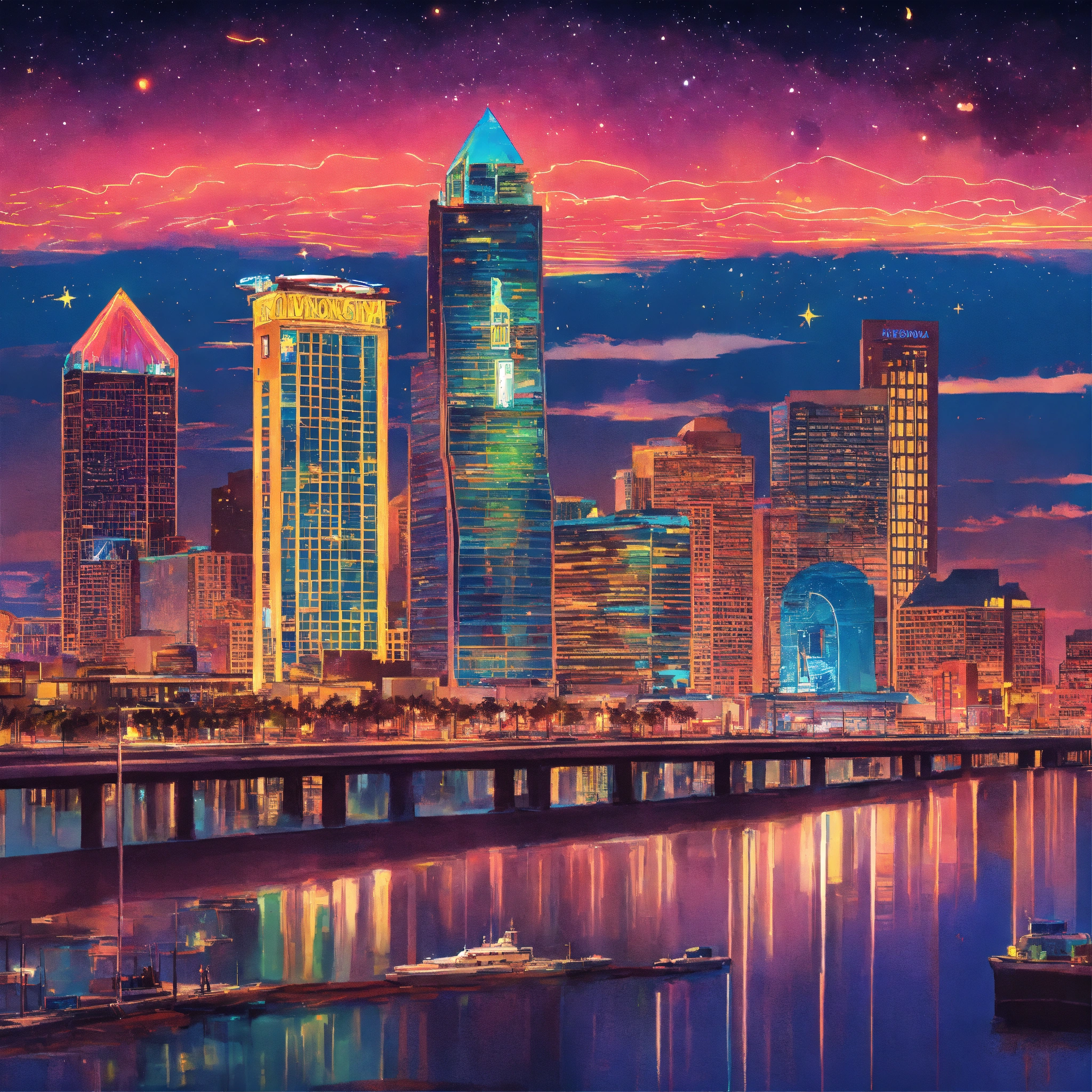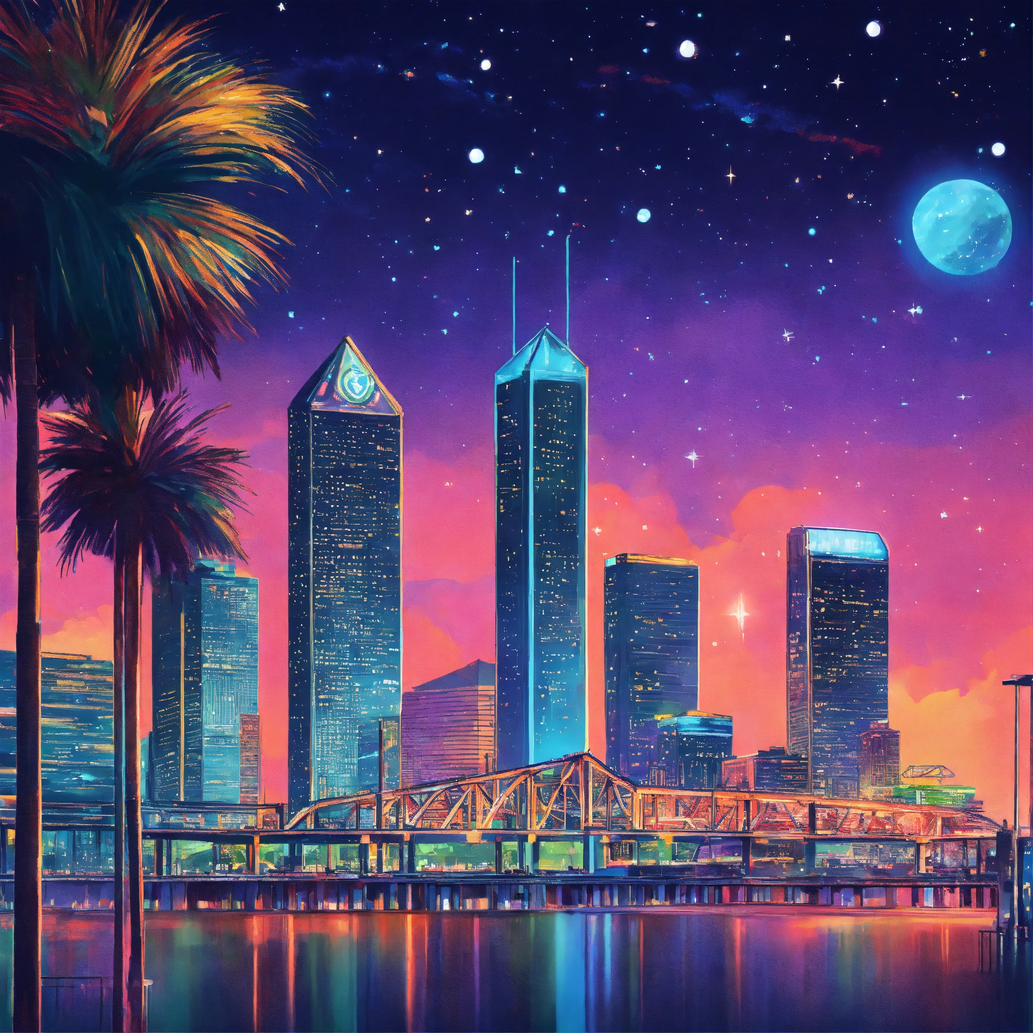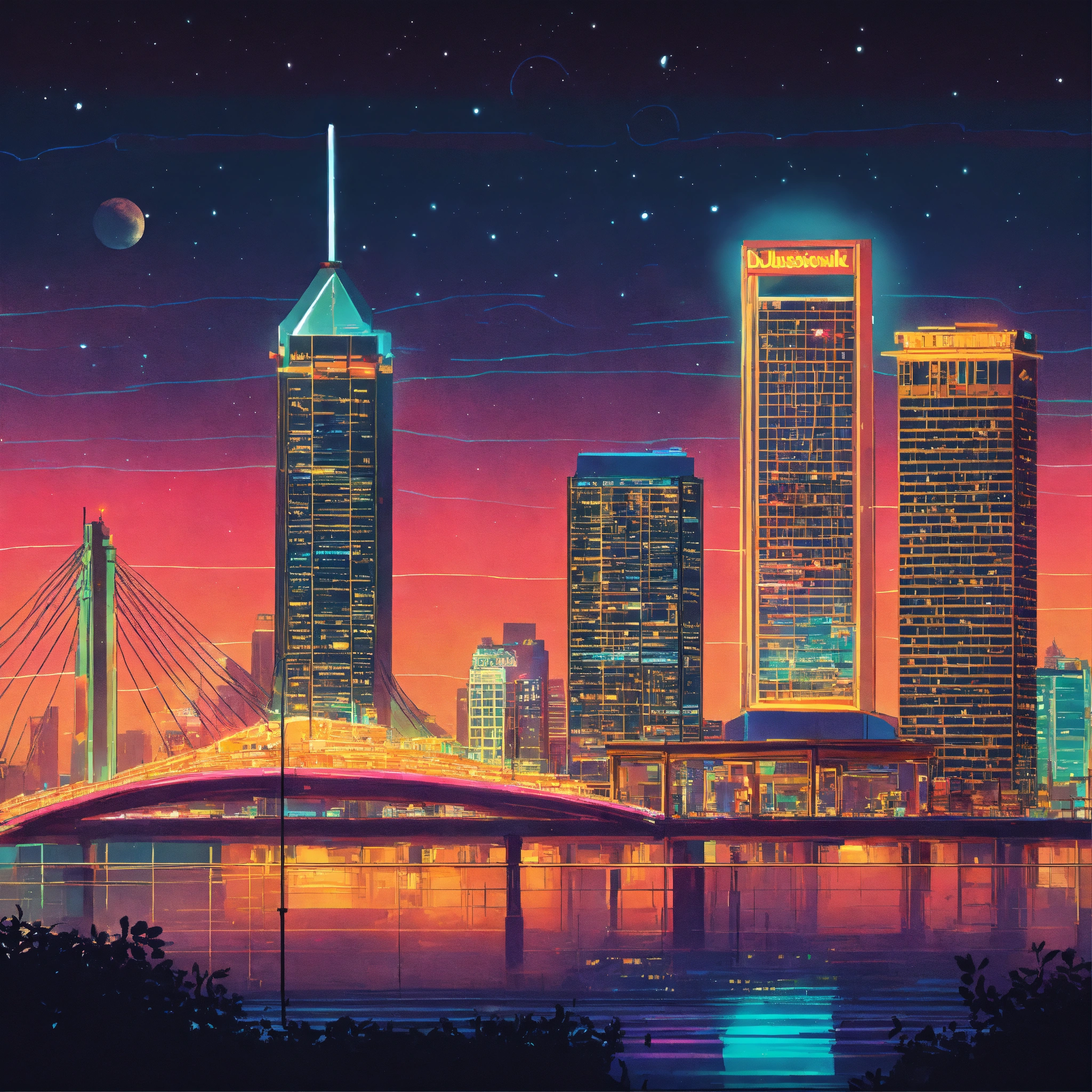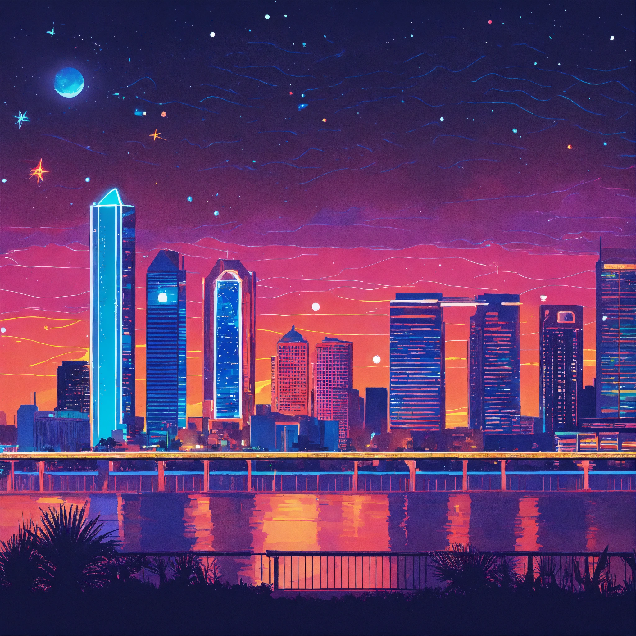 "illustrate a dreamscape looking out at the neon-lit jacksonville skyline below with a starry sky above. the skyline should have a retro-futuristic vibe, reminiscent of classic video games, but maintain recognizable elements of jacksonville's architecture.