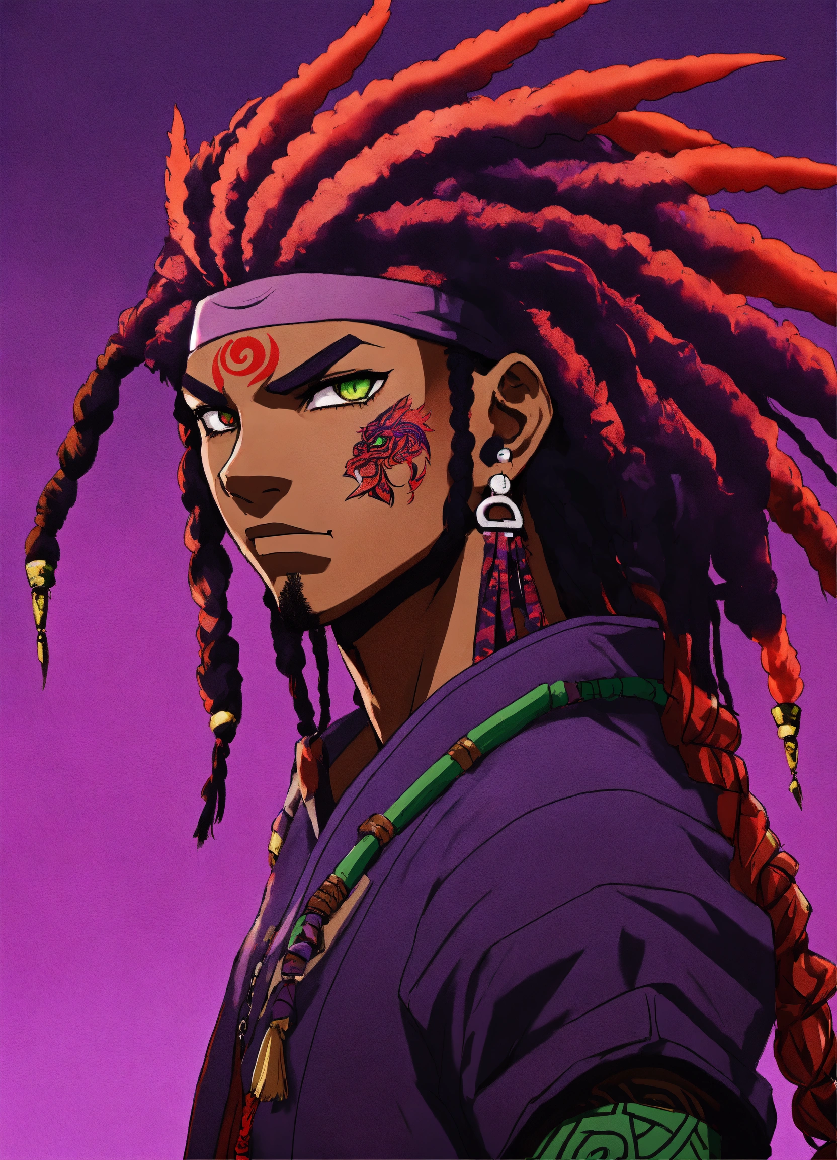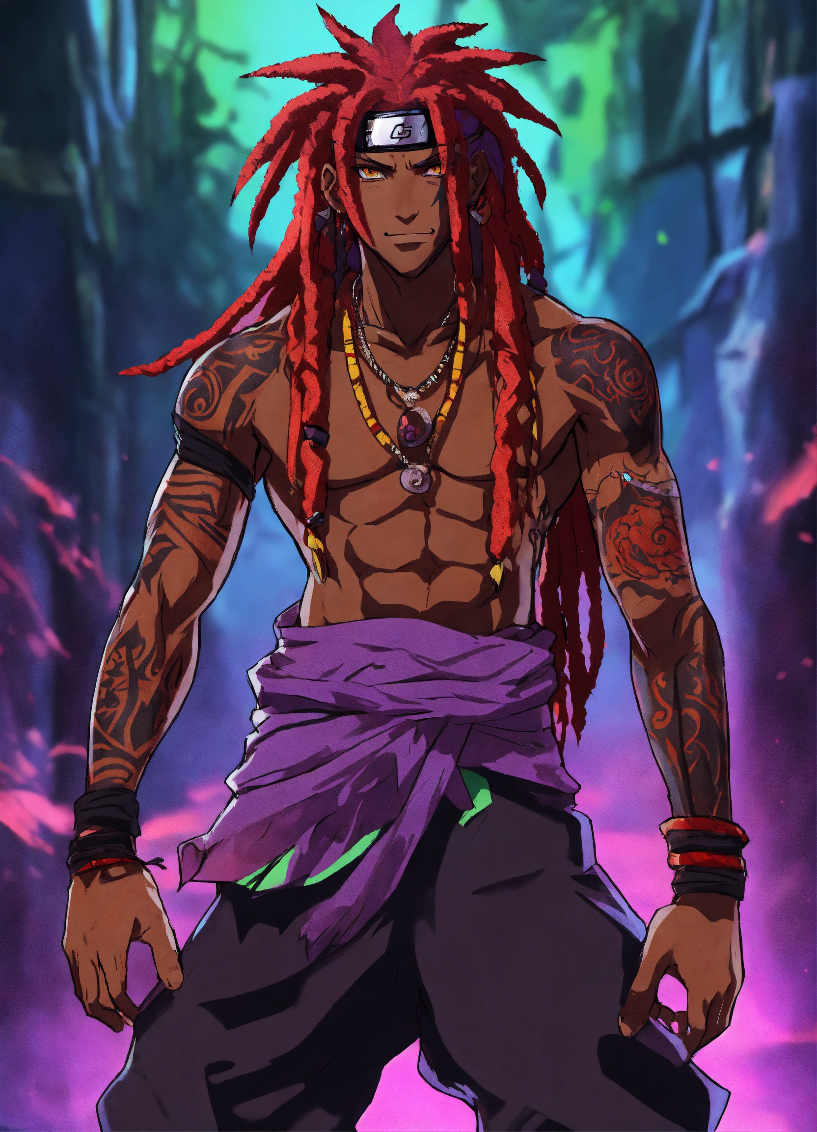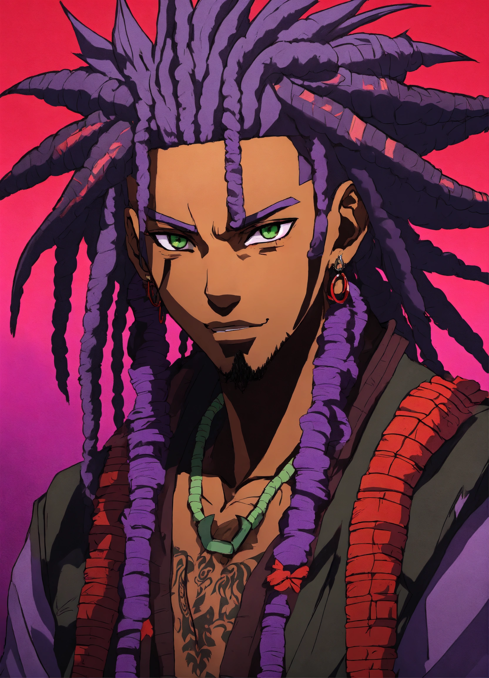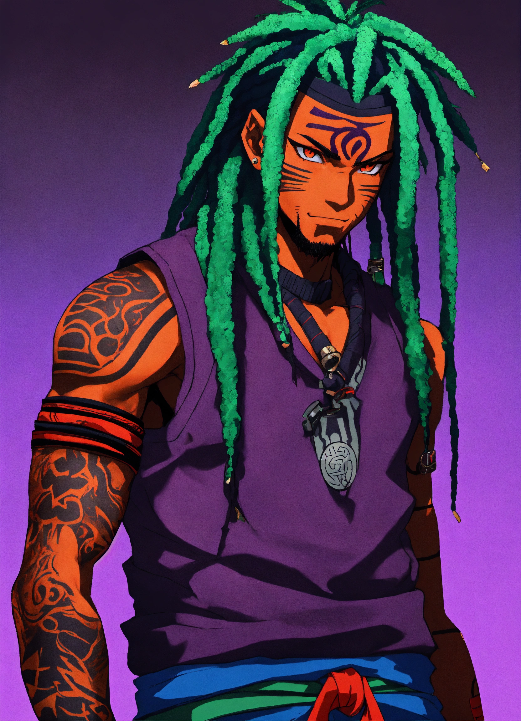 African naruto anime styled character, athletic physique, long purple or green hair, which is styled in a wild dreads and untamed manner, red dragon eyes, he wears a black and purple naruto clothes, anime style, male, has a smirk on his face, has tribal tattoos, full body picture