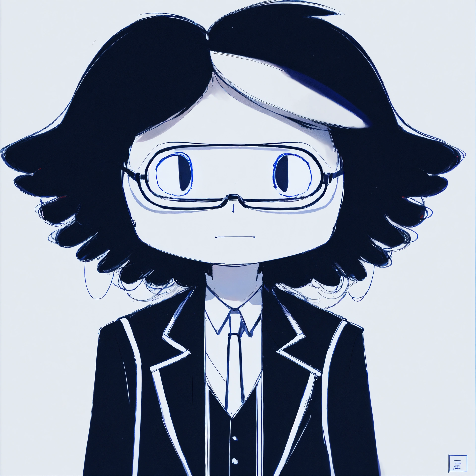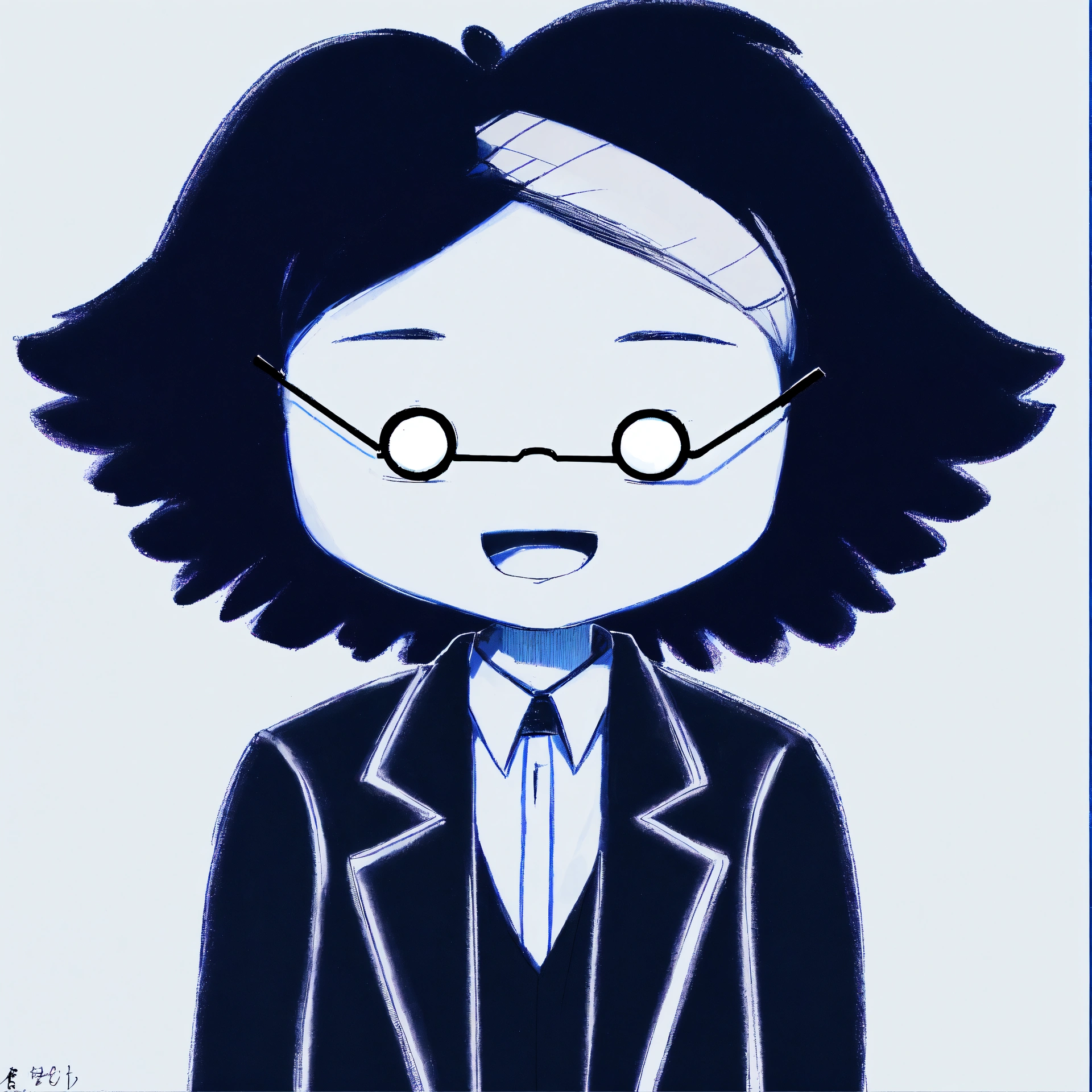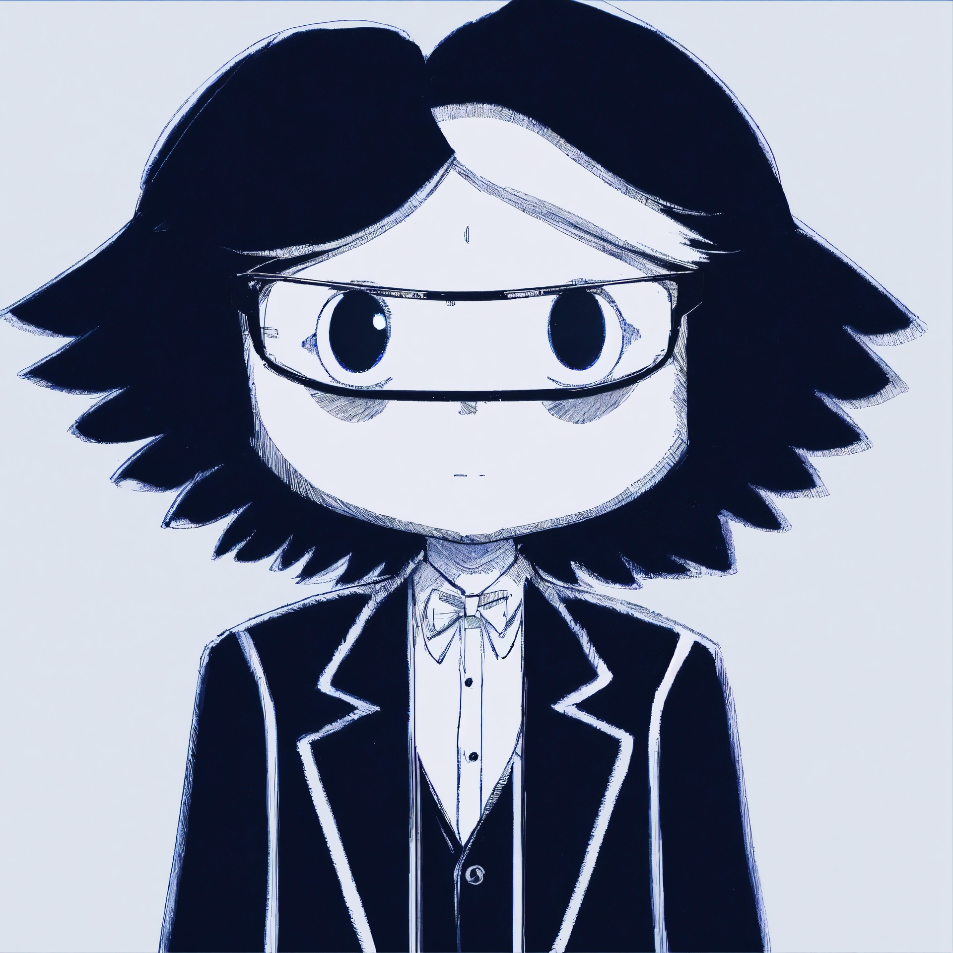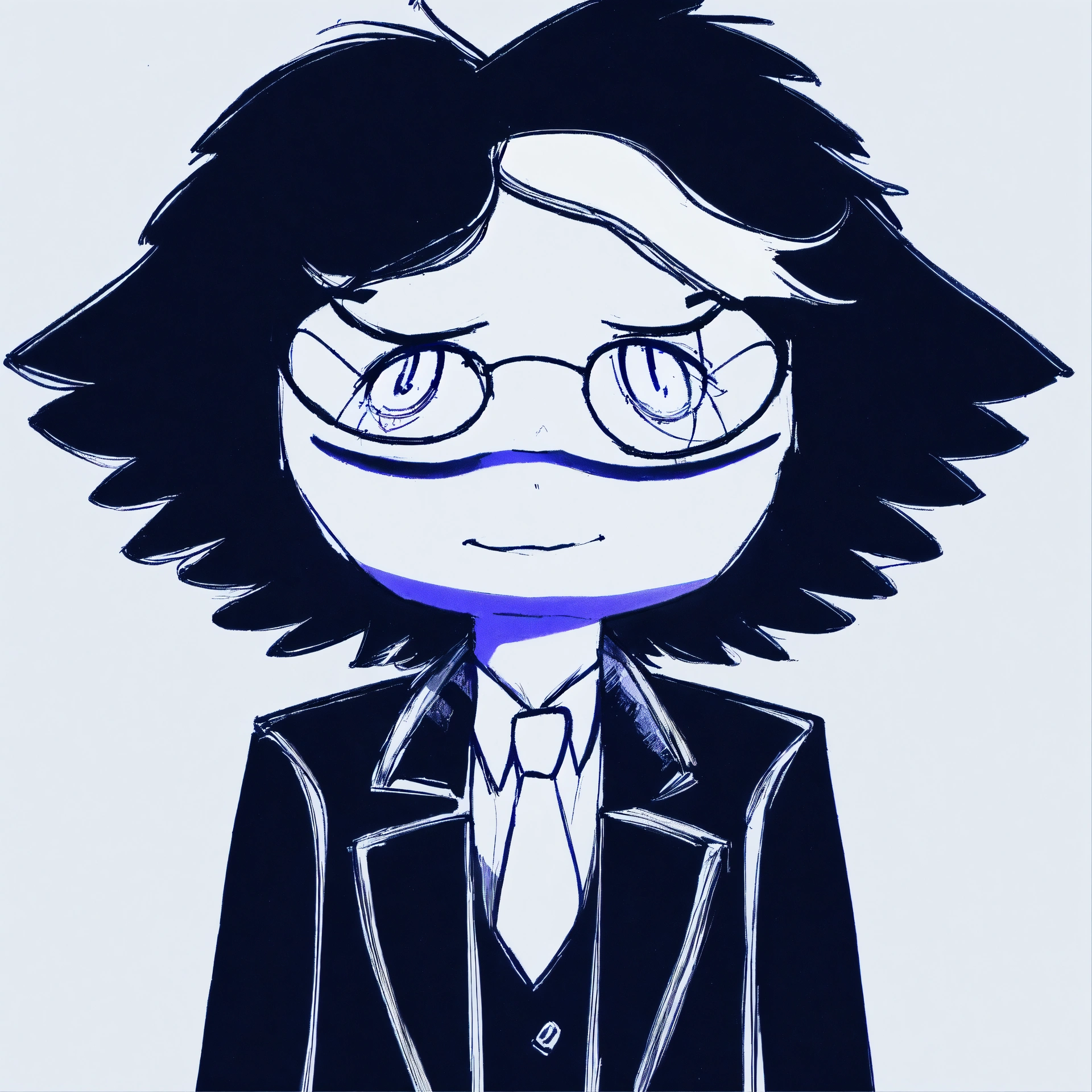 A man in a black suit and with a white tie and wearing small round glasses and with black short hair and a single lock of white hair, masterpiece, best quality, drawn by ink, drawn by pencil, digital art, 8 k, beautiful drawing, highly detailed, concept art, sharp focus, ultra realistic illustration, anime++