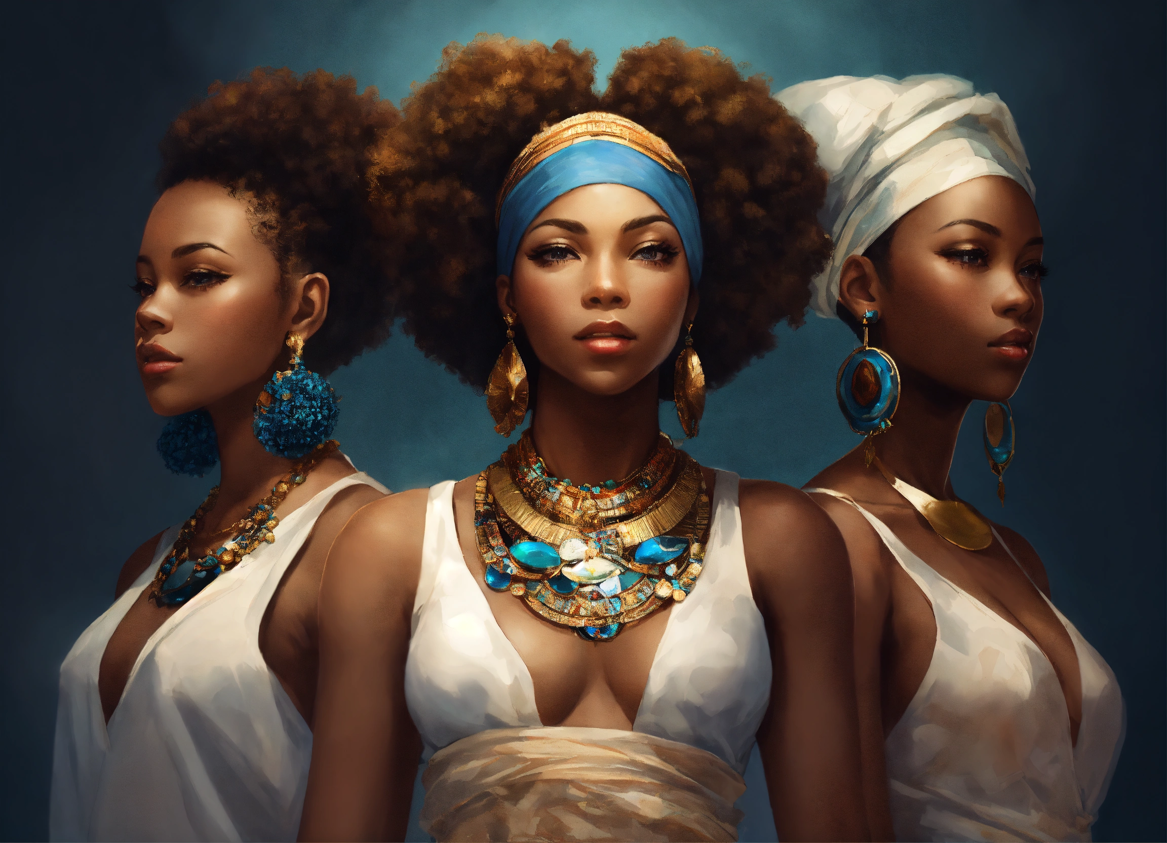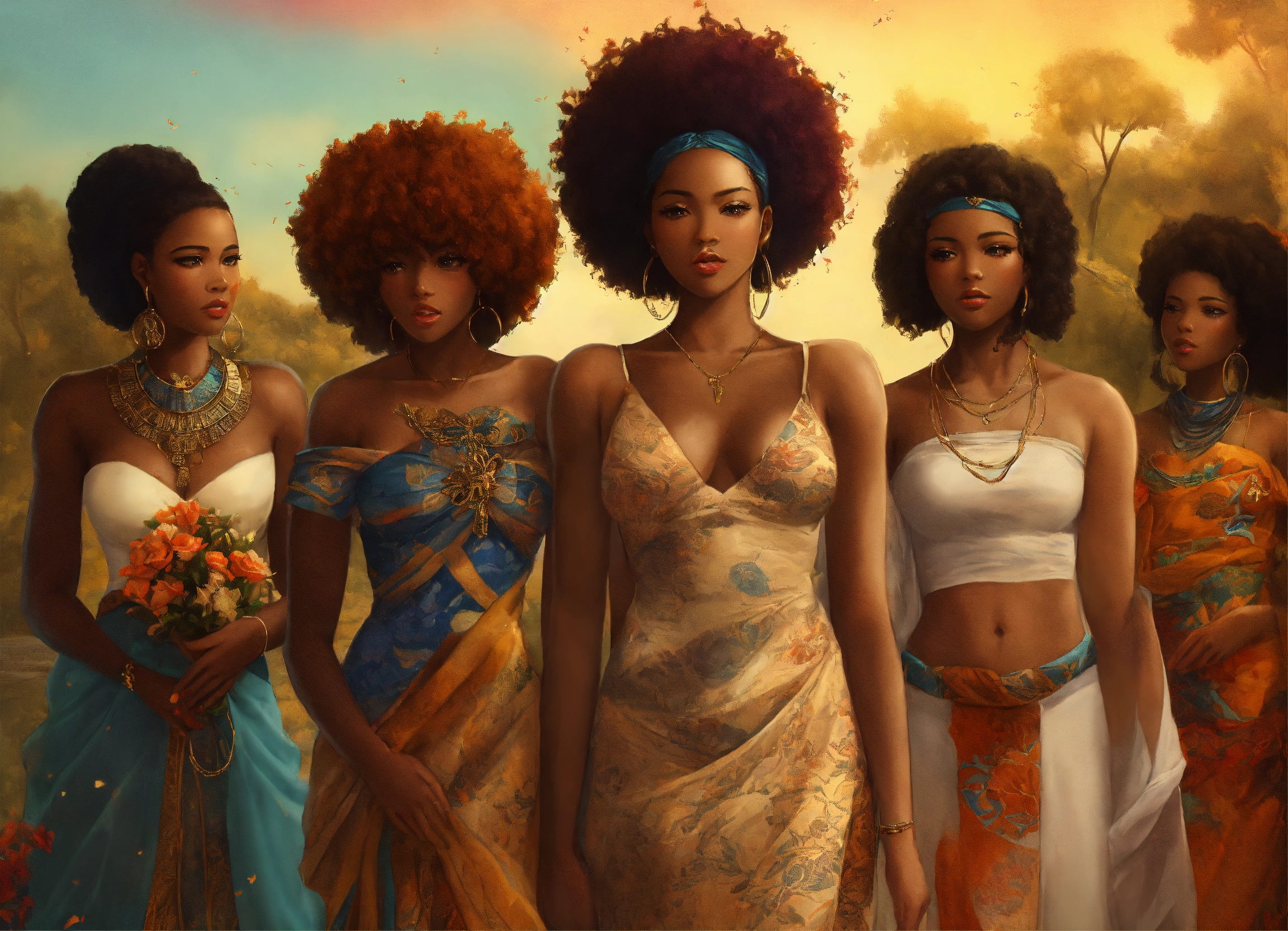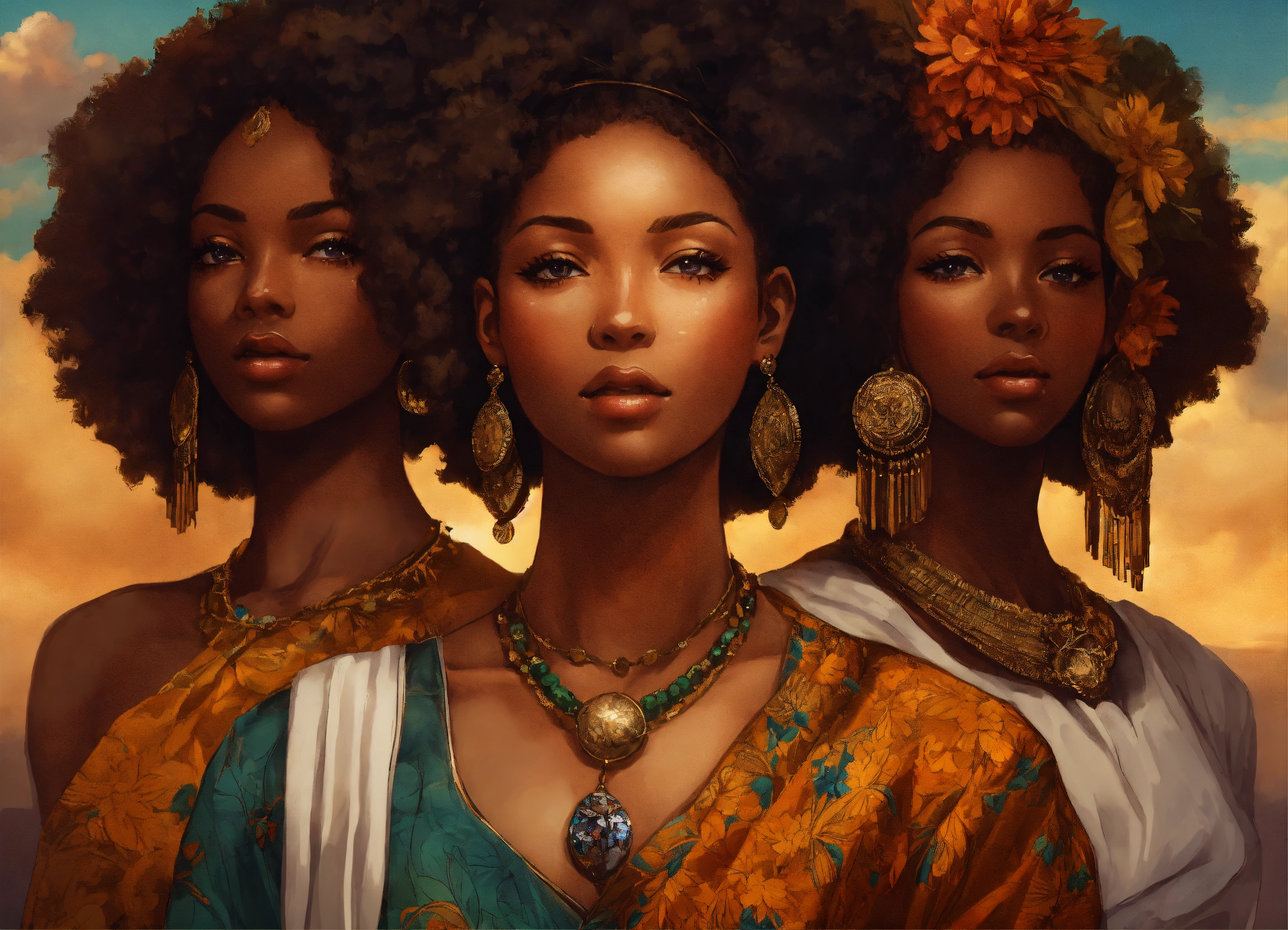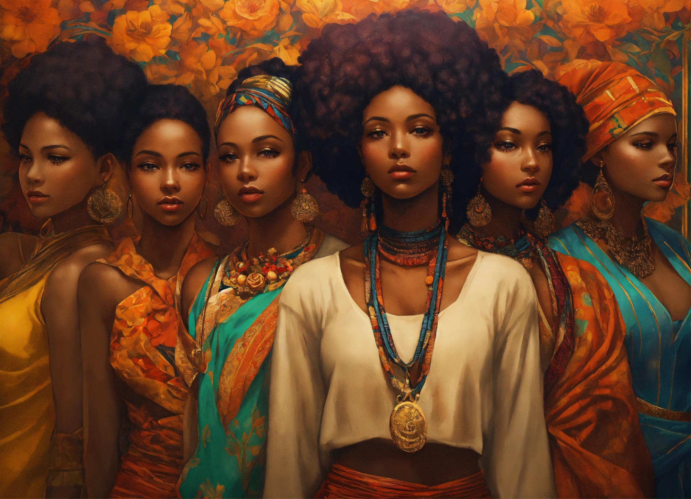 Create a portrait with a group of afrocentric women using this poem as inspiration “us women. each of us are like porcelain and art. each of us strong, yet fragile simultaneously. we stand tall, we are wise, our strength is a force & runs deep. the light of our spirits shines from within us, the essence of resilience, in no way could glass maintain it. we are unwavering, steadfast and pure. yet, like porcelain, we too can be broken, by the many things we tend to leave unspoken. so let us mend each others fragile pieces during our vulnerable and delicate moments and let us honor each others souls, for us women, like porcelain, know the true meaning of the beauty we behold”. afrocentric. anime manga