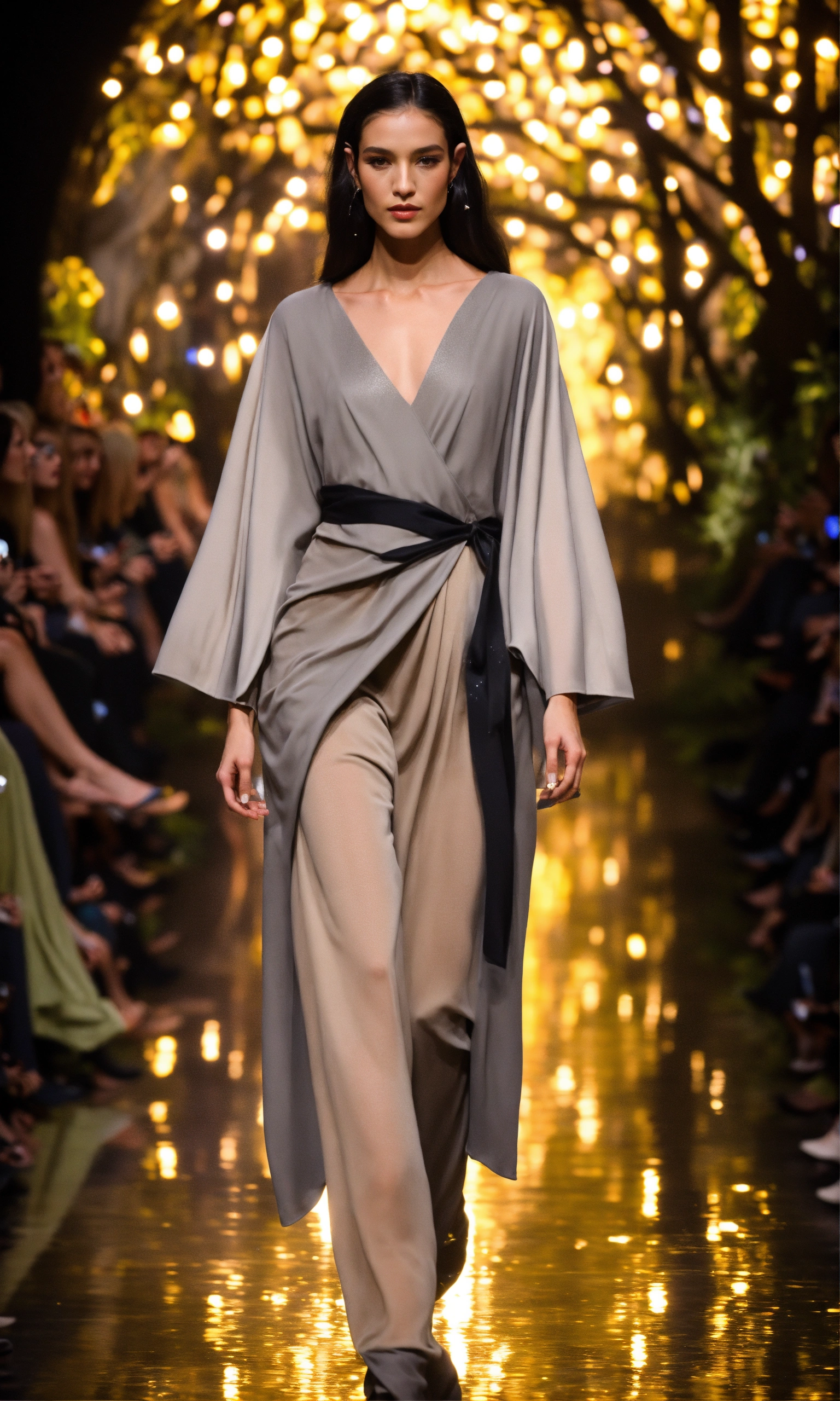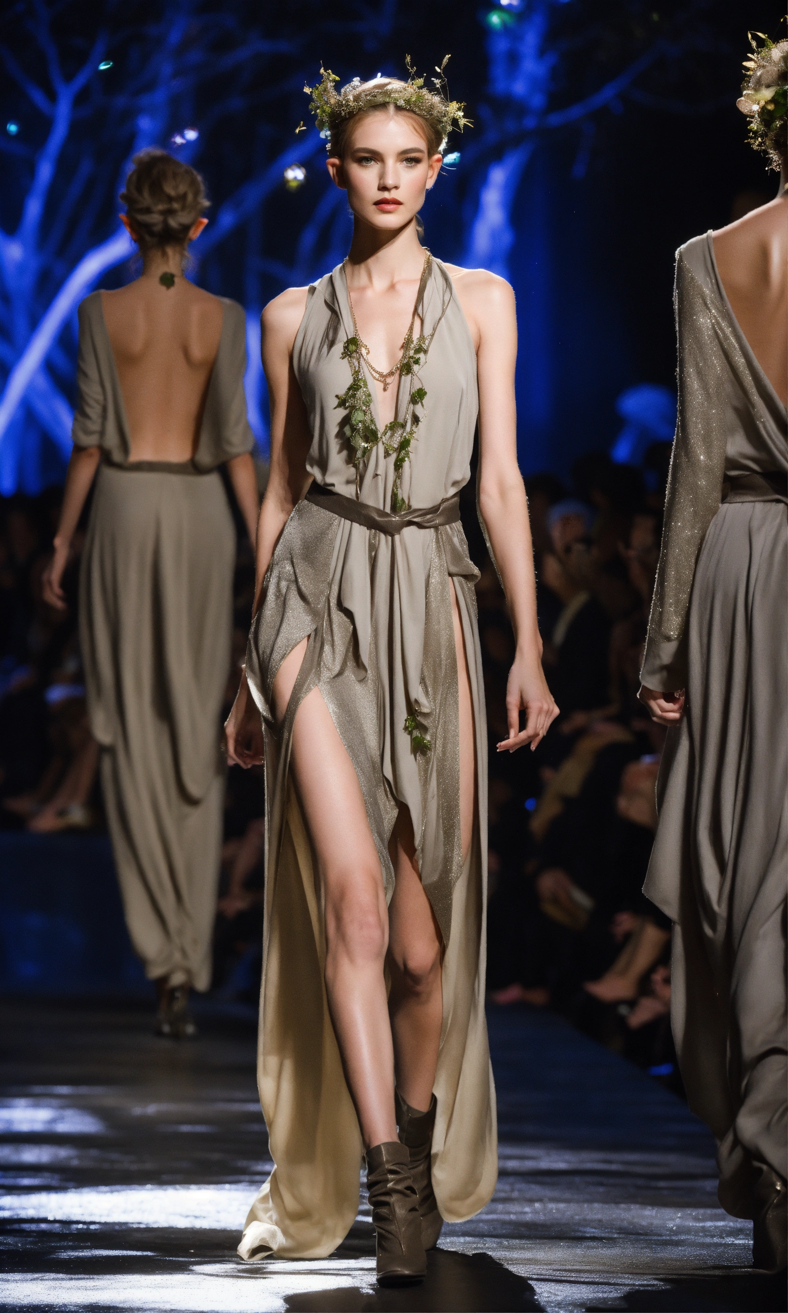 Lothlorien androgynous elves walking runway during elvin fashion week wearing dolman sleeve elvish donna karan fashion in black, white, grey, beige, stone, metallics, shimmer at an enchanted forest runway at starry nighttime, fireflies