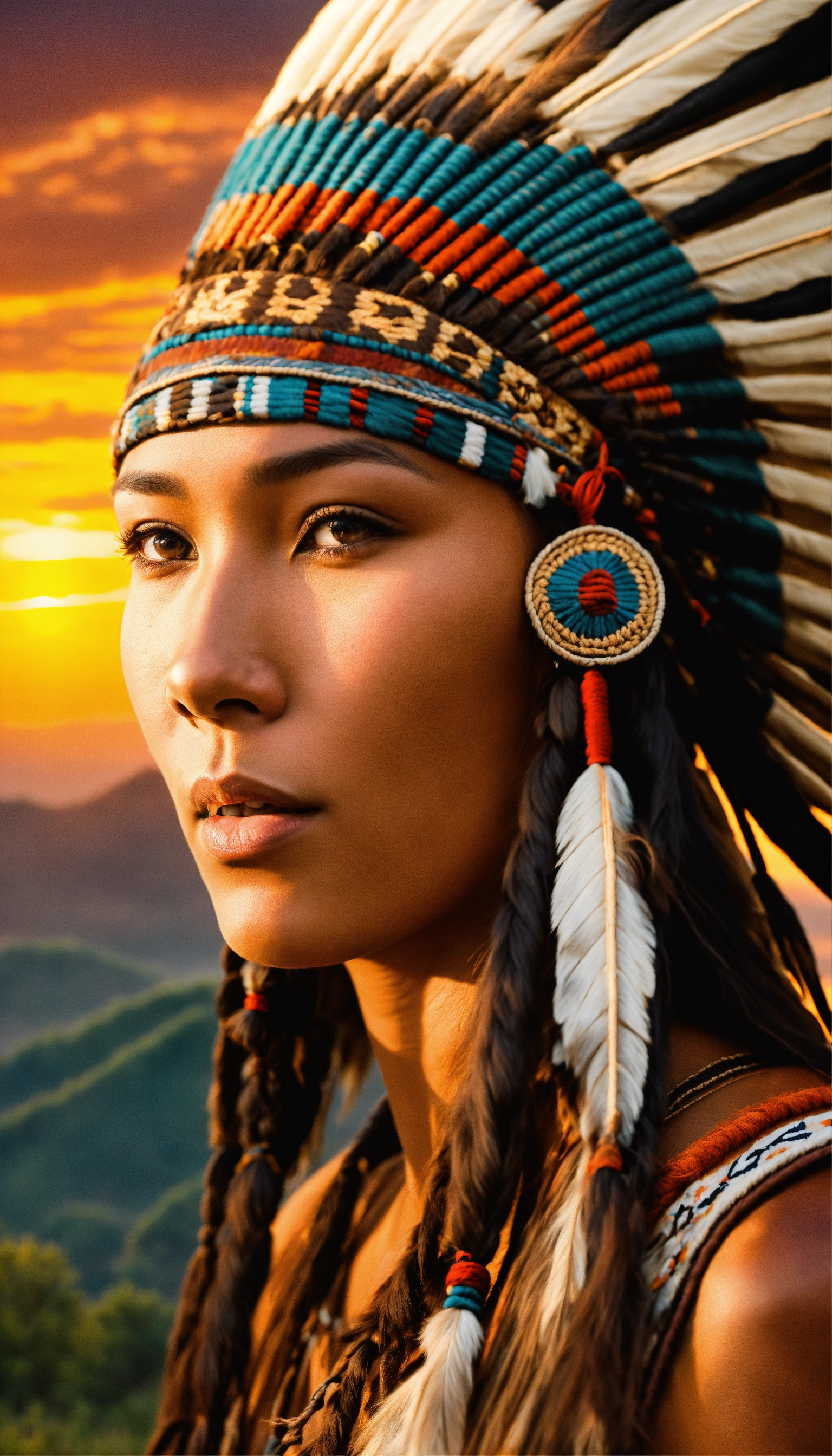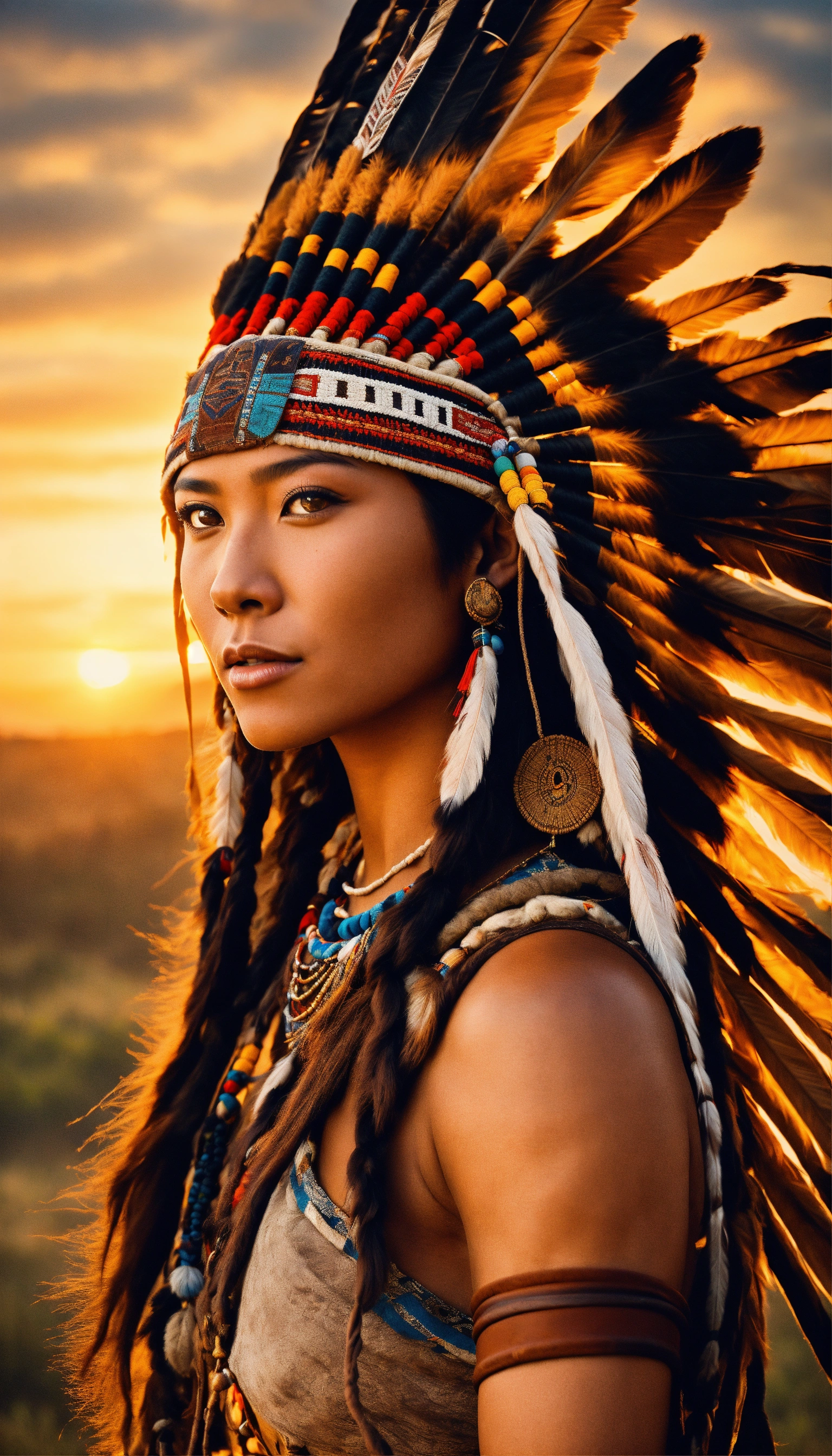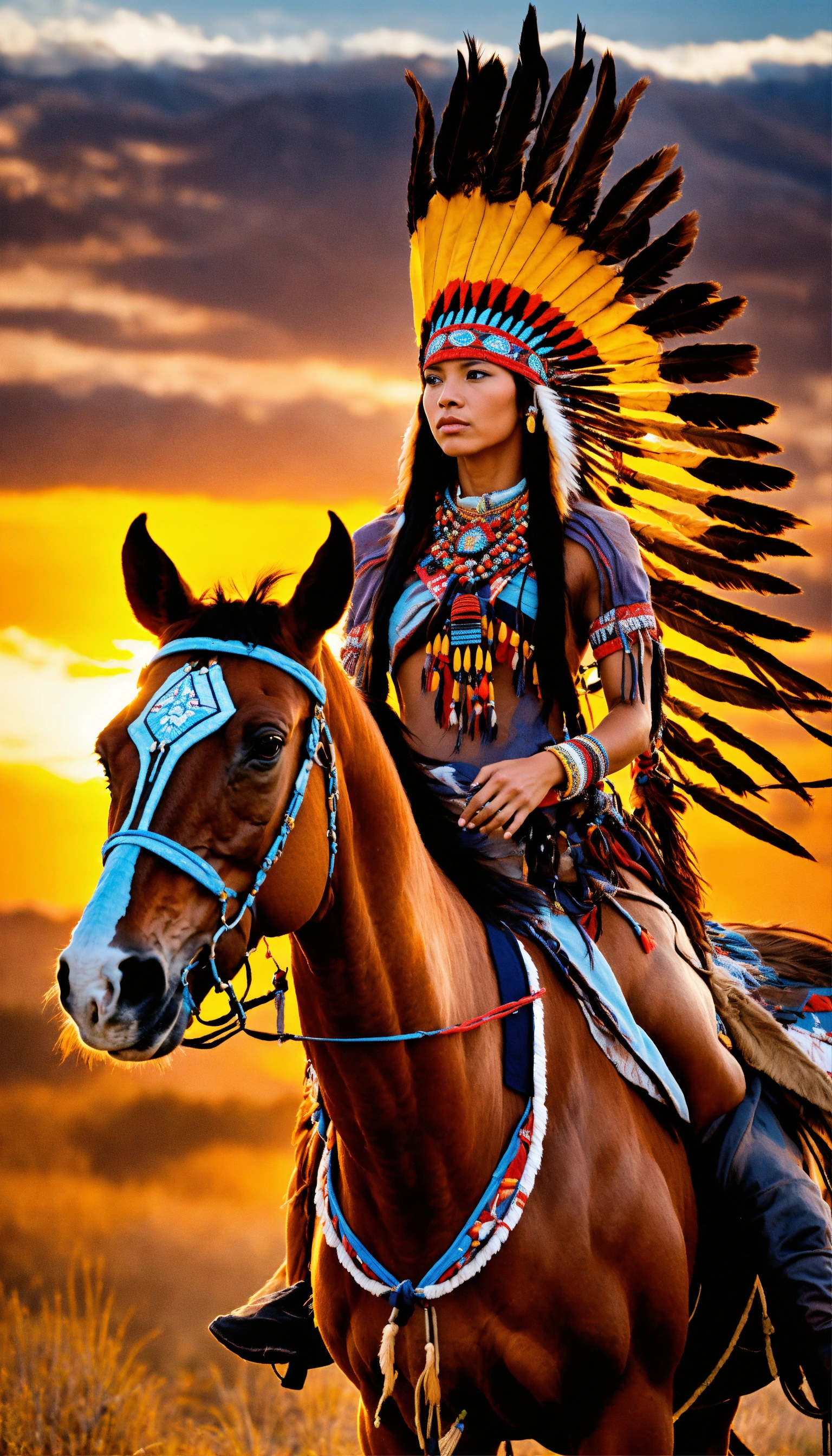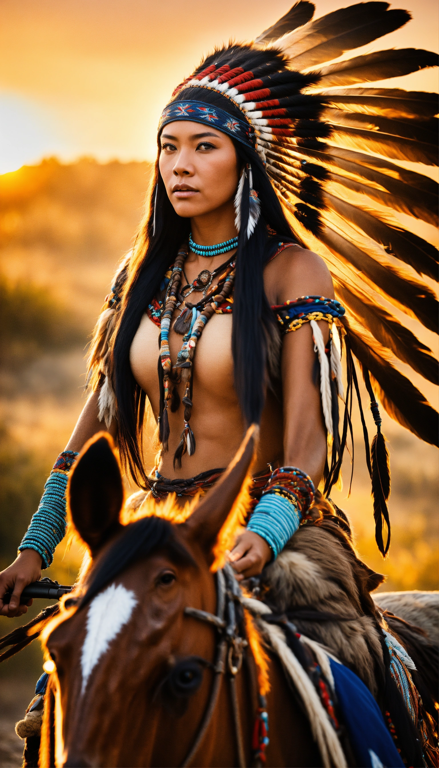 With perfect chinese eyes at beautiful sunrise in full view is the 1600s 8k photographic focus detailed portrait depiction of a beautiful woman native american yamasee african-american riding on horseback wearing a full warbonnet, tall detailed design indian teepee on the landscape, national geographic style