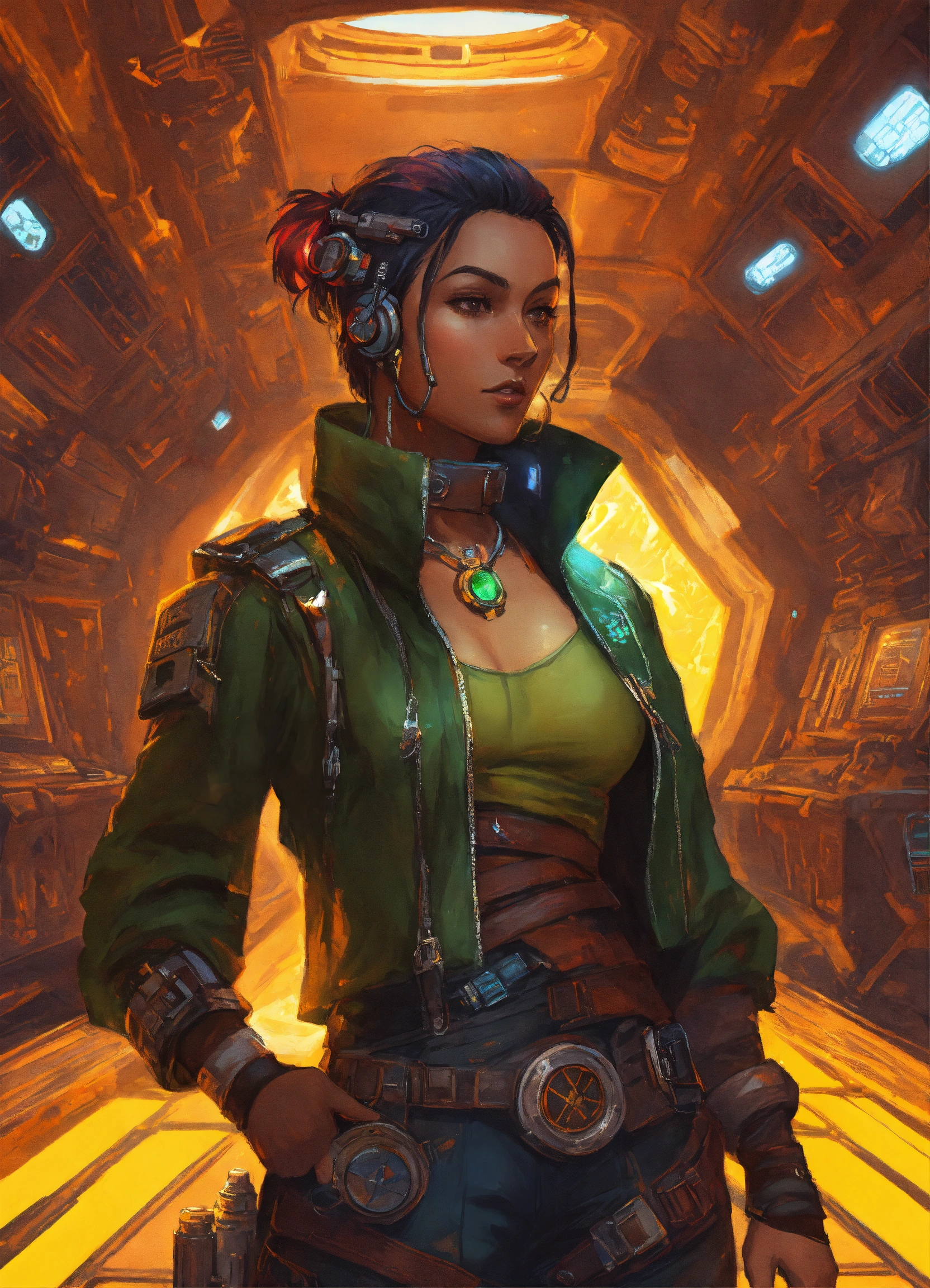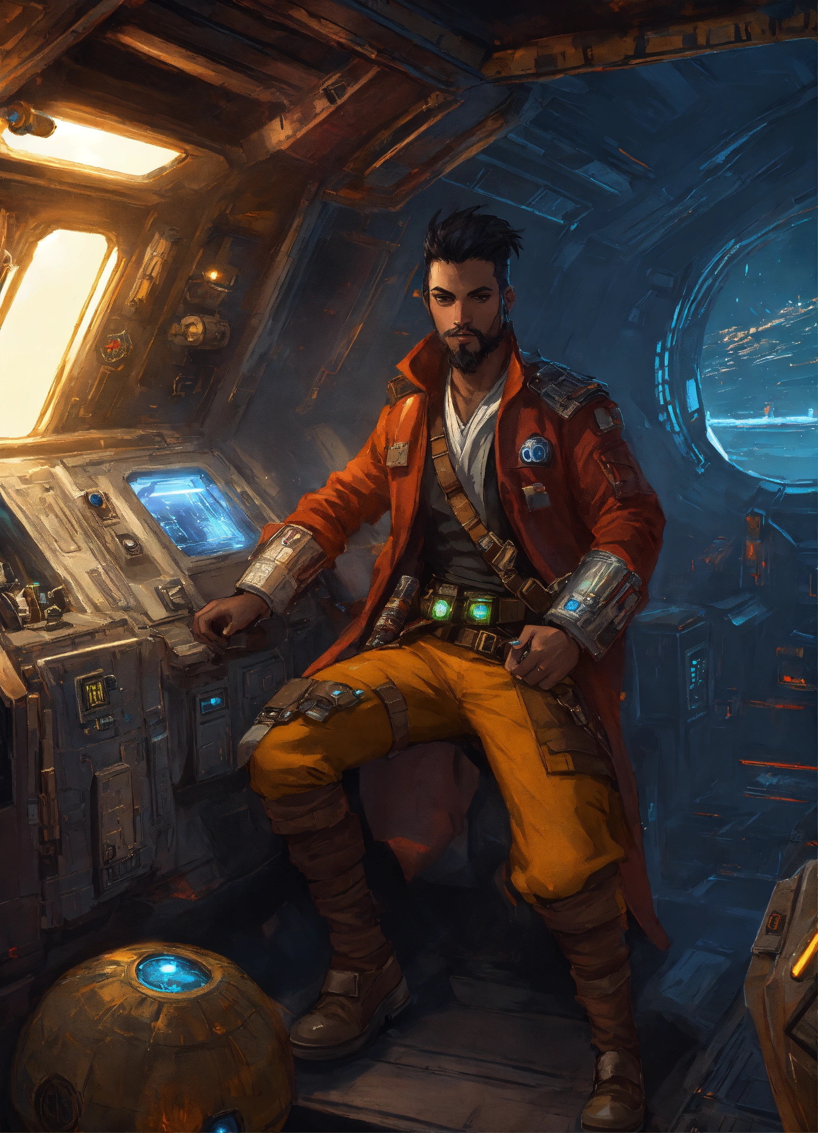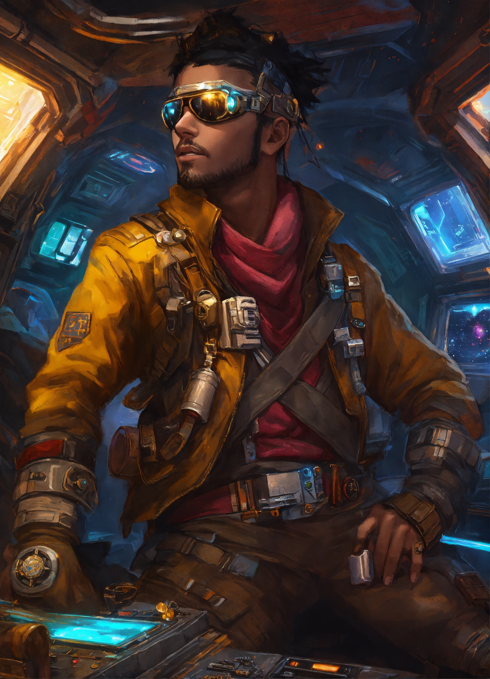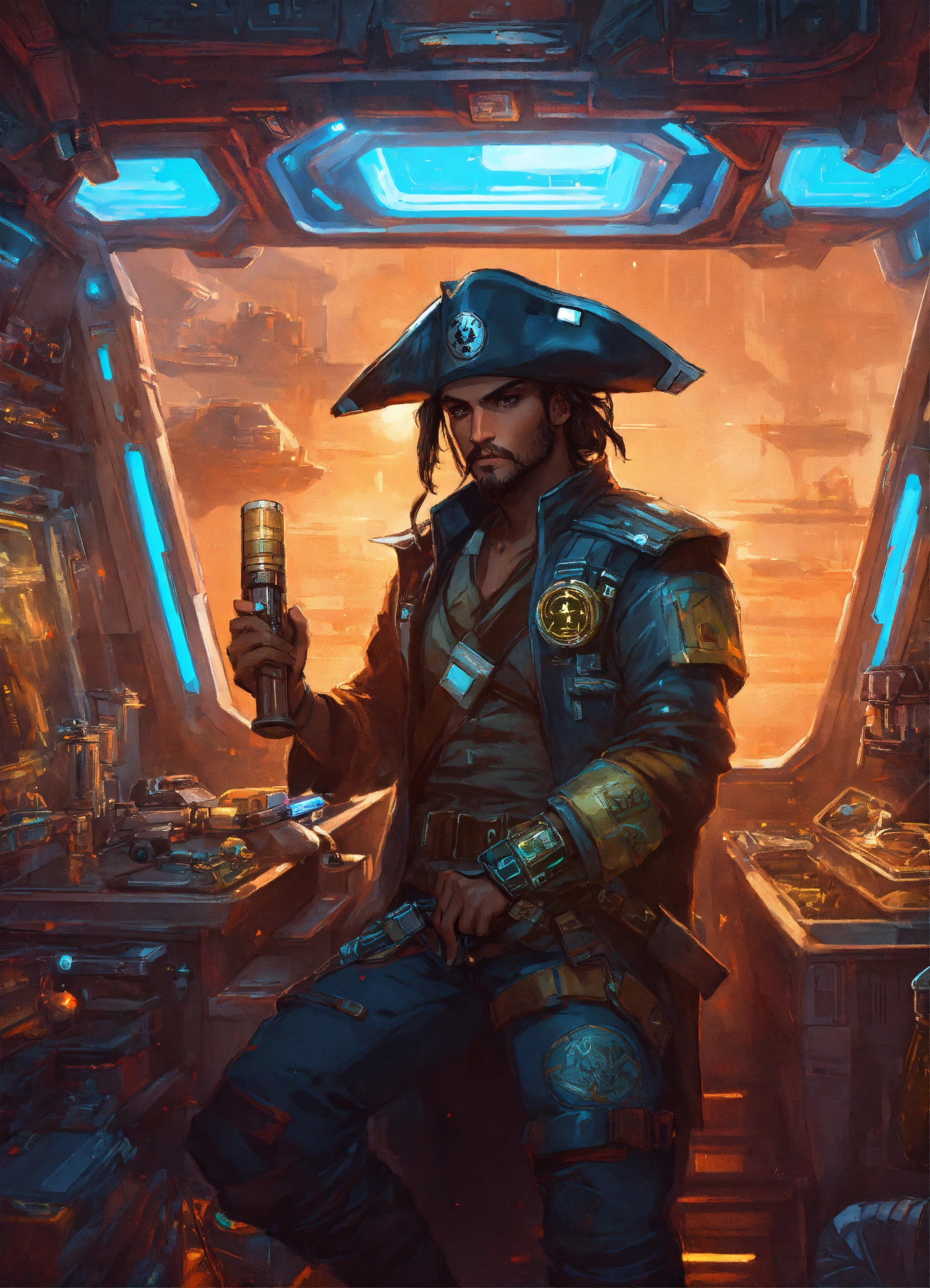 Character art of a cyberpunk pirate in a star wars spaceship with treasure