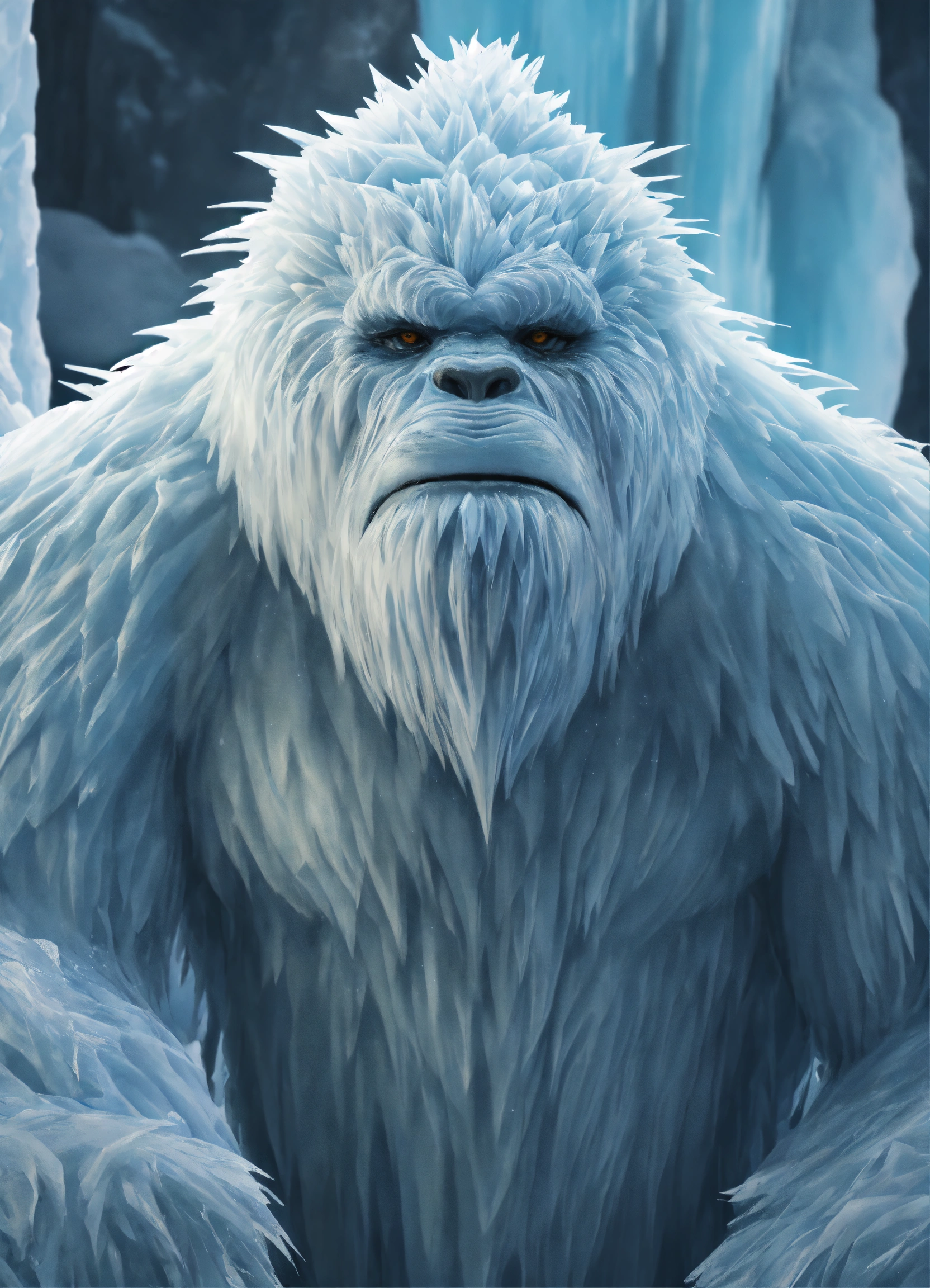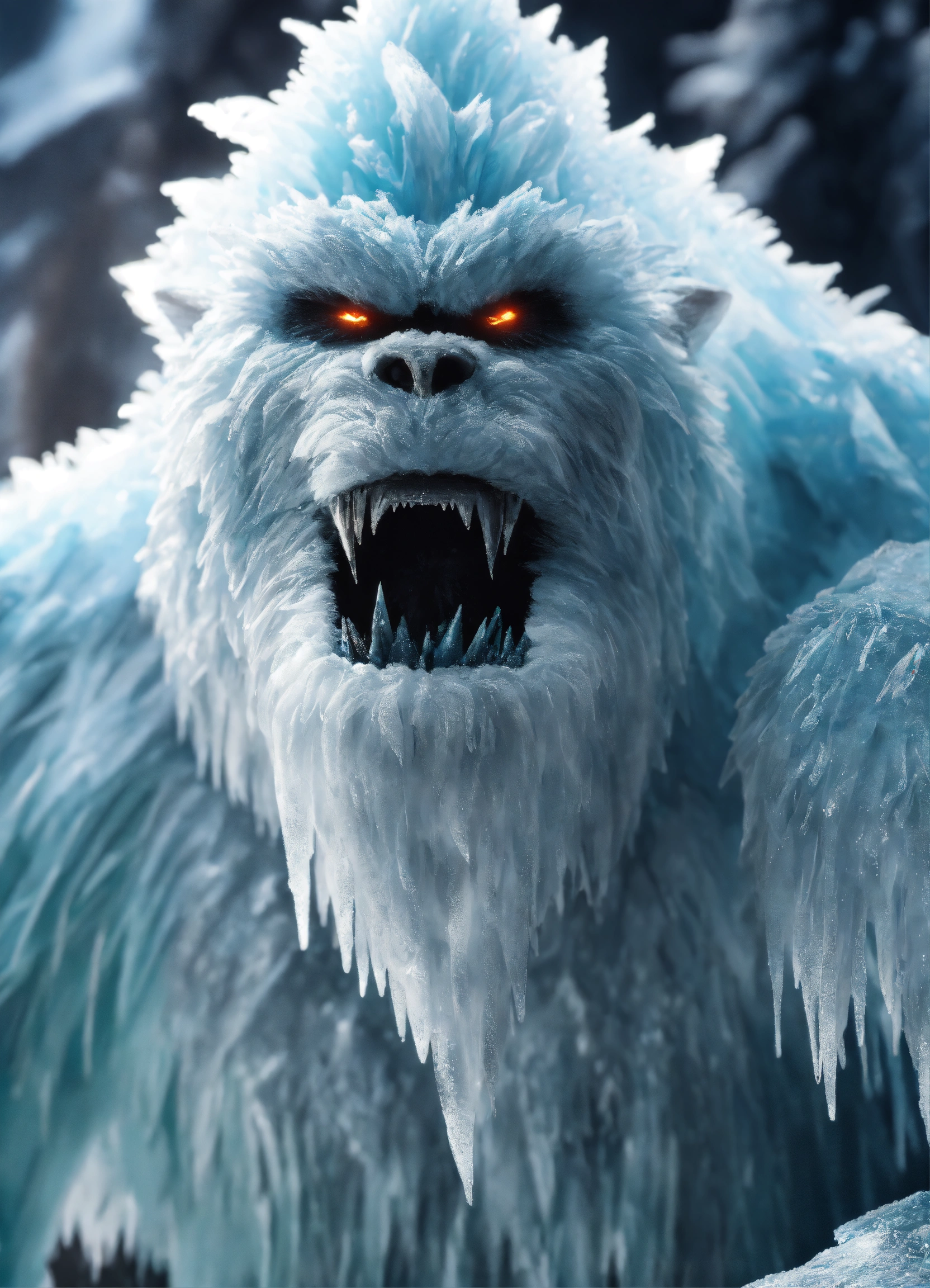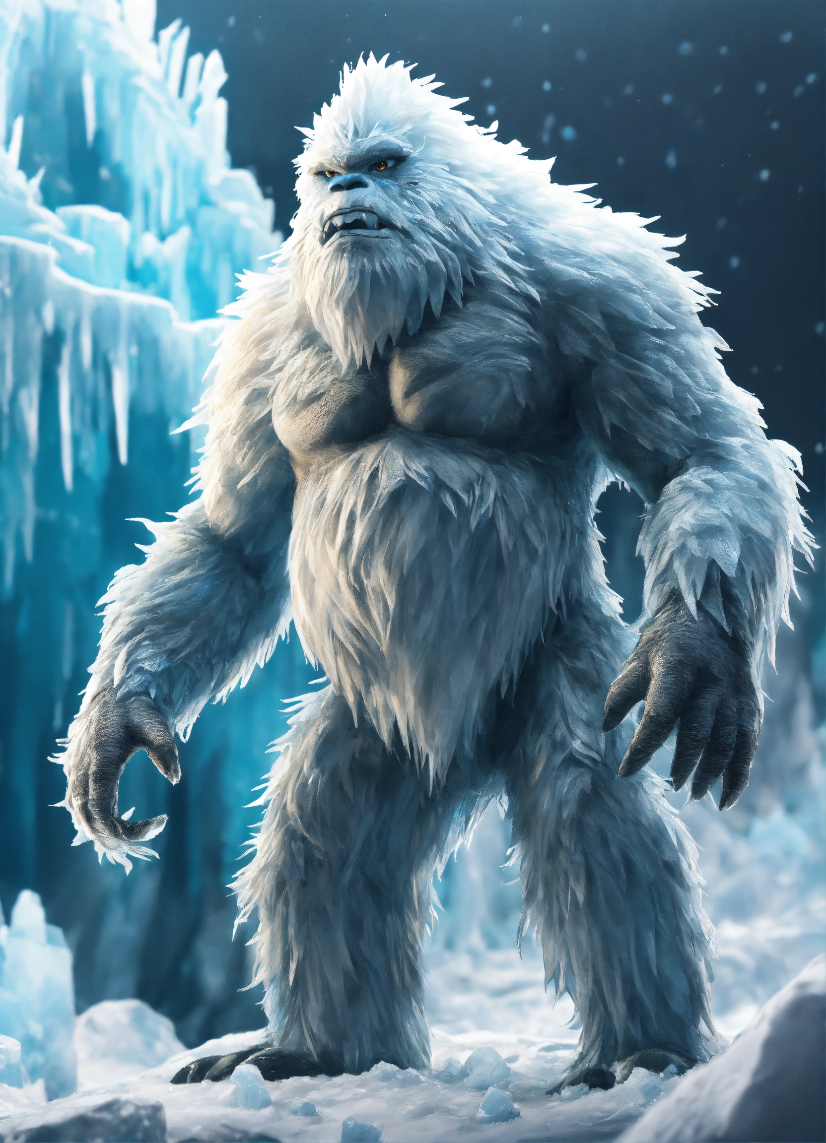 Medium close-up, glacial yeti is a towering ice creature that glistens with frost, watch as ice crystals form and shatter realistically as it moves through its frigid habitat, extremely detailed, realistic photo, 4k realistic photo, art