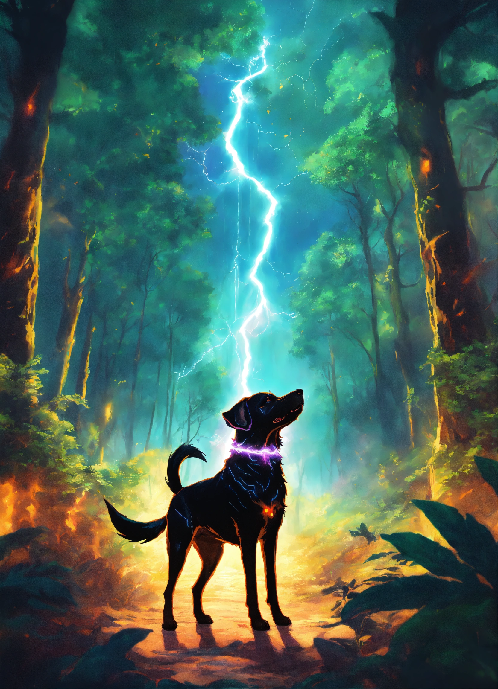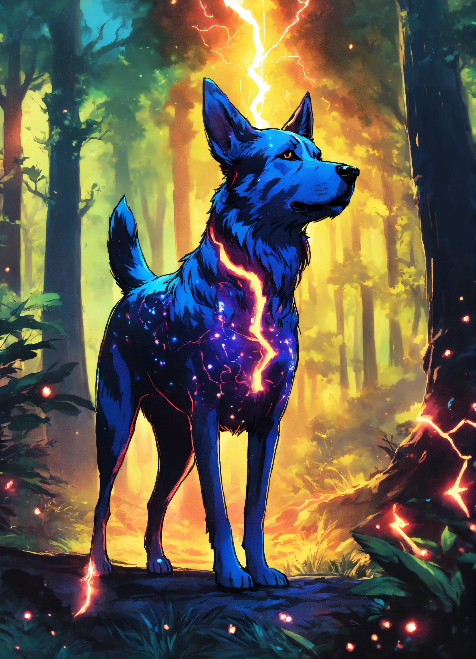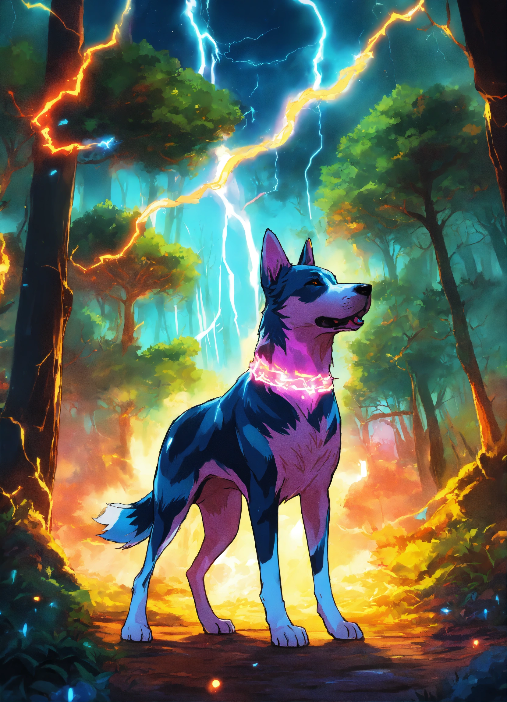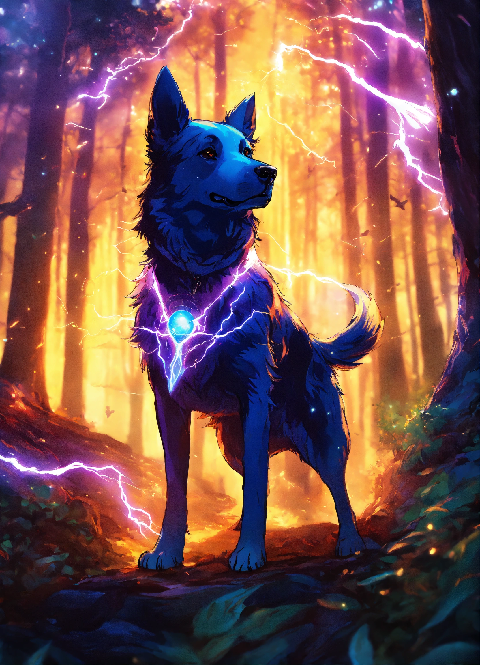 Epic cosmic dog, barking, lightning aura, mexican simbols, in a magic light forest, 2d anime manga style.