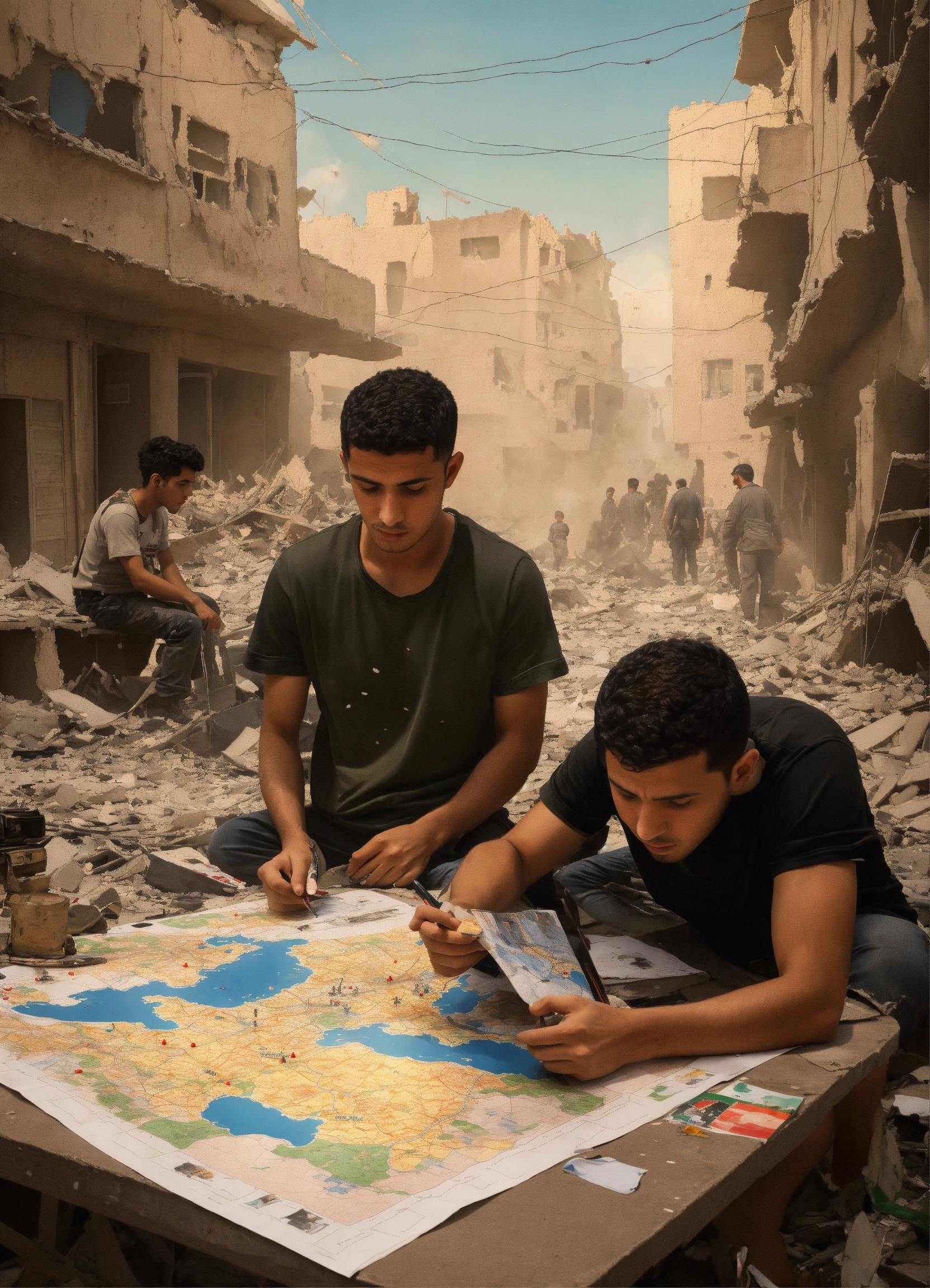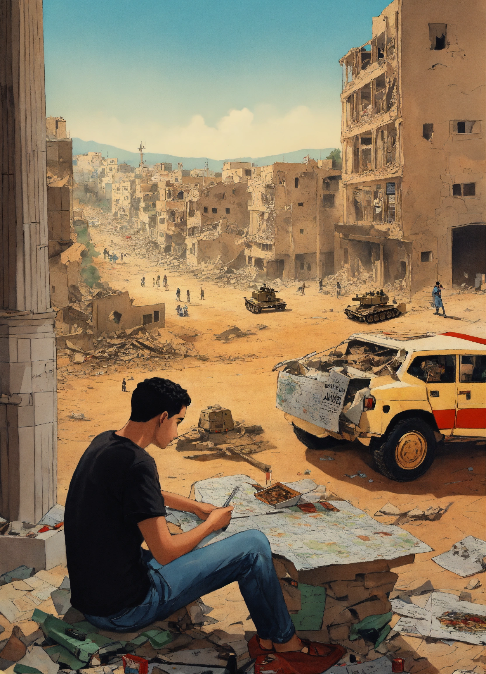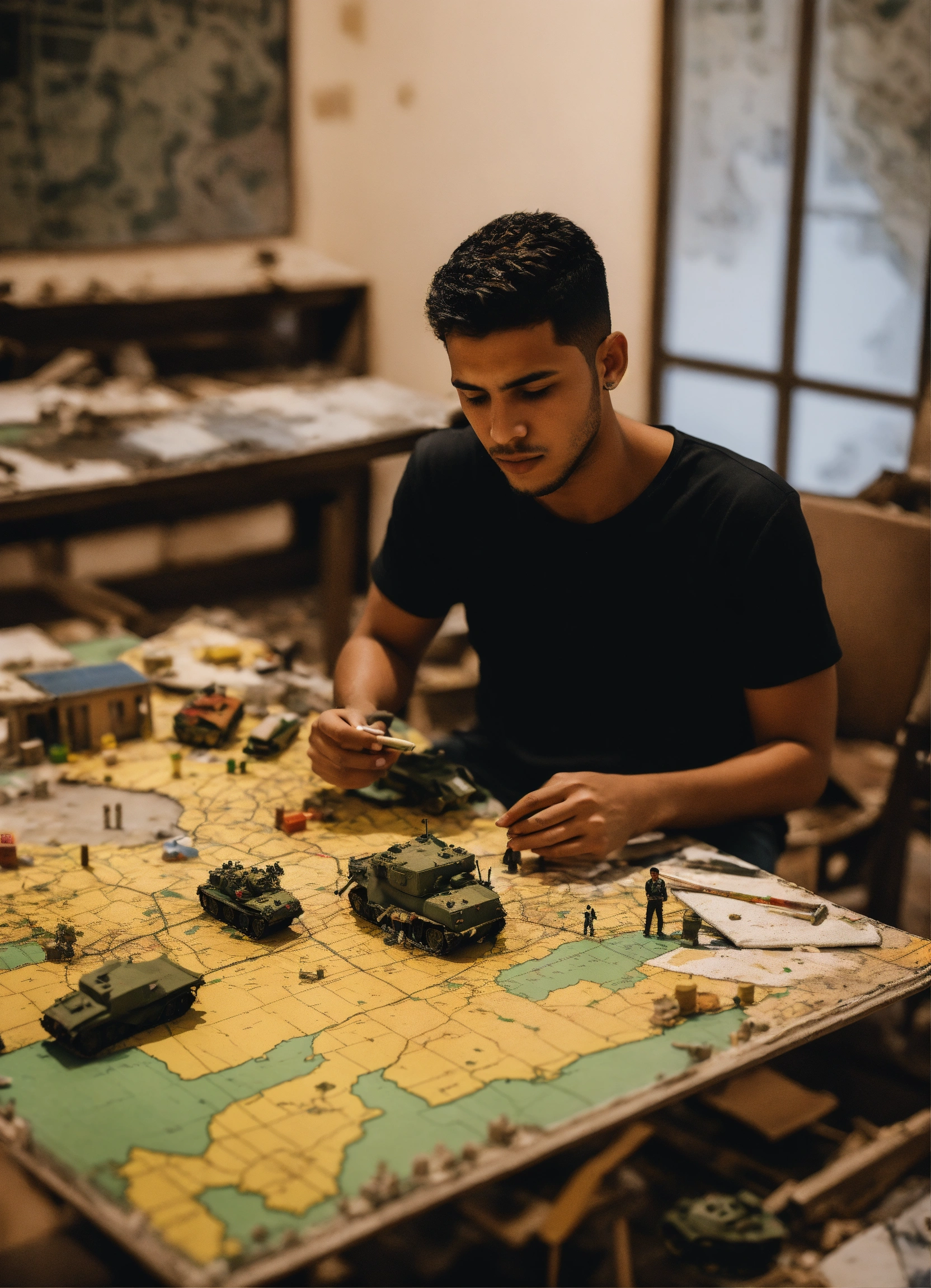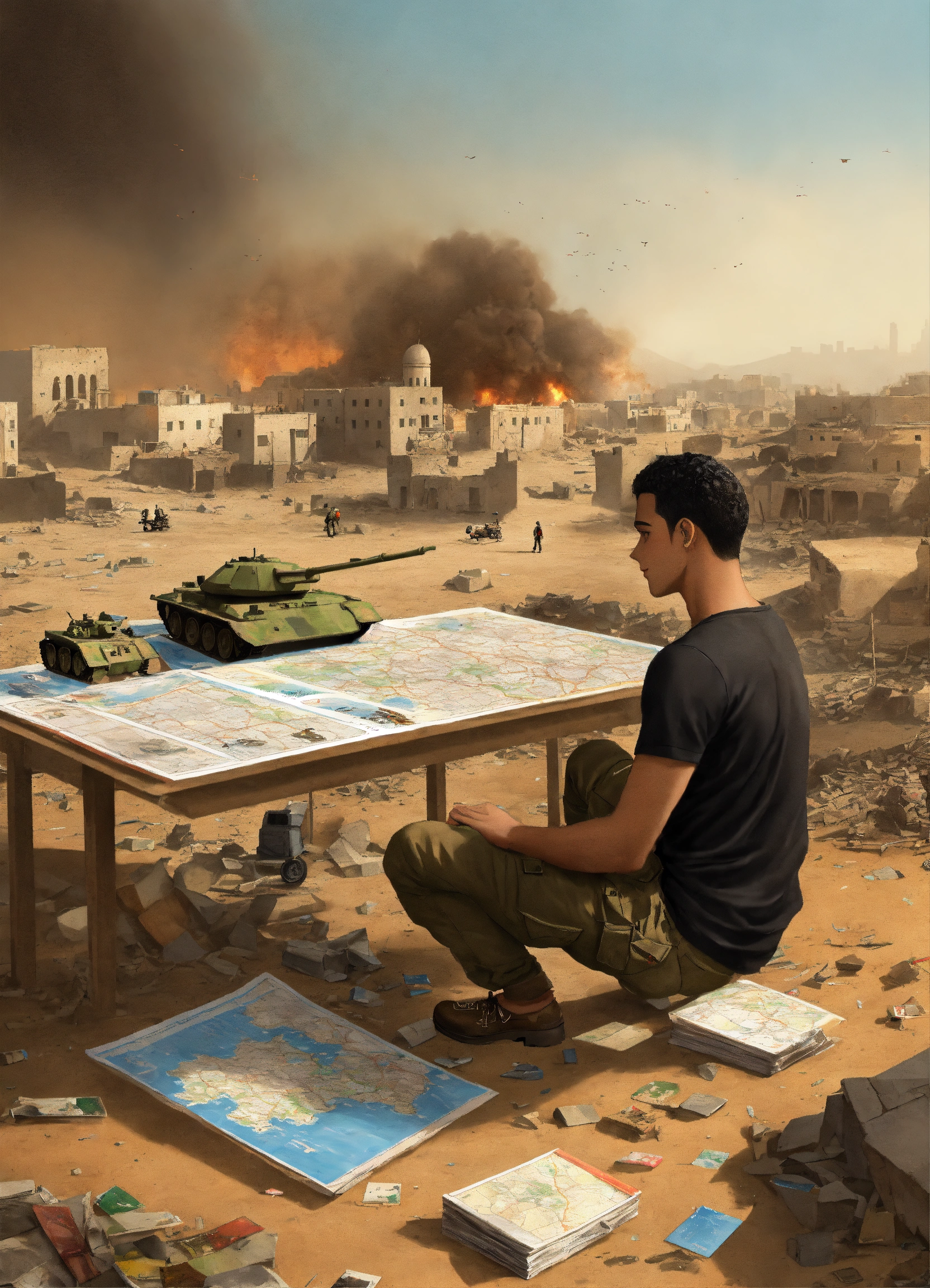 A painted canvas depicts the israeli bombardment of the palestinians in gaza. it doesn't represent any religion but rather the equality and diversity. the design showcases a young man wearing a black t-shirt with the words 'nas daily' on it. in the background, he sits at a table planning, with a large map in front of him. the map displays mockups of collapsed buildings, fires, models of tanks, soldiers, and military vehicles resembling toy pieces scattered across the map.