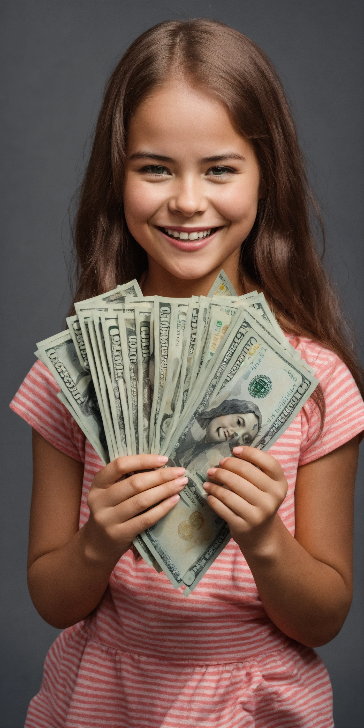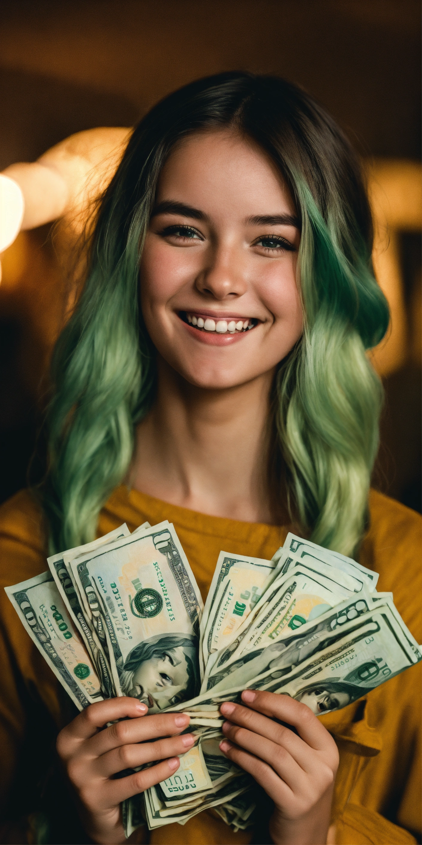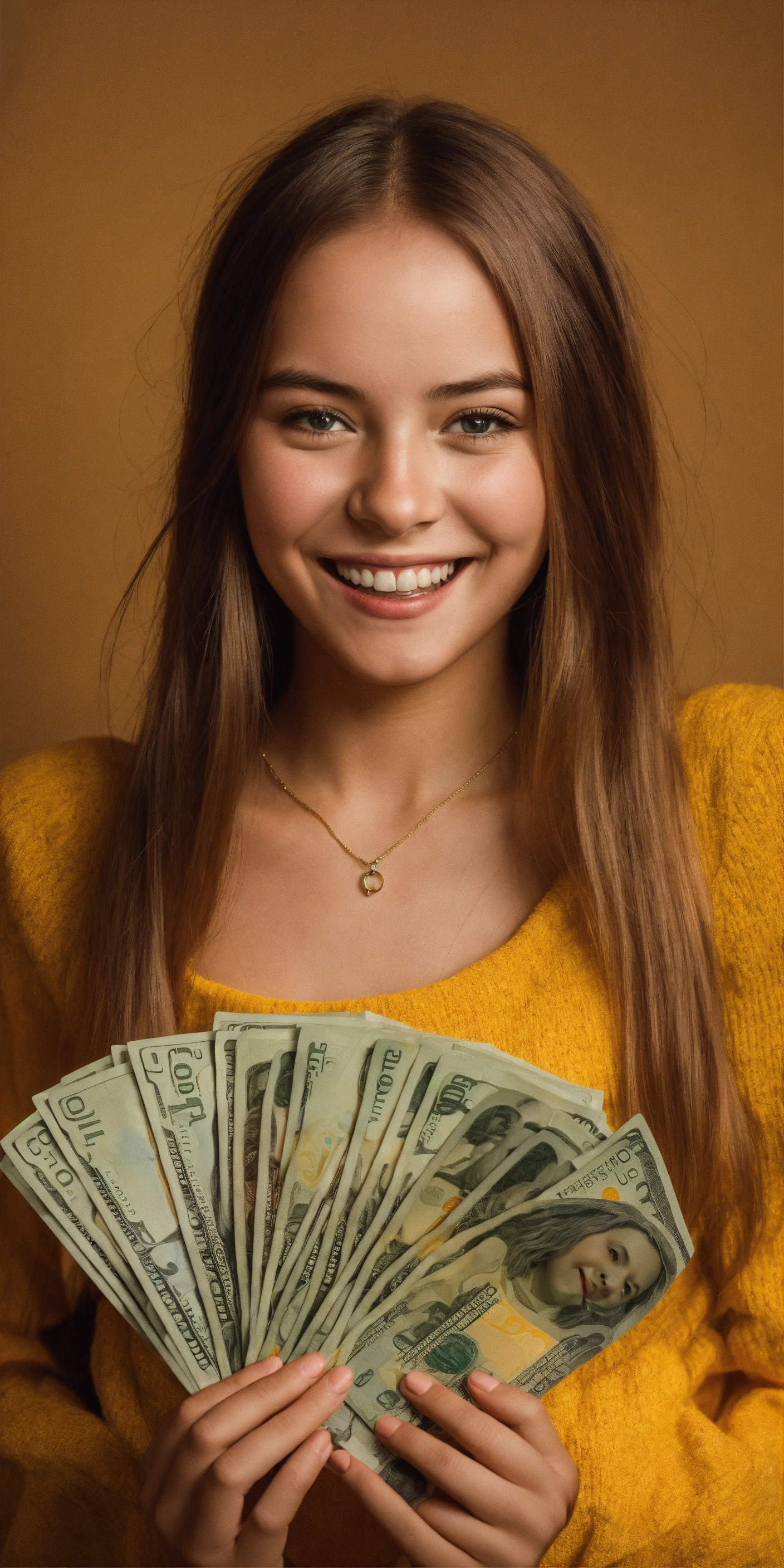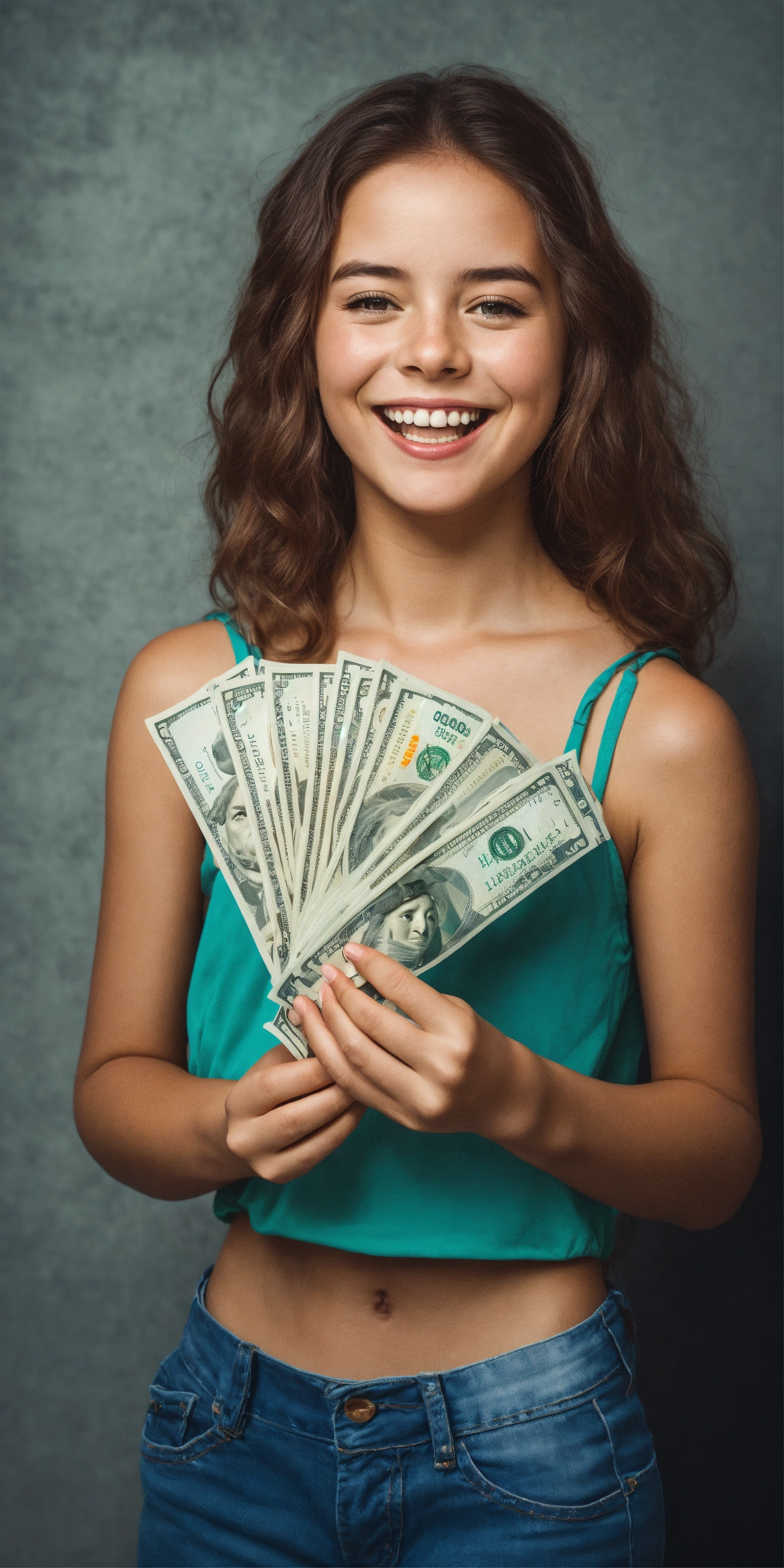 A giggling girl with a bunch of wads of dollars in her hands, girl looking at the camera, realistic photo