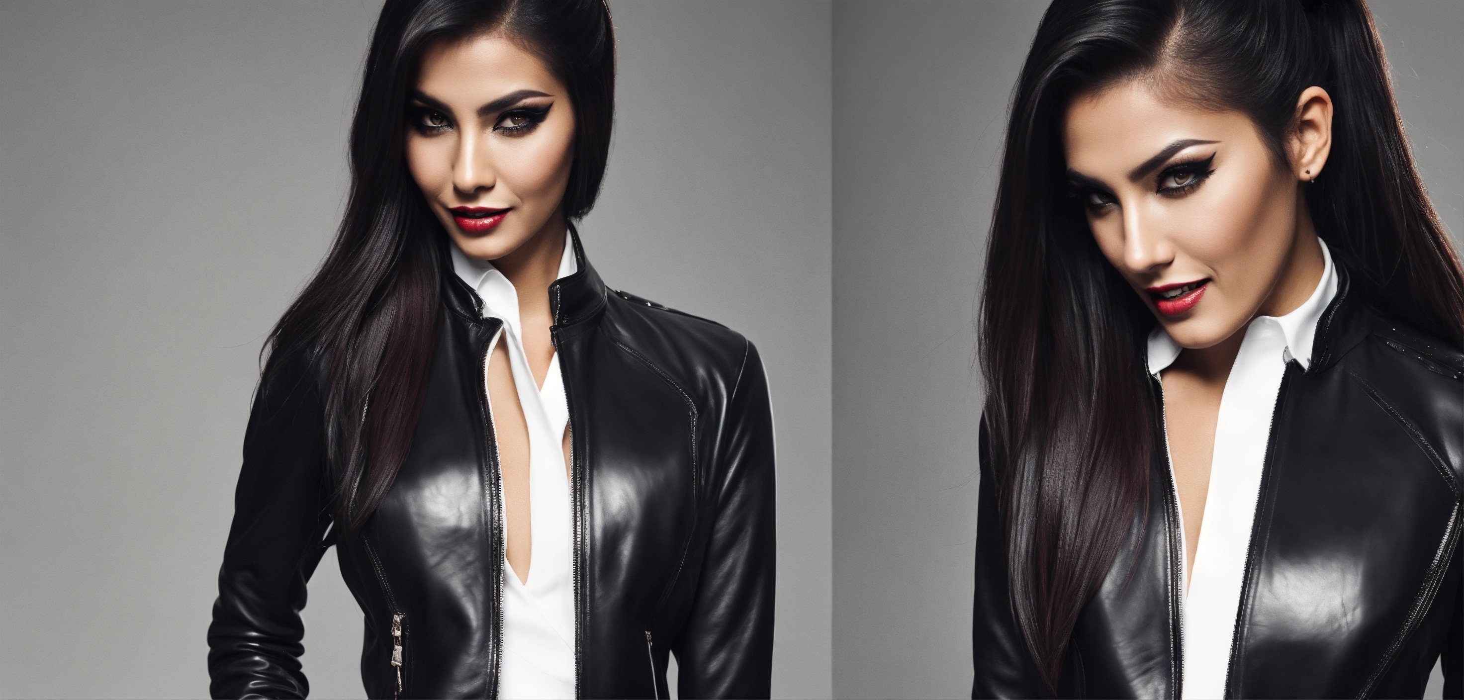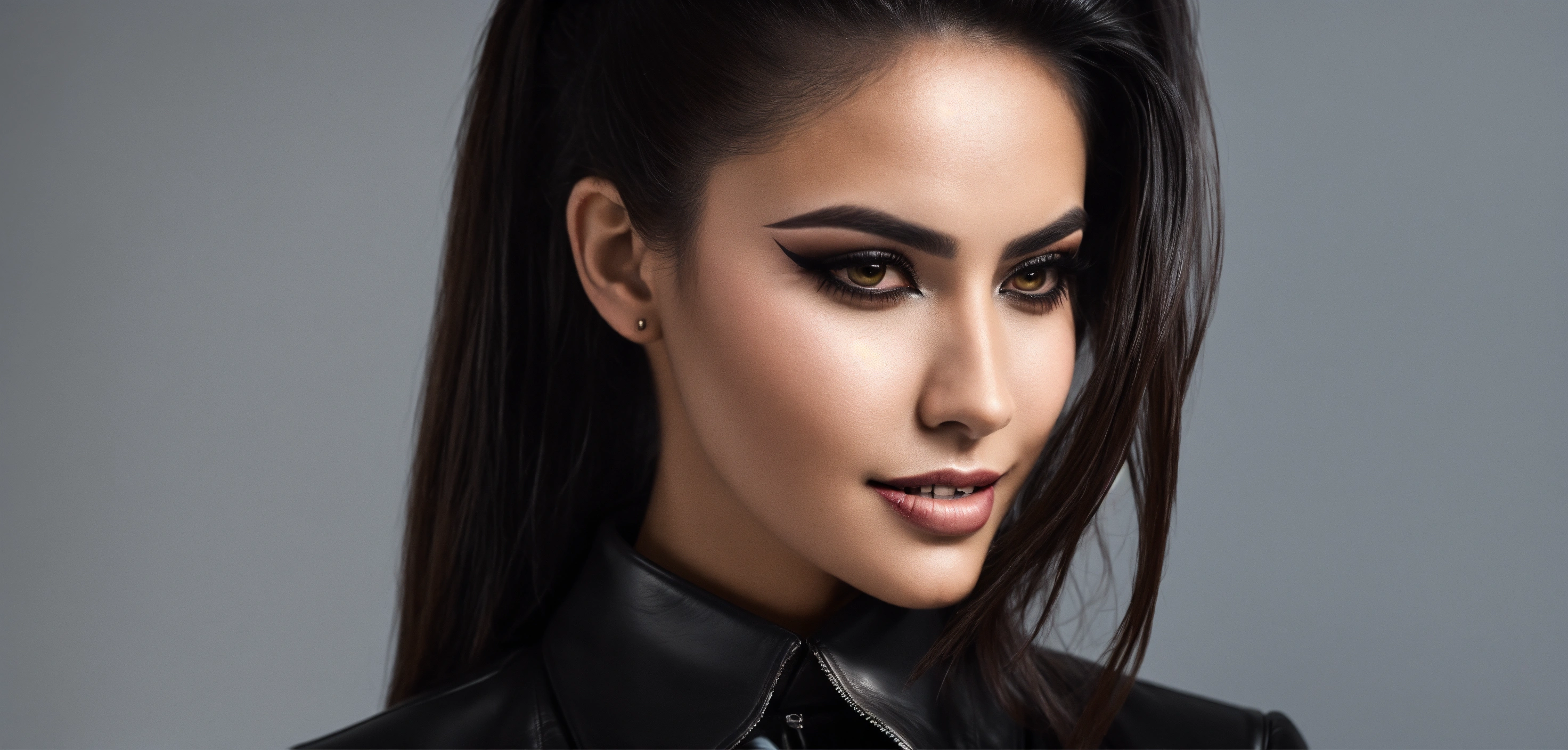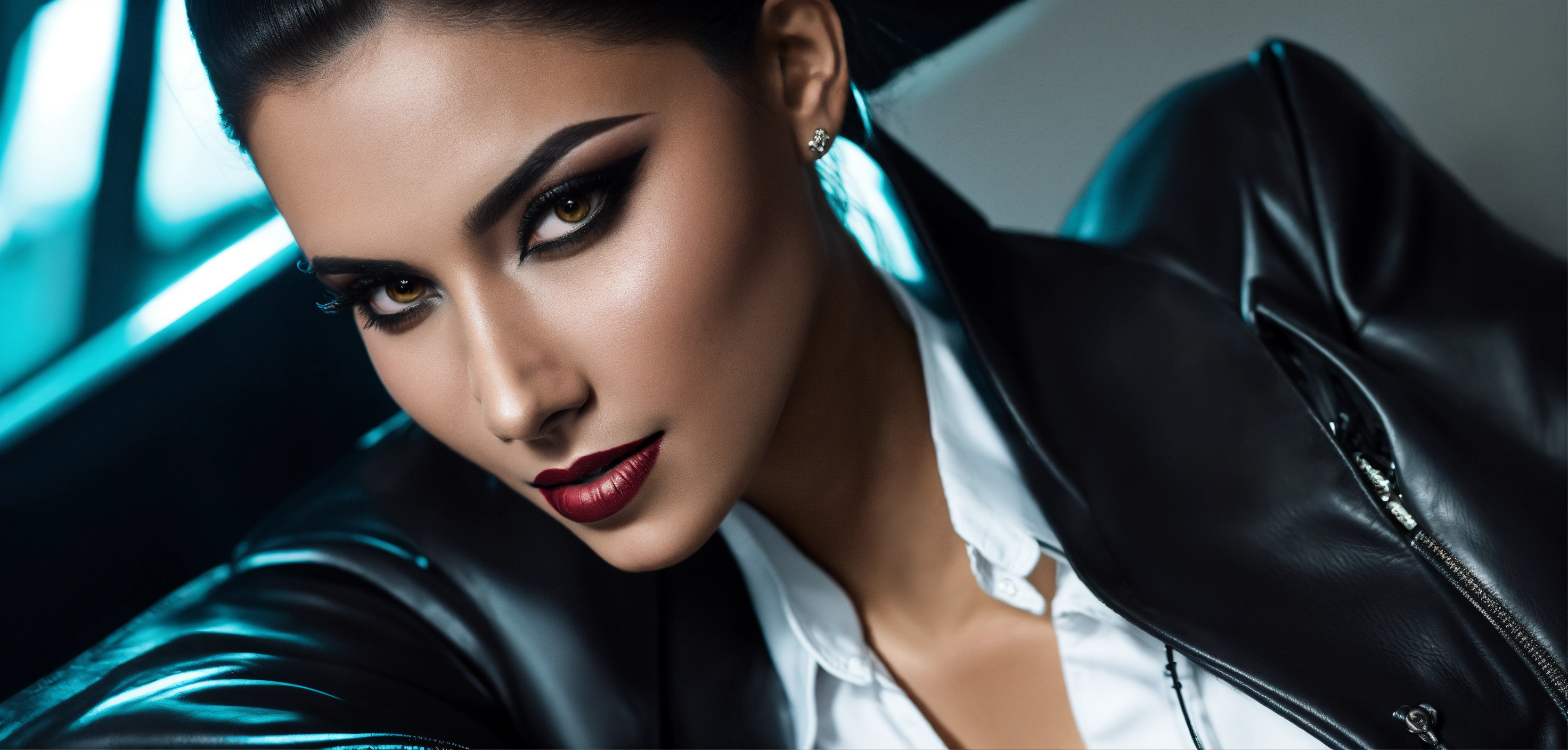 Cinematic look, stunning arab seductress woman fashion model, arrogant evil smile from above, black straight hair very high ponytail, black leather blazer jacket, white office shirt, eyeliner makeup, underworld vampire movie style, ultra-realistic; solid white background; no background