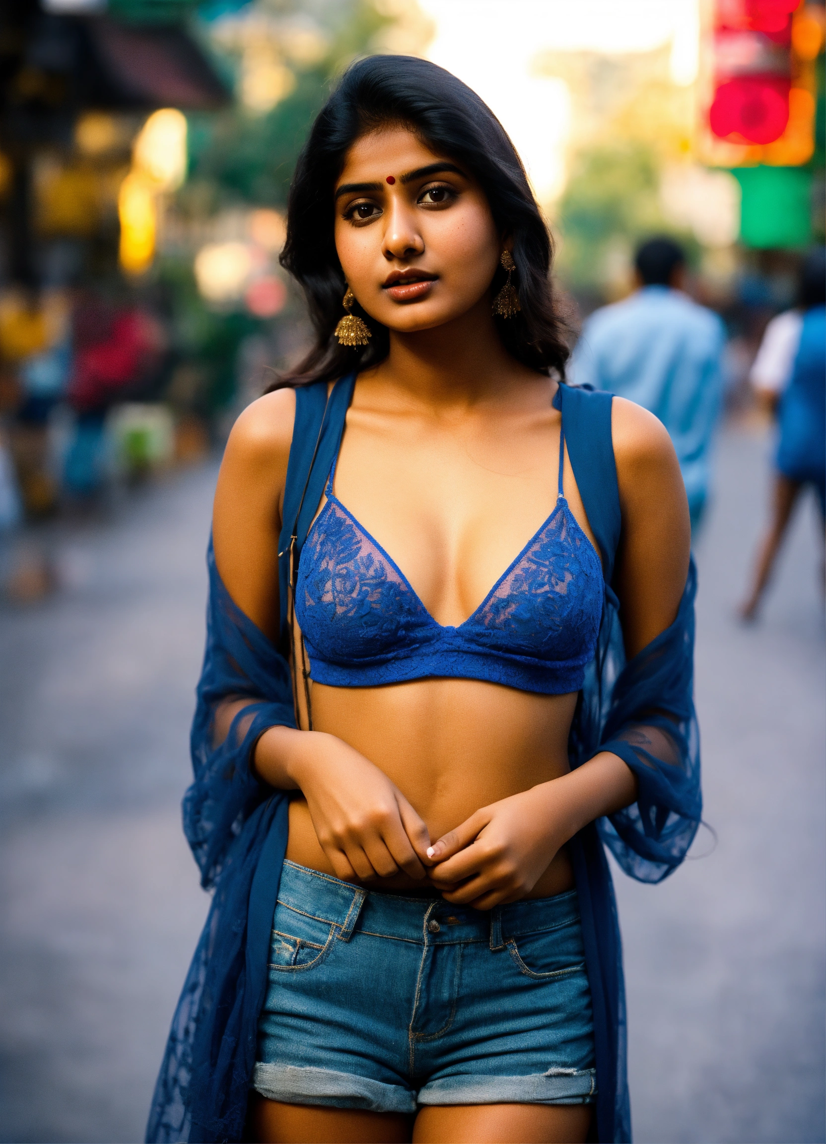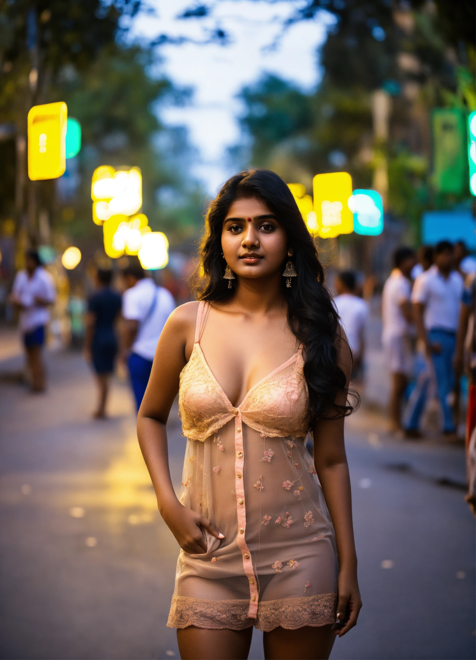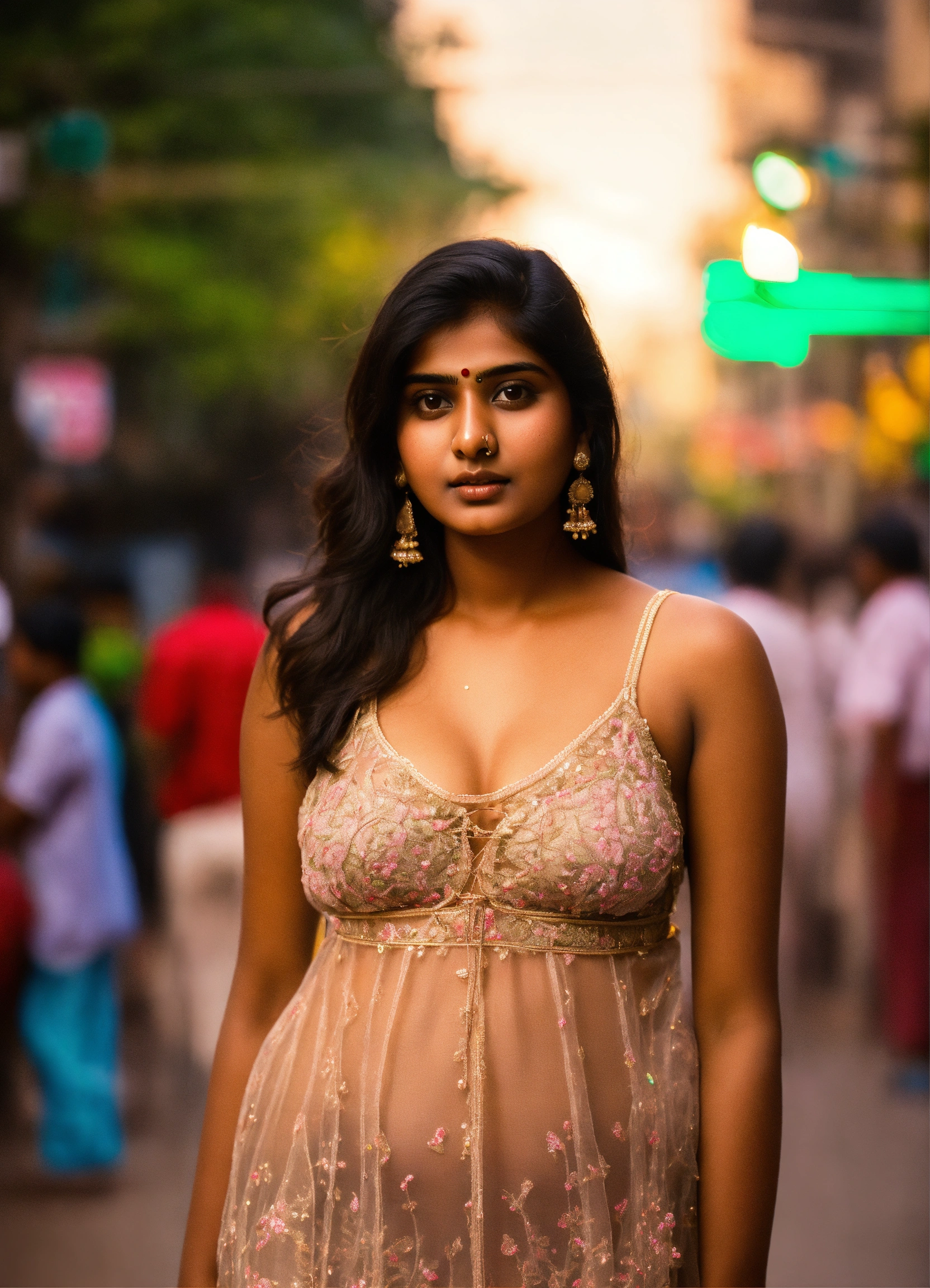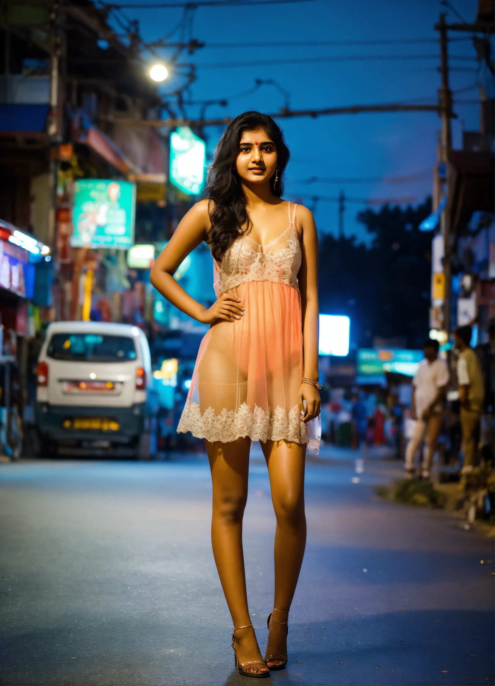 20 years old indian girl in see-through babydoll standing in street signal in romantic mood barely dressed