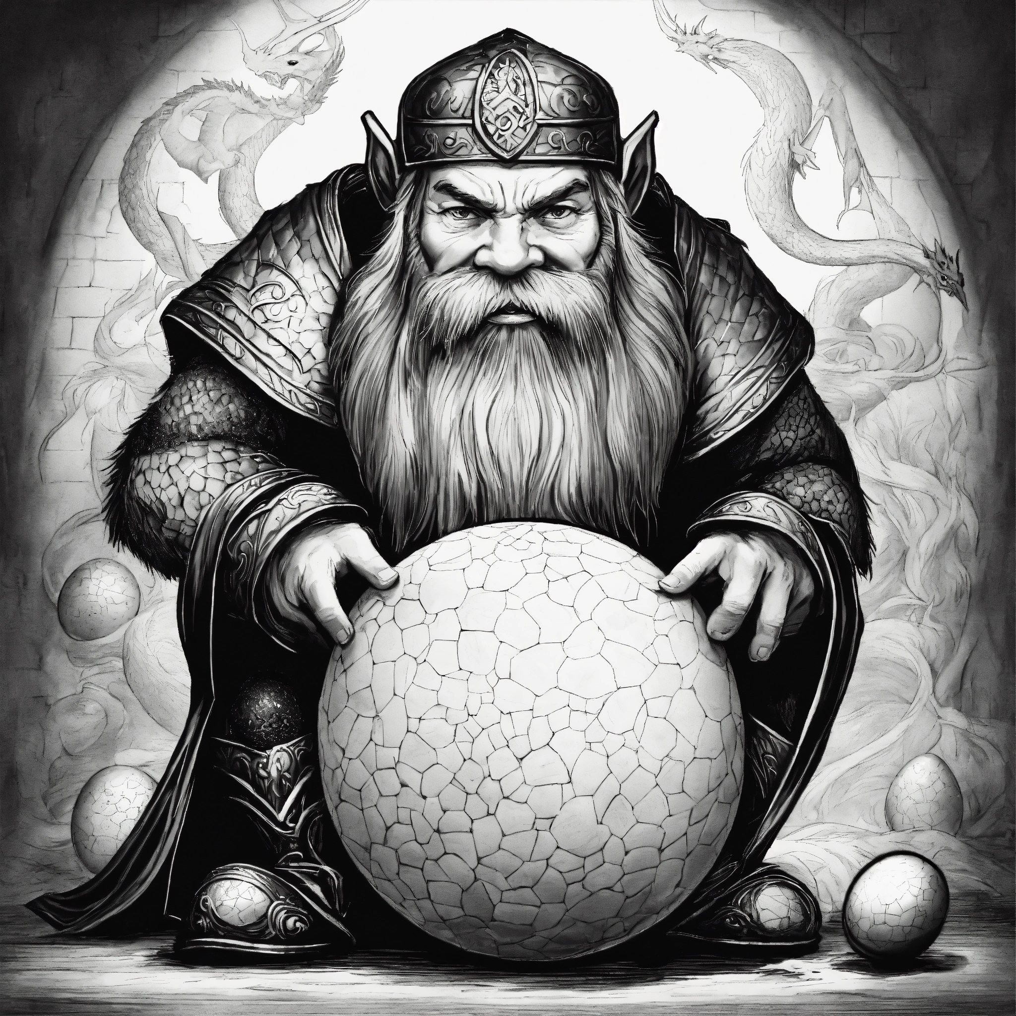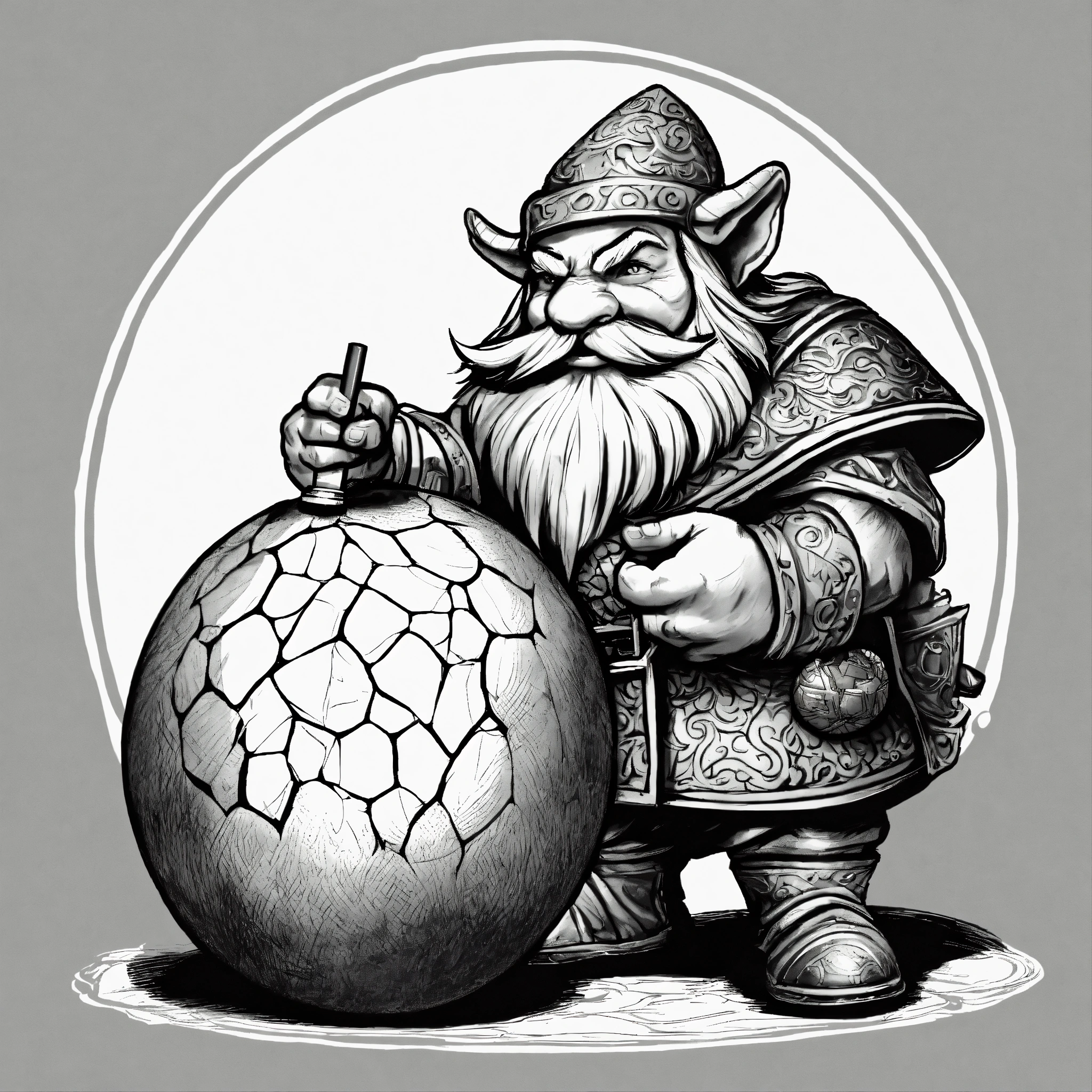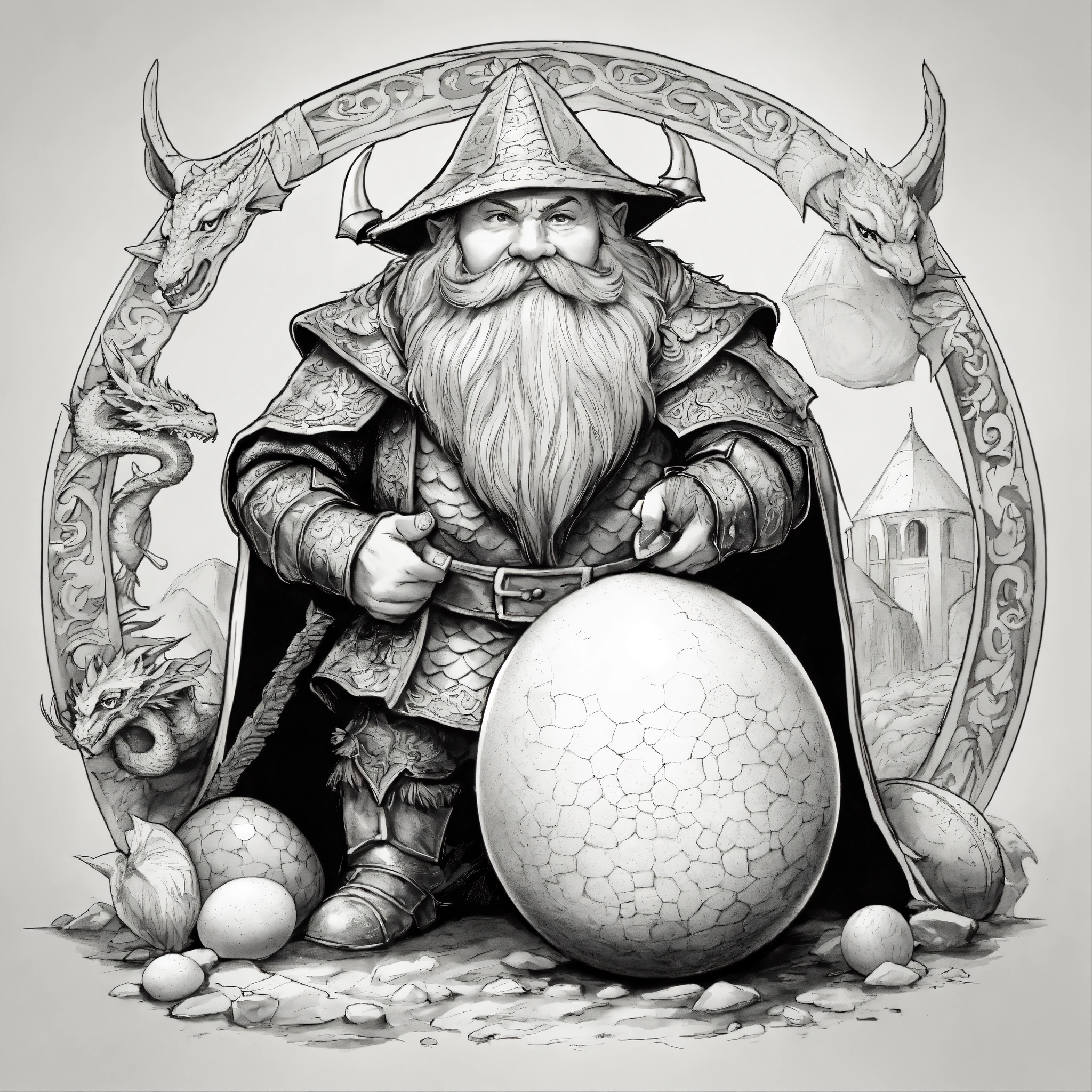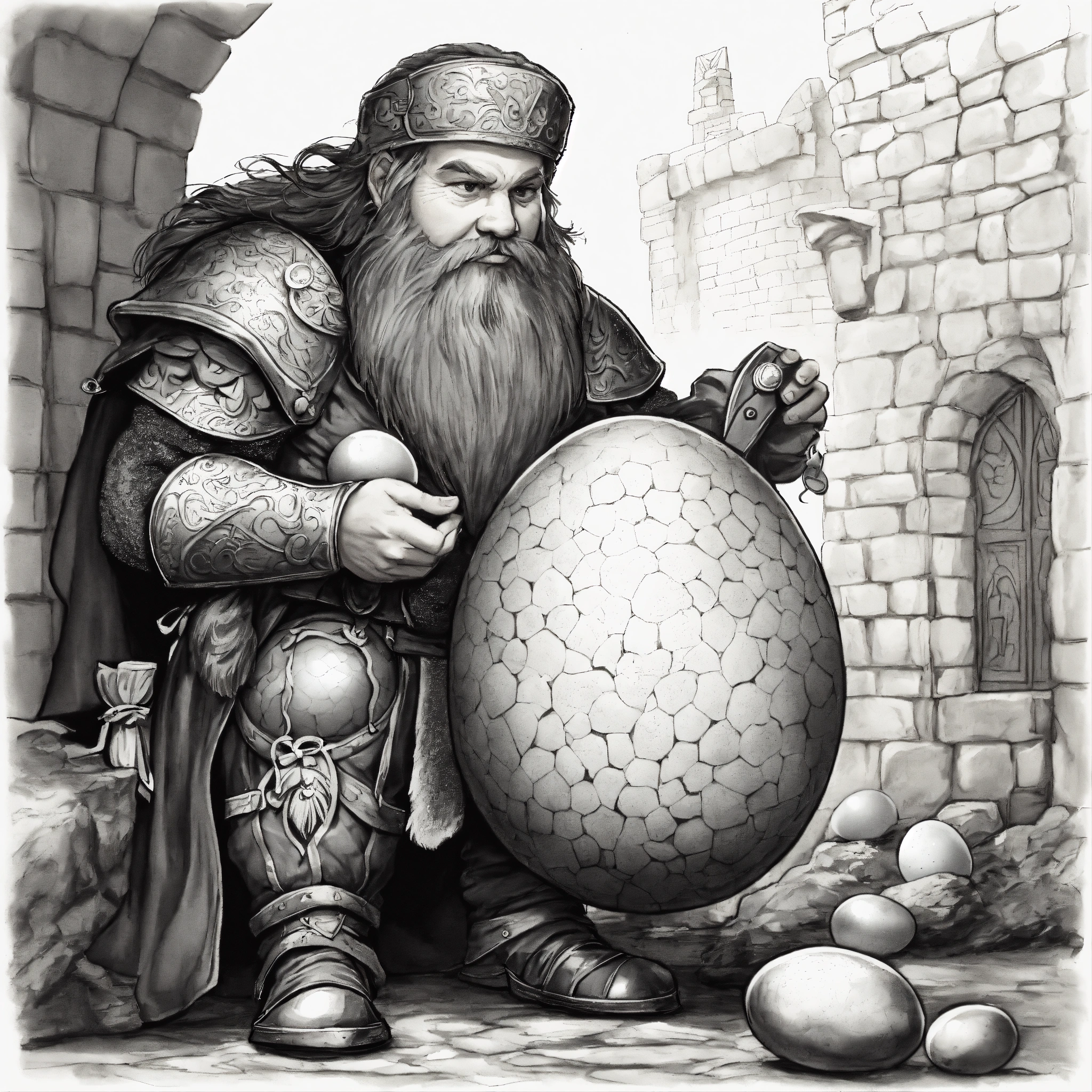 Draw funny dwarf with a dragon's egg in his hand fantastic medieval, the drawing is in black and white with a plain background