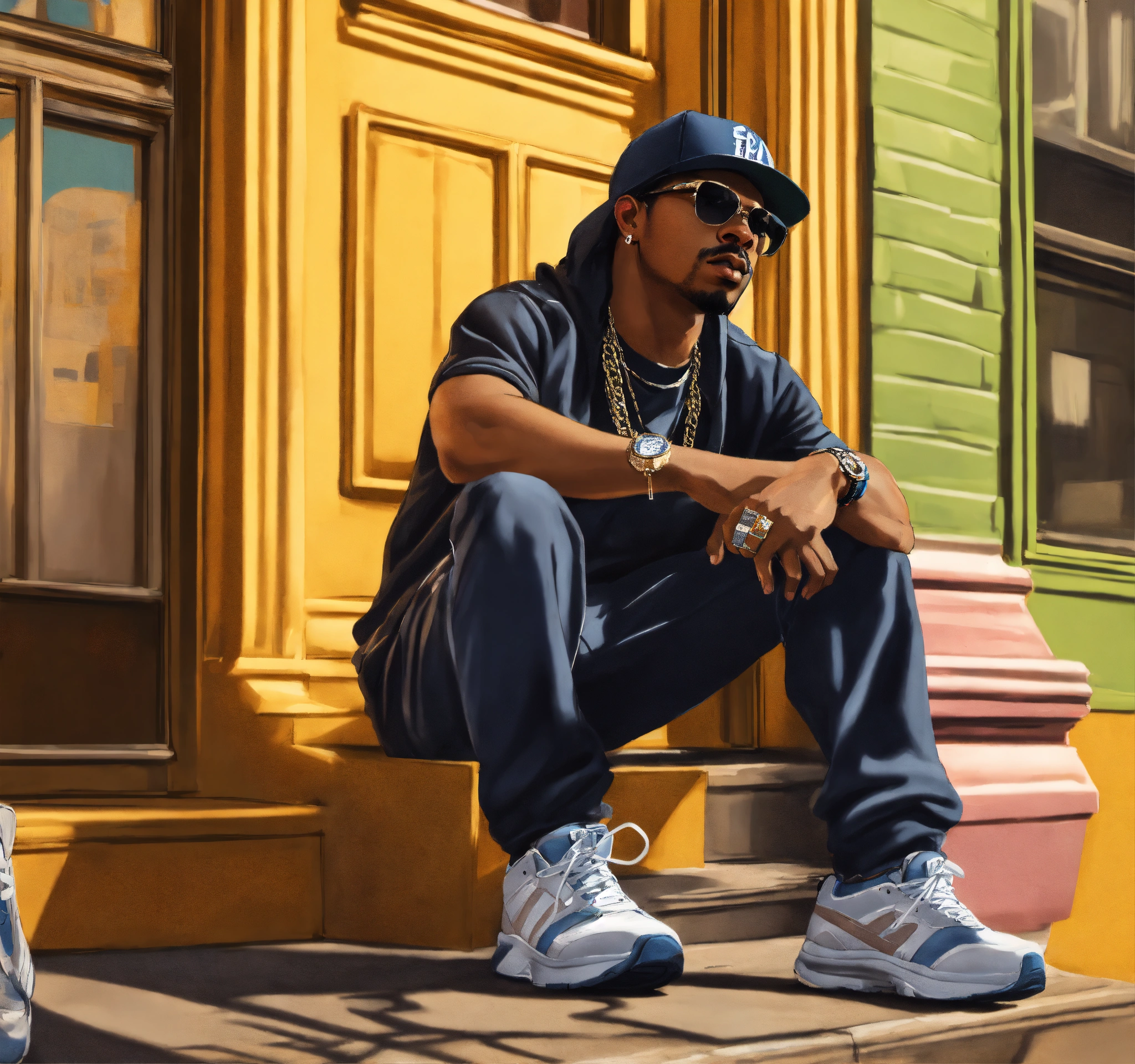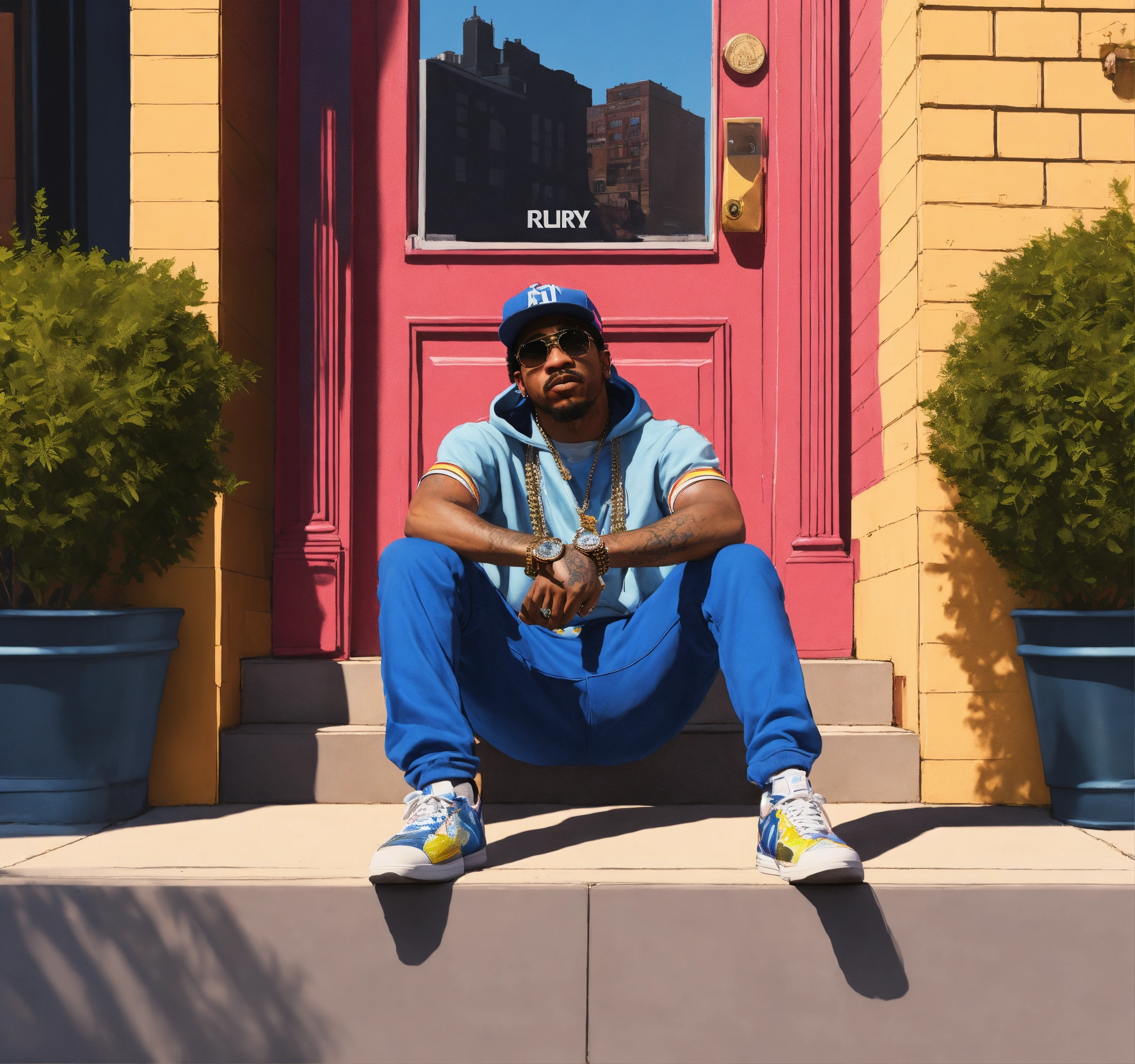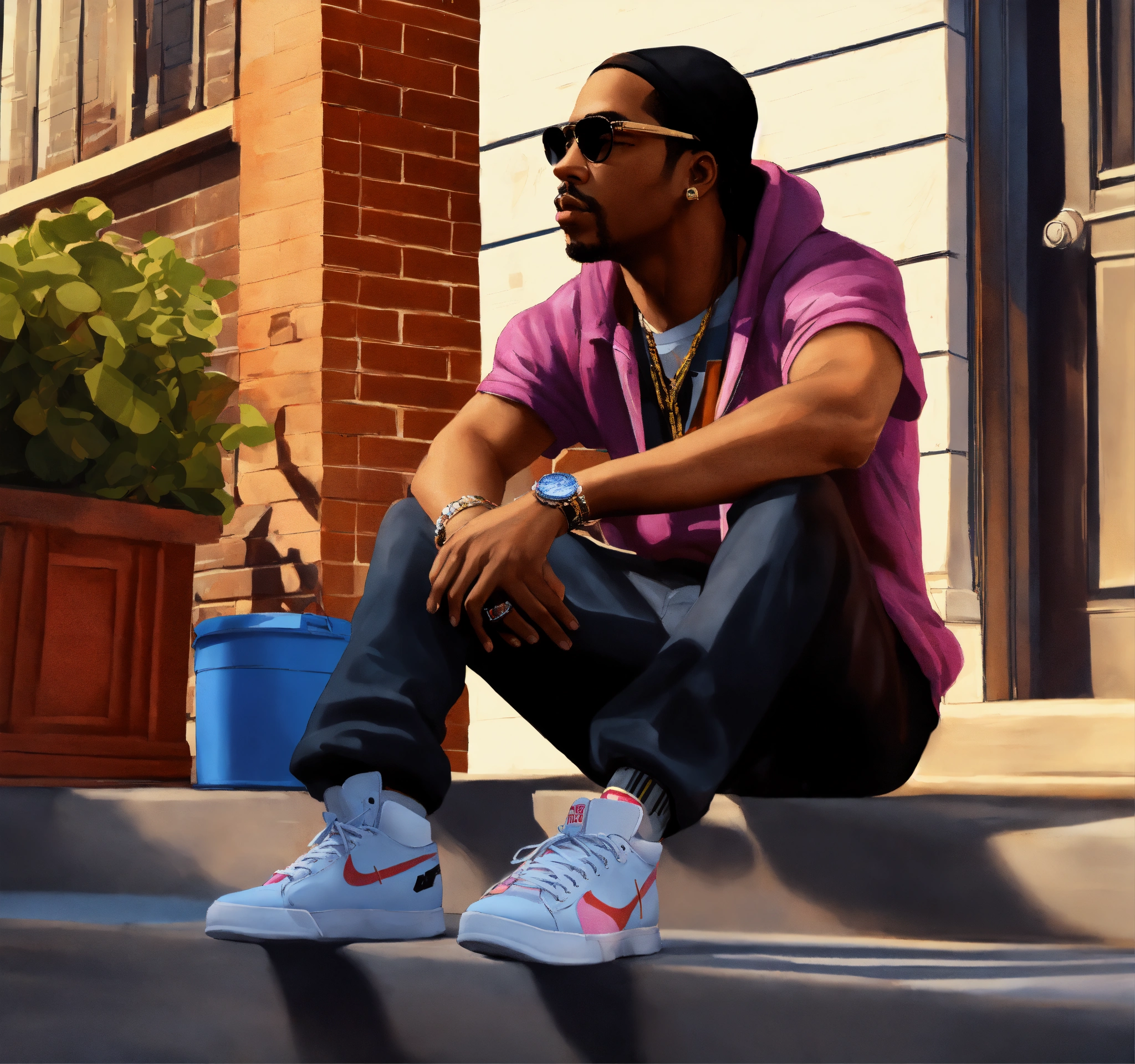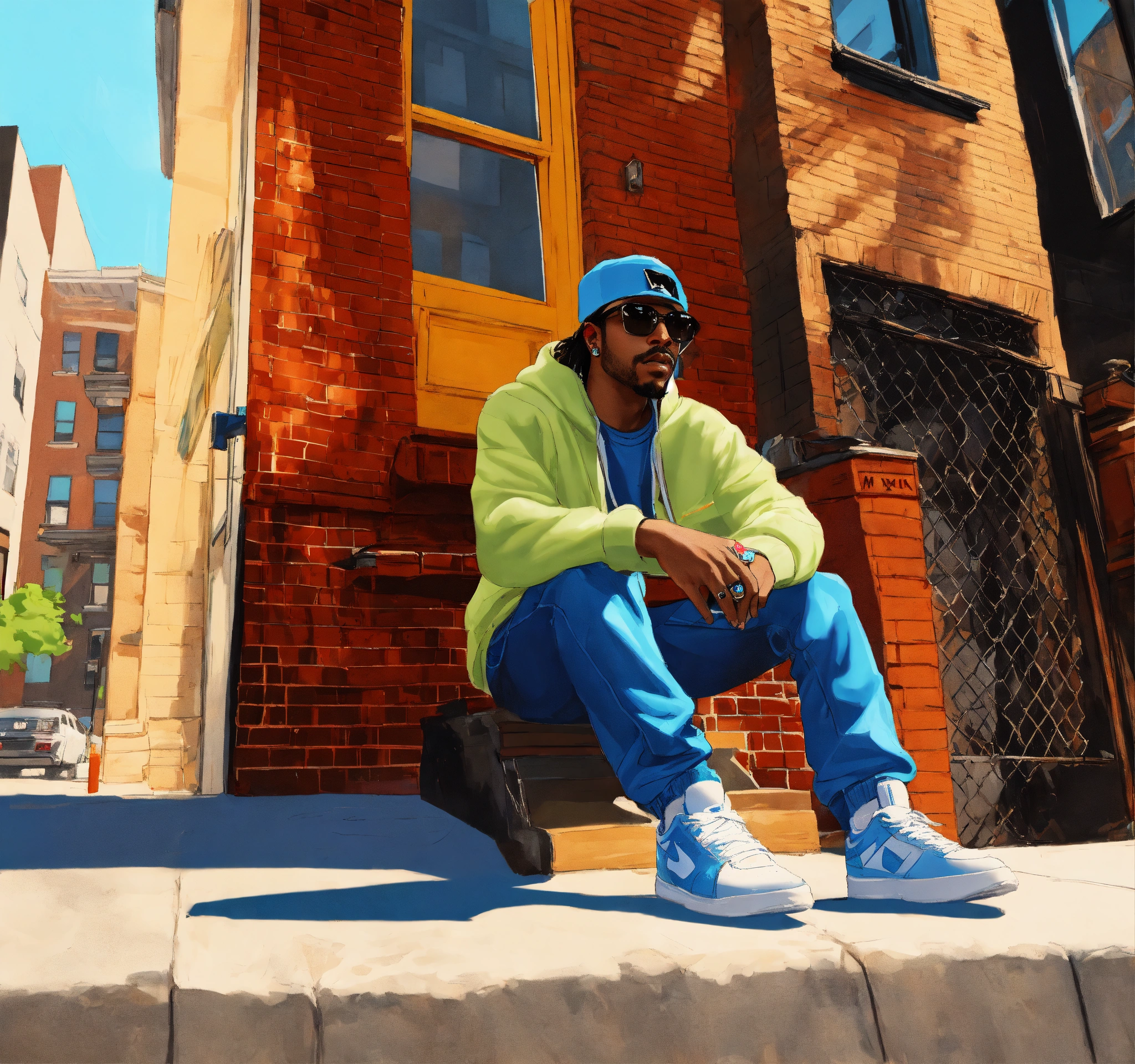Medium side angle shot pop art, hyperrealist full body portrait of black rapper " max b" sitting on a stoop in a sunny street in harlem, new york, on a sunny day, fantasy art, photo realistic, dynamic lighting, artstation, poster, volumetric lighting, very detailed faces, 4 k, award winning