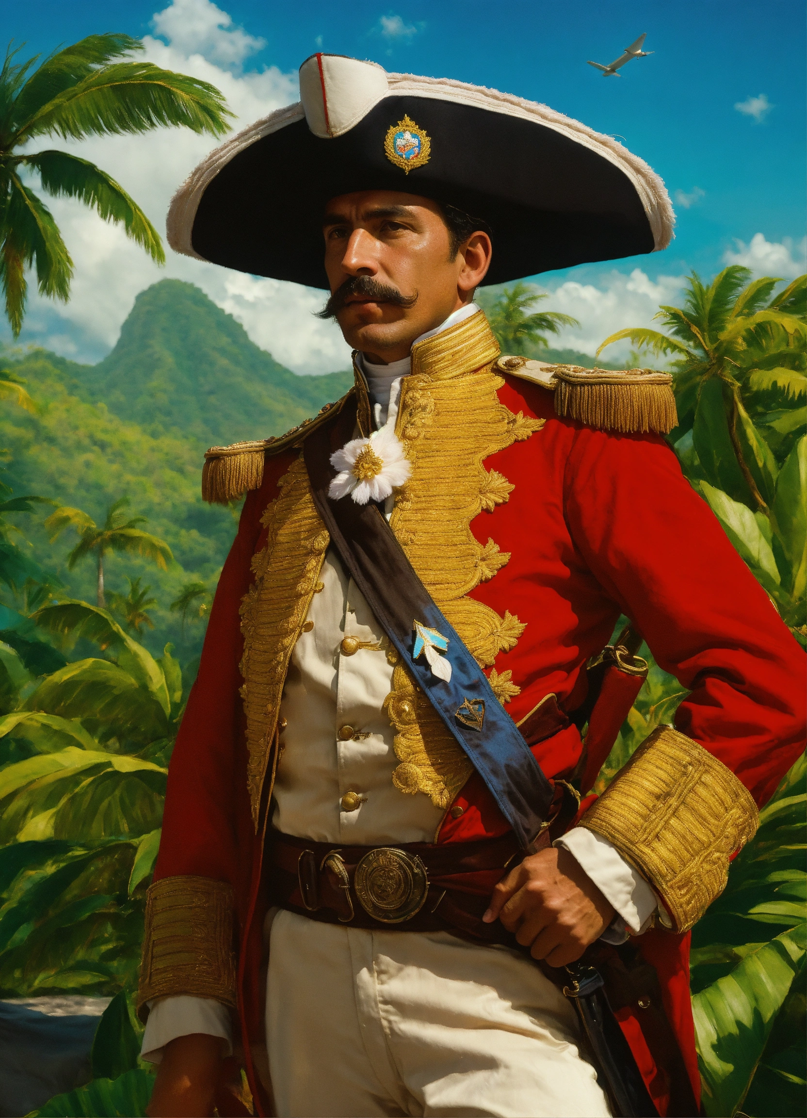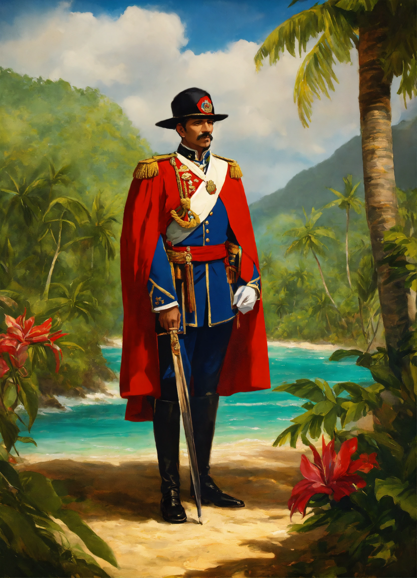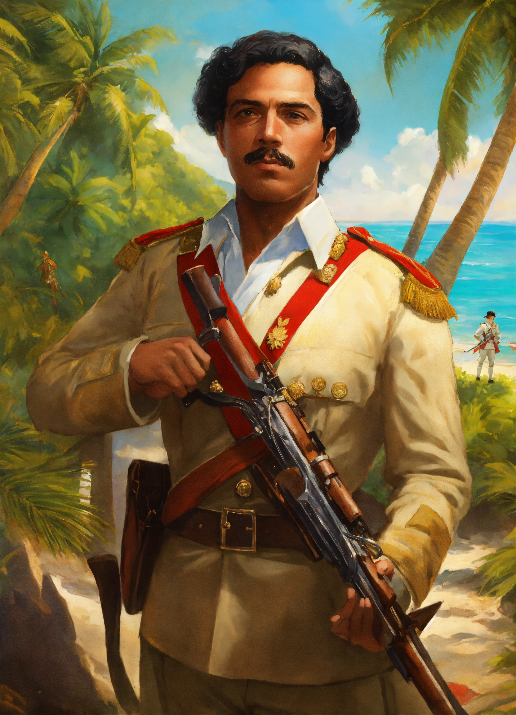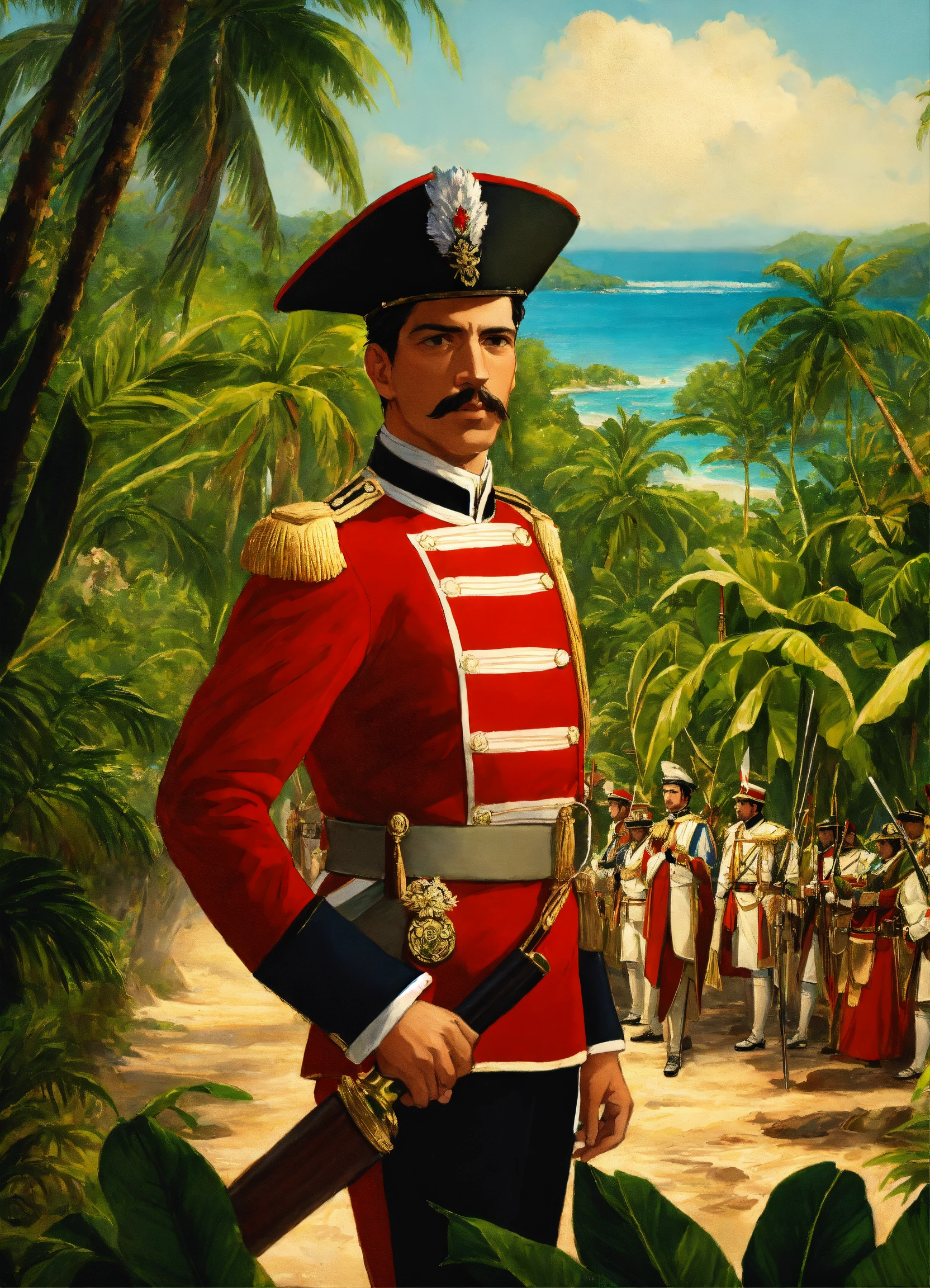 Visualize juan pablo duarte, a revered dominican national hero, leading a determined army in the midst of a tropical paradise. picture the lush greenery, pristine beaches, and crystal-clear waters as the backdrop to this momentous scene. duarte, dressed in historic attire, stands at the forefront of his troops, a symbol of leadership and patriotism. with unwavering determination, he directs his army in the pursuit of dominican independence, under the radiant sun and against the backdrop of the breathtaking tropical landscape.