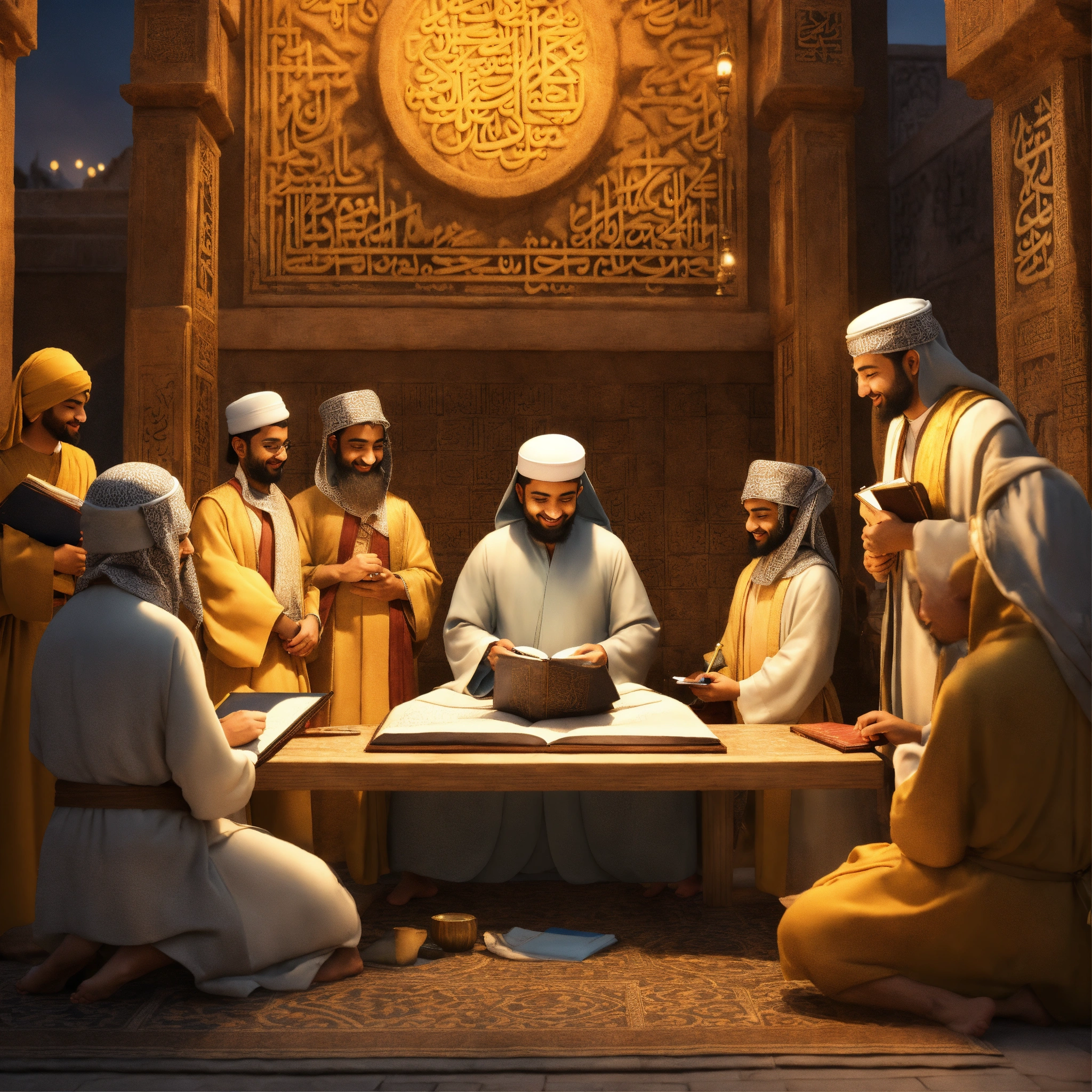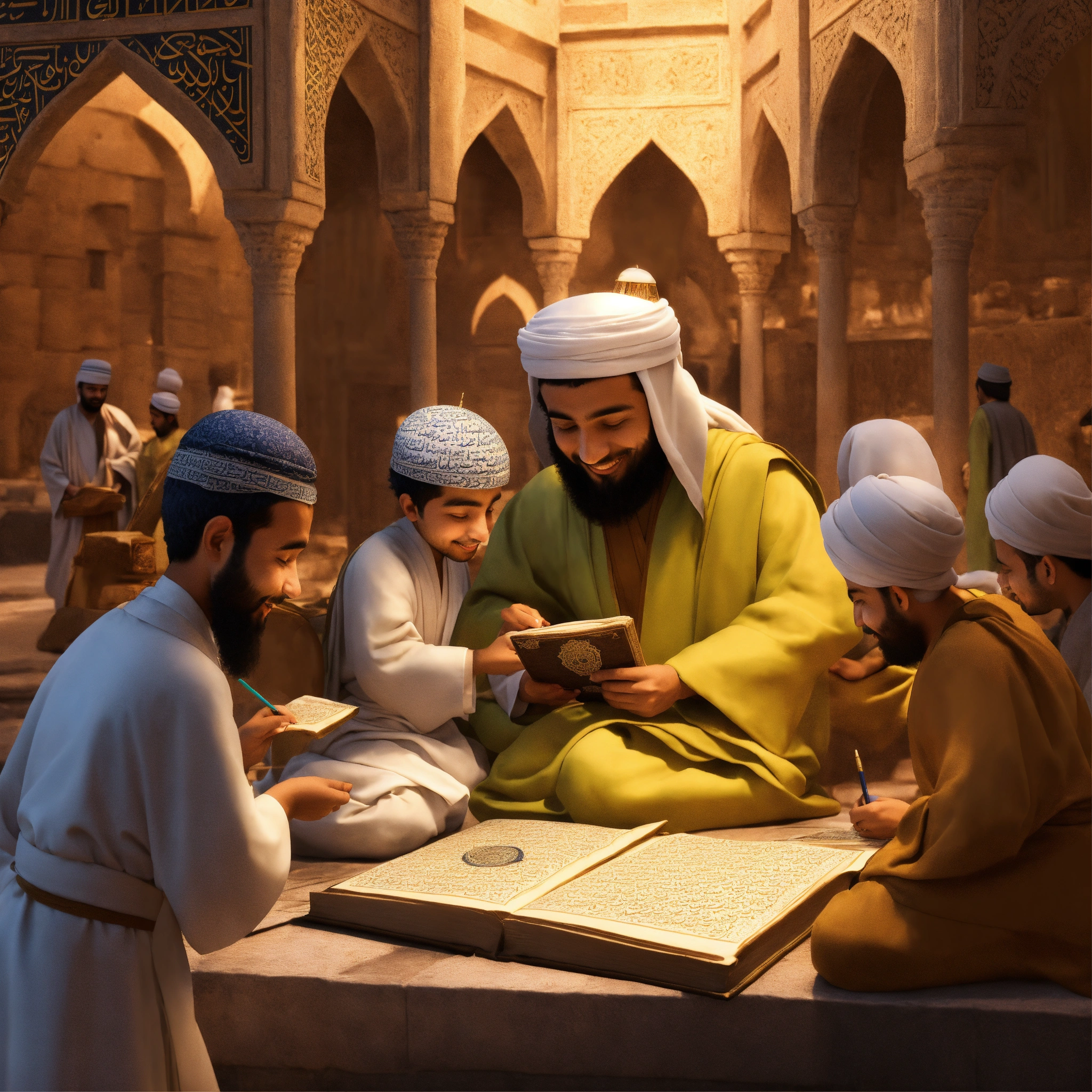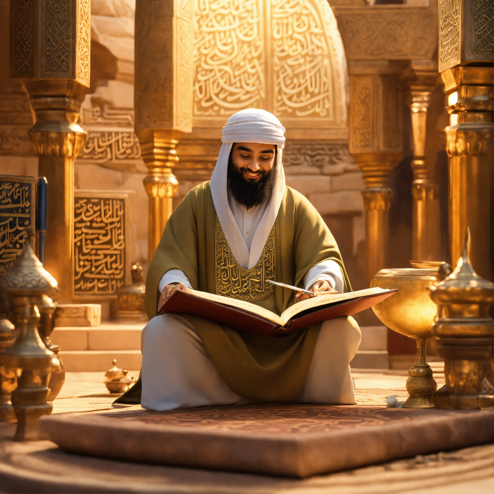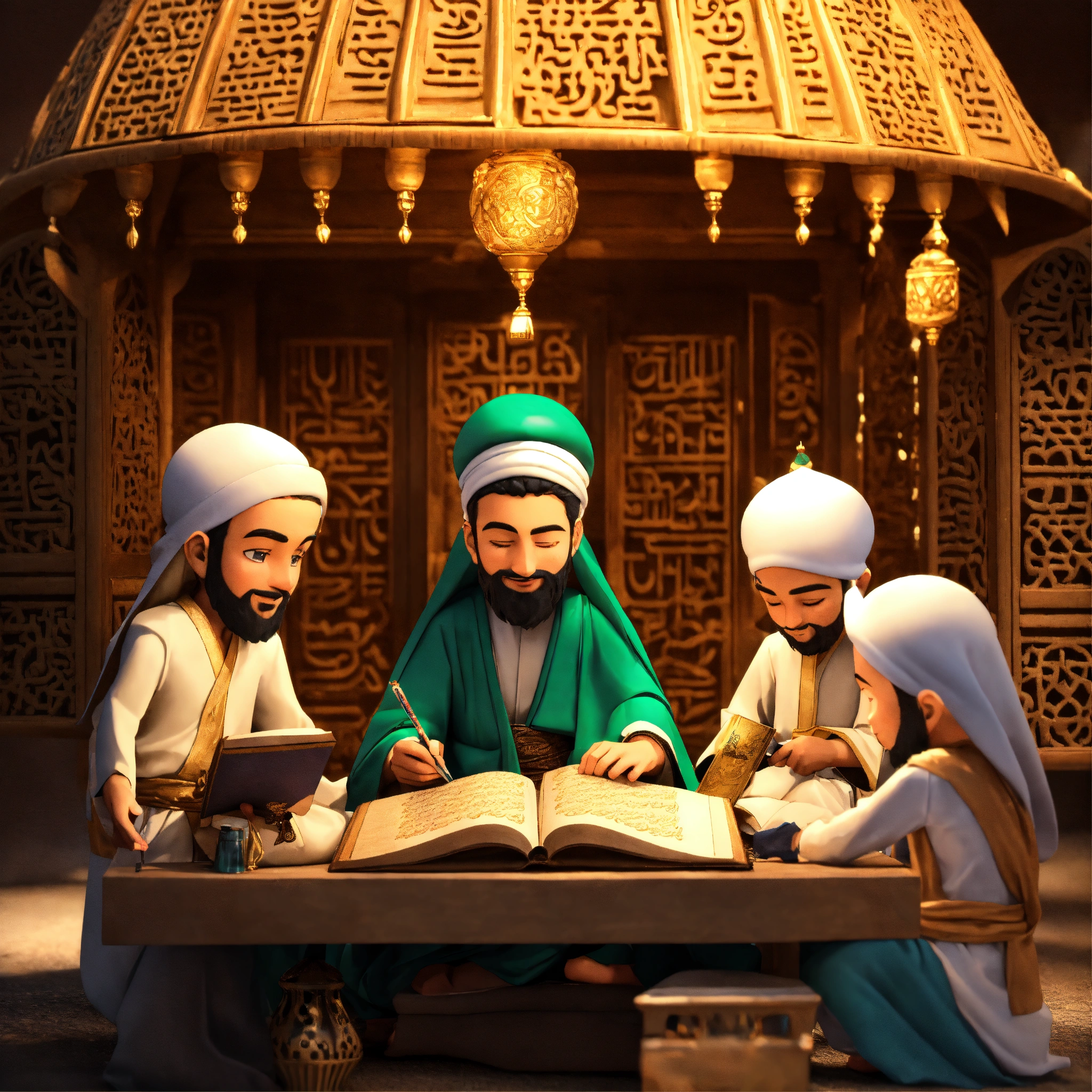 3d mascot of the childhood islamic hero, zaid bin thabit, a friend of the prophet, a translator, compiler of the koran. seen writing a copy of the koran using ancient ink, wearing a robe, and smile. he was surrounded by other companions of the prophet in the city of medina