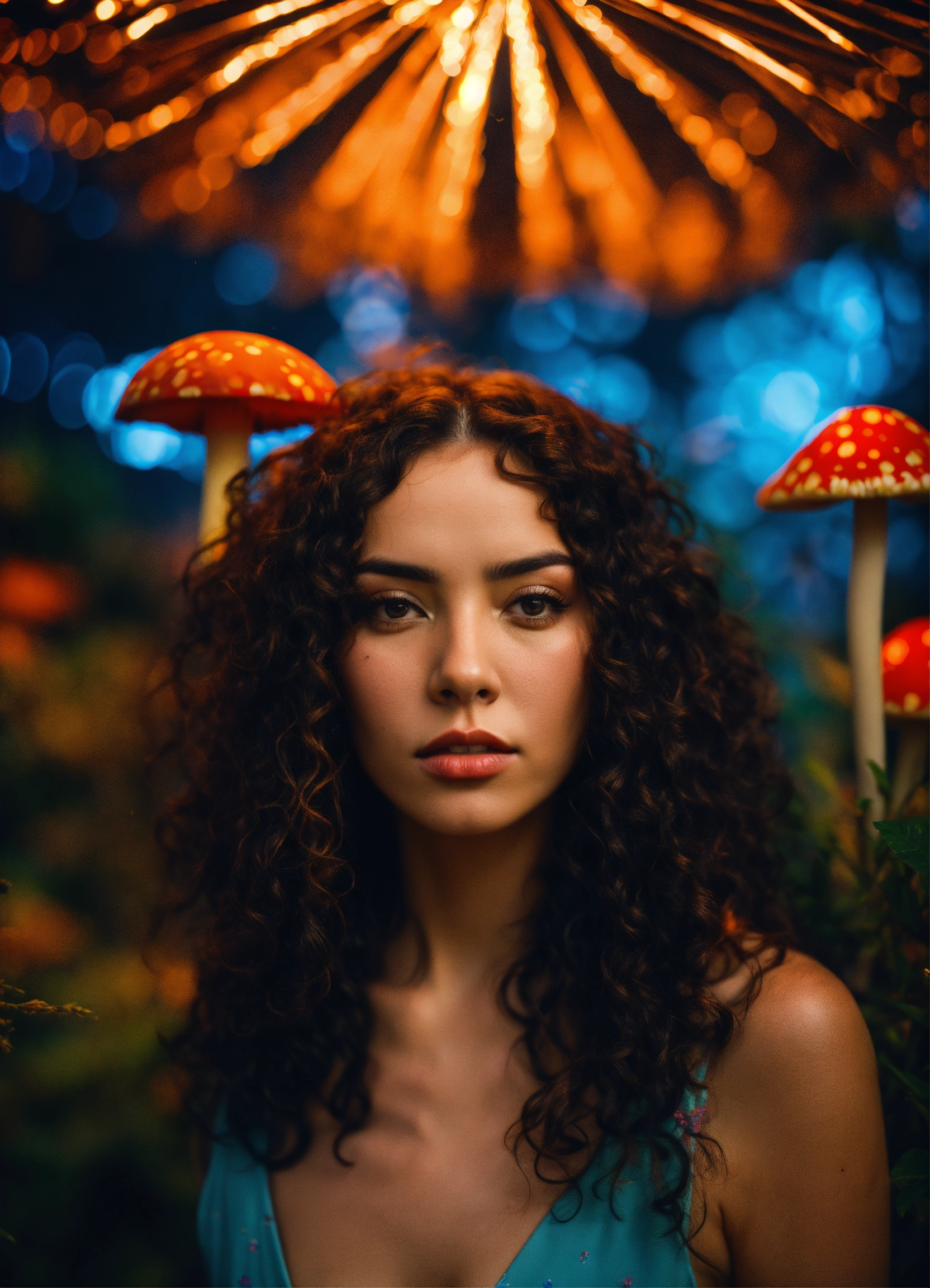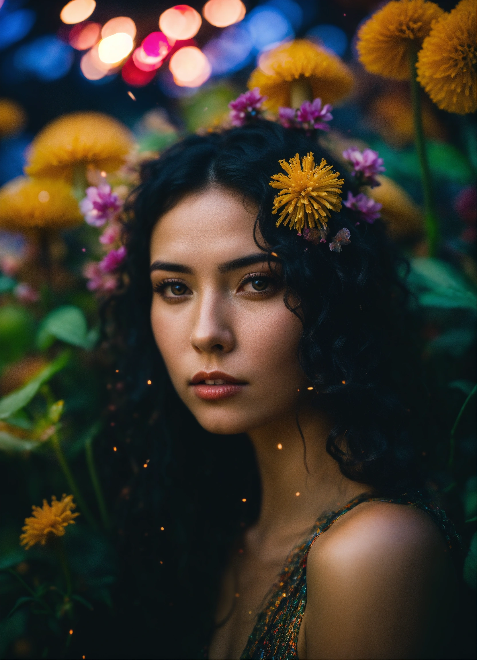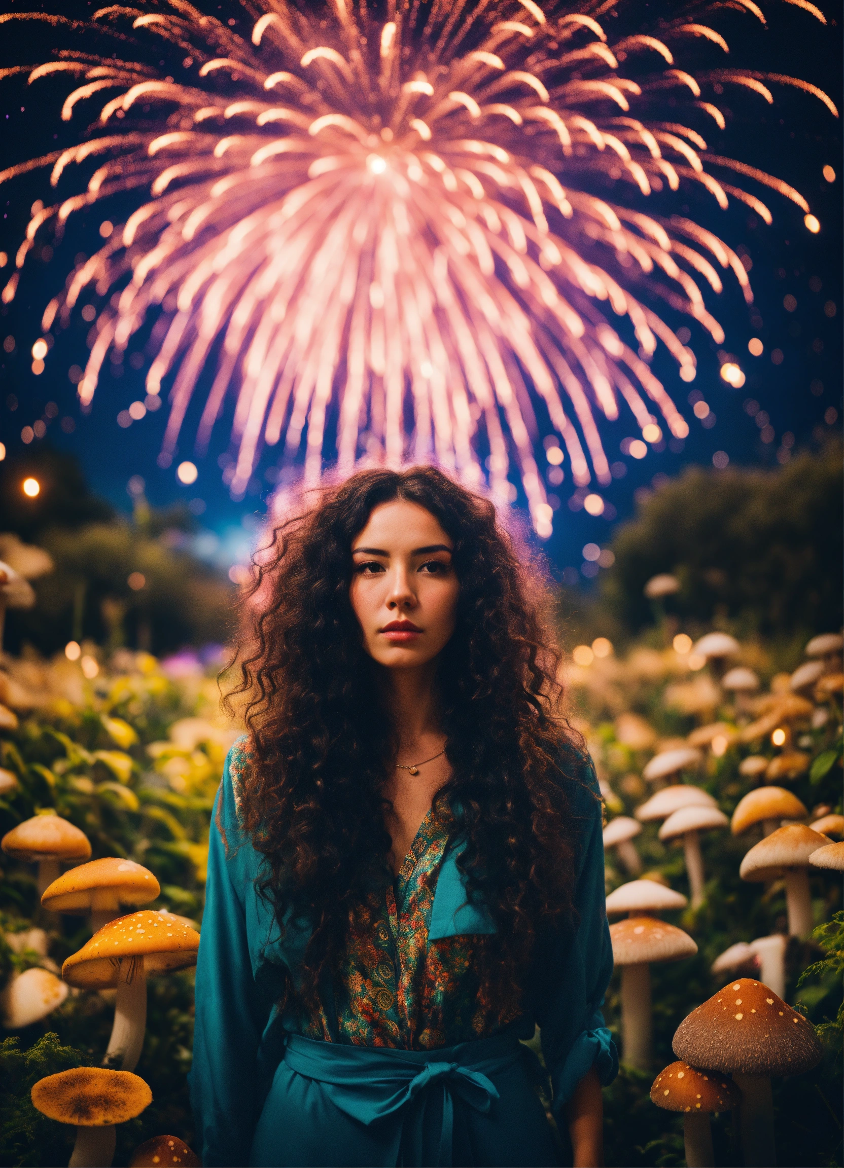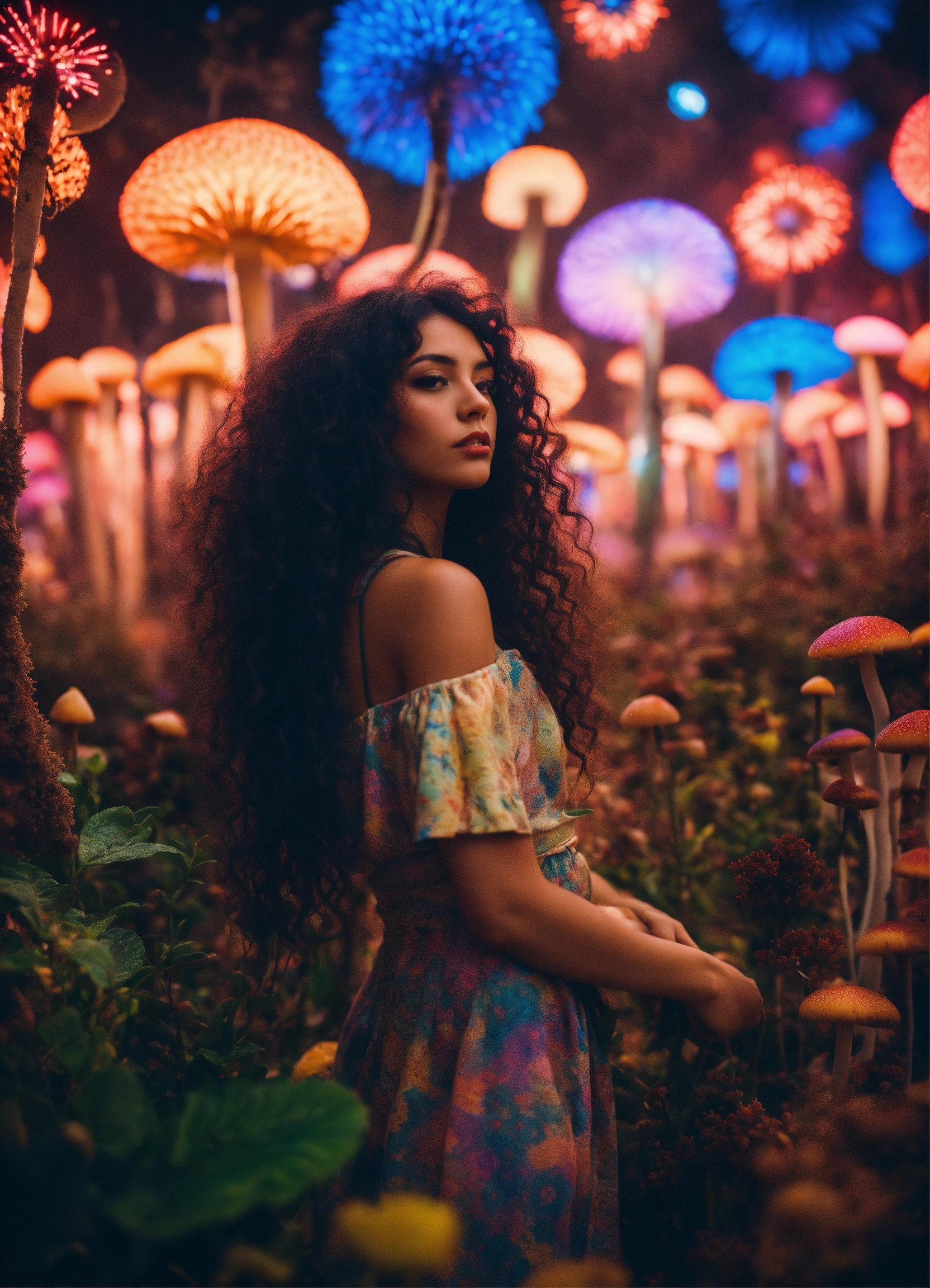 Sad stunning woman with long curly dark hair, on a psychedelic, utopic universe, exotics plants, flowers, mushrooms, film grain, wide angle shot, nikon d5600, firework on the background