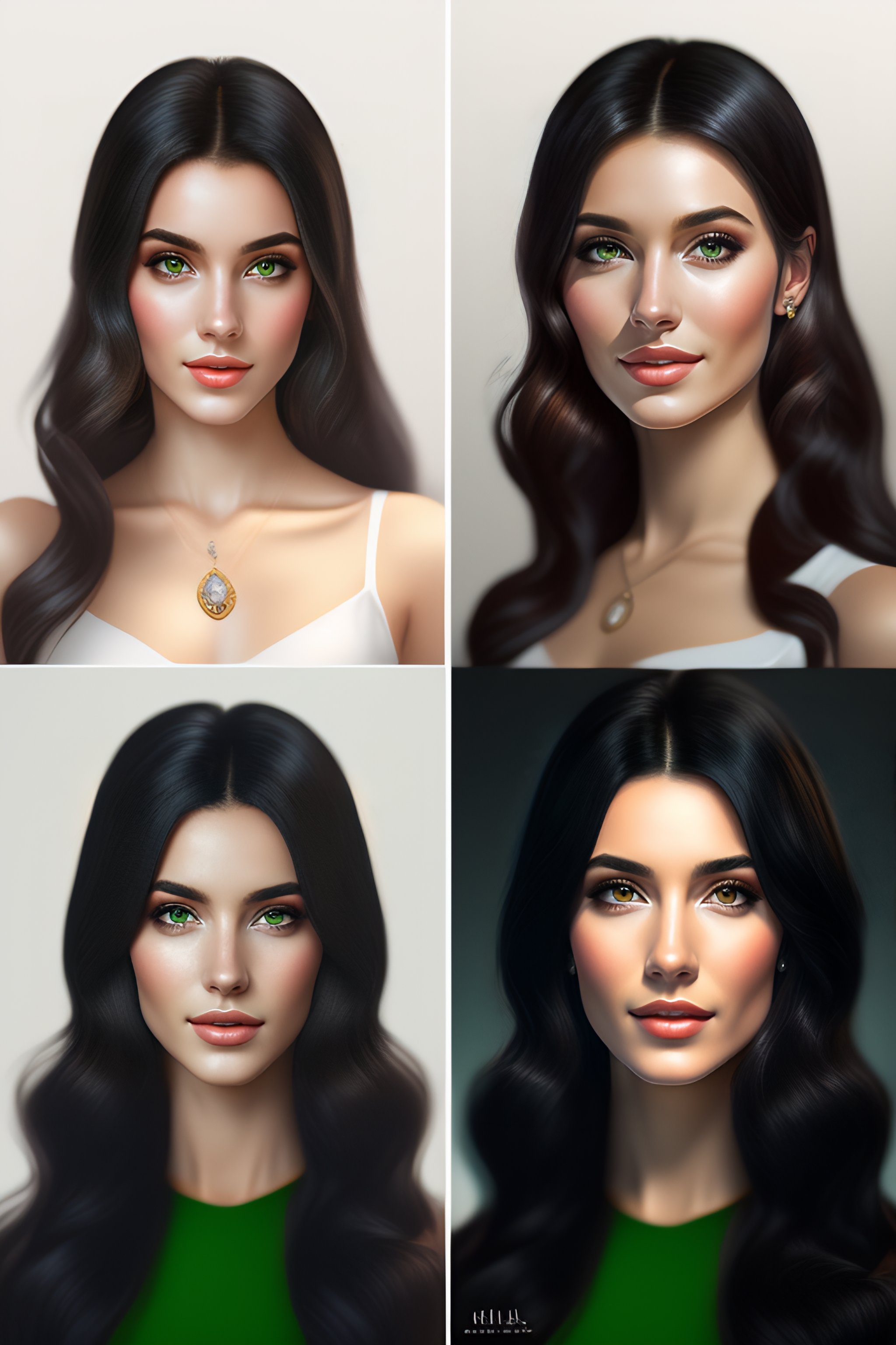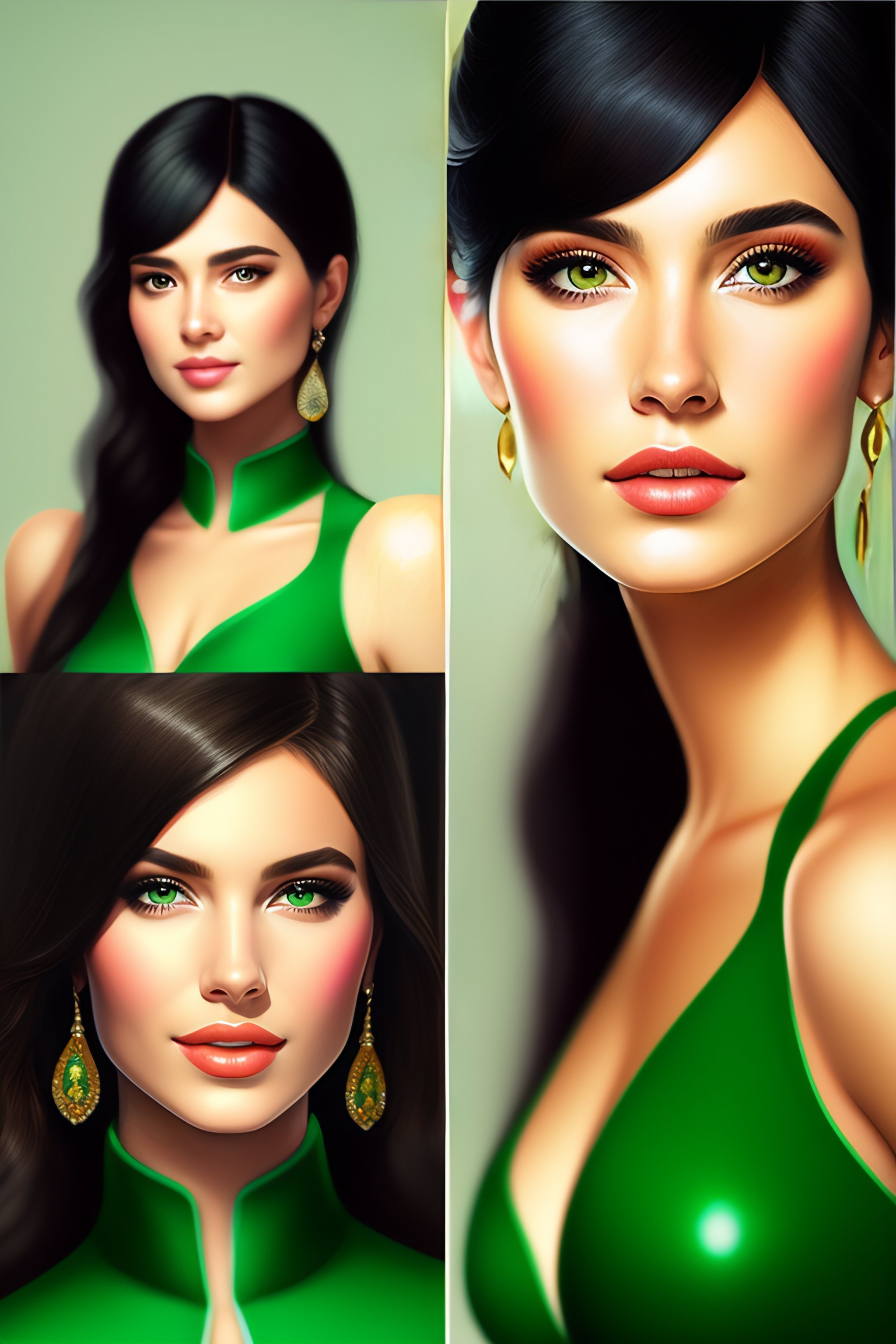 Studio photos of a european girl next door with black hair and green eyes in full body length, beautiful face, photorealistic illustration, high details