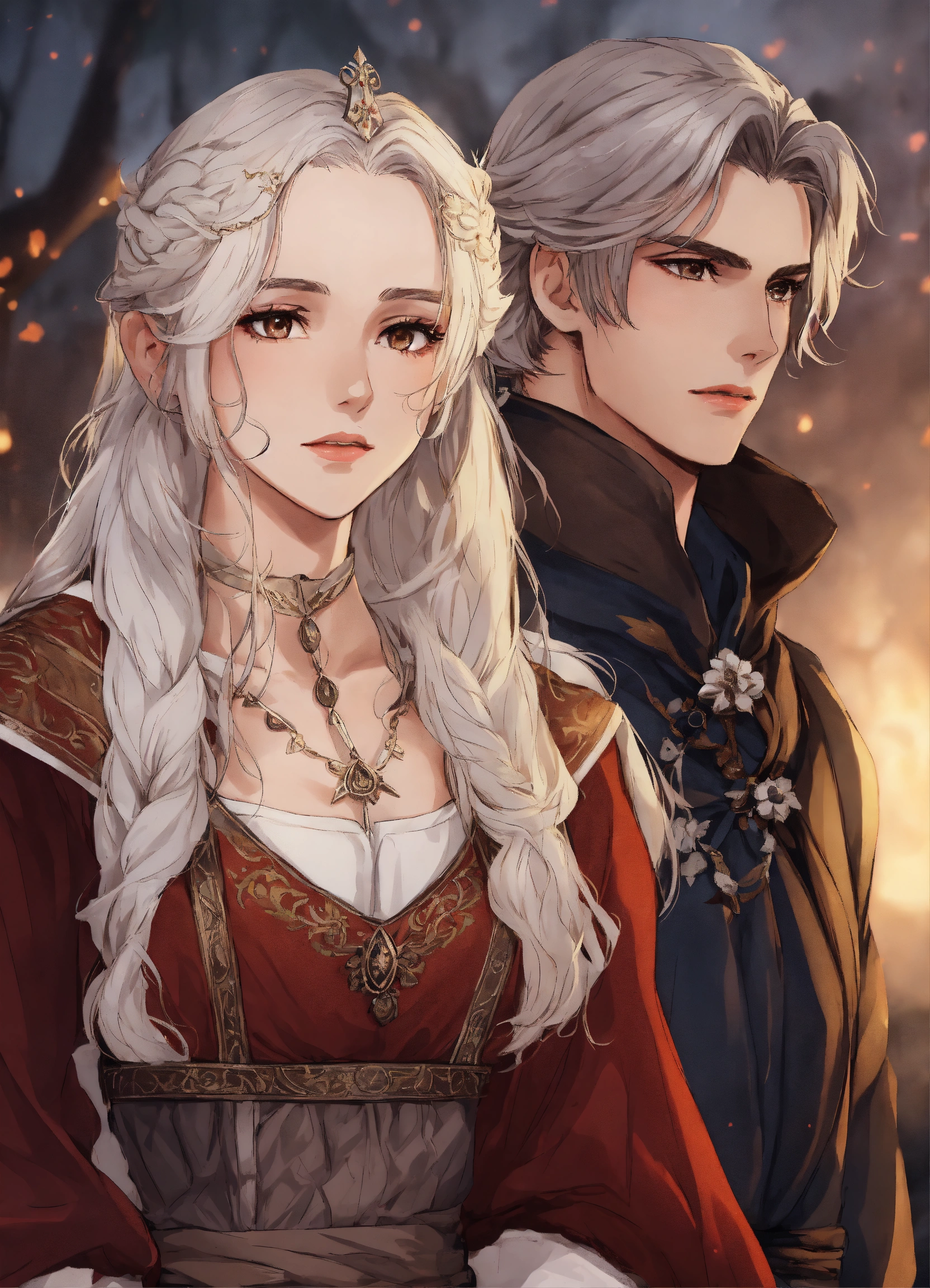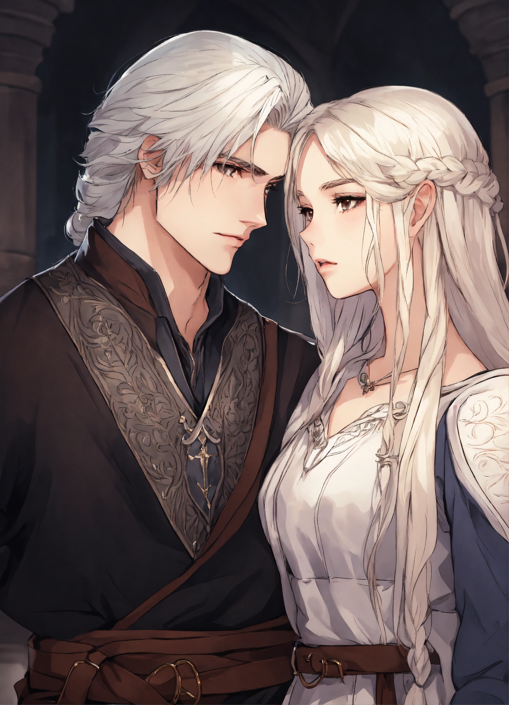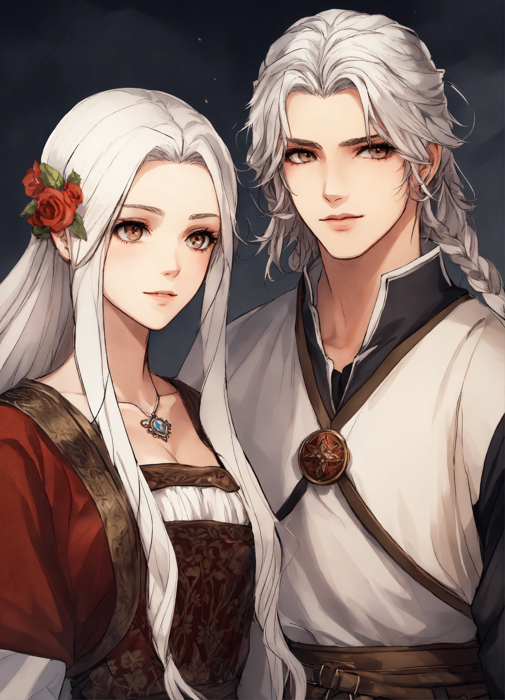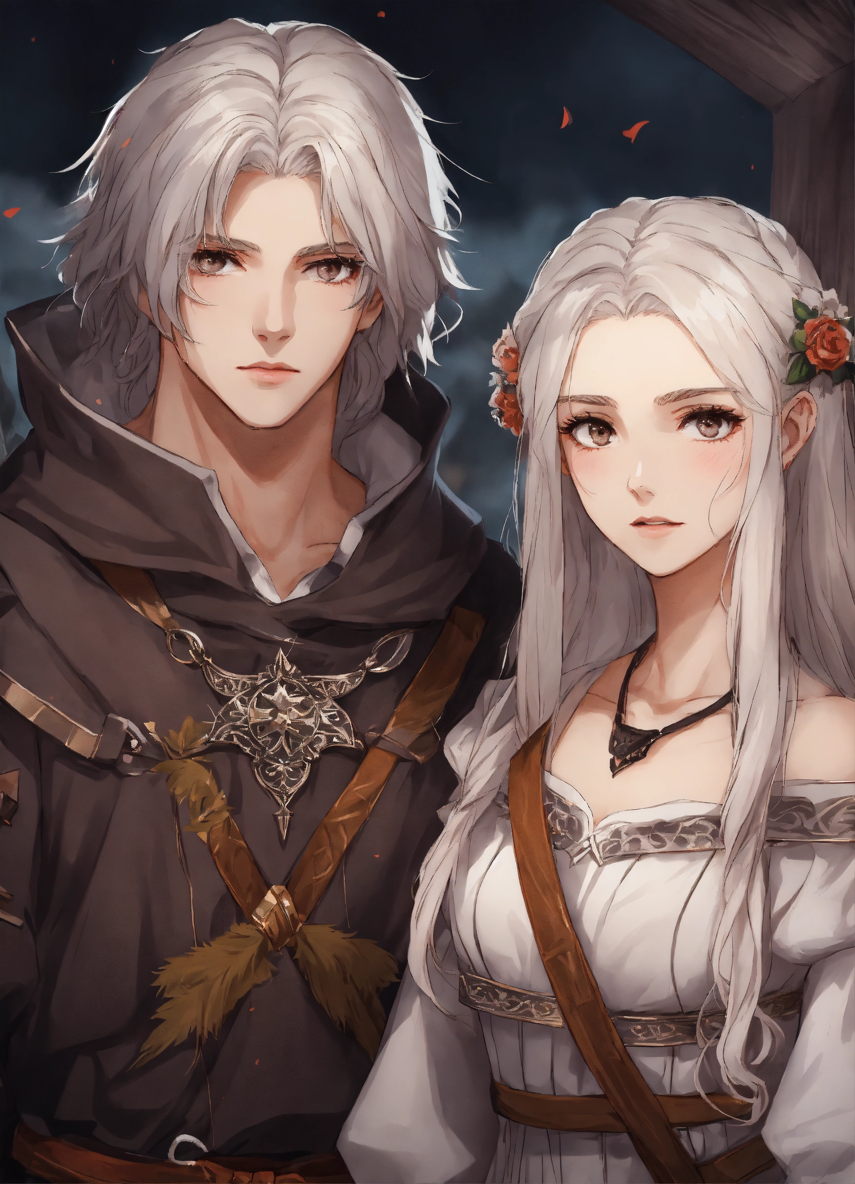 A girl of 18 years old, slavic, with brown eyes, white wavy hair, dressed in medieval slavic clothes. i'm standing face to face with a 20-year-old guy. slavic. dark straight hair, black eyes, deathly pale skin. dressed in medieval slavic clothes in anime style. anime reskin style